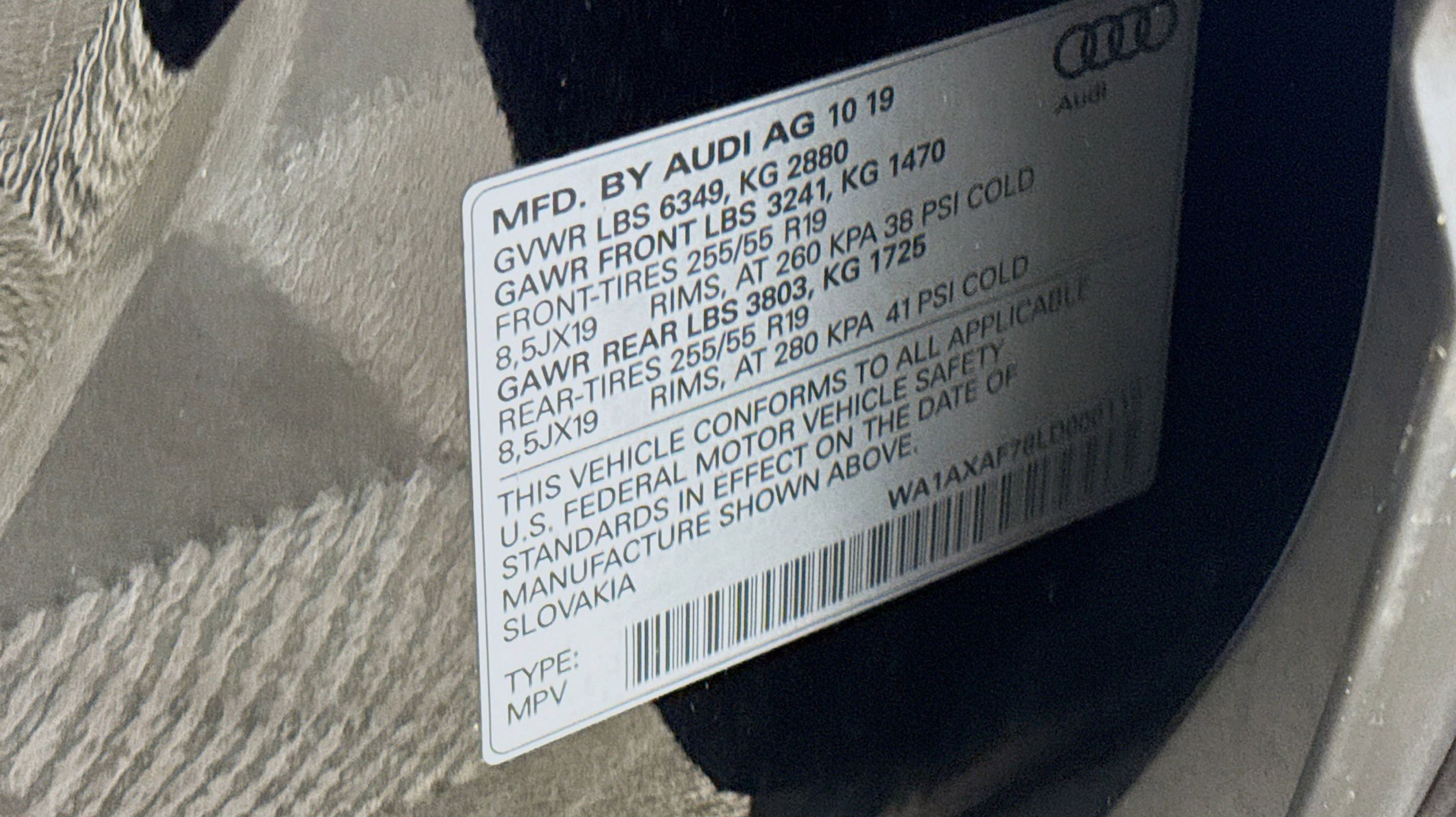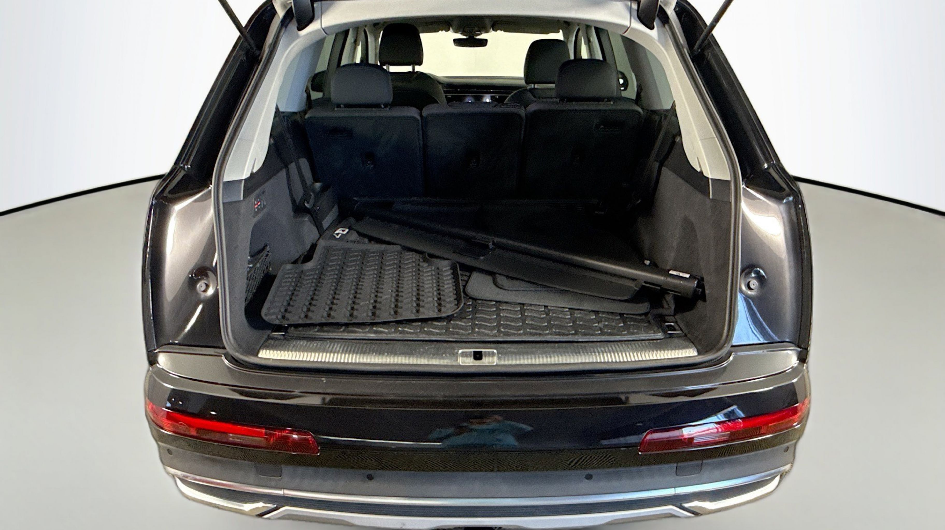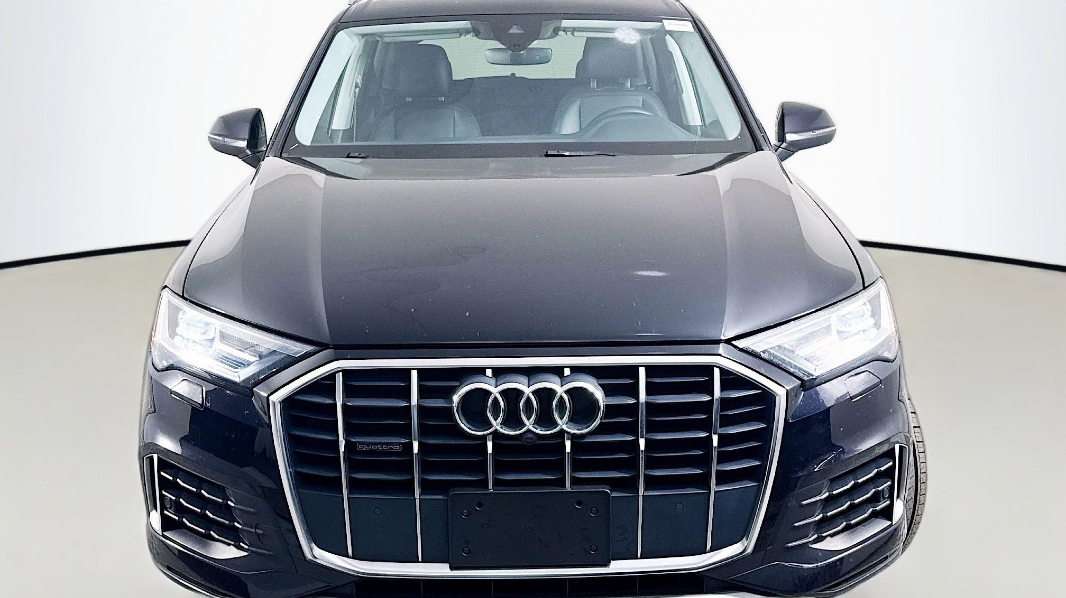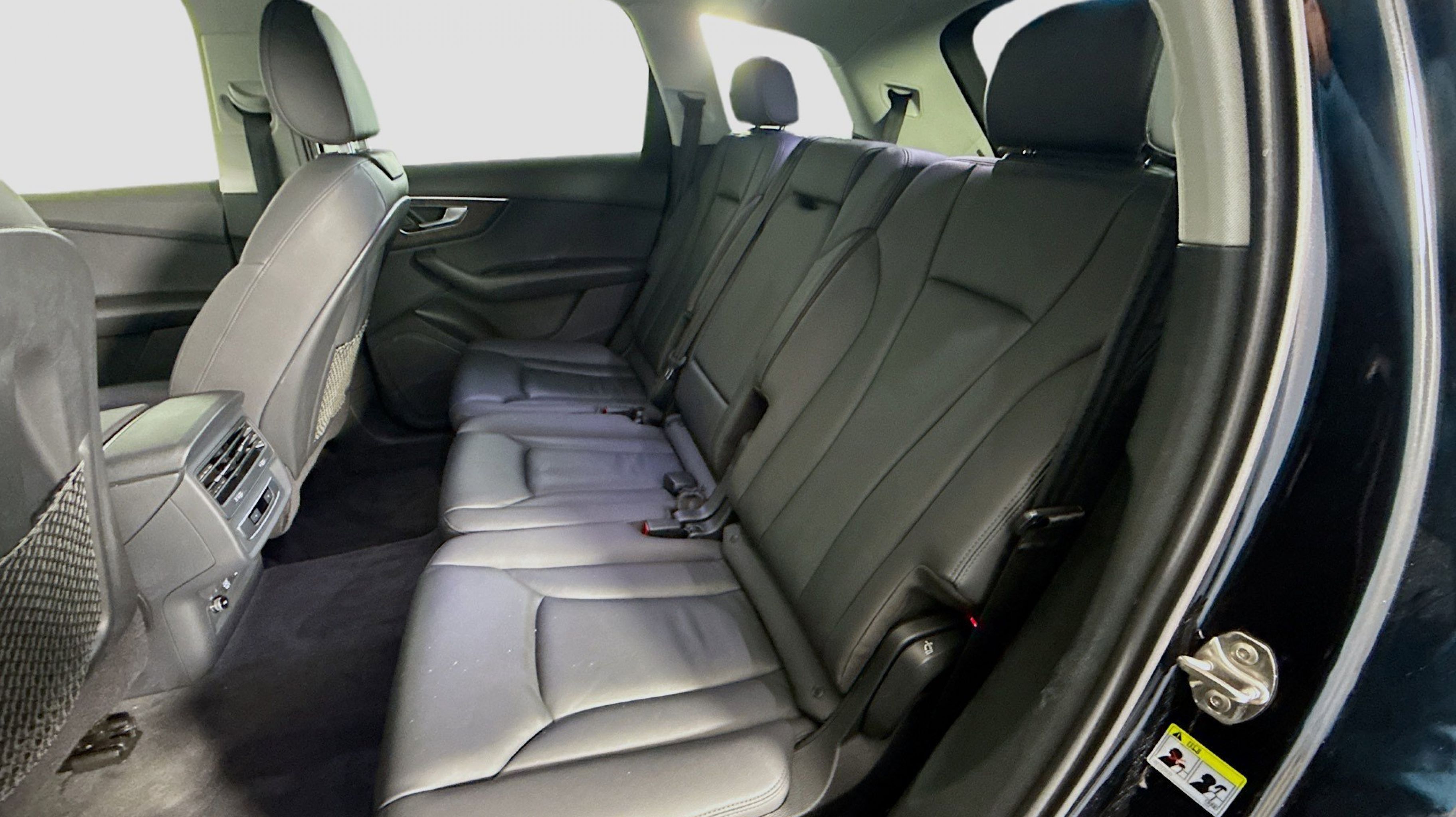 Orca Black Metallic 2020 Audi Q7 55 Premium quattro quattro 8-Speed Automatic with Tiptronic 3.0L TFSI V6 DOHC Ambient Interior Lighting Package, Audi Phone Box w/Wireless Charging, Audi Side Assist w/Pre Sense Rear, Convenience Package, Heated Auto-Dimming Power Folding Exterior Mirrors, Tow Hitch Receiver, Towing Package, 10 Speakers, 3.204 Axle Ratio, 3rd row seats: bench, 4-Wheel Disc Brakes, ABS brakes, Air Conditioning, Alloy wheels, AM/FM radio: SiriusXM, Audi Guard Protection Kit, Audi smartphone interface (Apple CarPlay/Android Auto), Auto High-beam Headlights, Auto-dimming Rear-View mirror, Automatic temperature control, Brake assist, Bumpers: body-color, Compass, Delay-off headlights, Driver door bin, Driver vanity mirror, Dual front impact airbags, Dual front side impact airbags, Electronic Stability Control, Emergency communication system: Audi connect CARE, PRIME & PLUS, Exterior Parking Camera Rear, Four wheel independent suspension, Front & Rear Doors Audi Beam-Rings, Front anti-roll bar, Front Bucket Seats, Front Center Armrest, Front dual zone A/C, Front fog lights, Front reading lights, Fully automatic headlights, Garage door transmitter: HomeLink, Genuine wood door panel insert, Gray Brown Fine Grain Ash Natural Wood Inlays, Heated door mirrors, Heated Front Bucket Seats, Heated front seats, Illuminated entry, Leather Seating Surfaces, Leather Shift Knob, Leather steering wheel, Low tire pressure warning, Memory seat, Navigation system: Audi MMI Navigation plus with Touch Response, Occupant sensing airbag, Outside temperature display, Overhead airbag, Overhead console, Panic alarm, PANORAMA SUNROOF, Passenger door bin, Passenger vanity mirror, Power door mirrors, Power driver seat, Power Liftgate, Power passenger seat, Power steering, Power windows, Privacy Trunk Cover, Radio data system, Radio: Audi Sound System, Rain sensing wipers, Rear air conditioning, Rear anti-roll bar, Rear fog lights, Rear reading lights, Rear seat center armrest, Rear window defroster, Rear window wiper, Reclining 3rd row seat, Remote keyless entry, Roof rack: rails only, Security system, Speed control, Speed-sensing steering, Split folding rear seat, Spoiler, Steering wheel memory, Steering wheel mounted audio controls, Tachometer, Telescoping steering wheel, Tilt steering wheel, Traction control, Trip computer, Turn signal indicator mirrors, Variably intermittent wipers, Wheels: 19 5-Arm Star Design, Ambient Interior Lighting Package, Audi Phone Box w/Wireless Charging, Audi Side Assist w/Pre Sense Rear, Convenience Package, Heated Auto-Dimming Power Folding Exterior Mirrors, Tow Hitch Receiver, Towing Package.