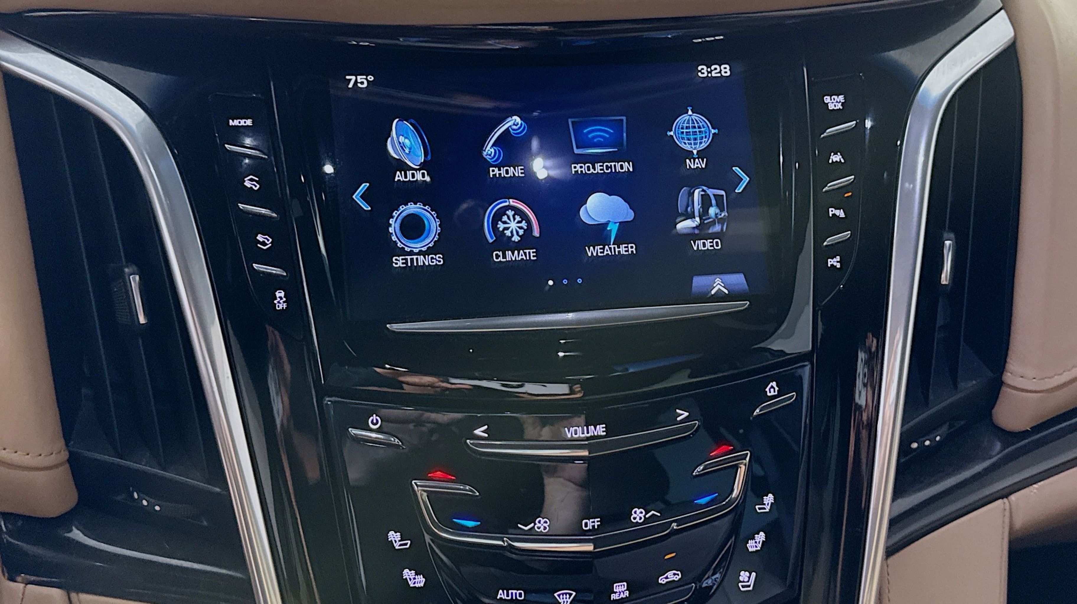 - CADILLAC USER EXPERIENCE WITH EMBEDDED NAVIGATION AM/FM stereo with 8 diagonal color information display featuring touch response haptic feedback gesture recognition Natural Voice Recognition Phone Integration for Apple CarPlay and Android Auto capability for compatible phone Connected Apps and Teen Driver. Five USB ports including one in the articulating storage door/bin and auxiliary audio port (STD)