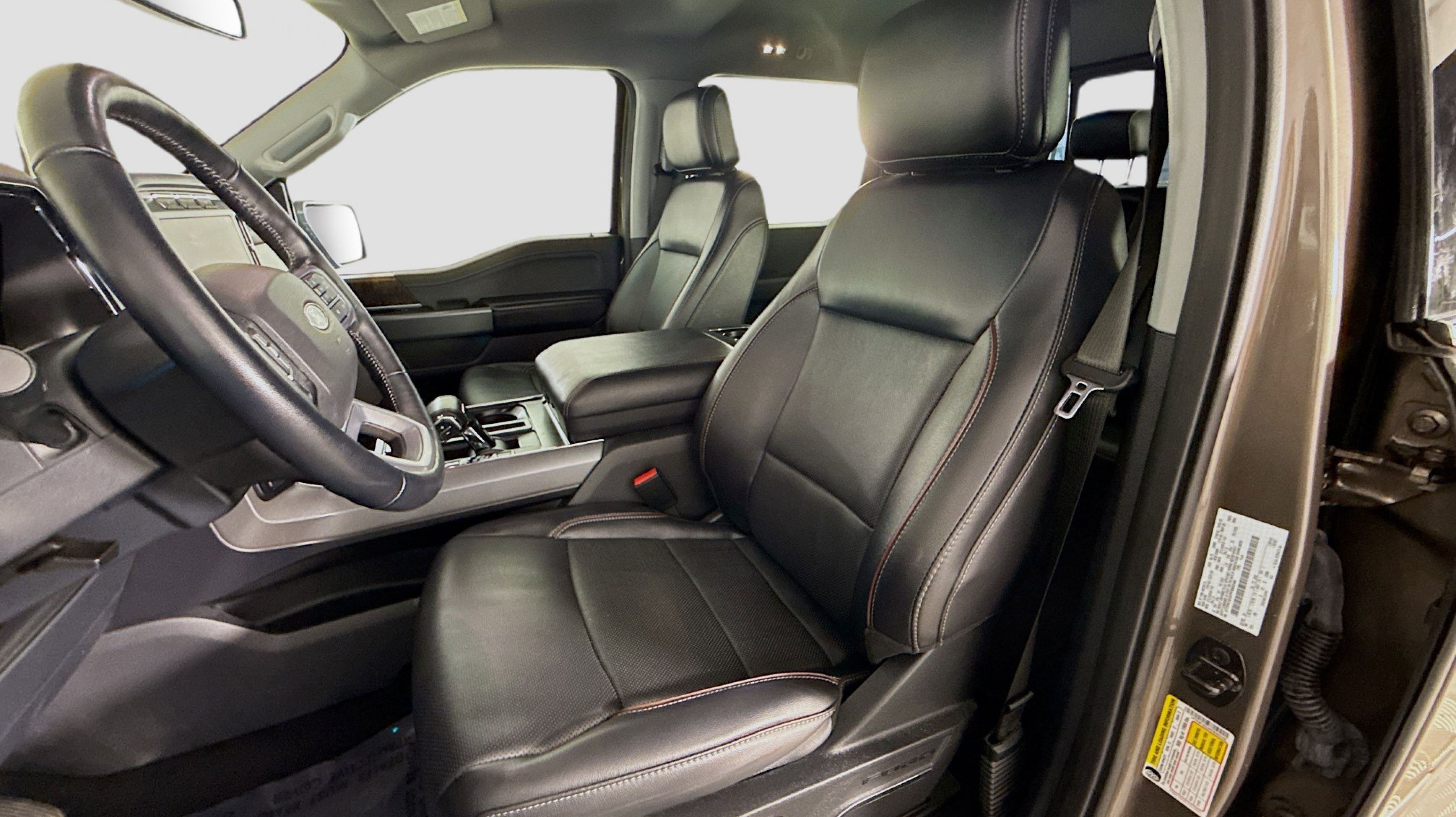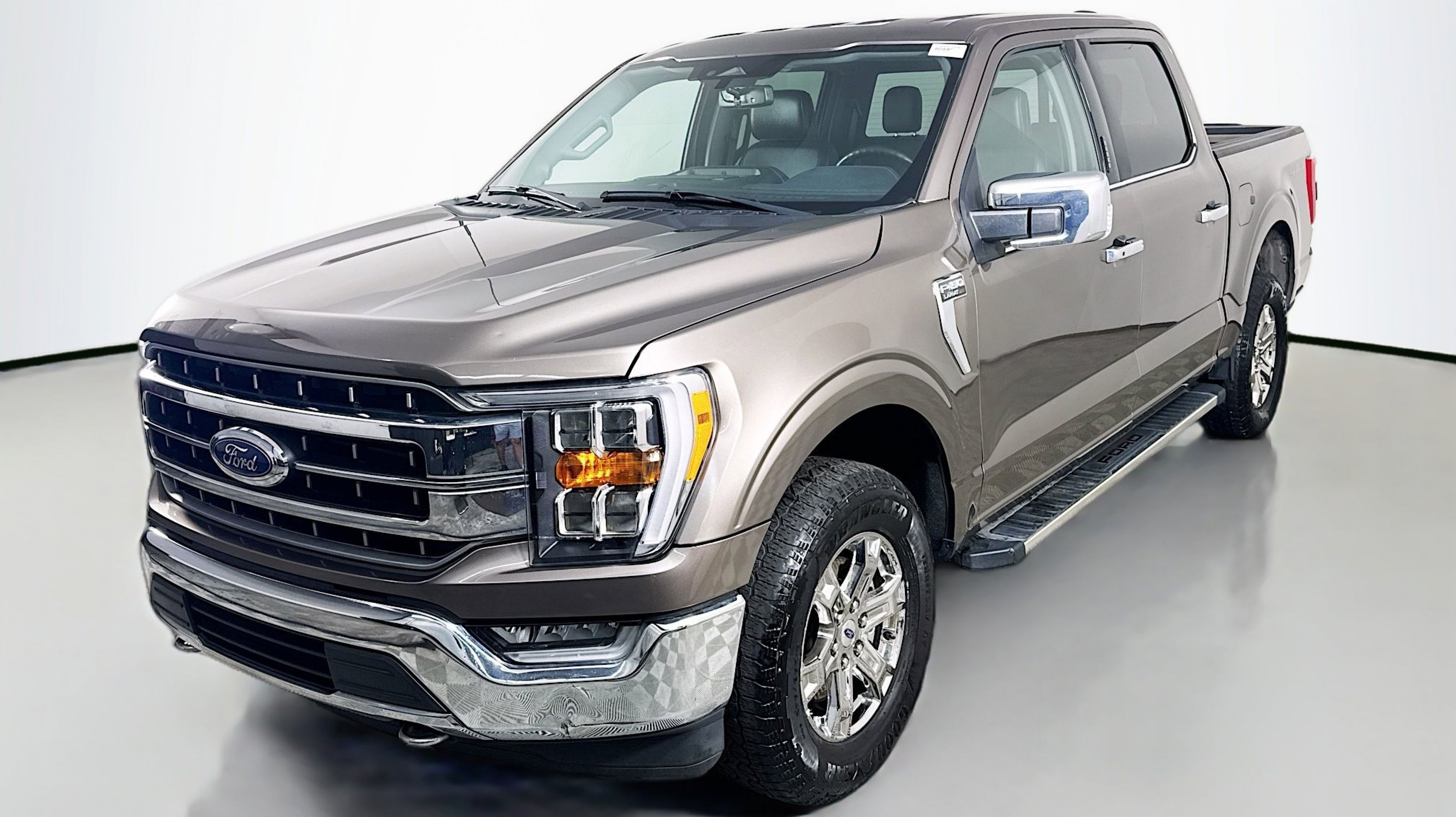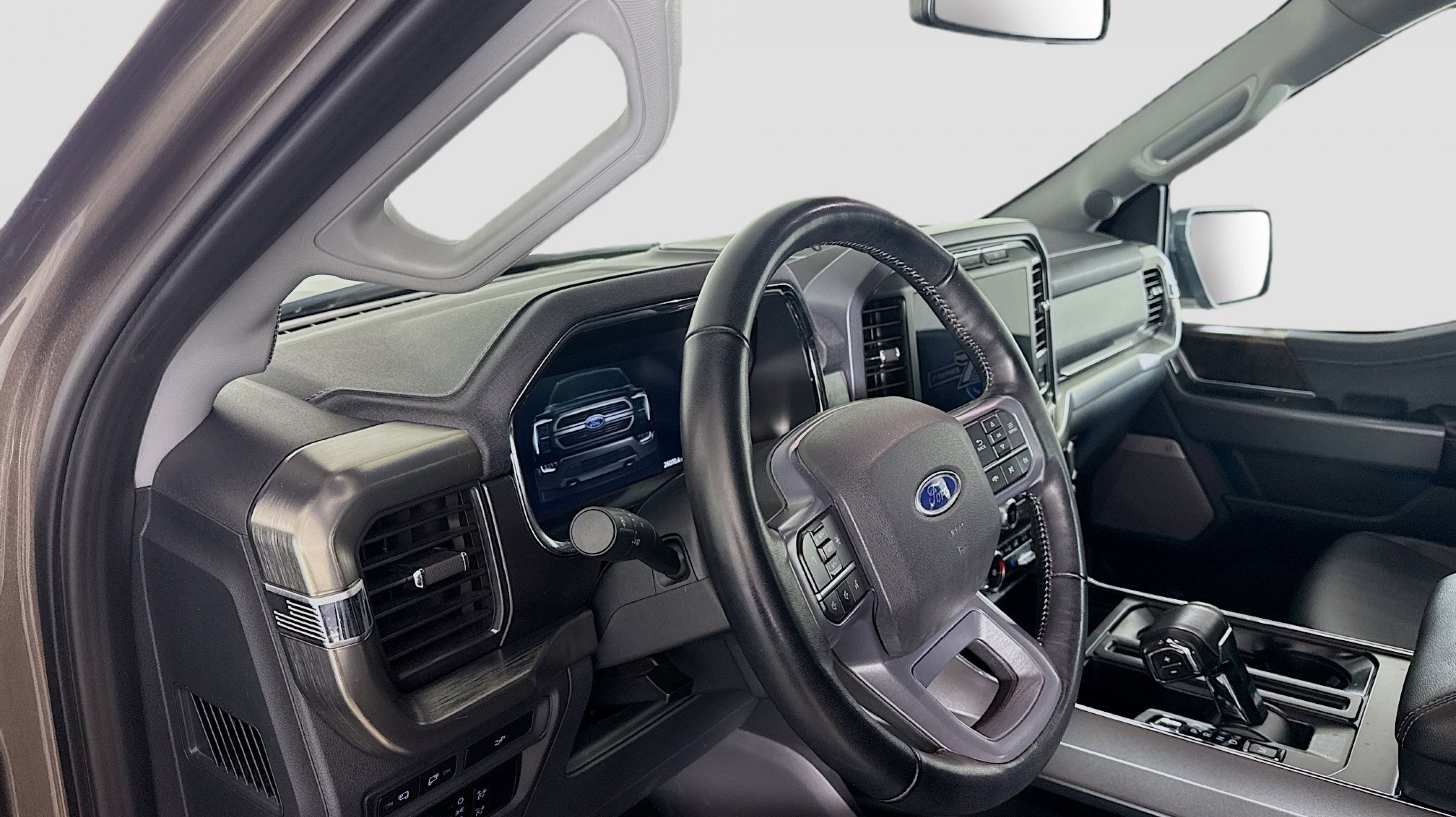 Stone Gray Metallic 2023 Ford F-150 Lariat 4WD 10-Speed Automatic 5.0L V8 4WD, Equipment Group 501A Standard, 3.31 Axle Ratio, 4-Wheel Disc Brakes, 8 Speakers, ABS brakes, Adjustable pedals, Air Conditioning, Alloy wheels, AM/FM radio: SiriusXM with 360L, Auto High-beam Headlights, Auto-dimming door mirrors, Auto-dimming Rear-View mirror, Automatic temperature control, Brake assist, Bumpers: chrome, Chrome wheels, Class IV Trailer Hitch Receiver, Compass, Delay-off headlights, Driver door bin, Driver vanity mirror, Dual front impact airbags, Dual front side impact airbags, Electronic Stability Control, Emergency communication system: SYNC 4 911 Assist, Exterior Parking Camera Rear, Front anti-roll bar, Front Bucket Seats, Front Center Armrest, Front dual zone A/C, Front fog lights, Front reading lights, Front wheel independent suspension, Fully automatic headlights, Garage door transmitter, Heated door mirrors, Heated front seats, Heated steering wheel, Illuminated entry, Inclination/Intrusion Sensor Removal, Leather-Trimmed Bucket Seats, Low tire pressure warning, Memory seat, Occupant sensing airbag, Outside temperature display, Overhead airbag, Overhead console, Panic alarm, Passenger door bin, Passenger vanity mirror, Pedal memory, Power door mirrors, Power driver seat, Power passenger seat, Power steering, Power windows, Radio data system, Radio: B&O Sound System by Bang & Olufsen, Rear reading lights, Rear seat center armrest, Rear step bumper, Rear window defroster, Remote keyless entry, Security system, Speed control, Speed-sensing steering, Split folding rear seat, Steering Wheel Heat Removal (DISC), Steering wheel mounted audio controls, SYNC 4 w/Enhanced Voice Recognition, Tachometer, Telescoping steering wheel, Tilt steering wheel, Traction control, Trip computer, Turn signal indicator mirrors, Variably intermittent wipers, Ventilated front seats, Voltmeter, Wheels: 18 Chrome-Like PVD, 4WD, Equipment Group 501A Standard.