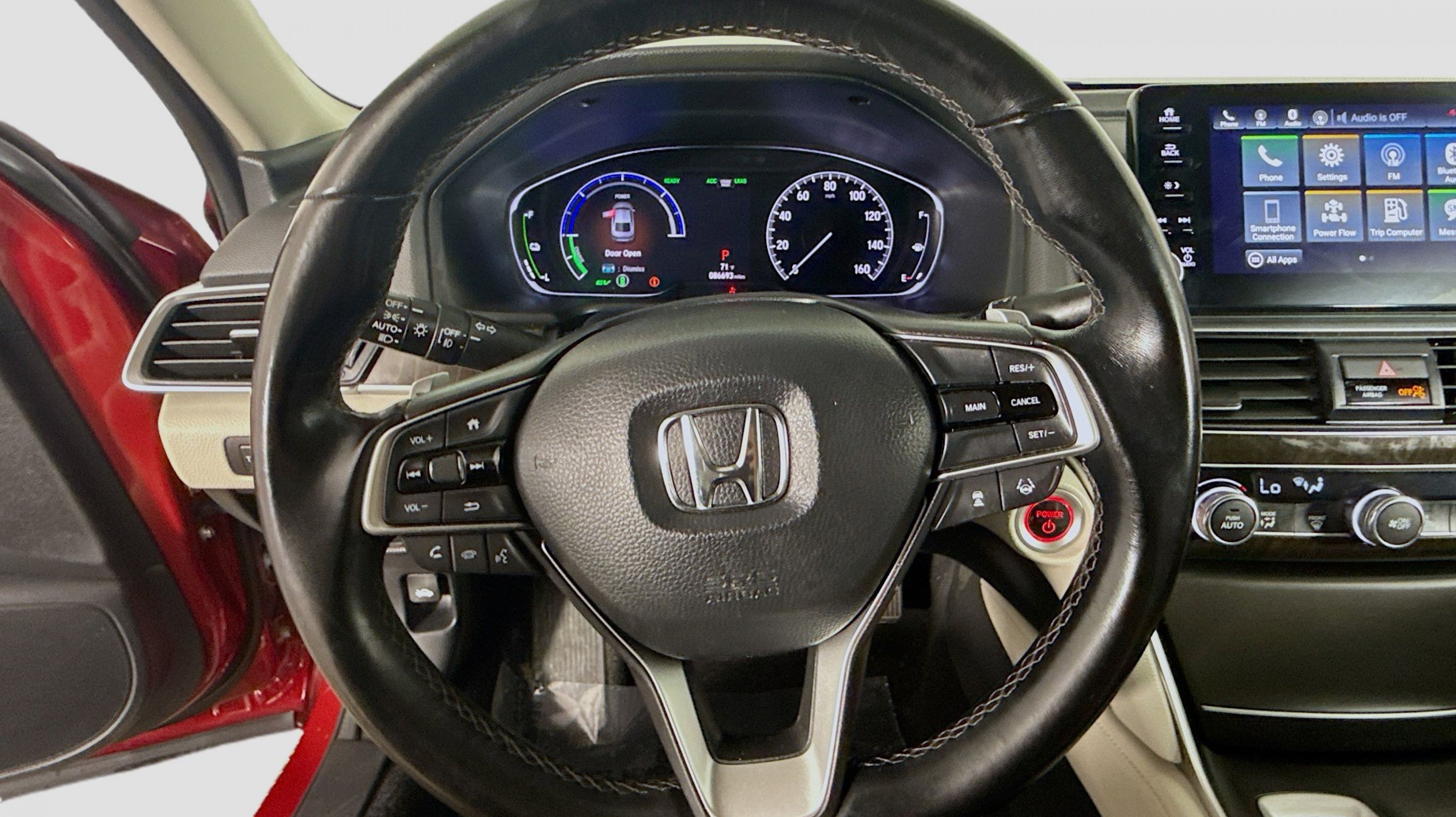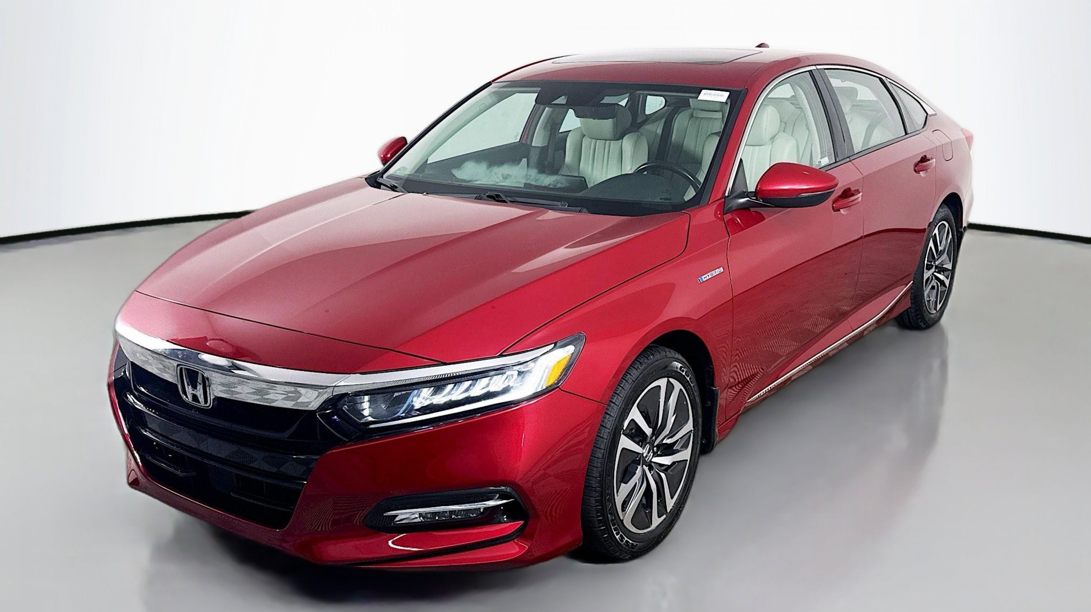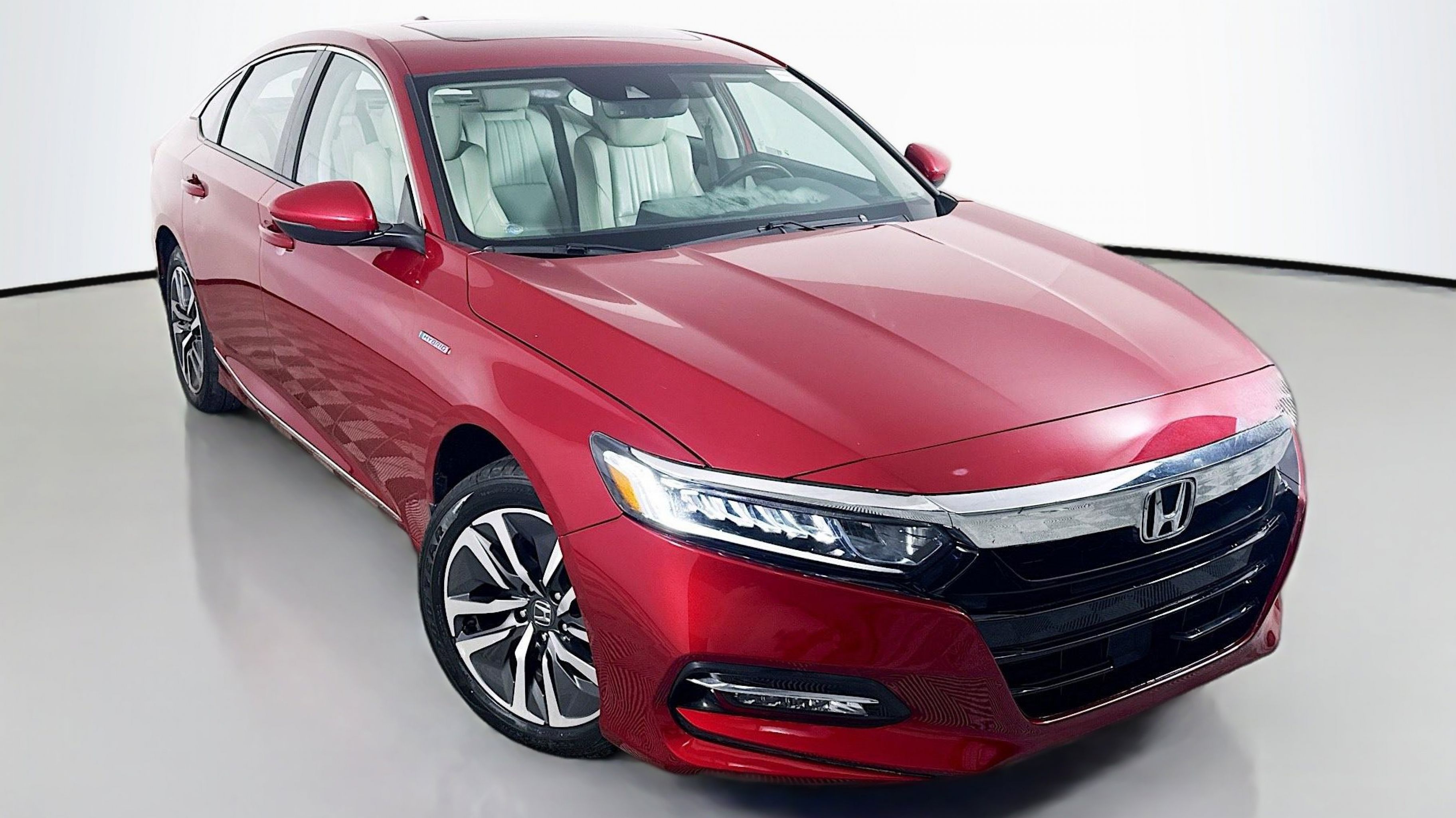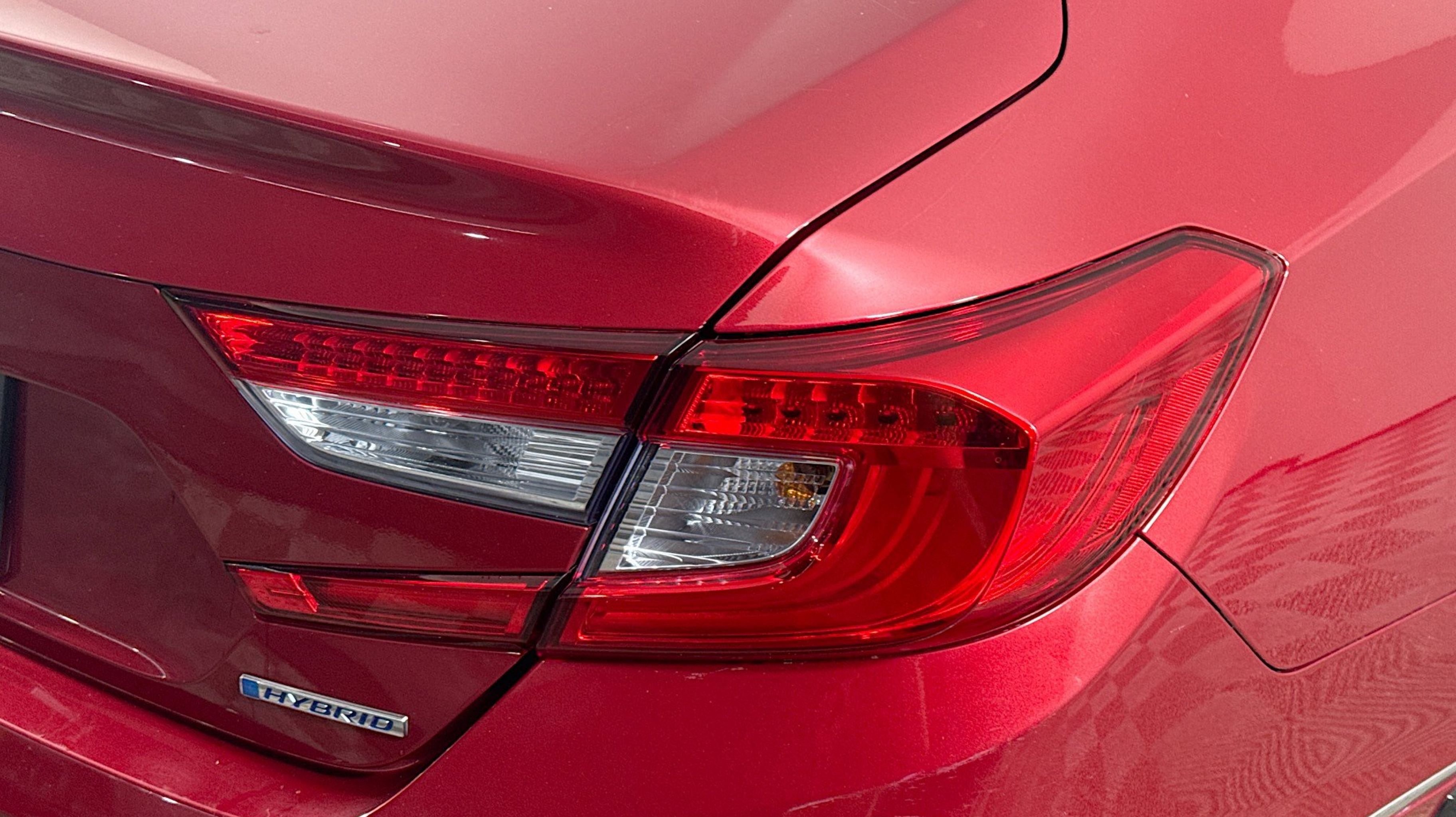 Radiant Red Metallic 2020 Honda Accord Hybrid EX-L FWD eCVT 2.0L 4-Cylinder DOHC 16V i-VTEC 2.0L 4-Cylinder DOHC 16V i-VTEC, 10 Speakers, 17 Machine-Finished Alloy Wheels, 4-Wheel Disc Brakes, ABS brakes, Adaptive Cruise Control: Adaptive Cruise Control (ACC) with Low-Speed Follow, Air Conditioning, Alloy wheels, AM/FM radio: SiriusXM, Apple CarPlay/Android Auto, Auto High-beam Headlights, Auto-dimming Rear-View mirror, Automatic temperature control, Blind Spot Information (BSI) System warning, Brake assist, Bumpers: body-color, Delay-off headlights, Driver door bin, Driver vanity mirror, Dual front impact airbags, Dual front side impact airbags, Electronic Stability Control, Emergency communication system: HondaLink, Exterior Parking Camera Rear, Forward collision: Collision Mitigation Braking System (CMBS) + FCW mitigation, Four wheel independent suspension, Front anti-roll bar, Front Bucket Seats, Front Center Armrest, Front dual zone A/C, Front fog lights, Front reading lights, Fully automatic headlights, Garage door transmitter: HomeLink, Heated door mirrors, Heated Front Bucket Seats, Heated front seats, Illuminated entry, Knee airbag, Leather steering wheel, Leather-Trimmed Seats, Low tire pressure warning, Memory seat, Occupant sensing airbag, Outside temperature display, Overhead airbag, Overhead console, Panic alarm, PANORAMA SUNROOF, Passenger door bin, Passenger vanity mirror, Power door mirrors, Power driver seat, Power passenger seat, Power steering, Power windows, Radio data system, Radio: 450-Watt AM/FM/HD Premium Audio System, Rear anti-roll bar, Rear seat center armrest, Rear window defroster, Remote keyless entry, Security system, Speed control, Speed-sensing steering, Speed-Sensitive Wipers, Split folding rear seat, Steering wheel mounted audio controls, Telescoping steering wheel, Tilt steering wheel, Traction control, Trip computer, Turn signal indicator mirrors, Variably intermittent wipers, 2.0L 4-Cylinder DOHC 16V i-VTEC.