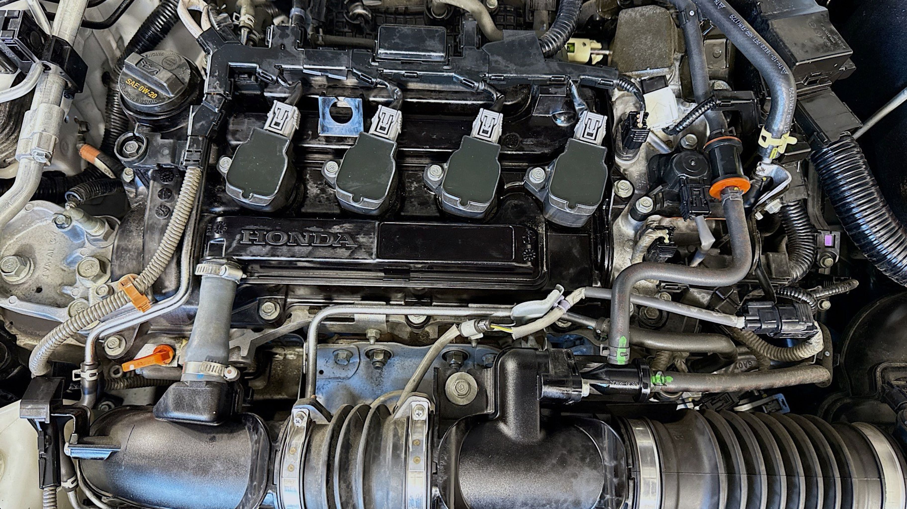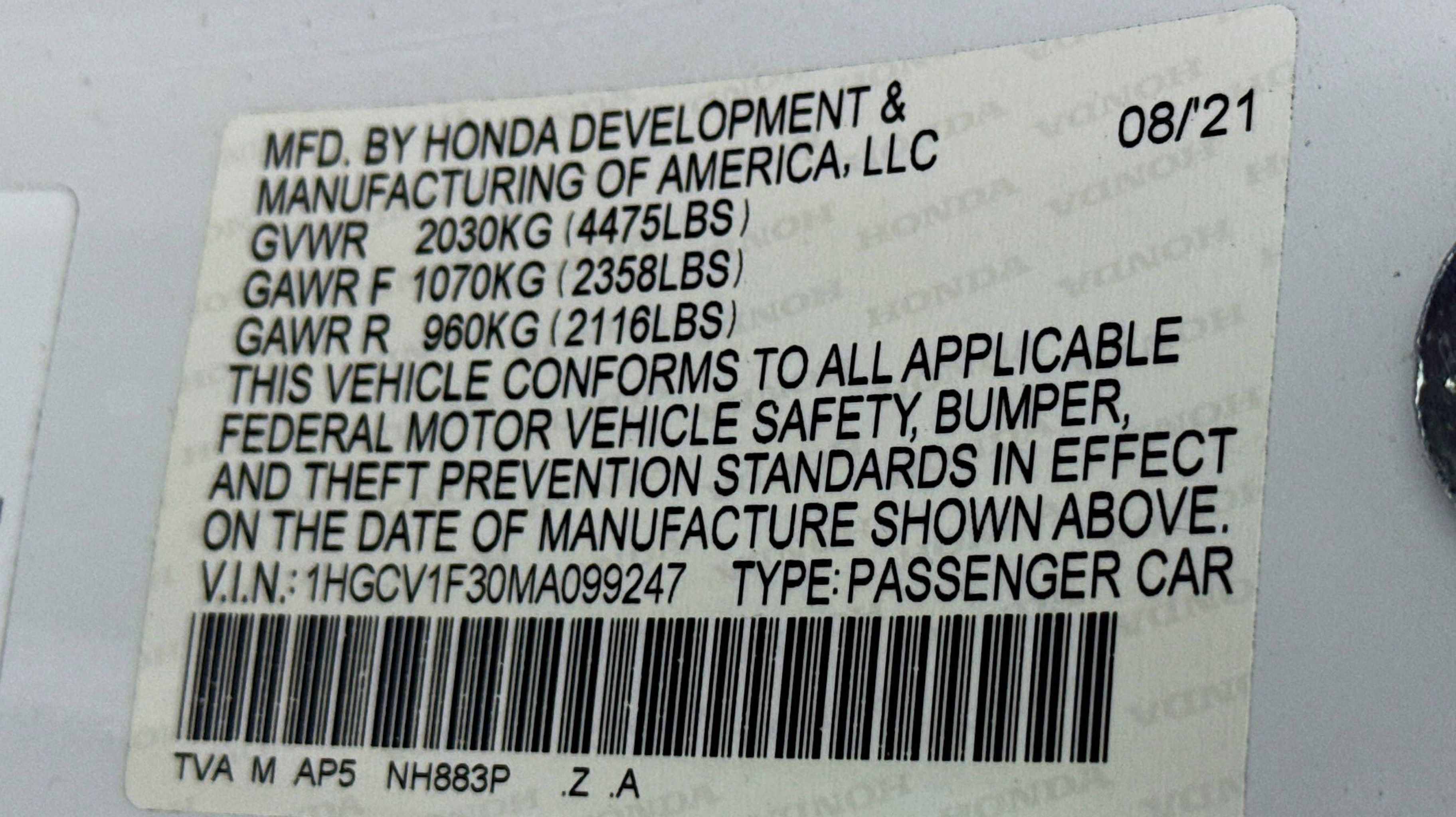 Clean CARFAX. Black w/Cloth Seat Trim, 4-Wheel Disc Brakes, 8 Speakers, ABS brakes, Adaptive Cruise Control: Adaptive Cruise Control (ACC) with Low-Speed Follow, Air Conditioning, Alloy wheels, AM/FM radio, Apple CarPlay/Android Auto, Auto High-beam Headlights, Automatic temperature control, Brake assist, Bumpers: body-color, Cloth Seat Trim, Delay-off headlights, Driver door bin, Driver vanity mirror, Dual front impact airbags, Dual front side impact airbags, Electronic Stability Control, Emergency communication system: HondaLink, Exterior Parking Camera Rear, Forward collision: Collision Mitigation Braking System (CMBS) + FCW mitigation, Four wheel independent suspension, Front anti-roll bar, Front Bucket Seats, Front Center Armrest, Front dual zone A/C, Front fog lights, Front reading lights, Fully automatic headlights, Illuminated entry, Knee airbag, Lane Departure Warning System, Leather Shift Knob, Leather steering wheel, Low tire pressure warning, Occupant sensing airbag, Outside temperature display, Overhead airbag, Overhead console, Panic alarm, Passenger door bin, Passenger vanity mirror, Power door mirrors, Power driver seat, Power steering, Power windows, Radio data system, Radio: 180-Watt AM/FM Audio System, Rear anti-roll bar, Rear seat center armrest, Rear window defroster, Remote keyless entry, Security system, Speed control, Speed-sensing steering, Speed-Sensitive Wipers, Split folding rear seat, Spoiler, Steering wheel mounted audio controls, Tachometer, Telescoping steering wheel, Tilt steering wheel, Traction control, Trip computer, Variably intermittent wipers, Wheels: 19 Machine-Finished Alloy w/Black Inserts, Black w/Cloth Seat Trim.