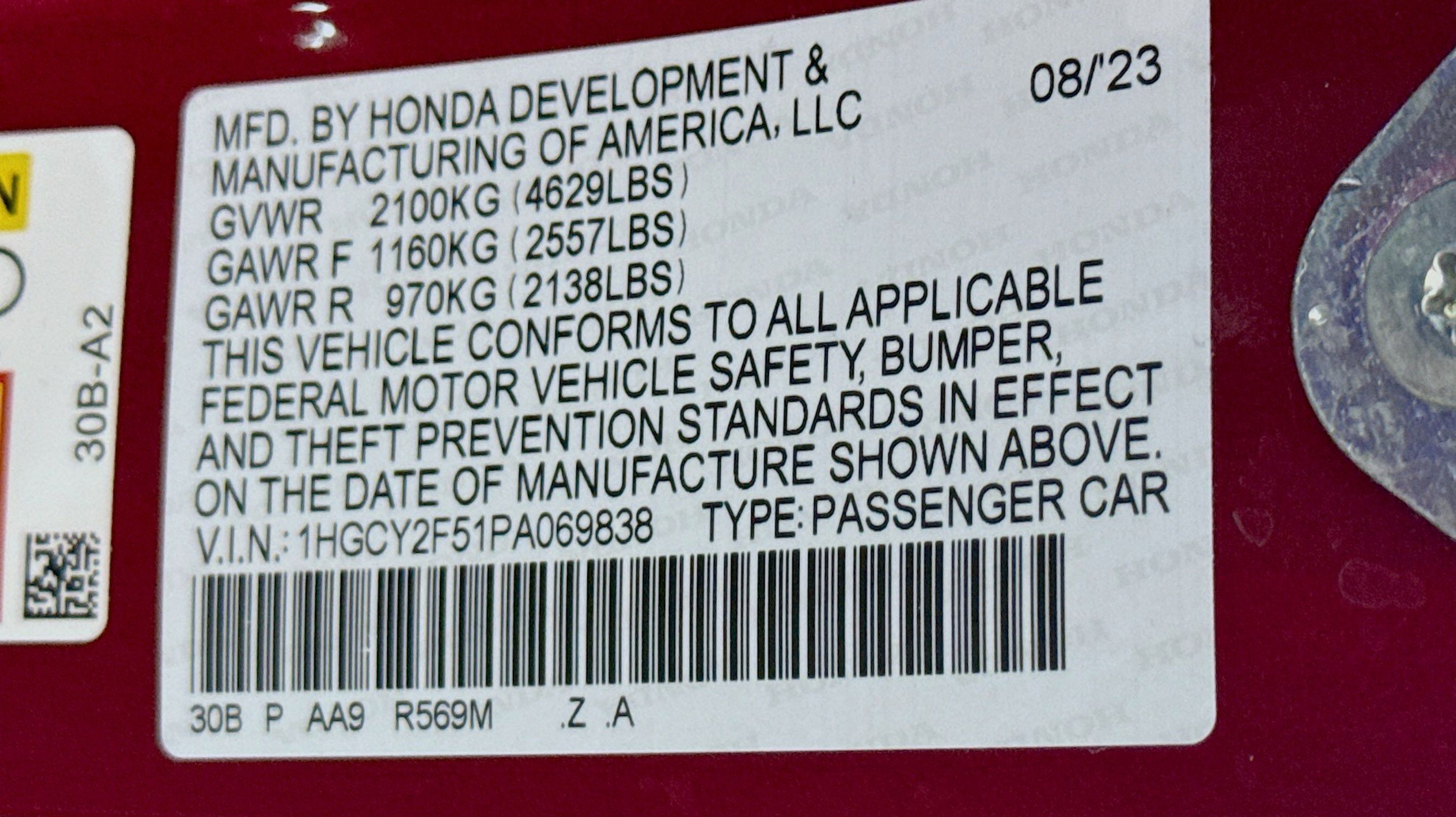 2.0L 16V DOHC, 4-Wheel Disc Brakes, 8 Speakers, ABS brakes, Adaptive Cruise Control: Adaptive Cruise Control (ACC) with Low-Speed Follow, Air Conditioning, Alloy wheels, AM/FM radio, Apple CarPlay/Android Auto, Auto High-beam Headlights, Automatic temperature control, Brake assist, Bumpers: body-color, Compass, Delay-off headlights, Driver door bin, Driver vanity mirror, Dual front impact airbags, Dual front side impact airbags, Electronic Stability Control, Emergency communication system: HondaLink, Exterior Parking Camera Rear, Fabric Seat Trim, Four wheel independent suspension, Front anti-roll bar, Front Bucket Seats, Front Center Armrest, Front dual zone A/C, Front reading lights, Fully automatic headlights, Illuminated entry, Knee airbag, Lane departure: Lane Keeping Assist System (LKAS) active, Leather Shift Knob, Leather steering wheel, Low tire pressure warning, Occupant sensing airbag, Outside temperature display, Overhead airbag, Overhead console, Panic alarm, Passenger door bin, Passenger vanity mirror, Power door mirrors, Power driver seat, Power moonroof, Power steering, Power windows, Radio data system, Radio: 180-Watt Audio System, Rear anti-roll bar, Rear reading lights, Rear seat center armrest, Rear side impact airbag, Rear window defroster, Remote keyless entry, Security system, Speed control, Speed-sensing steering, Speed-Sensitive Wipers, Split folding rear seat, Spoiler, Steering wheel mounted audio controls, Telescoping steering wheel, Tilt steering wheel, Traction control, Trip computer, Variably intermittent wipers, Wheels: 19 x 8.5J Berlina Black, 2.0L 16V DOHC.