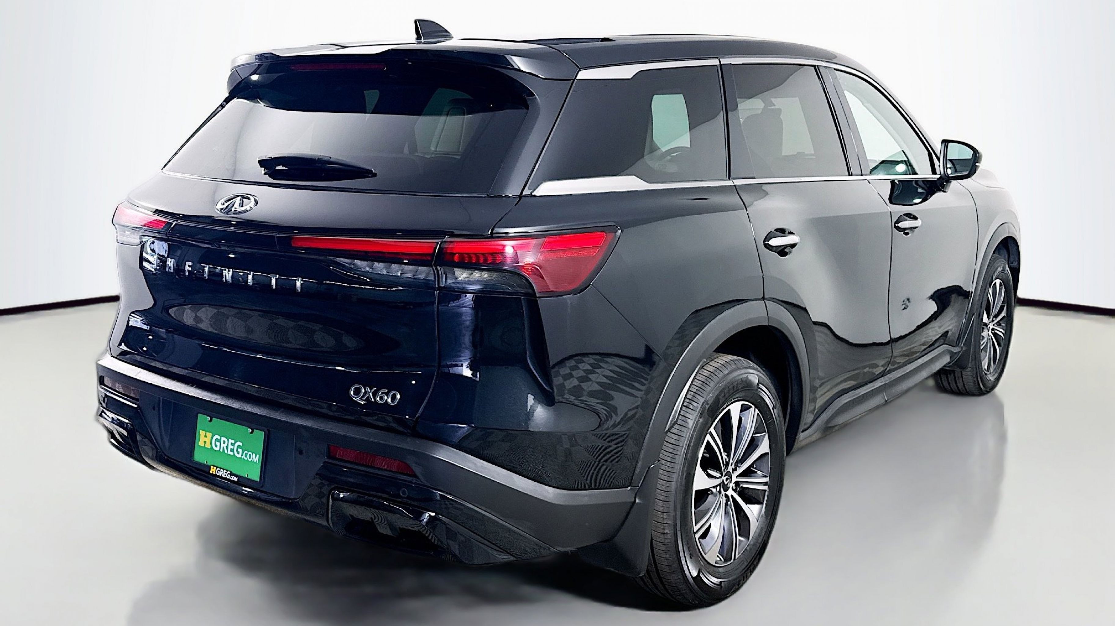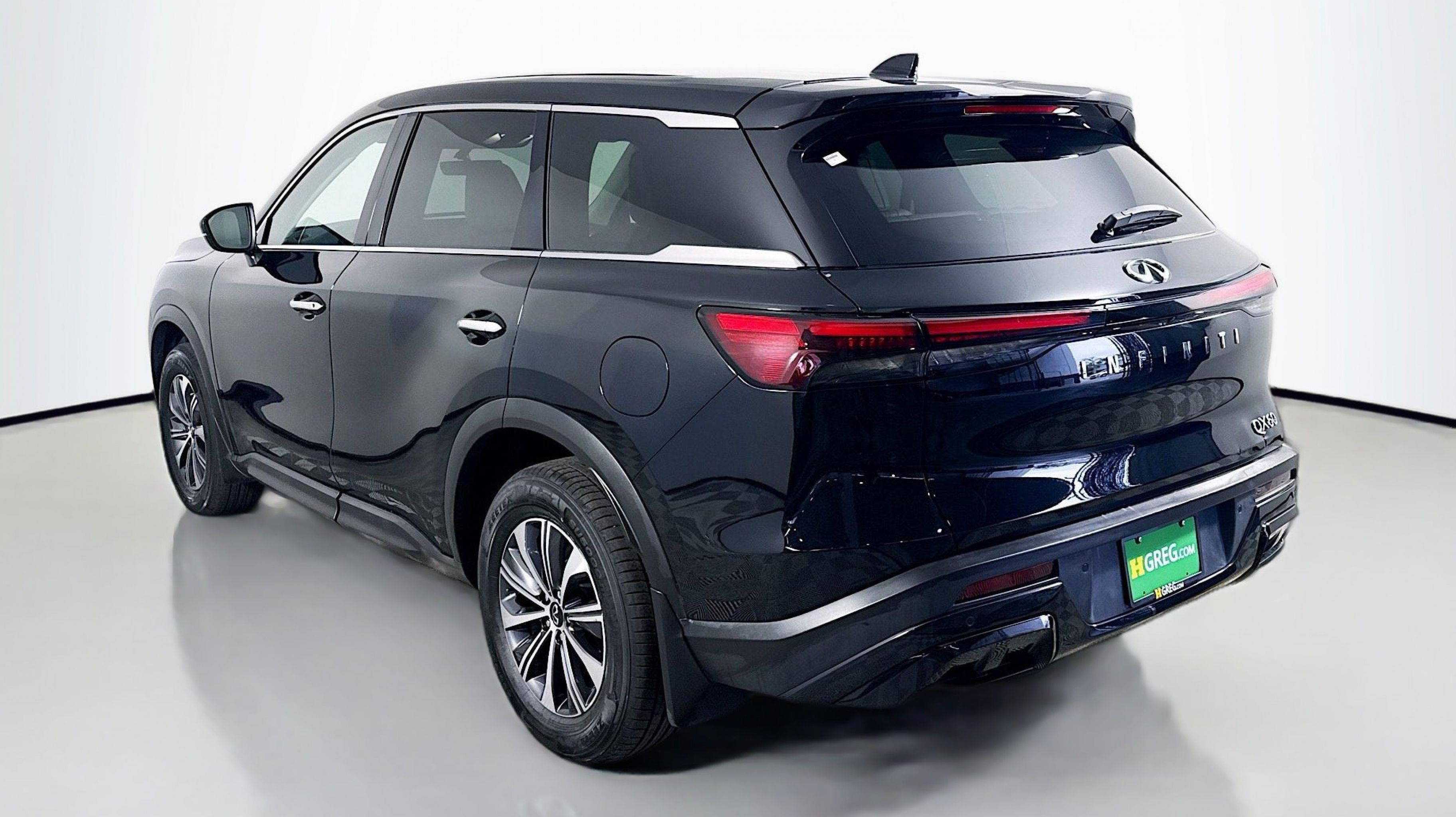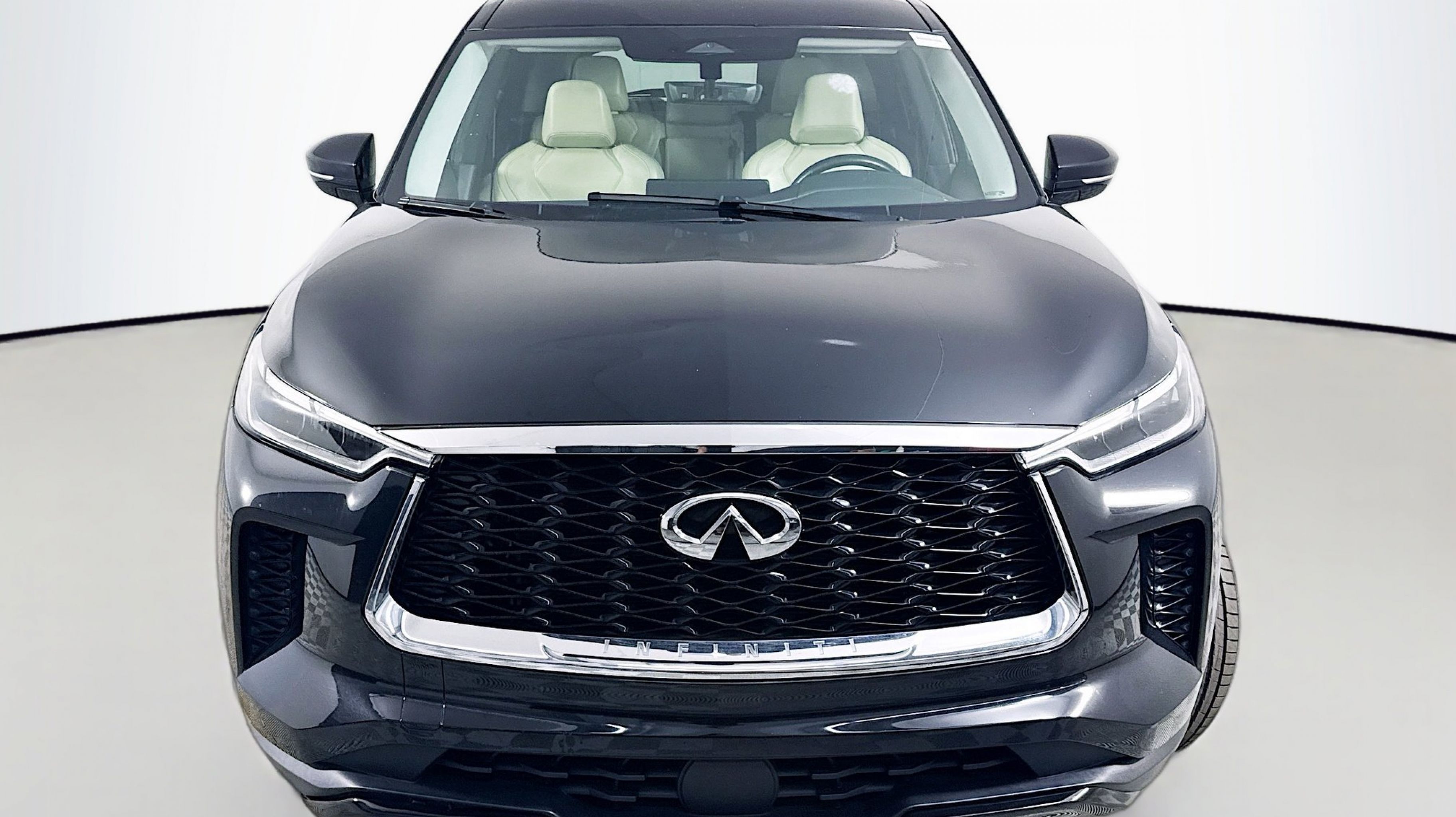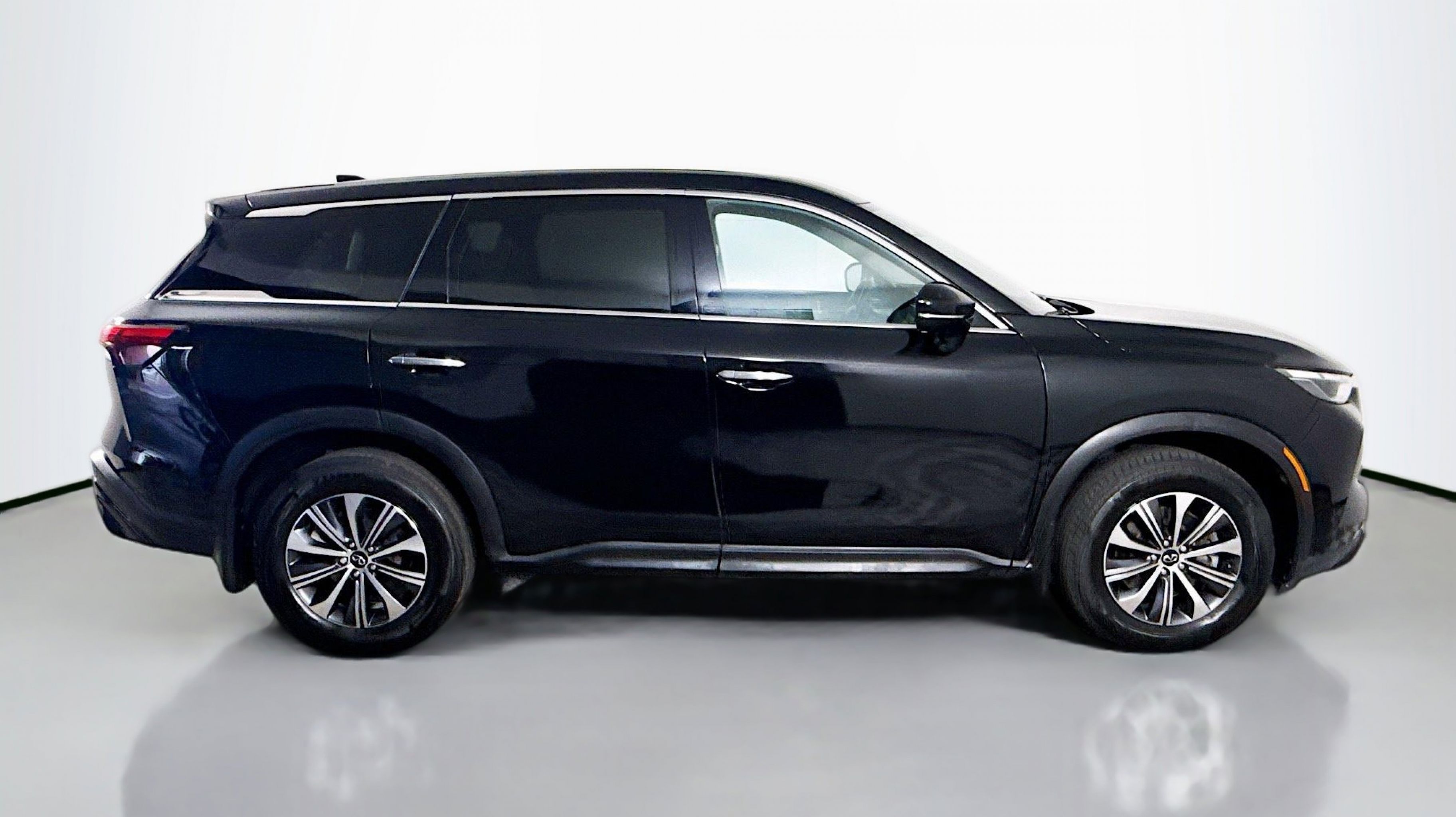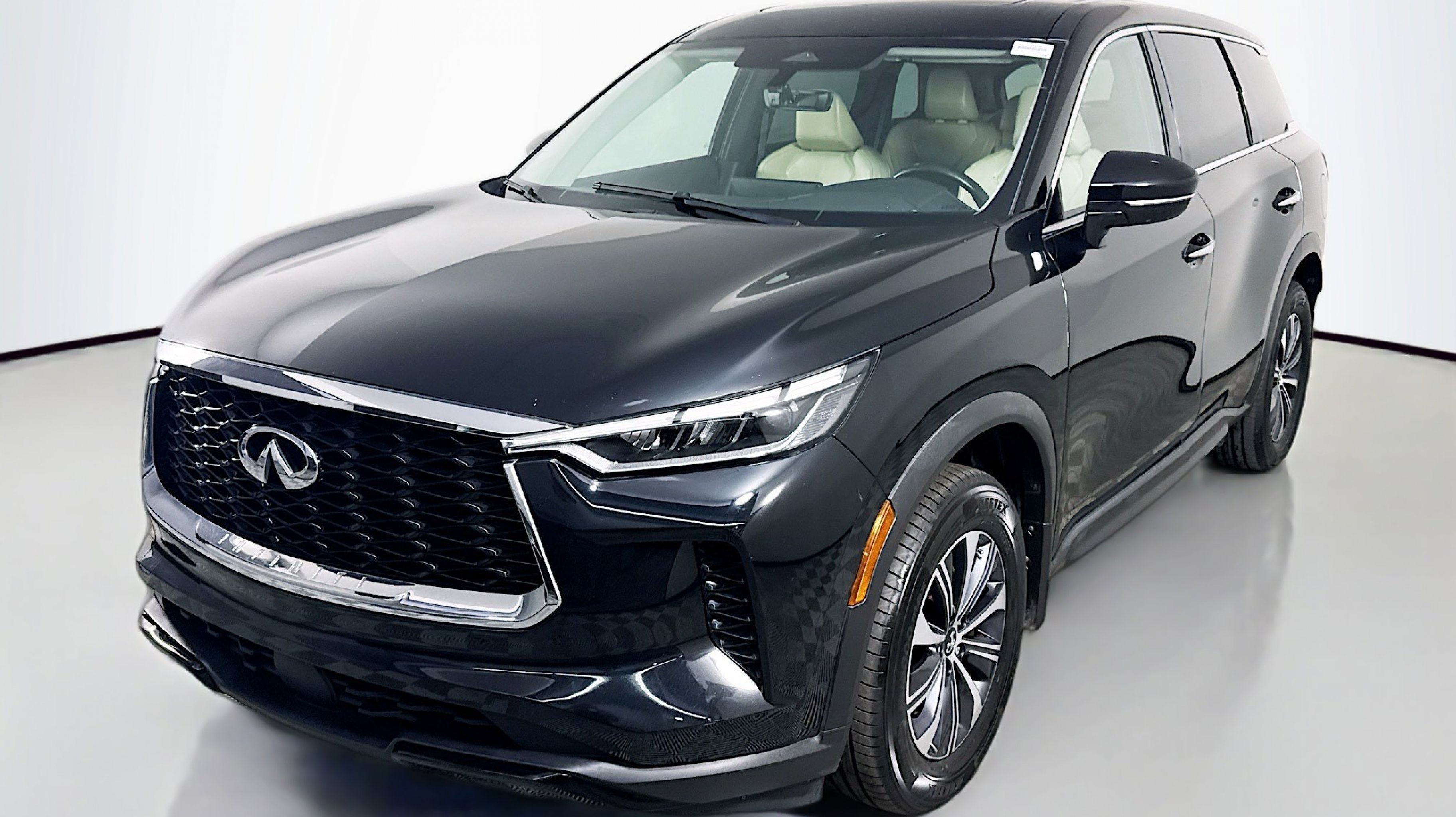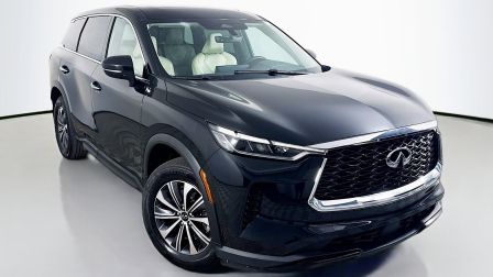 Mineral Black 2023 INFINITI QX60 PURE FWD 9-Speed Automatic 3.5L V6 3rd row seats: bench, 4-Wheel Disc Brakes, 4.334 Axle Ratio, 9 Speakers, ABS brakes, Air Conditioning, Alloy wheels, AM/FM radio: SiriusXM, Anti-whiplash front head restraints, Auto High-beam Headlights, Auto-dimming Rear-View mirror, Automatic temperature control, Blind Spot Warning, Brake assist, Bumpers: body-color, Delay-off headlights, Driver door bin, Driver vanity mirror, Dual front impact airbags, Dual front side impact airbags, Electronic Stability Control, Emergency communication system, Floor Mats on Bench Seats w/3rd Row Tray, Four wheel independent suspension, Front anti-roll bar, Front Bucket Seats, Front Center Armrest, Front dual zone A/C, Front reading lights, Fully automatic headlights, Heated door mirrors, Heated Front Bucket Seats, Heated front seats, Heated steering wheel, Illuminated entry, Knee airbag, Leather Shift Knob, Leather steering wheel, Leather-Appointed Seating Surfaces, Literature Kit, Low tire pressure warning, Memory seat, Occupant sensing airbag, Outside temperature display, Overhead airbag, Overhead console, Panic alarm, PANORAMA SUNROOF, Passenger door bin, Passenger vanity mirror, Power door mirrors, Power driver seat, Power Liftgate, Power passenger seat, Power steering, Power windows, Radio data system, Radio: AM/FM Audio System, Rain sensing wipers, Rear air conditioning, Rear anti-roll bar, Rear Parking Sensors, Rear reading lights, Rear seat center armrest, Rear side impact airbag, Rear window defroster, Rear window wiper, Reclining 3rd row seat, Remote keyless entry, Security system, Speed control, Speed-sensing steering, Speed-Sensitive Wipers, Splash Guards, Split folding rear seat, Spoiler, Steering wheel mounted audio controls, Tachometer, Telescoping steering wheel, Tilt steering wheel, Traction control, Trip computer, Turn signal indicator mirrors, Variably intermittent wipers, Wheels: 18 x 8J Machined Aluminum Alloy.