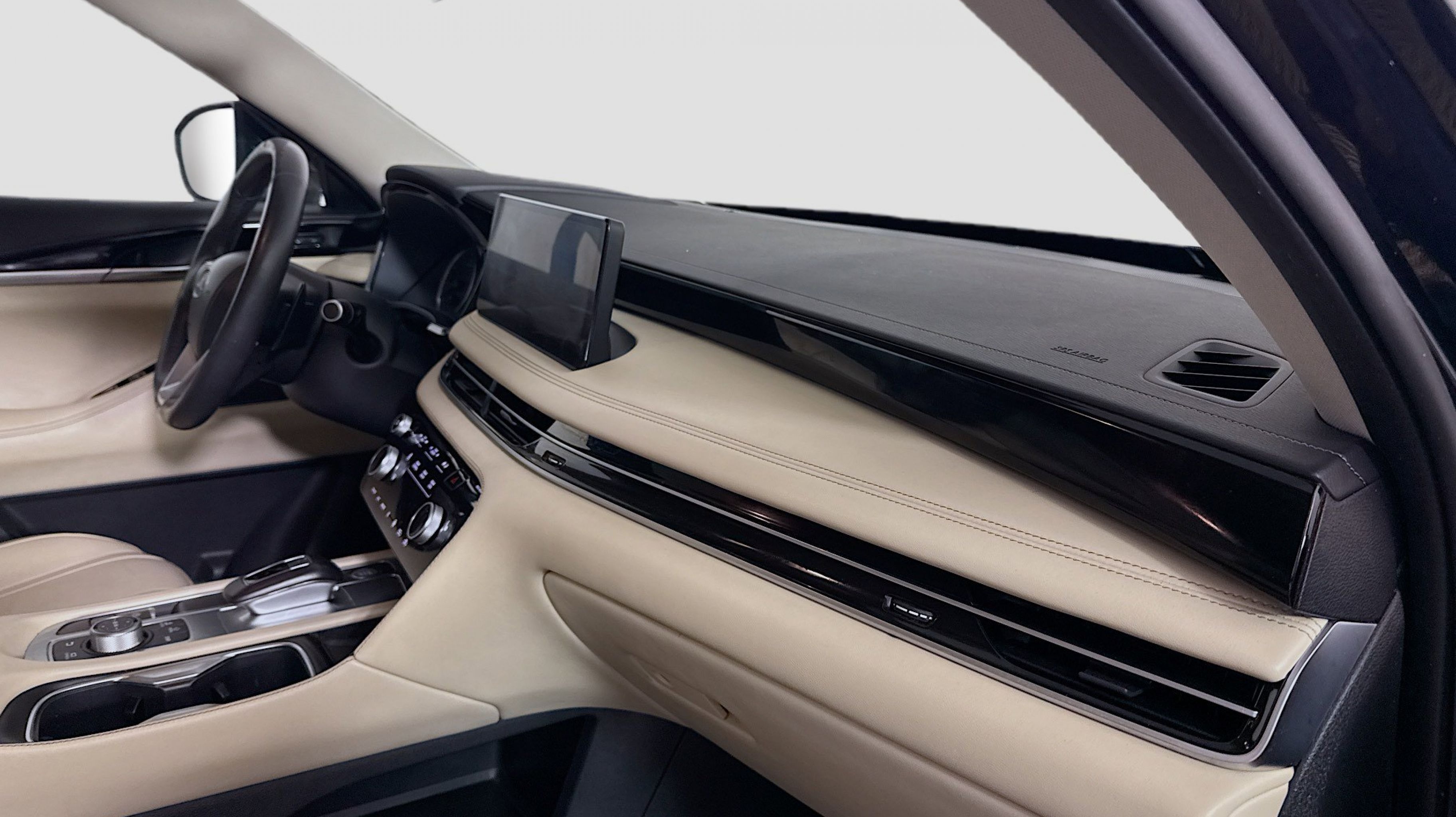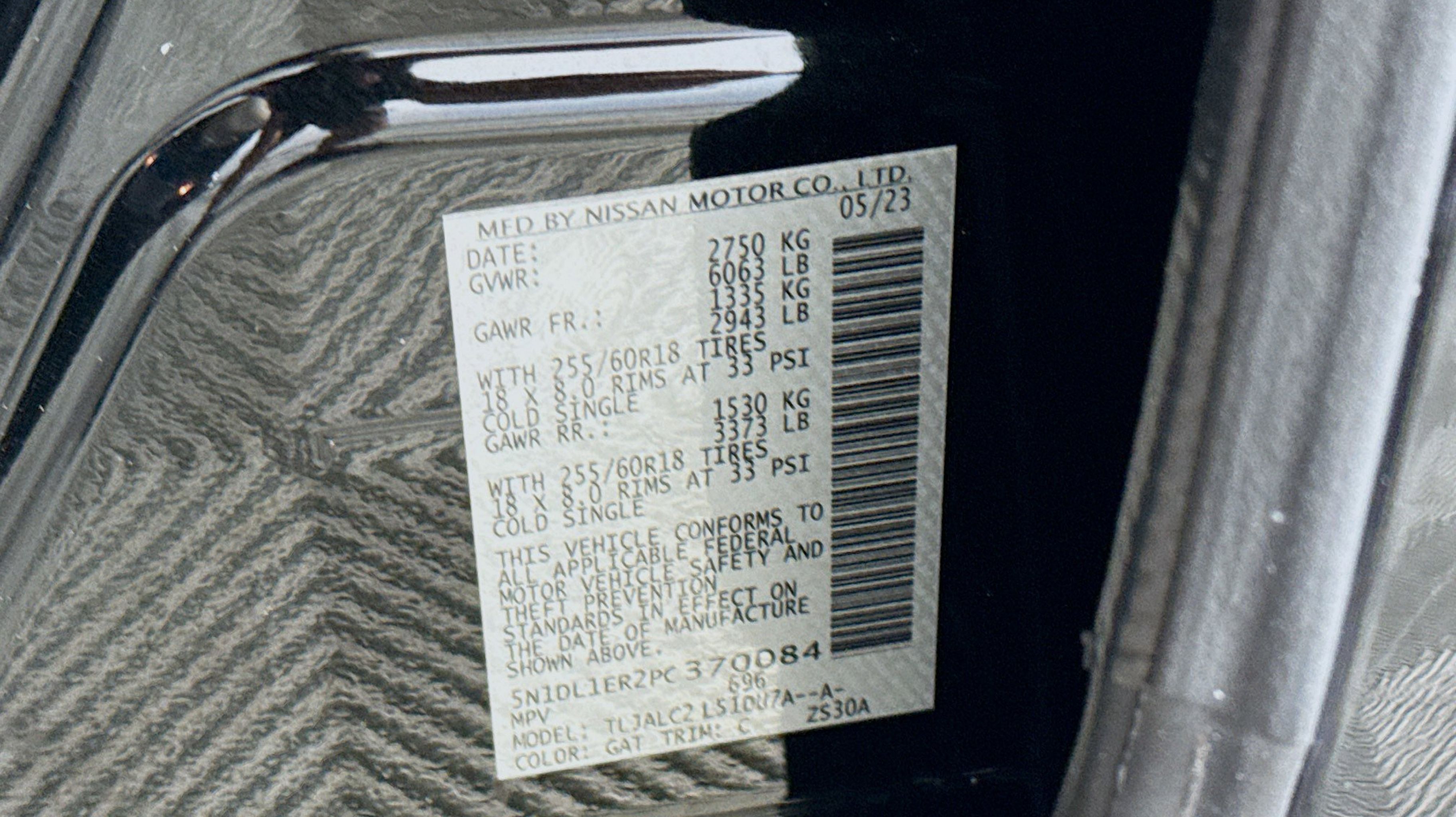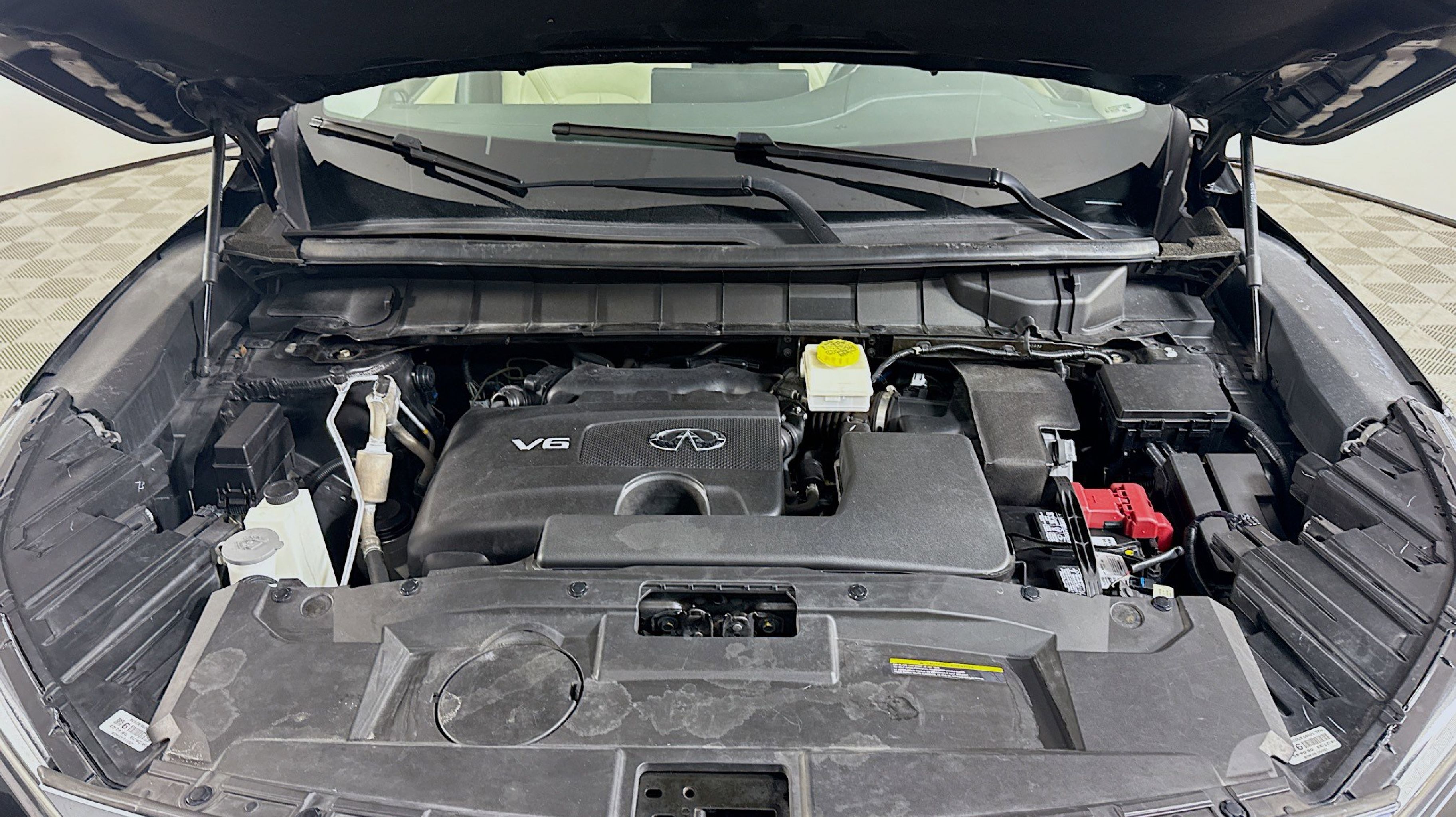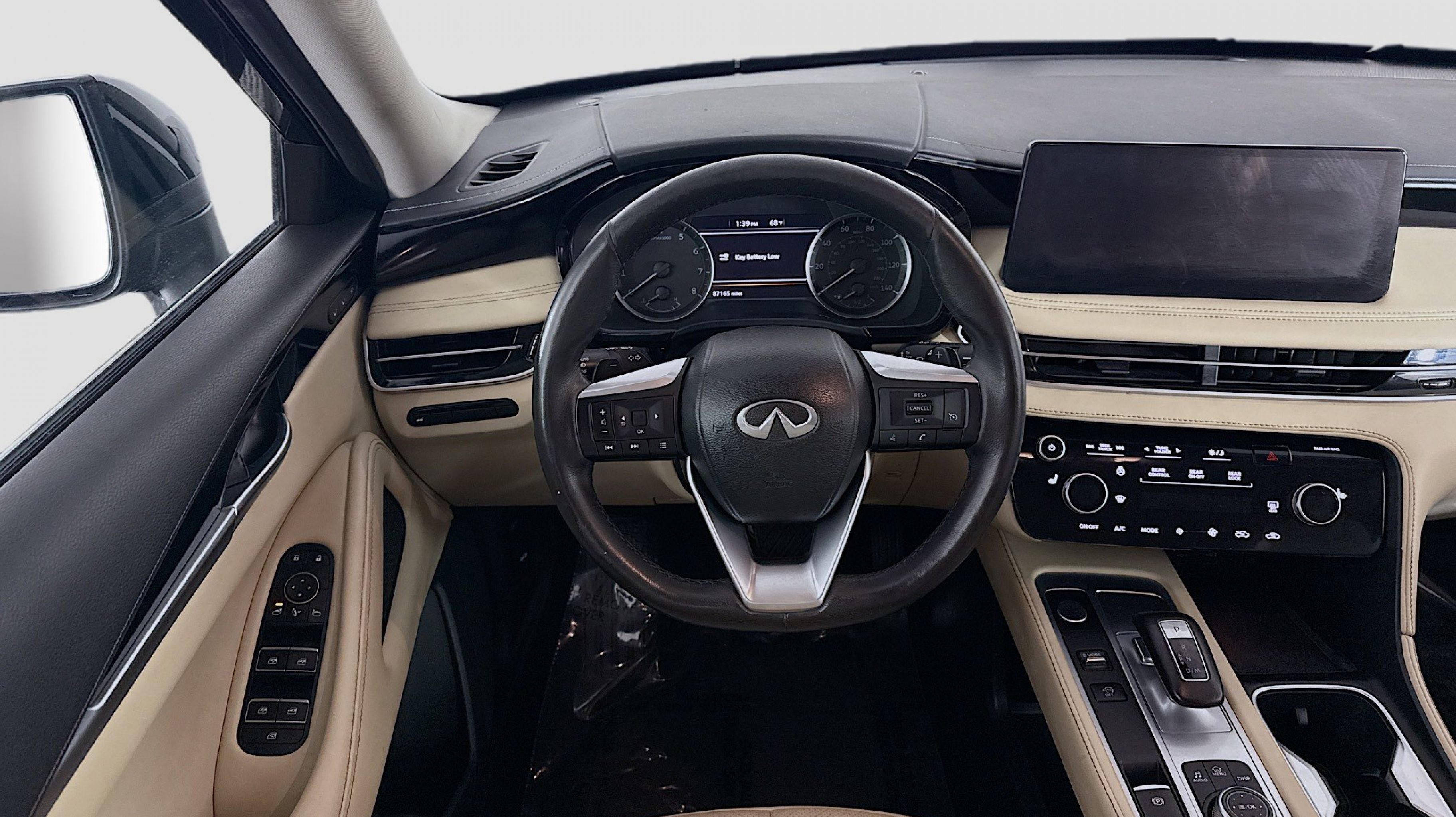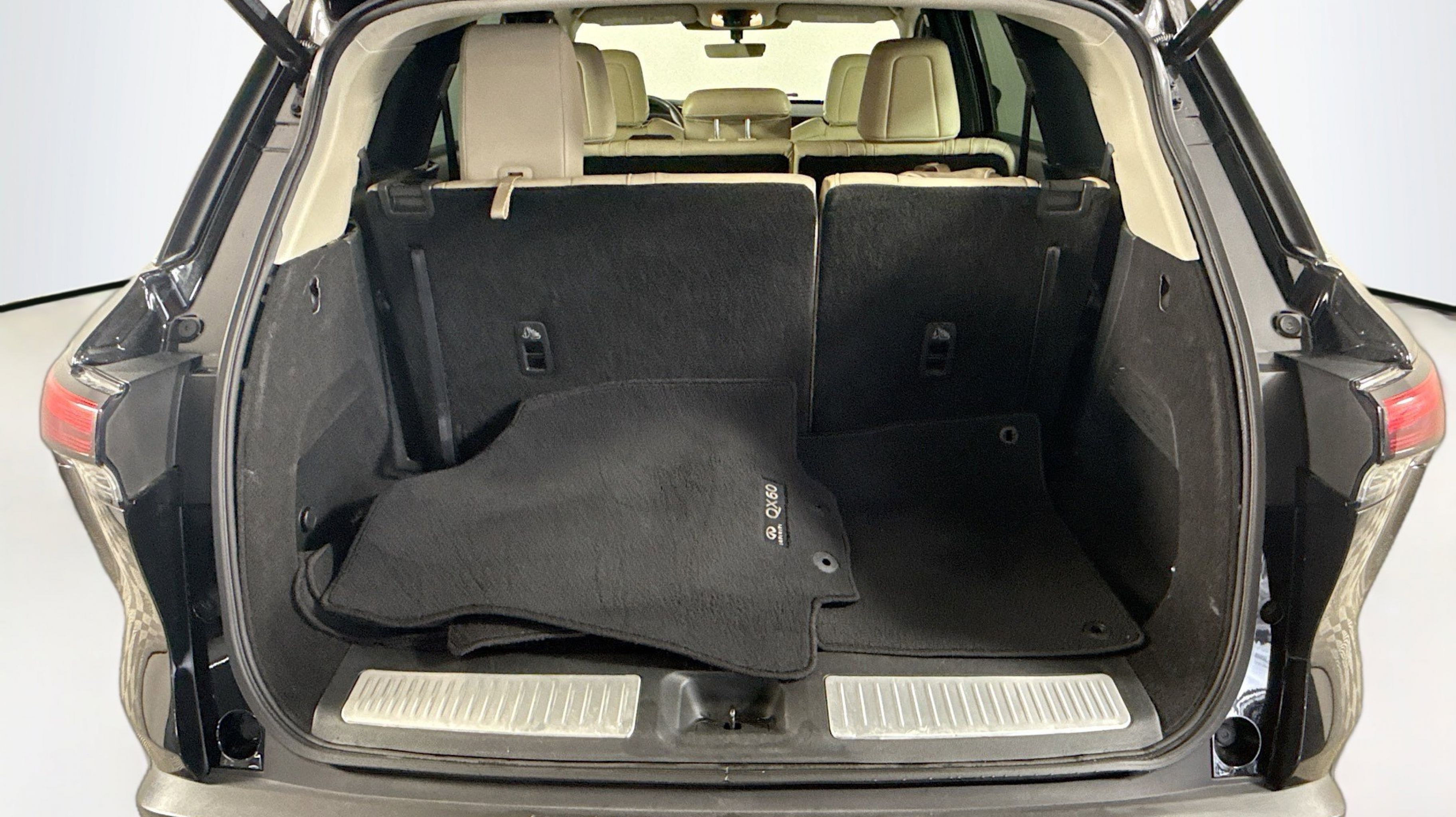 Mineral Black 2023 INFINITI QX60 PURE FWD 9-Speed Automatic 3.5L V6 3rd row seats: bench, 4-Wheel Disc Brakes, 4.334 Axle Ratio, 9 Speakers, ABS brakes, Air Conditioning, Alloy wheels, AM/FM radio: SiriusXM, Anti-whiplash front head restraints, Auto High-beam Headlights, Auto-dimming Rear-View mirror, Automatic temperature control, Blind Spot Warning, Brake assist, Bumpers: body-color, Delay-off headlights, Driver door bin, Driver vanity mirror, Dual front impact airbags, Dual front side impact airbags, Electronic Stability Control, Emergency communication system, Floor Mats on Bench Seats w/3rd Row Tray, Four wheel independent suspension, Front anti-roll bar, Front Bucket Seats, Front Center Armrest, Front dual zone A/C, Front reading lights, Fully automatic headlights, Heated door mirrors, Heated Front Bucket Seats, Heated front seats, Heated steering wheel, Illuminated entry, Knee airbag, Leather Shift Knob, Leather steering wheel, Leather-Appointed Seating Surfaces, Literature Kit, Low tire pressure warning, Memory seat, Occupant sensing airbag, Outside temperature display, Overhead airbag, Overhead console, Panic alarm, PANORAMA SUNROOF, Passenger door bin, Passenger vanity mirror, Power door mirrors, Power driver seat, Power Liftgate, Power passenger seat, Power steering, Power windows, Radio data system, Radio: AM/FM Audio System, Rain sensing wipers, Rear air conditioning, Rear anti-roll bar, Rear Parking Sensors, Rear reading lights, Rear seat center armrest, Rear side impact airbag, Rear window defroster, Rear window wiper, Reclining 3rd row seat, Remote keyless entry, Security system, Speed control, Speed-sensing steering, Speed-Sensitive Wipers, Splash Guards, Split folding rear seat, Spoiler, Steering wheel mounted audio controls, Tachometer, Telescoping steering wheel, Tilt steering wheel, Traction control, Trip computer, Turn signal indicator mirrors, Variably intermittent wipers, Wheels: 18 x 8J Machined Aluminum Alloy.