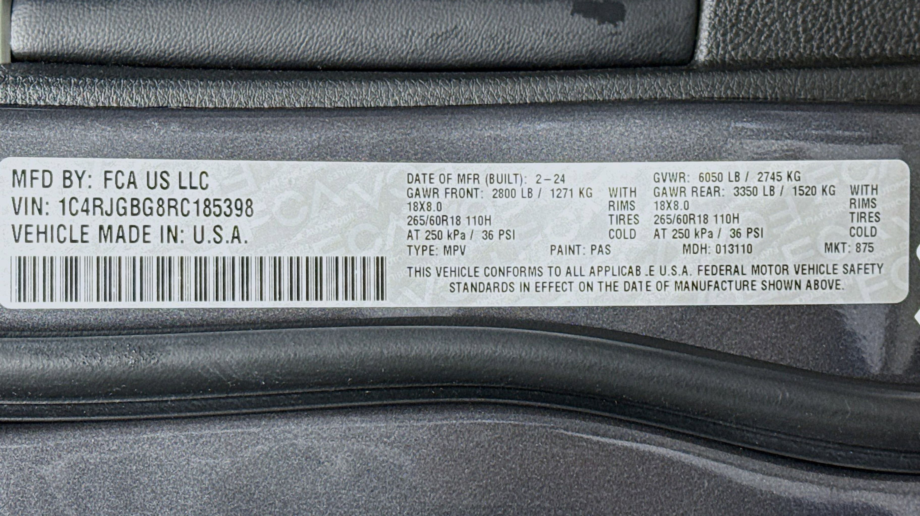 CARFAX One-Owner. Clean CARFAX. Quick Order Package 23E, 3.45 Rear Axle Ratio, 4-Wheel Disc Brakes, 6 Speakers, ABS brakes, Active Noise Control System, Air Conditioning, Alloy wheels, AM/FM radio: SiriusXM with 360L, Anti-whiplash front head restraints, Audio memory, Auto High-beam Headlights, Automatic temperature control, Brake assist, Bumpers: body-color, Capri Leatherette Seats, Compass, Delay-off headlights, Driver door bin, Driver vanity mirror, Dual front impact airbags, Dual front side impact airbags, Electronic Stability Control, Emergency communication system, Four wheel independent suspension, Front anti-roll bar, Front Bucket Seats, Front Center Armrest w/Storage, Front dual zone A/C, Front fog lights, Front License Plate Bracket, Front reading lights, Fully automatic headlights, Garage door transmitter, Heated door mirrors, Heated REAR seats, Heated rear seats, Heated steering wheel, Illuminated entry, Knee airbag, Low tire pressure warning, Memory seat, Navigation System, Normal Duty Suspension, Occupant sensing airbag, Outside temperature display, Overhead airbag, Overhead console, Panic alarm, ParkView Rear Back-Up Camera, Passenger door bin, Passenger vanity mirror, Power door mirrors, Power driver seat, Power Liftgate, Power passenger seat, Power steering, Power windows, Radio data system, Radio: Uconnect 5 Nav w/10.1 Display, Rear anti-roll bar, Rear reading lights, Rear window defroster, Rear window wiper, Remote keyless entry, Security system, Speed control, Speed-Sensitive Wipers, Split folding rear seat, Spoiler, Steering wheel mounted audio controls, Tachometer, Telescoping steering wheel, Tilt steering wheel, Traction control, Trip computer, Turn signal indicator mirrors, Variably intermittent wipers, Voltmeter, Wheels: 18 x 8 Polished/Painted Aluminum, Quick Order Package 23E.