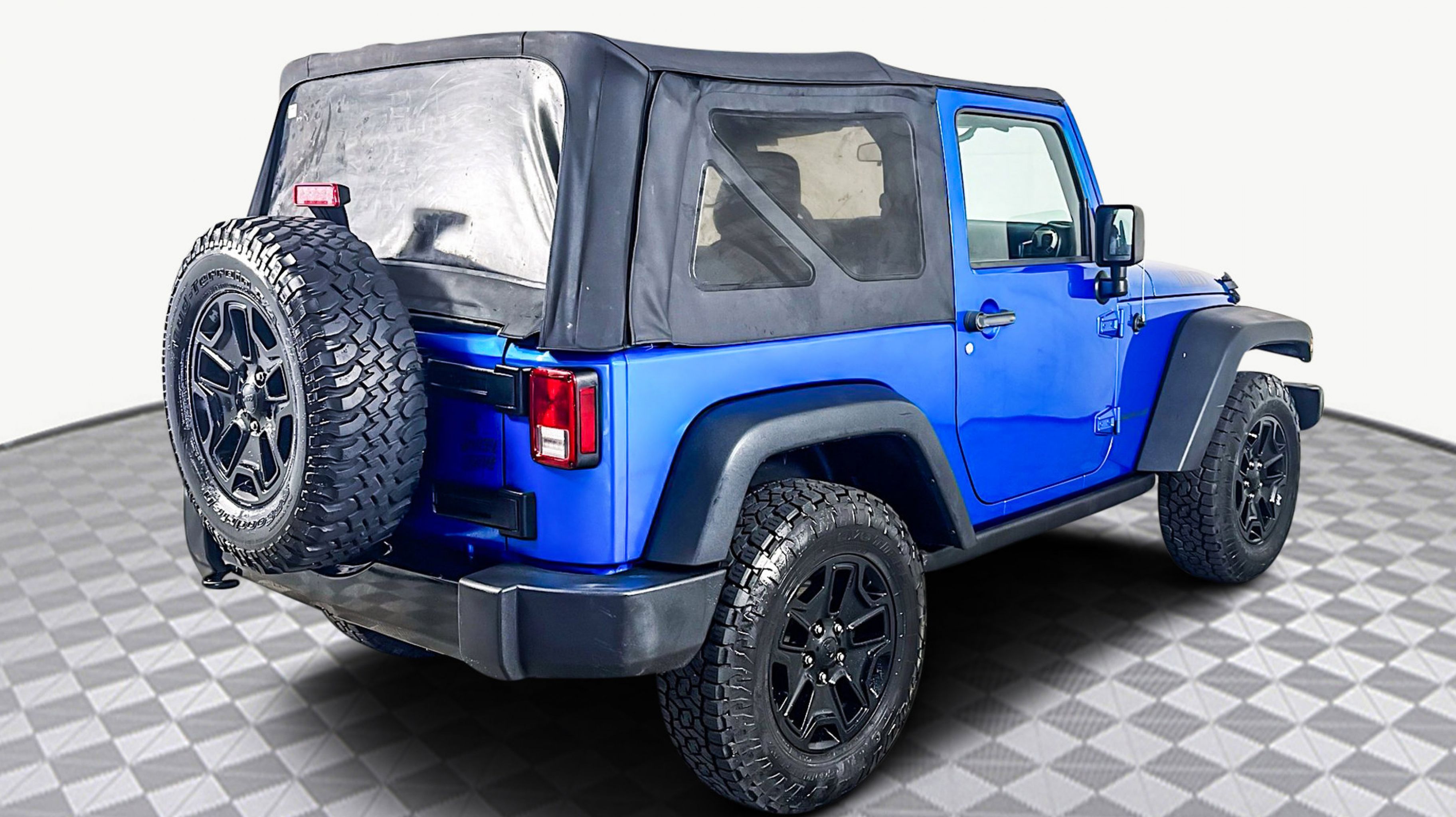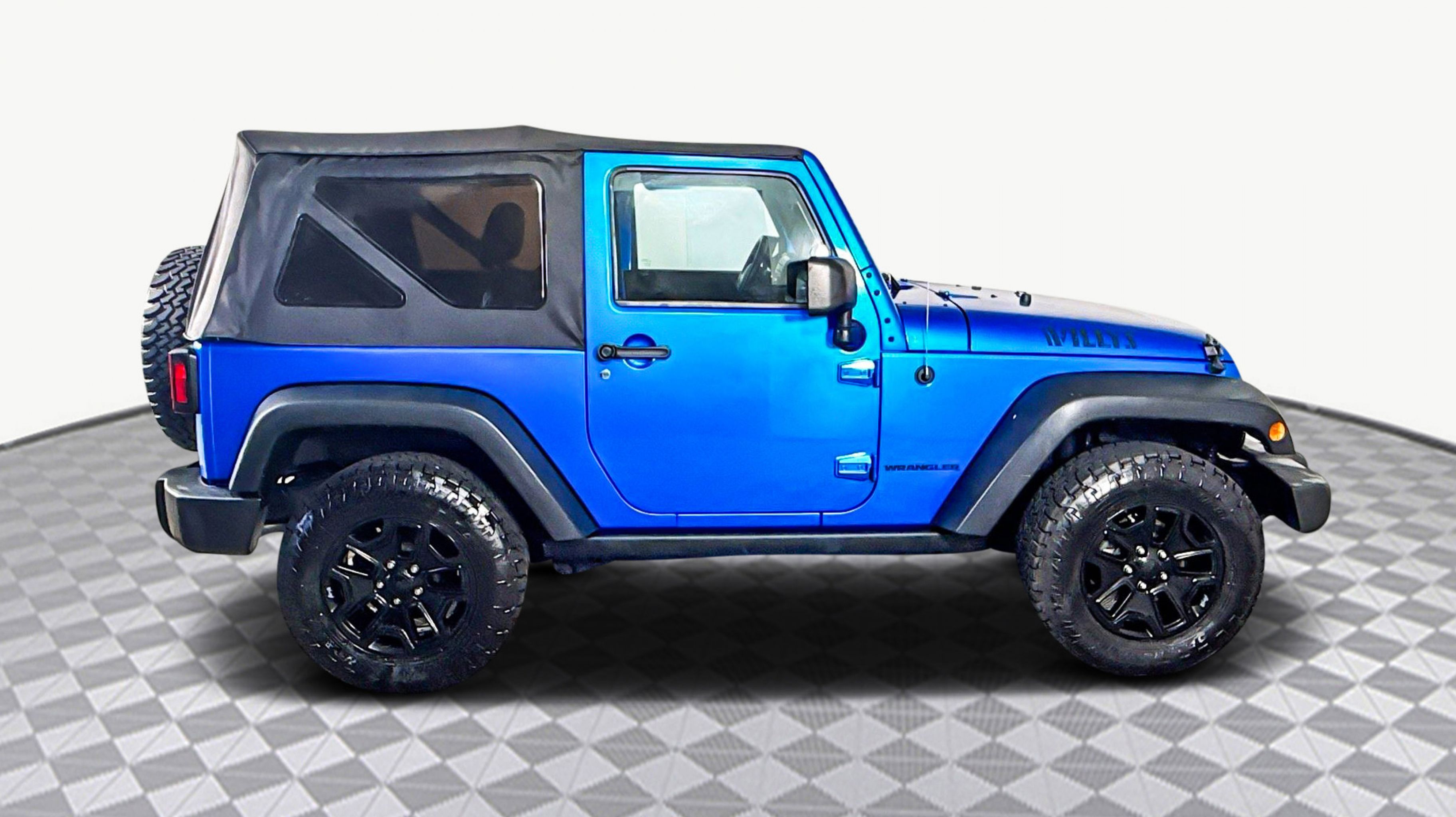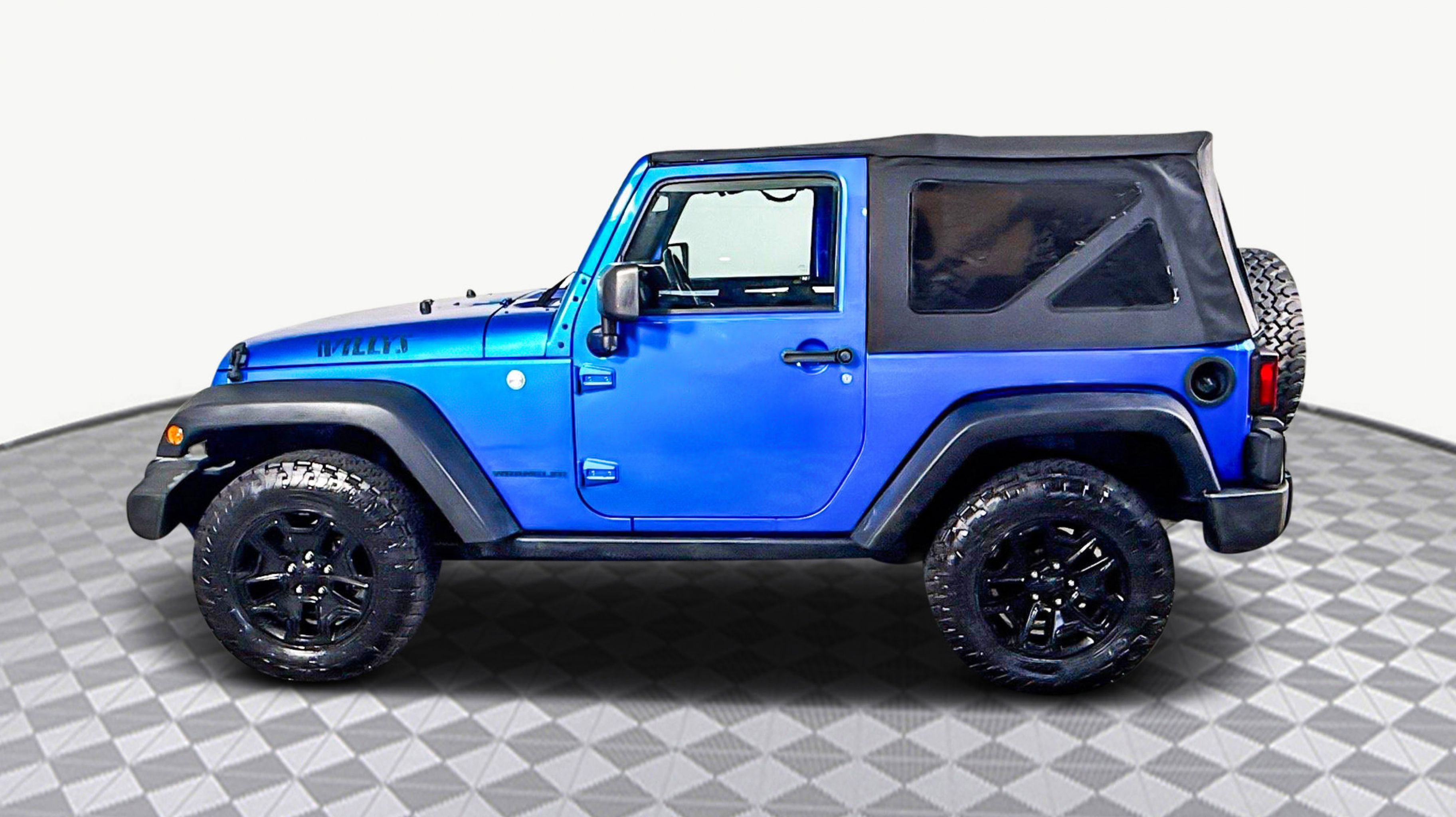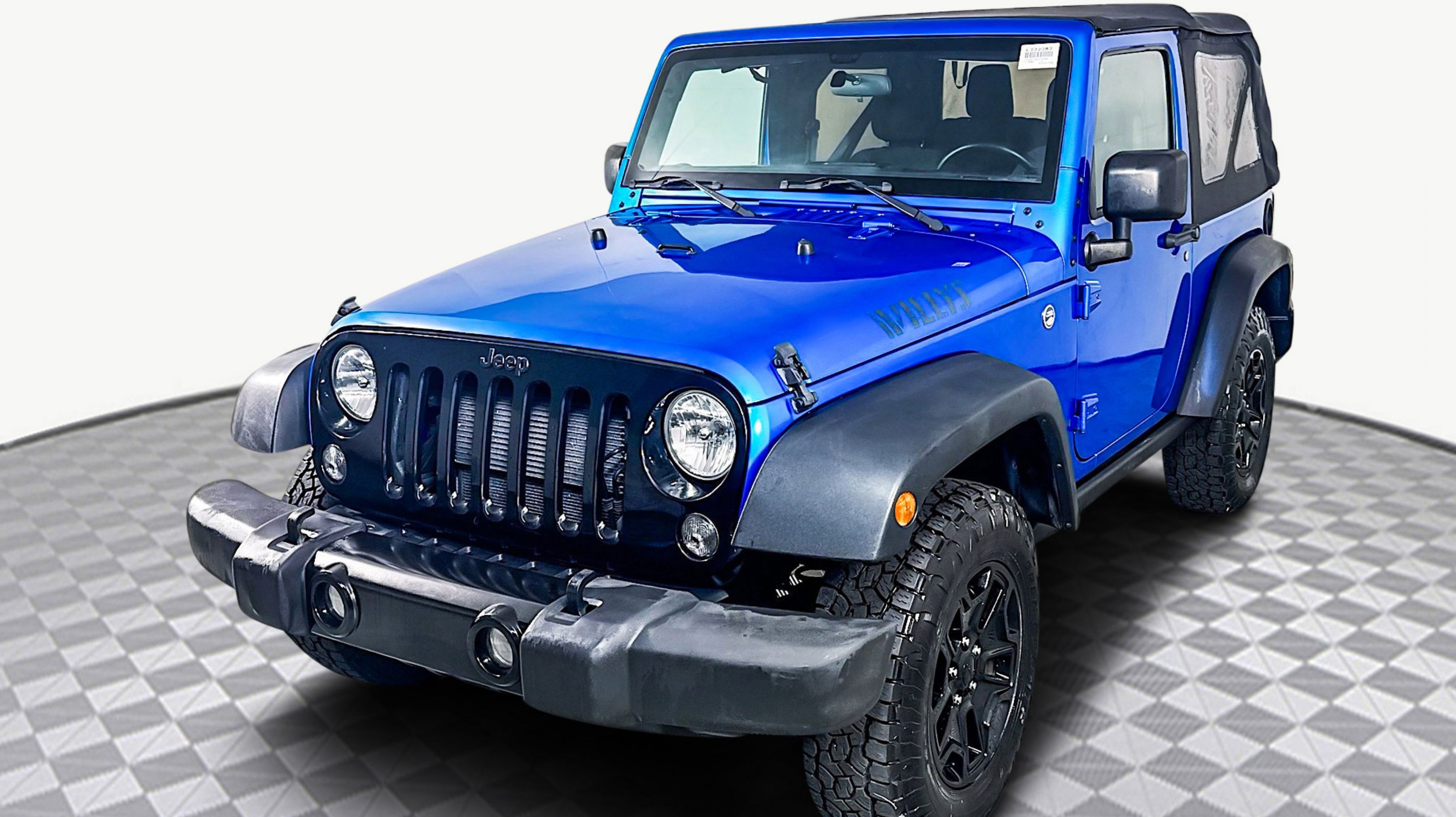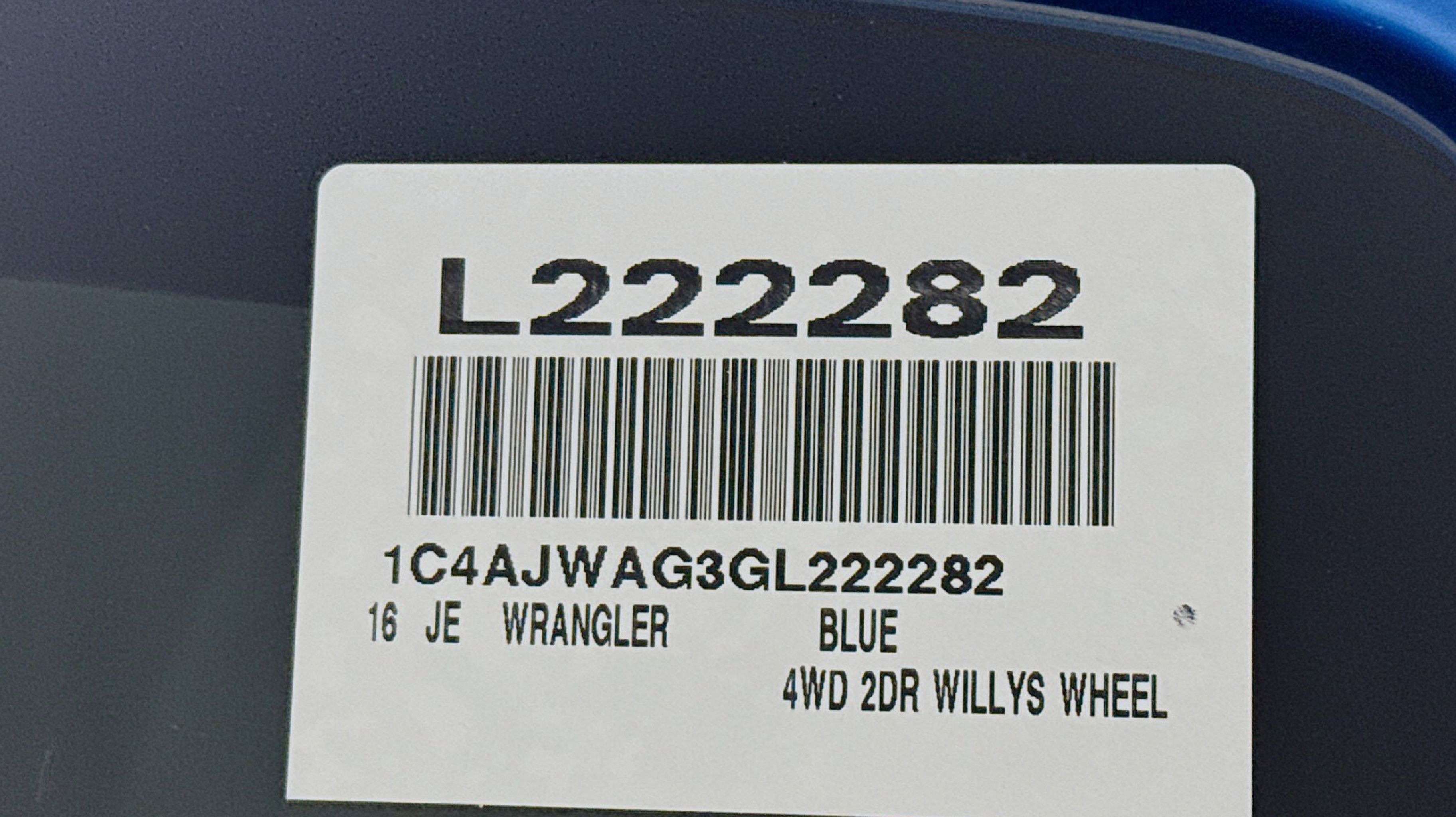 Hydro Blue Pearlcoat 2016 Jeep Wrangler Willys Wheeler 4WD 5-Speed Automatic 3.6L V6 24V VVT 1-Yr SiriusXM Radio Service, 3.73 Rear Axle Ratio, 4-Wheel Drive Swing Gate Decal, Anti-Spin Differential Rear Axle, Black Jeep Grille Badge, Connectivity Group, Deep Tint Sunscreen Windows, Jeep Trail Rated Kit, Low Gloss Black Wrangler Decal, MOPAR Slush Mats, Performance Suspension, Quick Order Package 24K Willys Wheeler, Rear Passenger Assist Handles Kit, Remote USB Port, SIRIUS Satellite Radio, Tire Pressure Monitoring Display, Uconnect Voice Command w/Bluetooth, Vehicle Information Center, Wheels: 17 x 7.5 High Gloss Black Willys, Willys Hood Decal, Willys Wheeler Grille, Willys Wheeler Package, 16 x 7.0 Luxury Styled Steel Wheels, 4-Wheel Disc Brakes, 8 Speakers, ABS brakes, Air Conditioning, AM/FM radio, Audio Jack Input for Mobile Devices, Brake assist, CD player, Cloth Seats w/Adjustable Head Restraints, Compass, Driver door bin, Driver vanity mirror, Dual front impact airbags, Electronic Stability Control, Front anti-roll bar, Front Bucket Seats, Front Center Armrest w/Storage, Front fog lights, Integrated roll-over protection, Low tire pressure warning, Normal Duty Suspension, Occupant sensing airbag, Outside temperature display, Passenger door bin, Passenger vanity mirror, Power steering, Radio: 130, Rear anti-roll bar, Speed control, Steering wheel mounted audio controls, Sunrider Soft Top, Tachometer, Tilt steering wheel, Traction control, Trip computer, Variably intermittent wipers, 1-Yr SiriusXM Radio Service, 3.73 Rear Axle Ratio, 4-Wheel Drive Swing Gate Decal, Anti-Spin Differential Rear Axle, Black Jeep Grille Badge, Connectivity Group, Deep Tint Sunscreen Windows, Jeep Trail Rated Kit, Low Gloss Black Wrangler Decal, MOPAR Slush Mats, Performance Suspension, Quick Order Package 24K Willys Wheeler, Rear Passenger Assist Handles Kit, Remote USB Port, SIRIUS Satellite Radio, Tire Pressure Monitoring Display, Uconnect Voice Command w/Bluetooth, Vehicle Information Center, Wheels: 17 x 7.5 High Gloss Black Willys, Willys Hood Decal, Willys Wheeler Grille, Willys Wheeler Package.