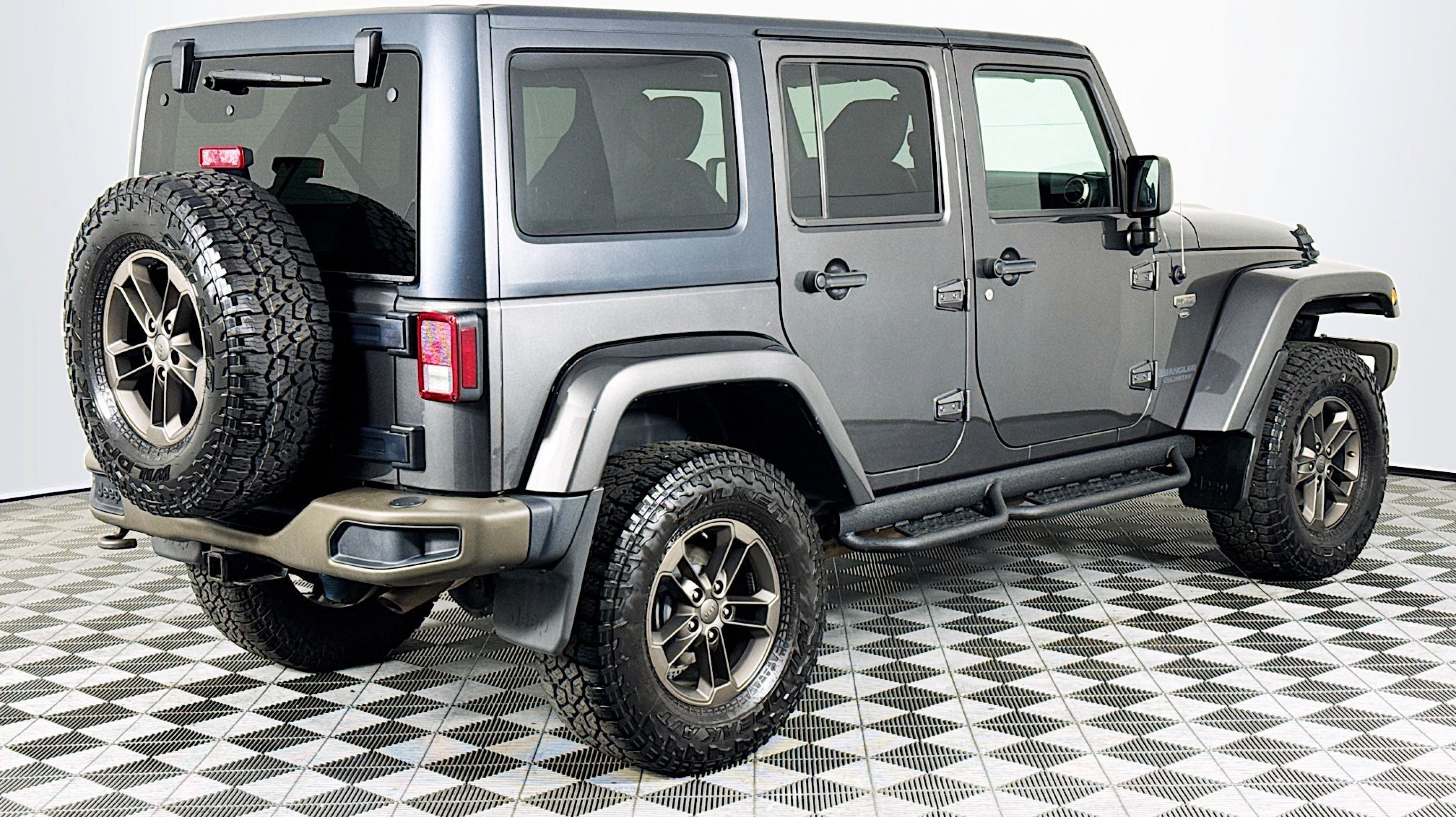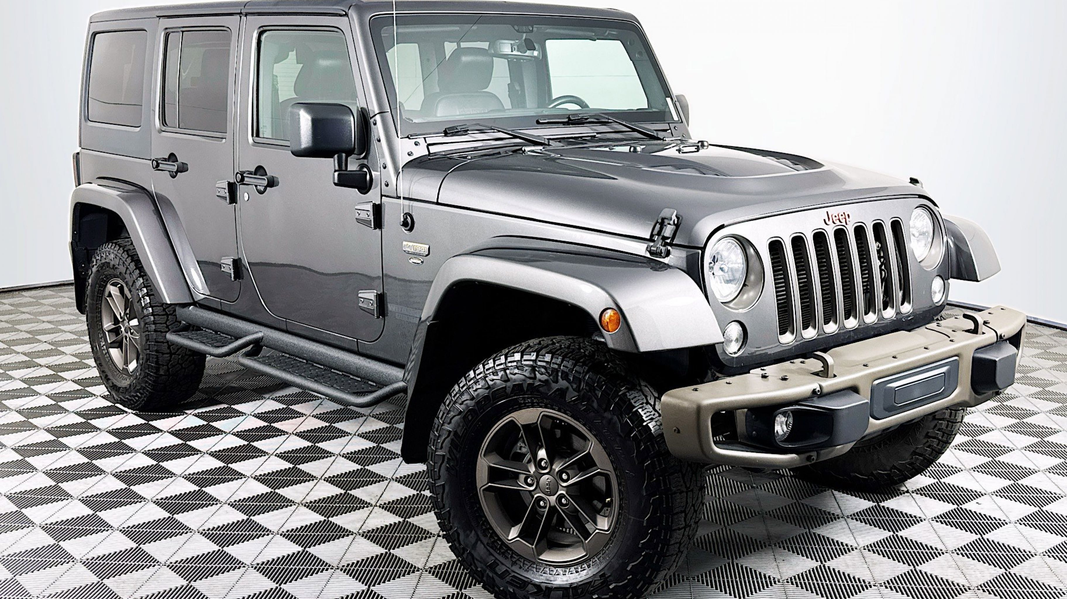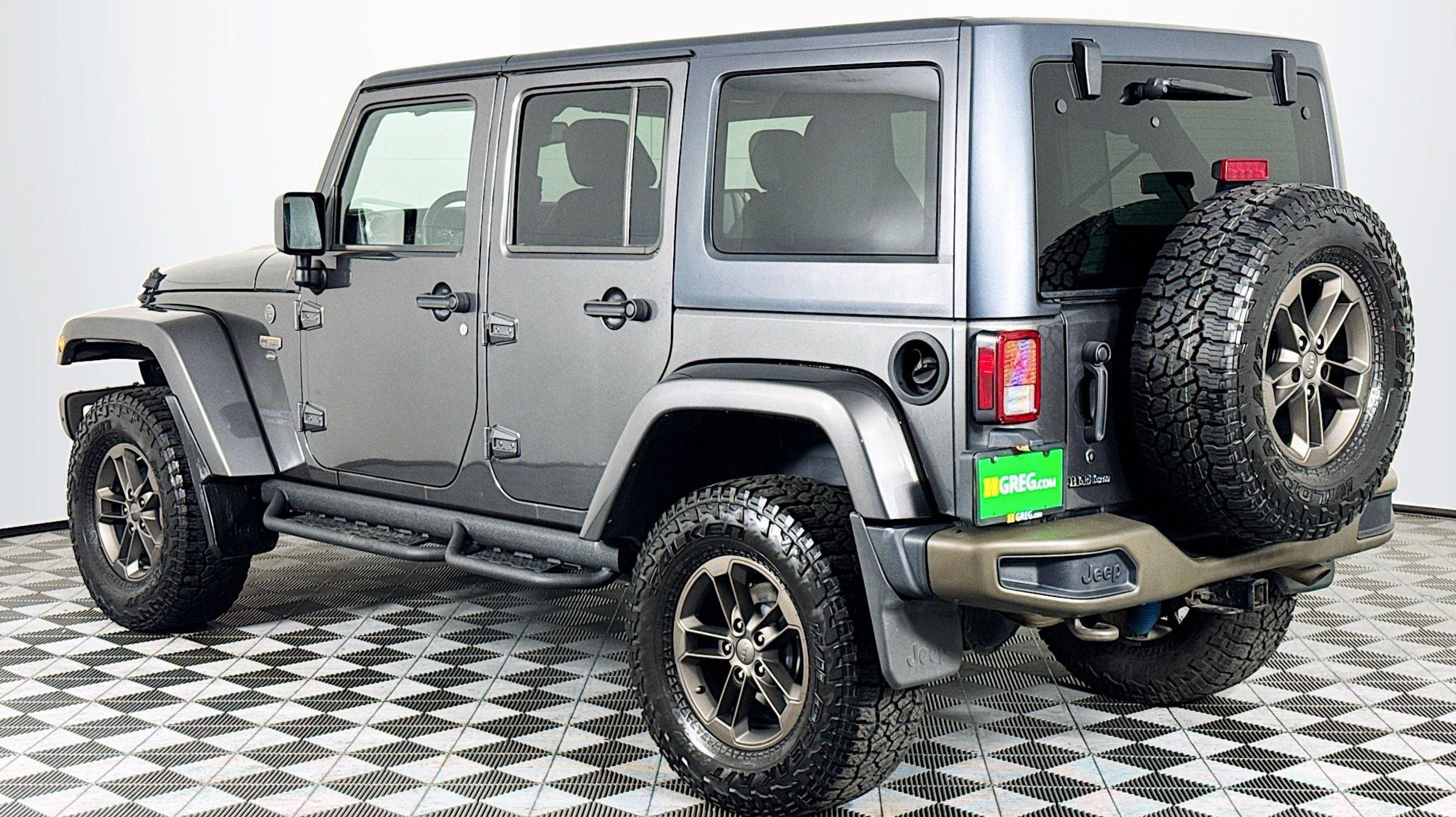- QUICK ORDER PACKAGE 24H 75TH ANNIVERSARY -inc: Engine: 3.6L V6 24V VVT Transmission: 5-Speed Automatic (W5A580) 2 Front & 1 Rear Bronze Tow Hook Bronze Jeep Grille Badge Bronze Trail Rated Badge Low Gloss Black Wrangler Decal Moroccan Sun Instrument Panel Bezel Bronze Steel Rear Bumper Sunrider Soft Top Bronze Steel Front Bumper Jeep 75th Anniversary Package Moroccan Sun Interior Accents Vehicle Information Center Remote USB Port Uconnect Voice Command w/Bluetooth Tire Pressure Monitoring Display 75th Anniversary Badge Rock Rails Chrome/Leather Wrapped Shift Knob IP Grab Handle w/75th Anniversary Logo Hood w/Power Dome Goodyear Brand Tires Body Color Grille w/Bronze Accent