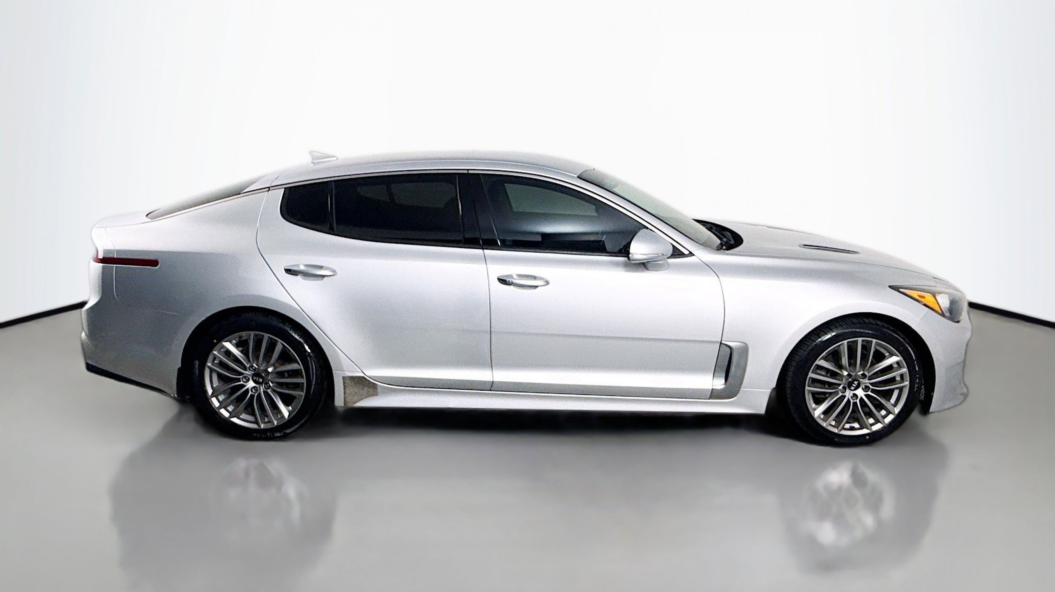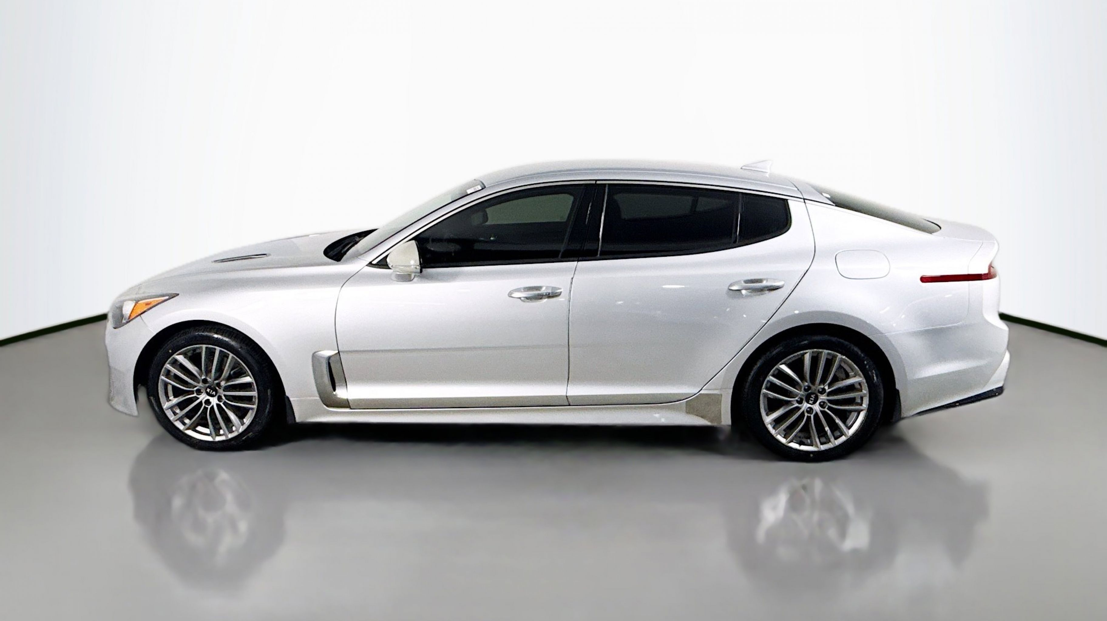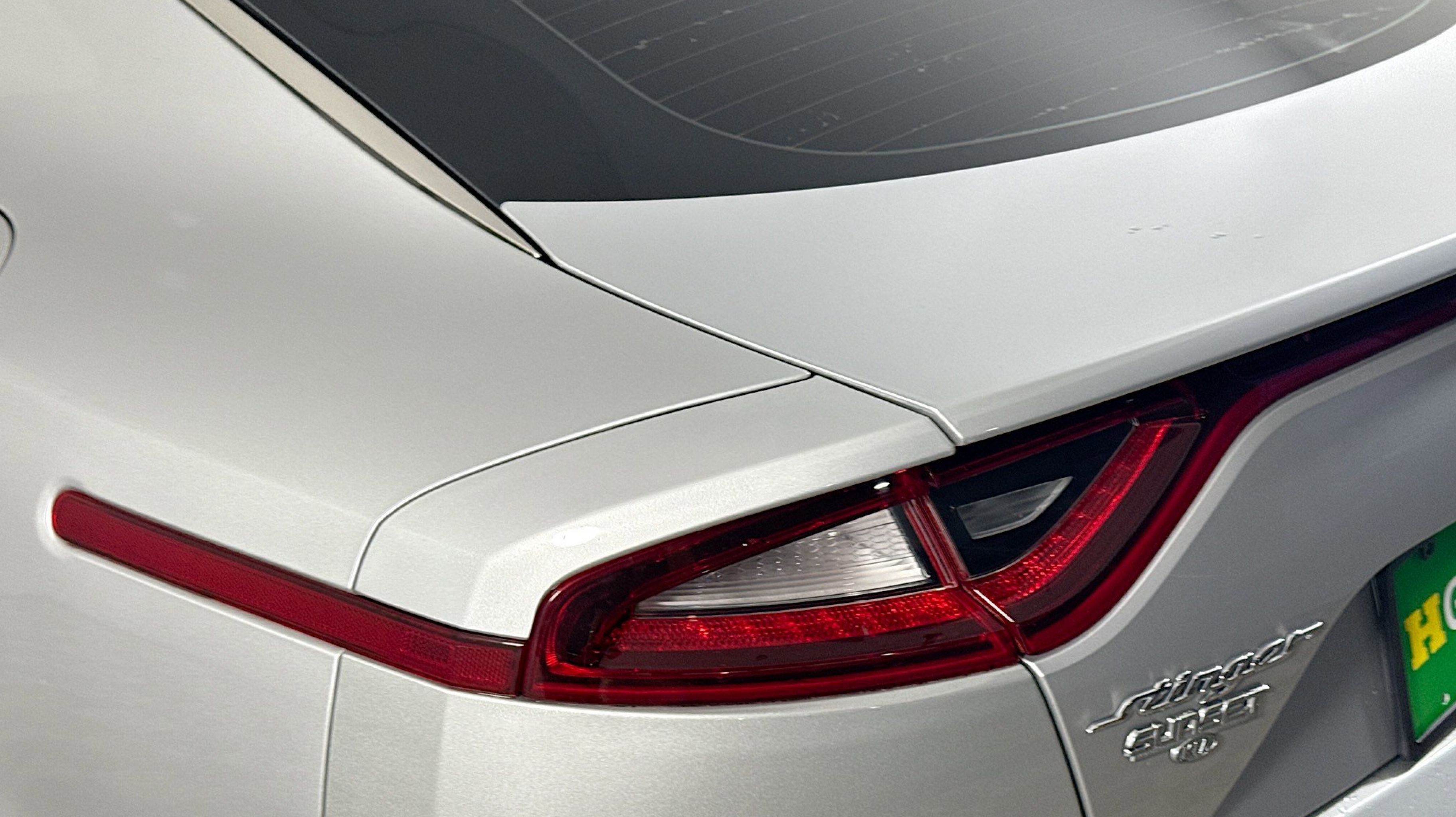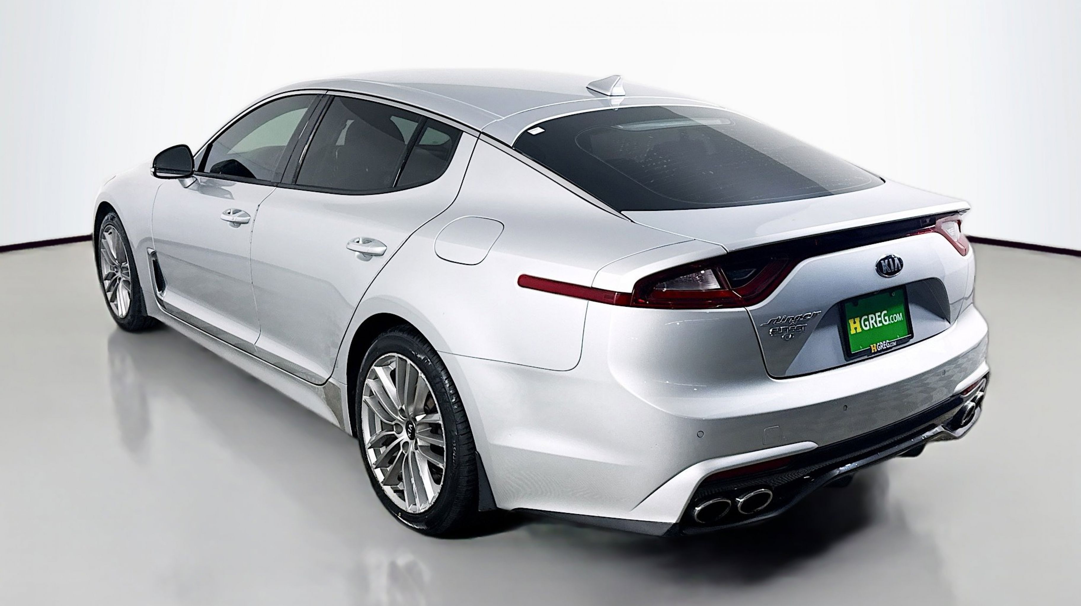 Silky Silver 2018 Kia Stinger RWD 8-Speed Automatic 2.0L I4 Turbocharged DOHC 16V LEV3-ULEV125 255hp 4-Wheel Disc Brakes, 6 Speakers, ABS brakes, Air Conditioning, Alloy wheels, AM/FM radio: SiriusXM, Anti-whiplash front head restraints, Apple CarPlay & Android Auto, Auto-dimming Rear-View mirror, Automatic temperature control, Brake assist, Bumpers: body-color, Cargo Net, Cargo Tray, Delay-off headlights, Driver door bin, Driver vanity mirror, Dual front impact airbags, Dual front side impact airbags, EC Mirror w/Compass & HomeLink, Electronic Stability Control, Emergency communication system: UVO eServices, Exterior Parking Camera Rear, Four wheel independent suspension, Front anti-roll bar, Front Bucket Seats, Front Center Armrest, Front dual zone A/C, Front reading lights, Fully automatic headlights, Heated door mirrors, Heated Front Bucket Seats, Heated front seats, Illuminated entry, Knee airbag, Leather Seat Trim, Low tire pressure warning, Occupant sensing airbag, Outside temperature display, Overhead airbag, Overhead console, Panic alarm, Passenger door bin, Passenger vanity mirror, Power door mirrors, Power driver seat, Power passenger seat, Power steering, Power windows, Radio: AM/FM/MP3/HD/SiriusXM Audio System, Rear air conditioning, Rear anti-roll bar, Rear reading lights, Rear seat center armrest, Rear window defroster, Remote keyless entry, Security system, Speed control, Speed-Sensitive Wipers, Split folding rear seat, Spoiler, Steering wheel mounted audio controls, Tachometer, Telescoping steering wheel, Tilt steering wheel, Traction control, Trip computer, Turn signal indicator mirrors, Variably intermittent wipers, Wheels: 18 x 8J Painted Finish Alloy.