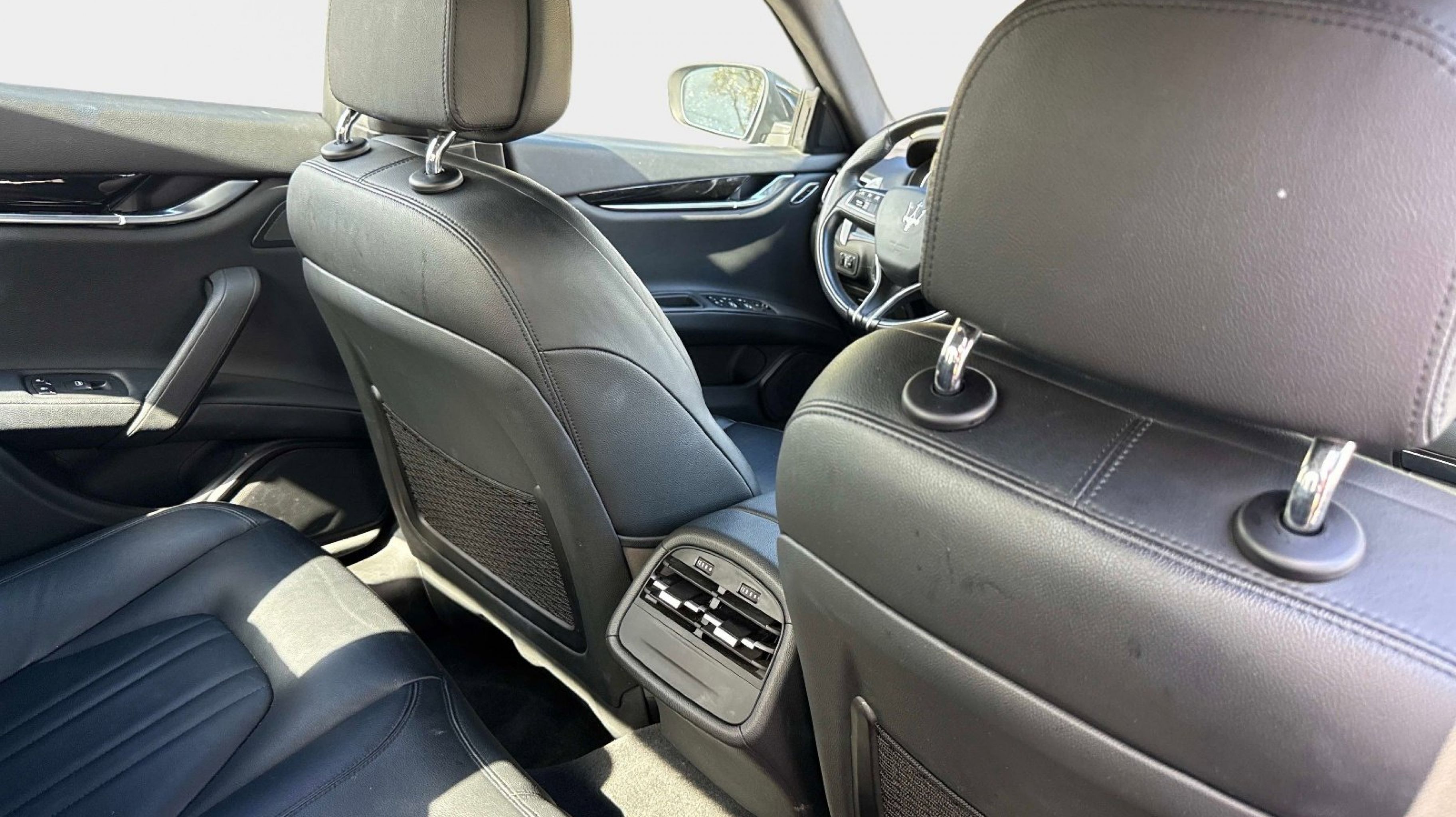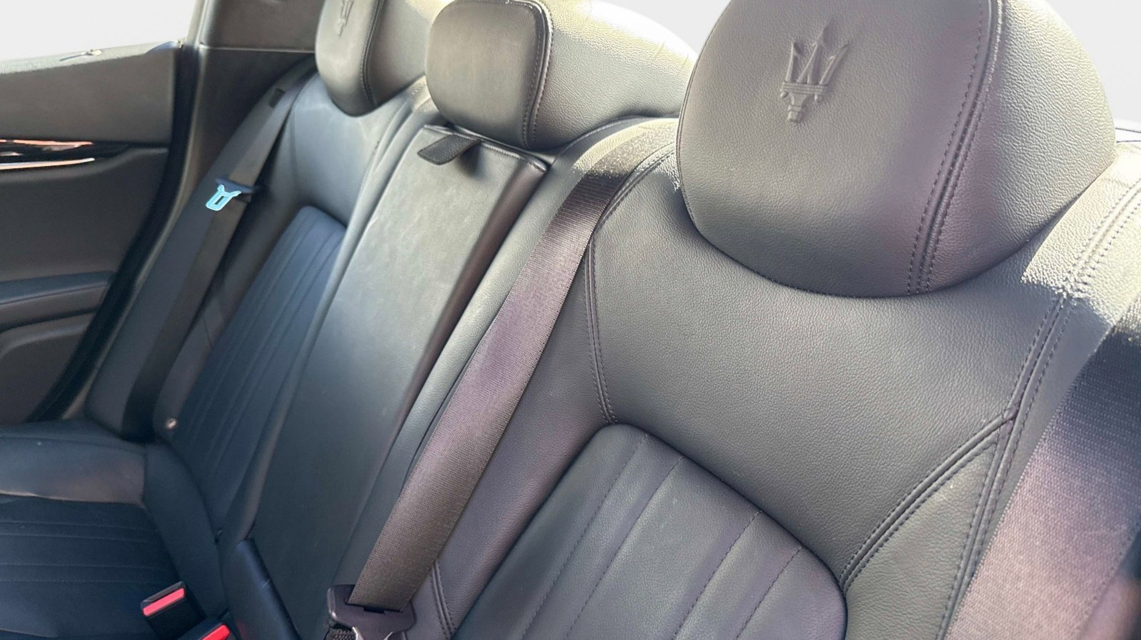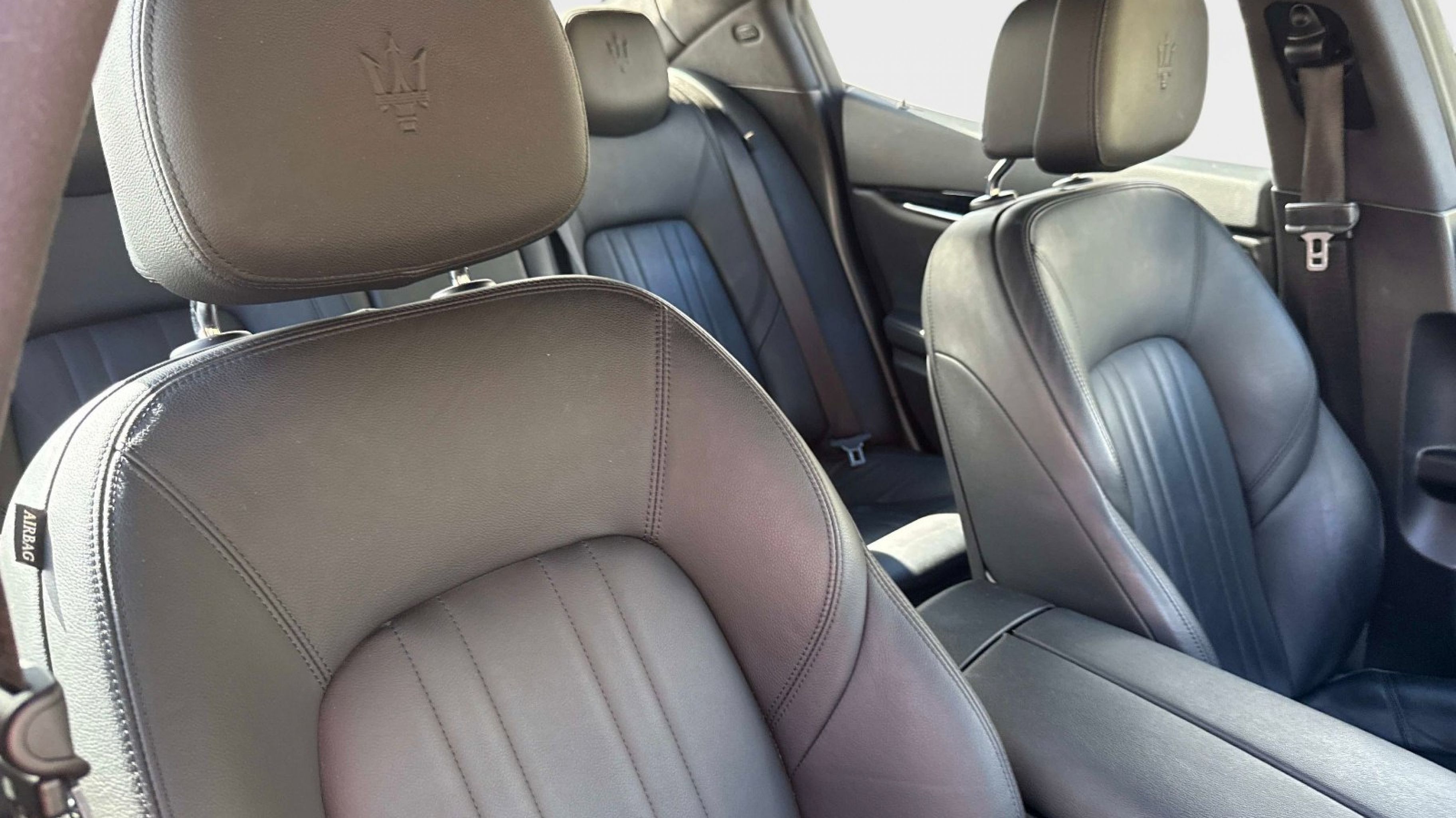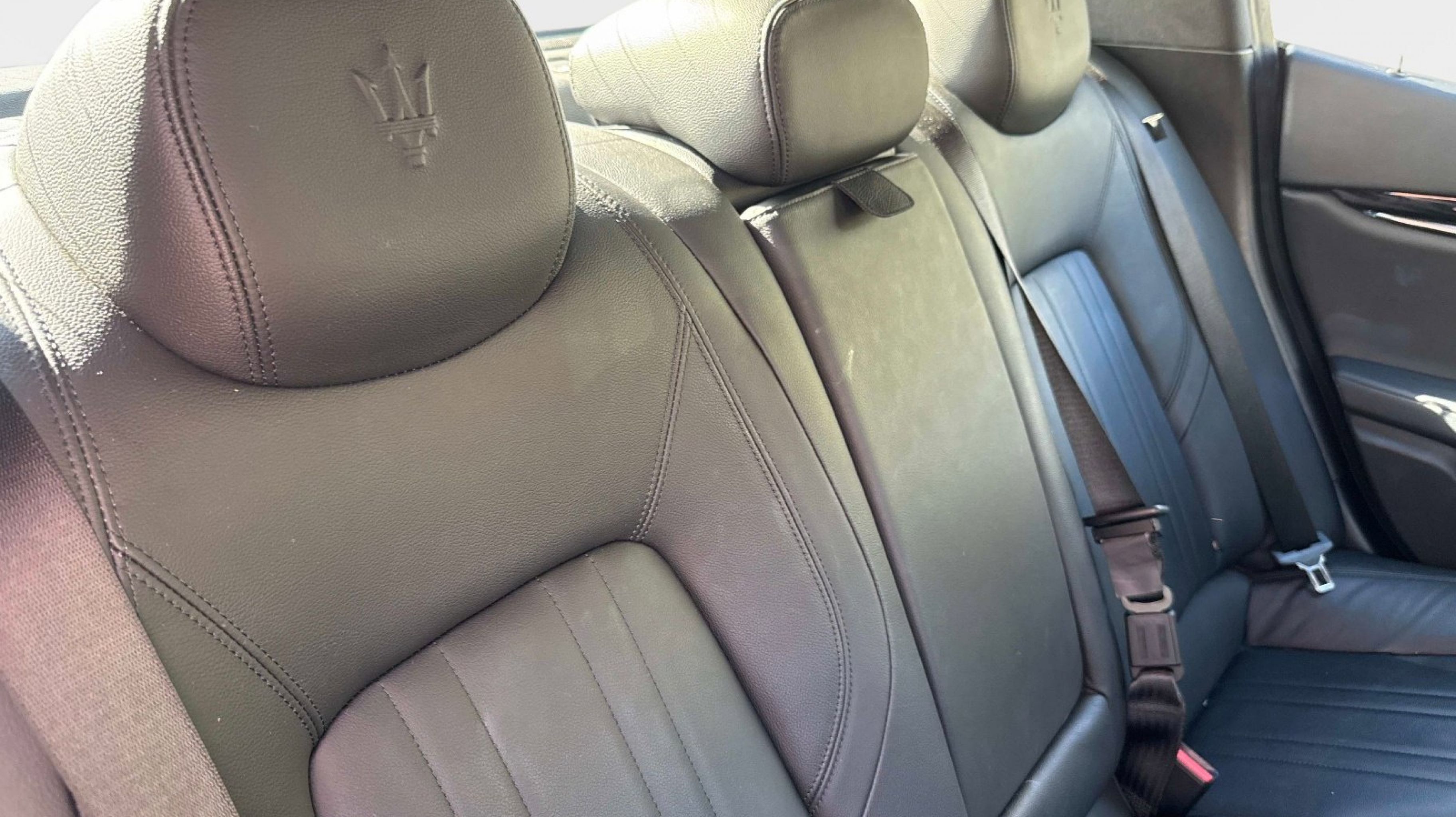12-Way Power Heated Front Seats, 4-Wheel Disc Brakes, 8 Speakers, ABS brakes, Air Conditioning, Alloy wheels, Aluminum Column-Mounted Paddle Shifters, AM/FM radio: SiriusXM, Anti-whiplash front head restraints, Apple CarPlay/Android Auto, Auto-dimming door mirrors, Auto-dimming Rear-View mirror, Automatic temperature control, Brake assist, Bumpers: body-color, Compass, Delay-off headlights, Driver door bin, Driver vanity mirror, Dual front impact airbags, Dual front side impact airbags, Electronic Stability Control, Emergency communication system: Maserati Connect, Exterior Parking Camera Rear, Four wheel independent suspension, Front anti-roll bar, Front Bucket Seats, Front Center Armrest w/Storage, Front dual zone A/C, Front reading lights, Garage door transmitter: HomeLink, Heated door mirrors, Heated REAR seats, Heated steering wheel, High intensity discharge headlights: Bi-Xenon, Illuminated entry, Knee airbag, Leather Shift Knob, Leather steering wheel, Leather Upholstery, Low tire pressure warning, Memory seat, Navigation System, Occupant sensing airbag, Outside temperature display, Overhead airbag, Overhead console, Panic alarm, Passenger door bin, Passenger vanity mirror, Power door mirrors, Power driver seat, Power moonroof, Power passenger seat, Power steering, Power windows, Radio data system, Radio: AM/FM w/Maserati Intelligent Assistant, Rain sensing wipers, Rear anti-roll bar, Rear fog lights, Rear reading lights, Rear seat center armrest, Rear window defroster, Remote keyless entry, Security system, Speed control, Speed-sensing steering, Speed-Sensitive Wipers, Split folding rear seat, Sport steering wheel, Steering wheel memory, Steering wheel mounted audio controls, Tachometer, Telescoping steering wheel, Tilt steering wheel, Traction control, Trip computer, Turn signal indicator mirrors, Variably intermittent wipers, Voltmeter, Wheels: 19 Silver Poseidone.