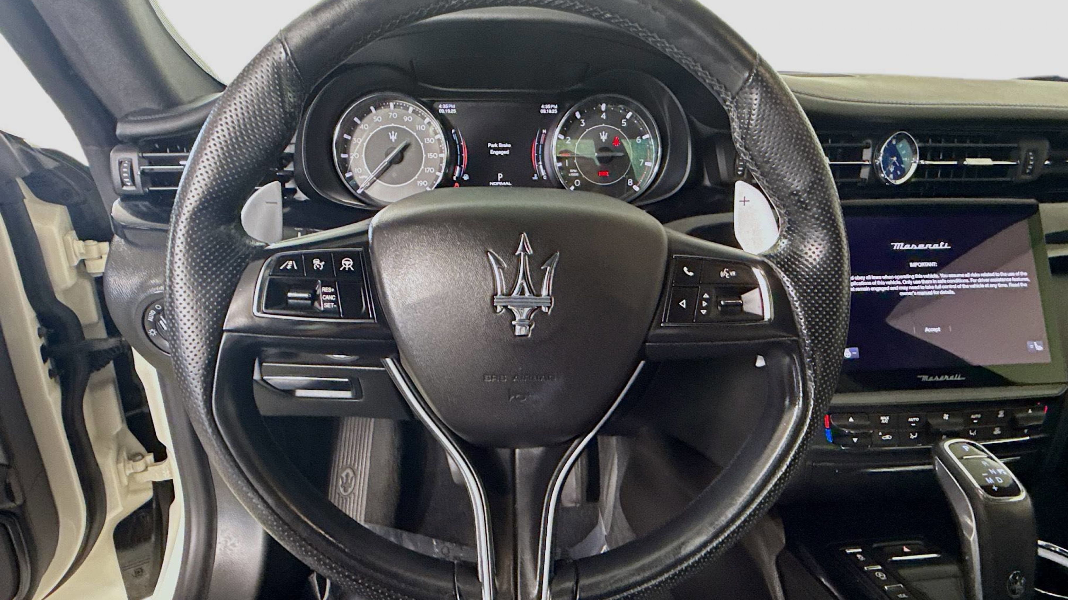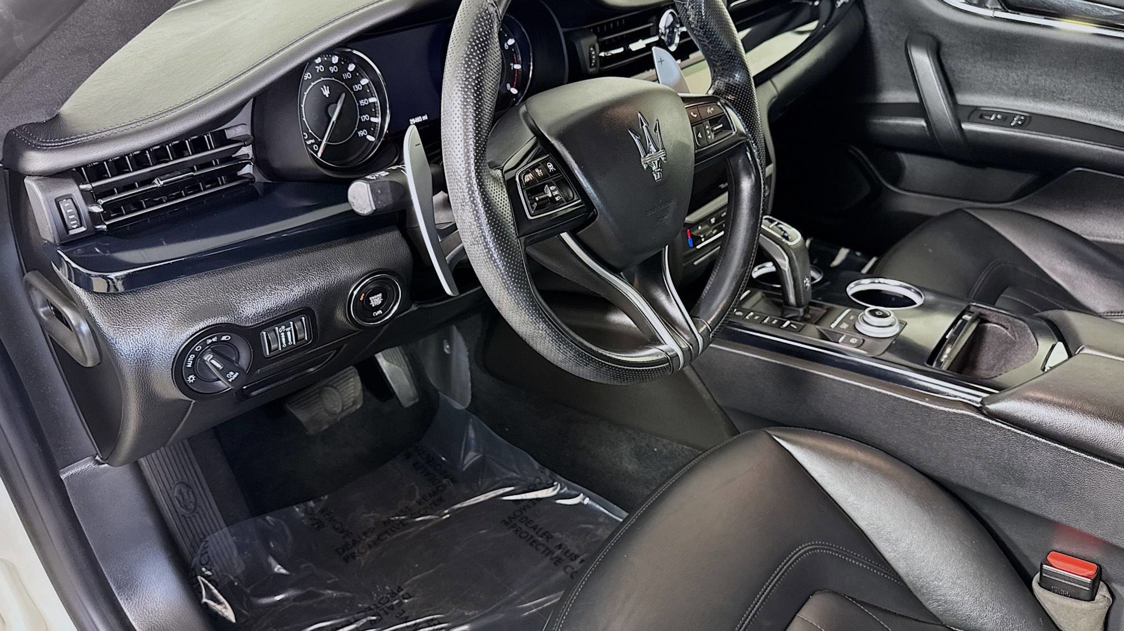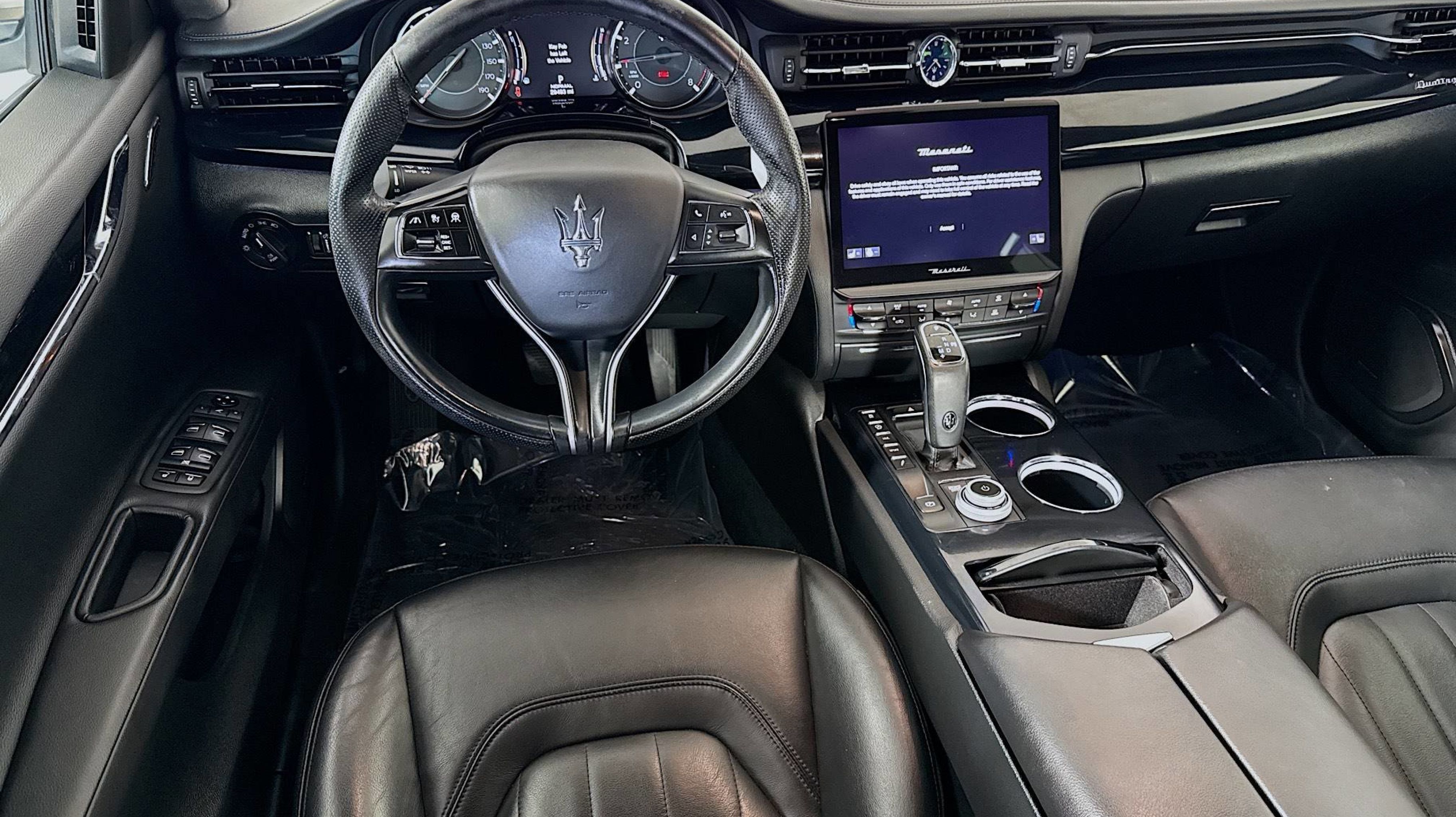 CARFAX One-Owner. 3.0L V6, 10 Speakers, 4-Wheel Disc Brakes, ABS brakes, Adaptive suspension, Air Conditioning, Alloy wheels, AM/FM radio: SiriusXM, Anti-whiplash front head restraints, Apple CarPlay/Android Auto, Auto High-beam Headlights, Auto tilt-away steering wheel, Auto-dimming door mirrors, Auto-dimming Rear-View mirror, Automatic temperature control, Brake assist, Bumpers: body-color, Delay-off headlights, Driver door bin, Driver vanity mirror, Dual front impact airbags, Dual front side impact airbags, Electronic Stability Control, Emergency communication system: Maserati Connect, Extended Leather Seat Upholstery, Exterior Parking Camera Rear, Four wheel independent suspension, Front anti-roll bar, Front Bucket Seats, Front Center Armrest, Front dual zone A/C, Front reading lights, Garage door transmitter, harman/kardon® Speakers, Heated door mirrors, Heated Front Bucket Seats, Heated front seats, Heated steering wheel, Illuminated entry, Knee airbag, Leather Shift Knob, Leather steering wheel, Low tire pressure warning, Memory seat, Navigation System, Occupant sensing airbag, Outside temperature display, Overhead airbag, Overhead console, Passenger door bin, Passenger vanity mirror, Power door mirrors, Power driver seat, Power moonroof, Power passenger seat, Power steering, Power windows, Radio data system, Radio: AM/FM w/Maserati Intelligent Assistant, Rain sensing wipers, Rear anti-roll bar, Rear fog lights, Rear reading lights, Rear seat center armrest, Rear Window Blind, Rear window defroster, Remote keyless entry, Security system, Speed control, Speed-sensing steering, Speed-Sensitive Wipers, Split folding rear seat, Sport steering wheel, Steering wheel memory, Steering wheel mounted audio controls, Tachometer, Telescoping steering wheel, Tilt steering wheel, Traction control, Trip computer, Turn signal indicator mirrors, Variably intermittent wipers, Voltmeter, Wheels: 19 Silver Poseidone, 3.0L V6.