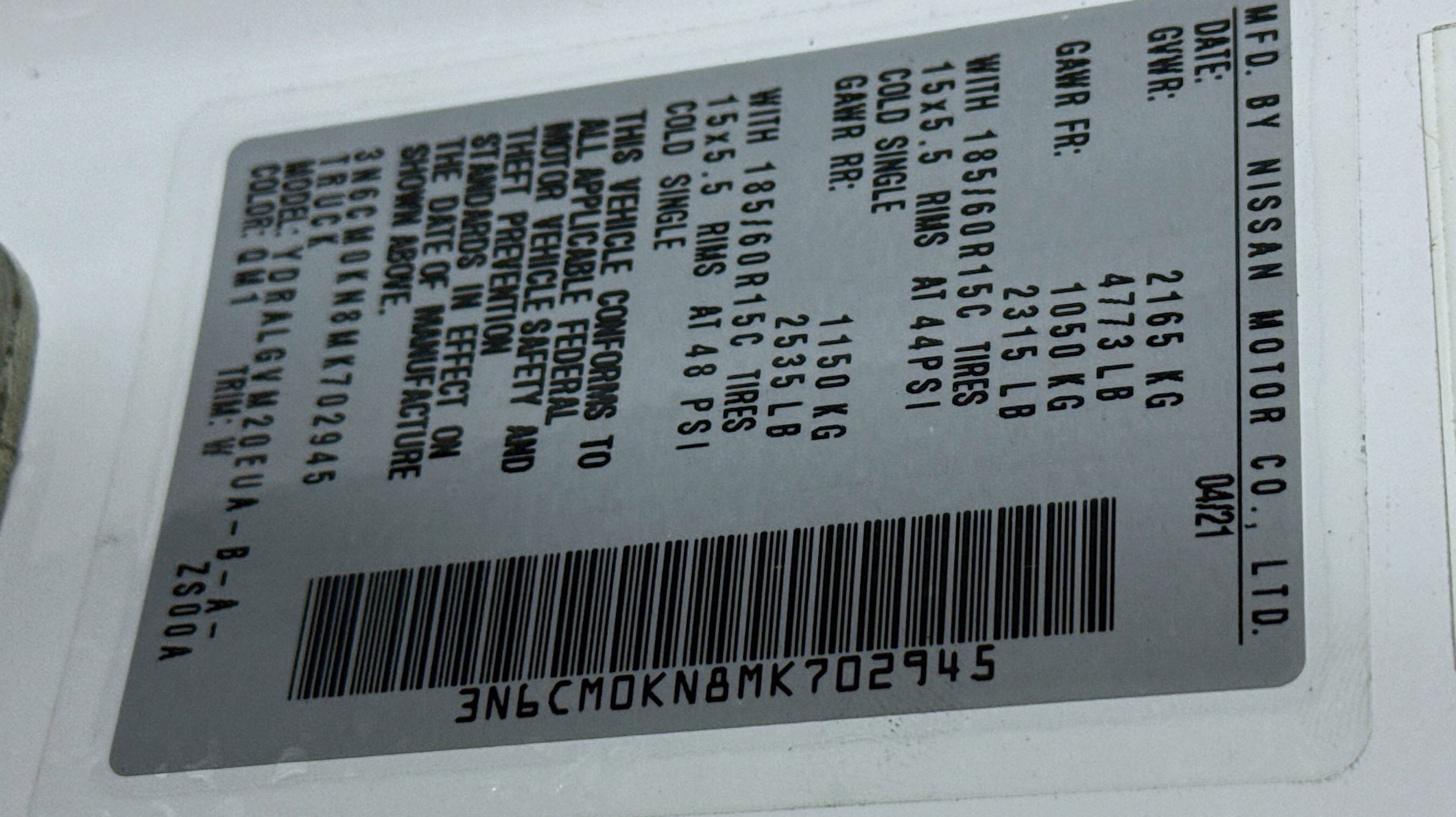 2 Speakers, 5.407 Axle Ratio, ABS brakes, Air Conditioning, AM/FM radio: SiriusXM, Anti-whiplash front head restraints, Brake assist, Bumpers: body-color, Cloth Seat Trim, Driver door bin, Driver's Seat Mounted Armrest, Dual front impact airbags, Dual front side impact airbags, Electronic Stability Control, Front anti-roll bar, Front Bucket Seats, Front reading lights, Front wheel independent suspension, Heated door mirrors, Low tire pressure warning, NissanConnect featuring Apple CarPlay and Android Auto, Occupant sensing airbag, Outside temperature display, Overhead airbag, Panic alarm, Passenger door bin, Power door mirrors, Power steering, Power windows, Radio data system, Radio: NissanConnect AM/FM Audio System, Rear Parking Sensors, Remote keyless entry, Speed control, Speed-sensing steering, Steering wheel mounted audio controls, Tachometer, Traction control, Trip computer, Variably intermittent wipers, Wheels: 15 x 5.5 JJ Steel w/Full Covers. Odometer is 47707 miles below market average!