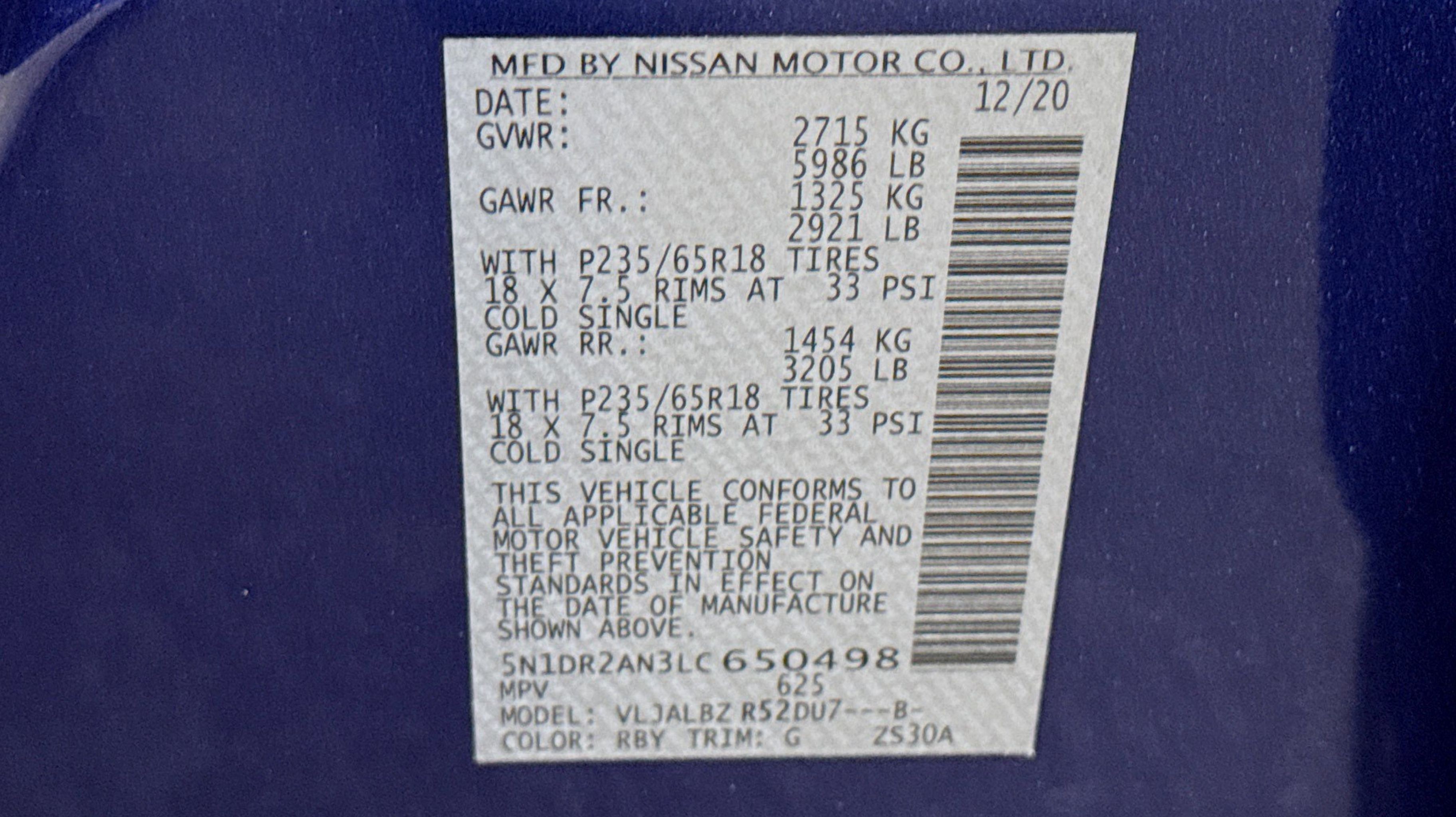 CARFAX One-Owner. 3rd row seats: bench, 4-Wheel Disc Brakes, 5.25 Axle Ratio, 6 Speakers, ABS brakes, Air Conditioning, Alloy wheels, AM/FM radio: SiriusXM, Automatic temperature control, Black Mold-in-Color Splash Guards, Brake assist, Bumpers: body-color, Carpeted Floor Mats (4-pc Set), CD player, Cloth Seating Surfaces, Delay-off headlights, Driver door bin, Driver vanity mirror, Dual front impact airbags, Dual front side impact airbags, Electronic Stability Control, Four wheel independent suspension, Front anti-roll bar, Front Bucket Seats, Front Center Armrest, Front dual zone A/C, Front reading lights, Illuminated entry, Low tire pressure warning, Occupant sensing airbag, Outside temperature display, Overhead airbag, Overhead console, Panic alarm, Passenger door bin, Passenger vanity mirror, Power door mirrors, Power steering, Power windows, Radio data system, Radio: AM/FM/CD Audio System w/NissanConnect, Rear air conditioning, Rear anti-roll bar, Rear Bumper Protector, Rear Parking Sensors, Rear reading lights, Rear seat center armrest, Rear window defroster, Rear window wiper, Reclining 3rd row seat, Remote keyless entry, Security system, Speed control, Speed-sensing steering, Split folding rear seat, Spoiler, Steering wheel mounted audio controls, Tachometer, Telescoping steering wheel, Tilt steering wheel, Traction control, Trip computer, Turn signal indicator mirrors, Variably intermittent wipers, Welcome Lighting, Wheels: 18 x 7.5 J Machined Aluminum-Alloy. Odometer is 13361 miles below market average!
