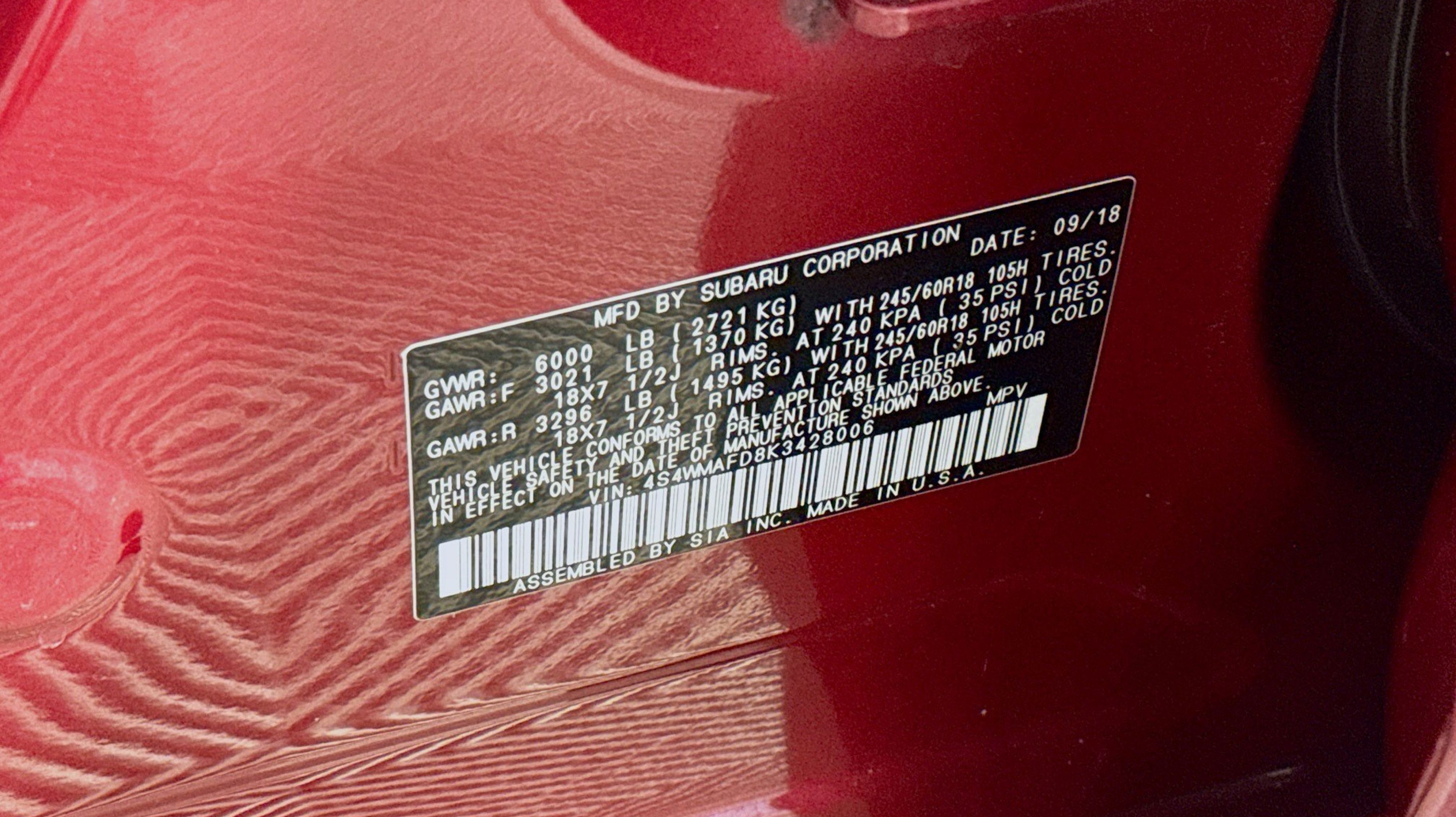 Crimson Red Pearl 2019 Subaru Ascent Premium AWD Lineartronic CVT 2.4L DOHC All-Weather Floor Liners, Auto-Dimming Exterior Mirror w/Approach Light, Auto-Dimming Rear View Compass Mirror w/HomeLink, Cargo Tray, Keyless Access w/Push-Button Start, Popular Package #2, Power Rear Gate w/Automatic Close & Height Memory, PRG & KAS & ADM & RAB, Rear Bumper Cover, Reverse Automatic Braking (RAB) System, Splash Guards, 3rd row seats: bench, 4-Wheel Disc Brakes, 6 Speakers, ABS brakes, Air Conditioning, Alloy wheels, AM/FM radio: SiriusXM, Automatic temperature control, Axle Ratio: 4.44, Brake assist, Bumpers: body-color, CD player, Delay-off headlights, Driver door bin, Driver vanity mirror, Dual front impact airbags, Dual front side impact airbags, Electronic Stability Control, Emergency communication system: STARLINK Safety and Security, Exterior Parking Camera Rear, Four wheel independent suspension, Front anti-roll bar, Front Bucket Seats, Front Center Armrest, Front dual zone A/C, Front reading lights, Fully automatic headlights, Heated door mirrors, Heated Front Bucket Seats, Heated front seats, Illuminated entry, Knee airbag, Low tire pressure warning, Occupant sensing airbag, Outside temperature display, Overhead airbag, Overhead console, Panic alarm, Passenger door bin, Passenger vanity mirror, Power door mirrors, Power driver seat, Power steering, Power windows, Radio data system, Radio: Subaru STARLINK 8.0 Multimedia Plus System, Rear air conditioning, Rear anti-roll bar, Rear reading lights, Rear window defroster, Rear window wiper, Remote keyless entry, Roof rack: rails only, Security system, Speed control, Spill Resistant Cloth Upholstery, Split folding rear seat, Spoiler, STARLINK/Apple CarPlay/Android Auto, Steering wheel mounted audio controls, Tachometer, Telescoping steering wheel, Tilt steering wheel, Traction control, Trip computer, Variably intermittent wipers, Wheels: 18 Gray Aluminum Alloy w/Machine Finish, All-Weather Floor Liners, Auto-Dimming Exterior Mirror w/Approach Light, Auto-Dimming Rear View Compass Mirror w/HomeLink, Cargo Tray, Keyless Access w/Push-Button Start, Popular Package #2, Power Rear Gate w/Automatic Close & Height Memory, PRG & KAS & ADM & RAB, Rear Bumper Cover, Reverse Automatic Braking (RAB) System, Splash Guards.