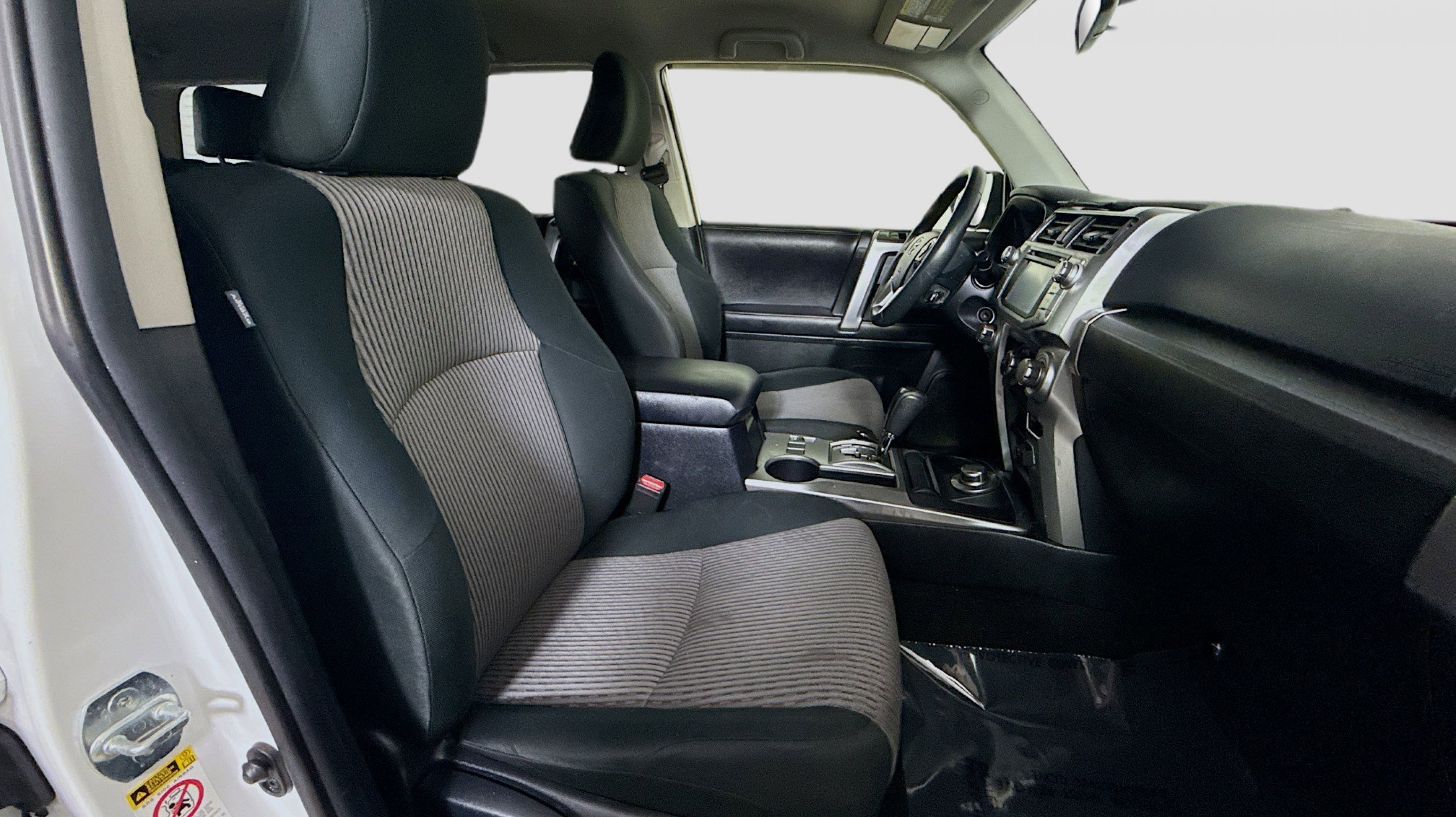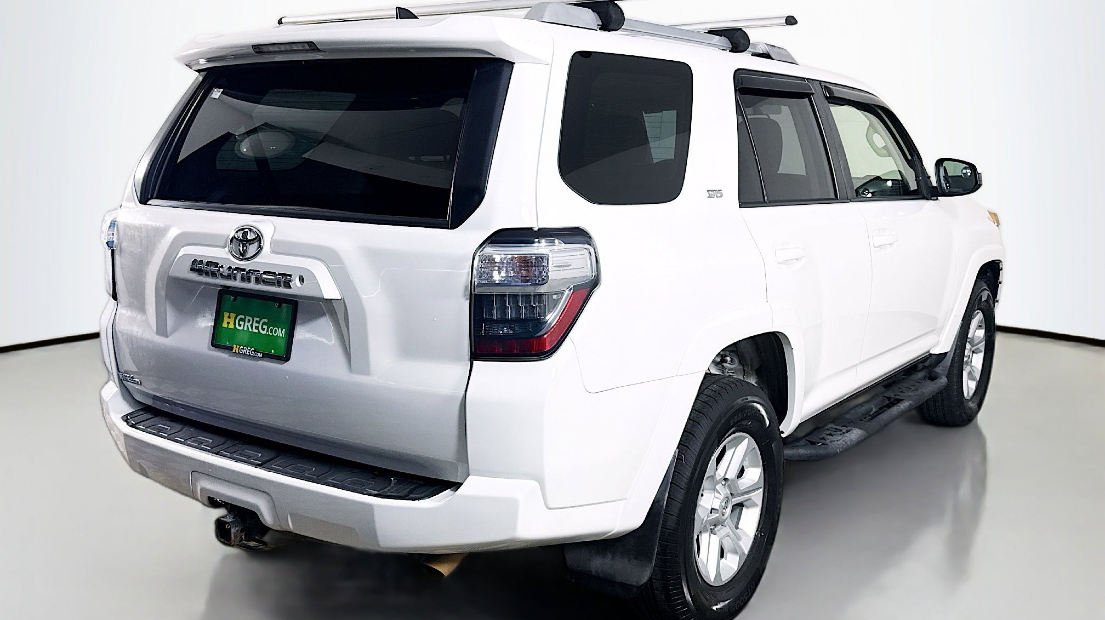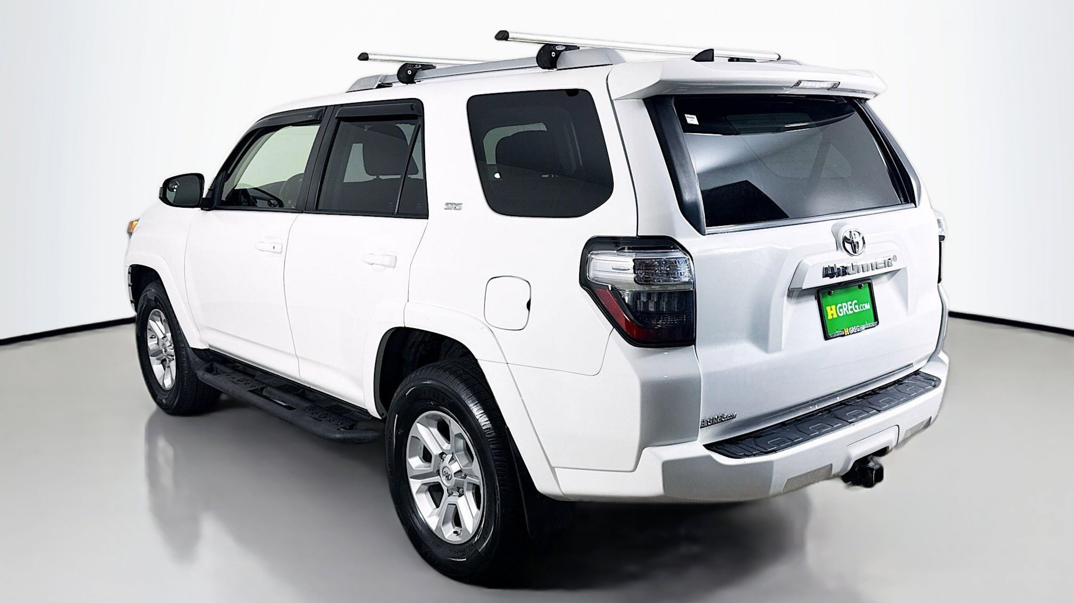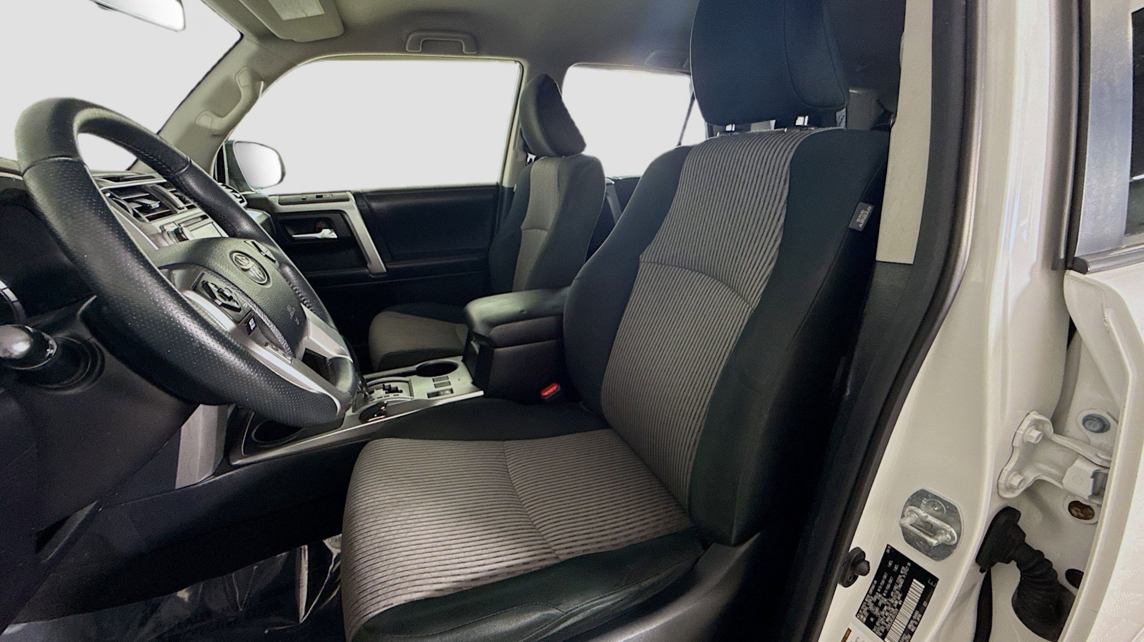 White 2018 Toyota 4Runner SR5 4WD 5-Speed Automatic with Overdrive 4.0L V6 SMPI DOHC 4WD, Black Graphite w/Fabric Seat Trim, 17 x 7.0 6-Spoke Alloy Wheels, 3.727 Axle Ratio, 4-Wheel Disc Brakes, 8 Speakers, ABS brakes, Air Conditioning, Alloy wheels, AM/FM radio: SiriusXM, Anti-whiplash front head restraints, Brake assist, Bumpers: body-color, CD player, Driver door bin, Driver vanity mirror, Dual front impact airbags, Dual front side impact airbags, Electronic Stability Control, Emergency communication system: Safety Connect, Exterior Parking Camera Rear, Front anti-roll bar, Front Bucket Seats, Front Center Armrest, Front fog lights, Front reading lights, Front wheel independent suspension, Heated door mirrors, Illuminated entry, Knee airbag, Leather Shift Knob, Leather steering wheel, Low Fabric Seat Trim, Low tire pressure warning, Occupant sensing airbag, Outside temperature display, Overhead airbag, Overhead console, Panic alarm, Passenger door bin, Passenger vanity mirror, Power door mirrors, Power driver seat, Power steering, Power windows, Radio: Entune Audio Plus, Rear anti-roll bar, Rear seat center armrest, Rear window defroster, Rear window wiper, Remote keyless entry, Roof rack: rails only, Security system, Speed control, Speed-sensing steering, Split folding rear seat, Spoiler, Steering wheel mounted audio controls, Tachometer, Telescoping steering wheel, Tilt steering wheel, Traction control, Trip computer, Variably intermittent wipers, 4WD, Black Graphite w/Fabric Seat Trim.