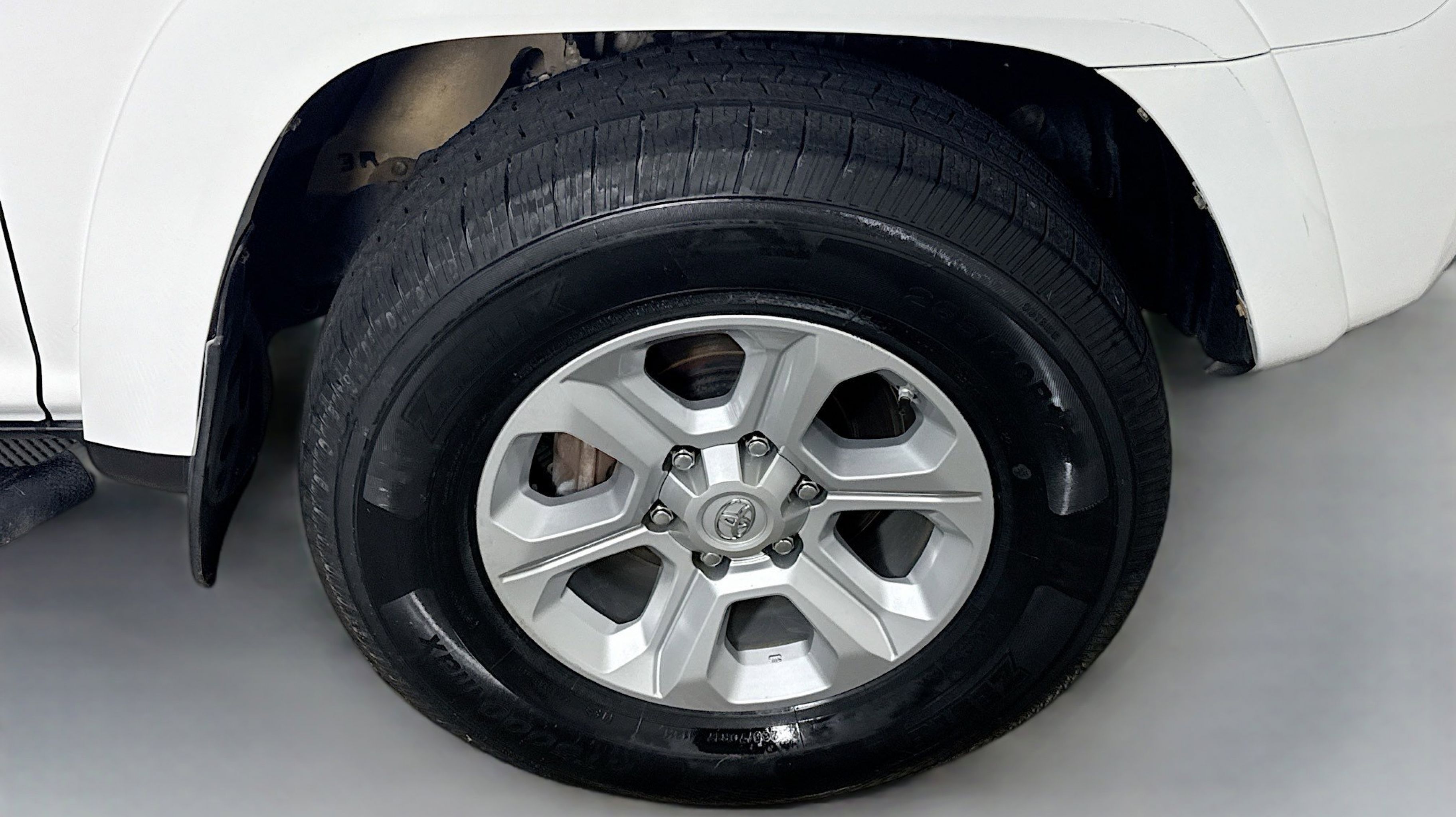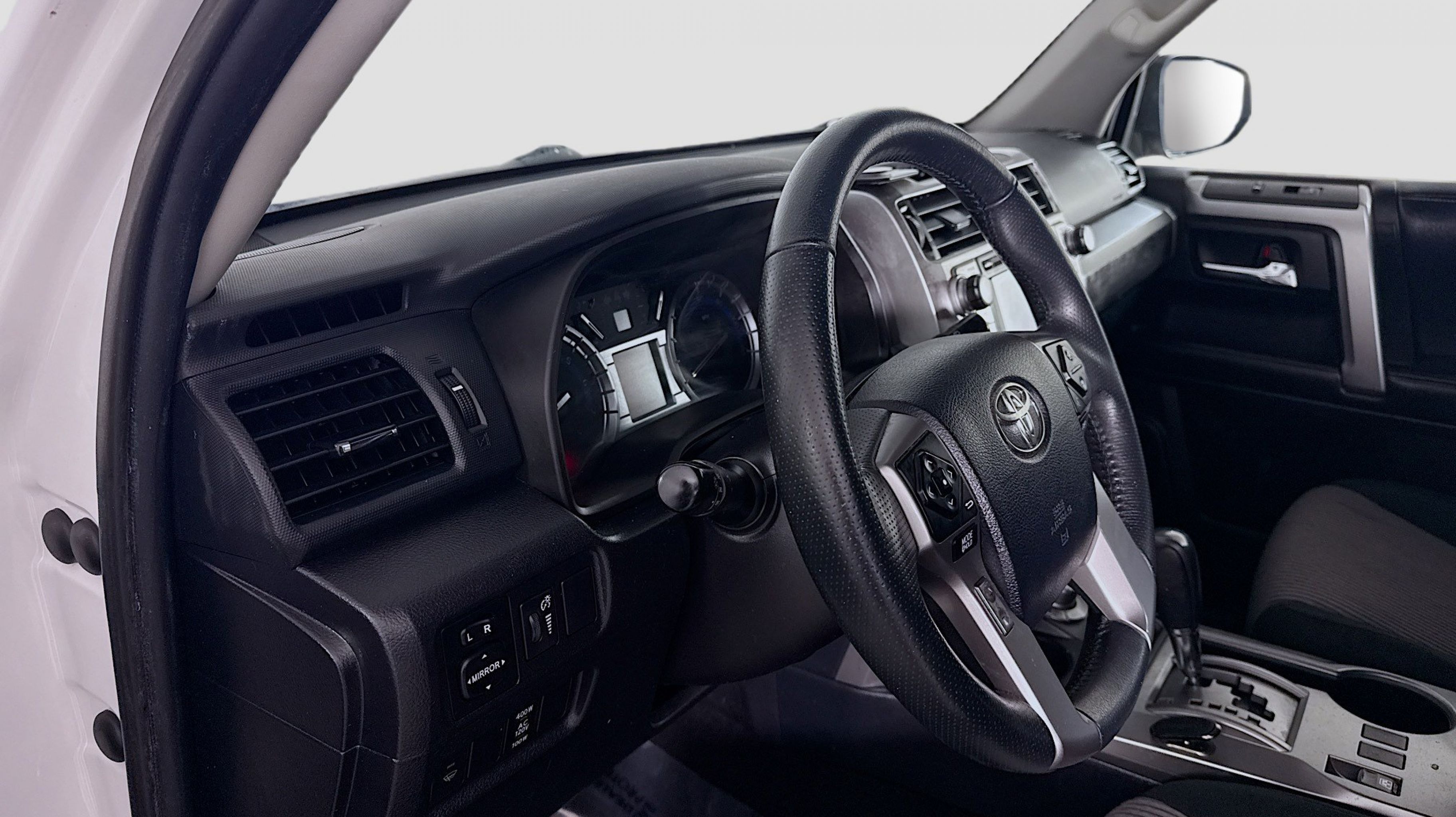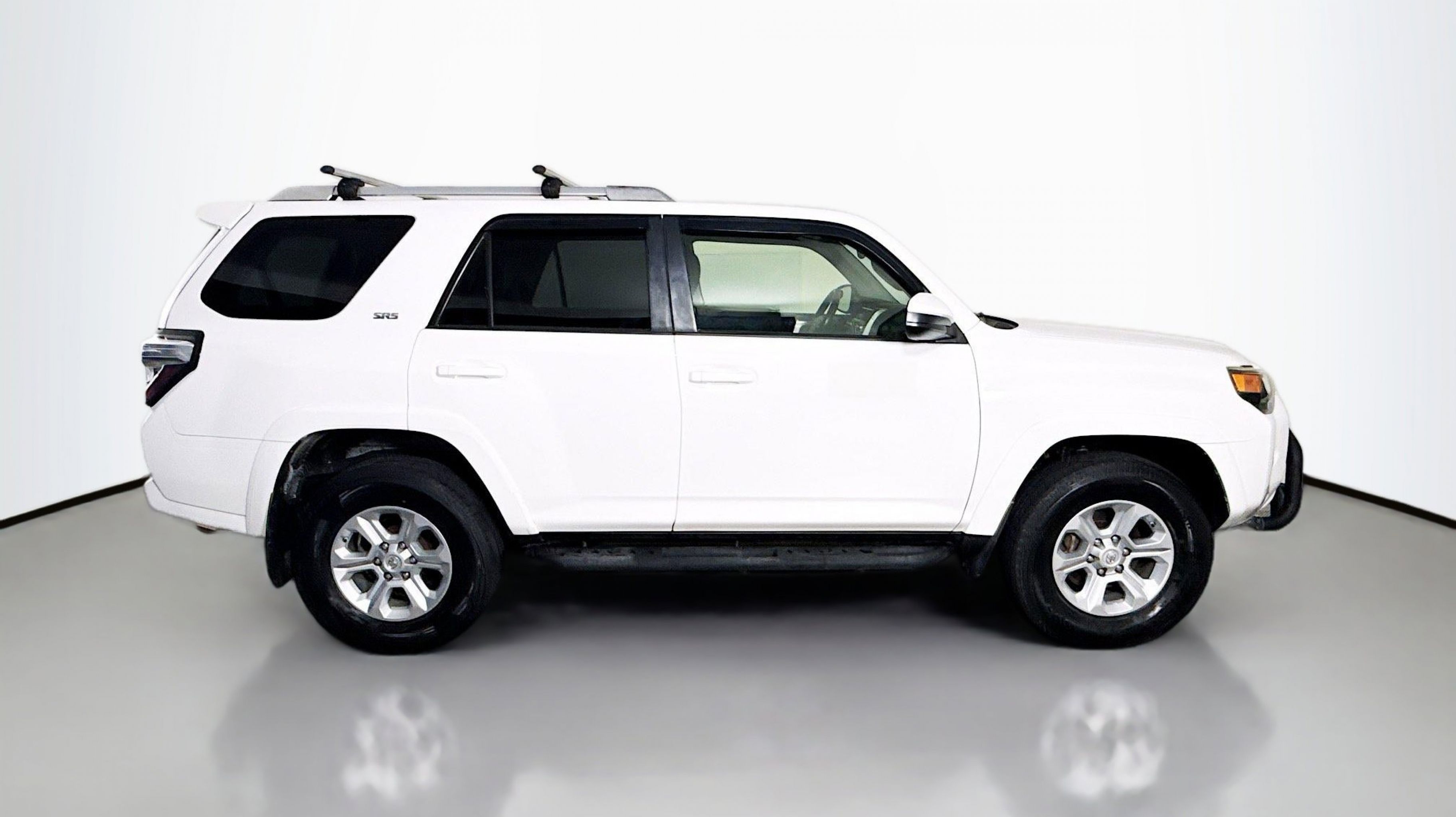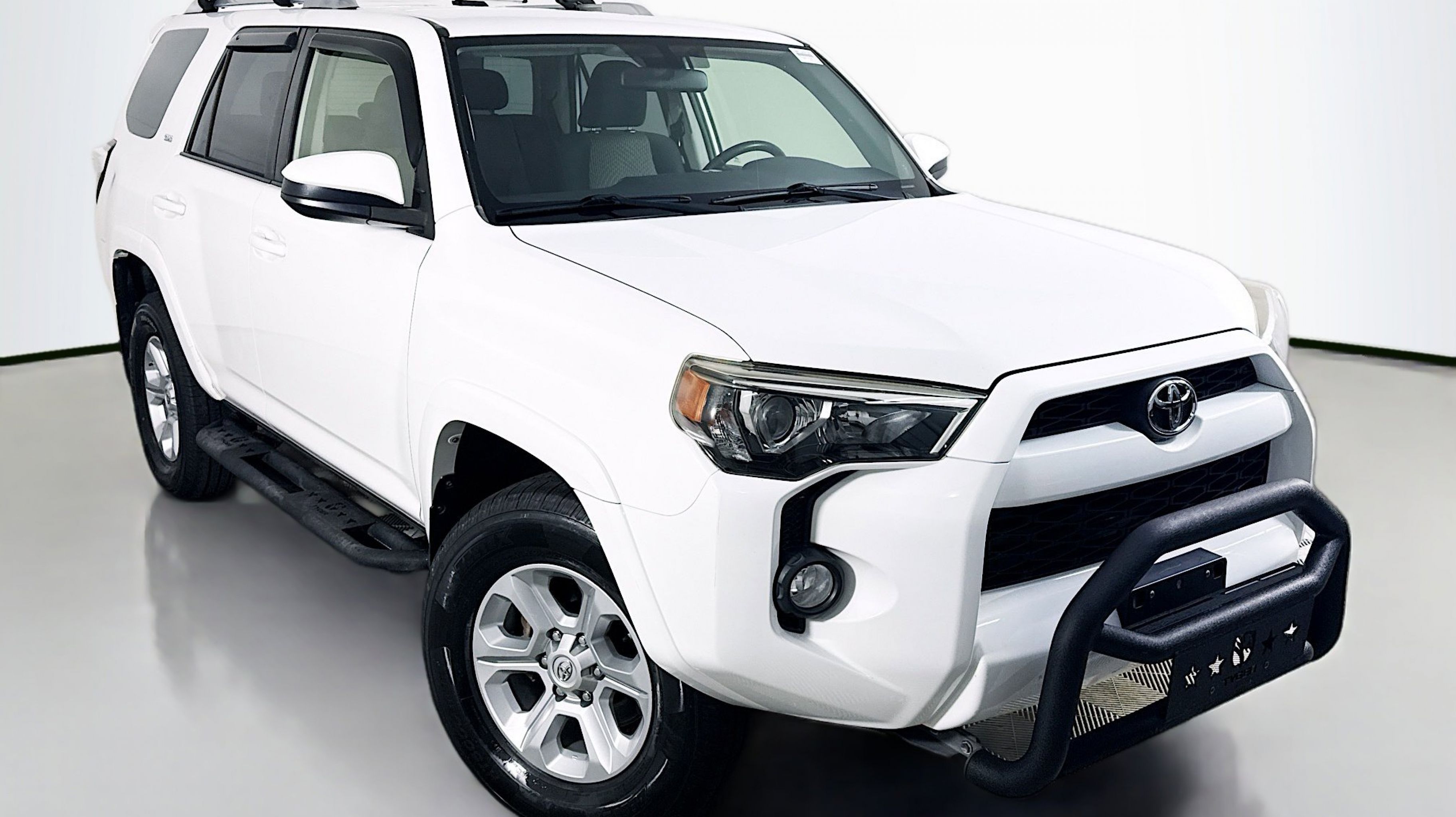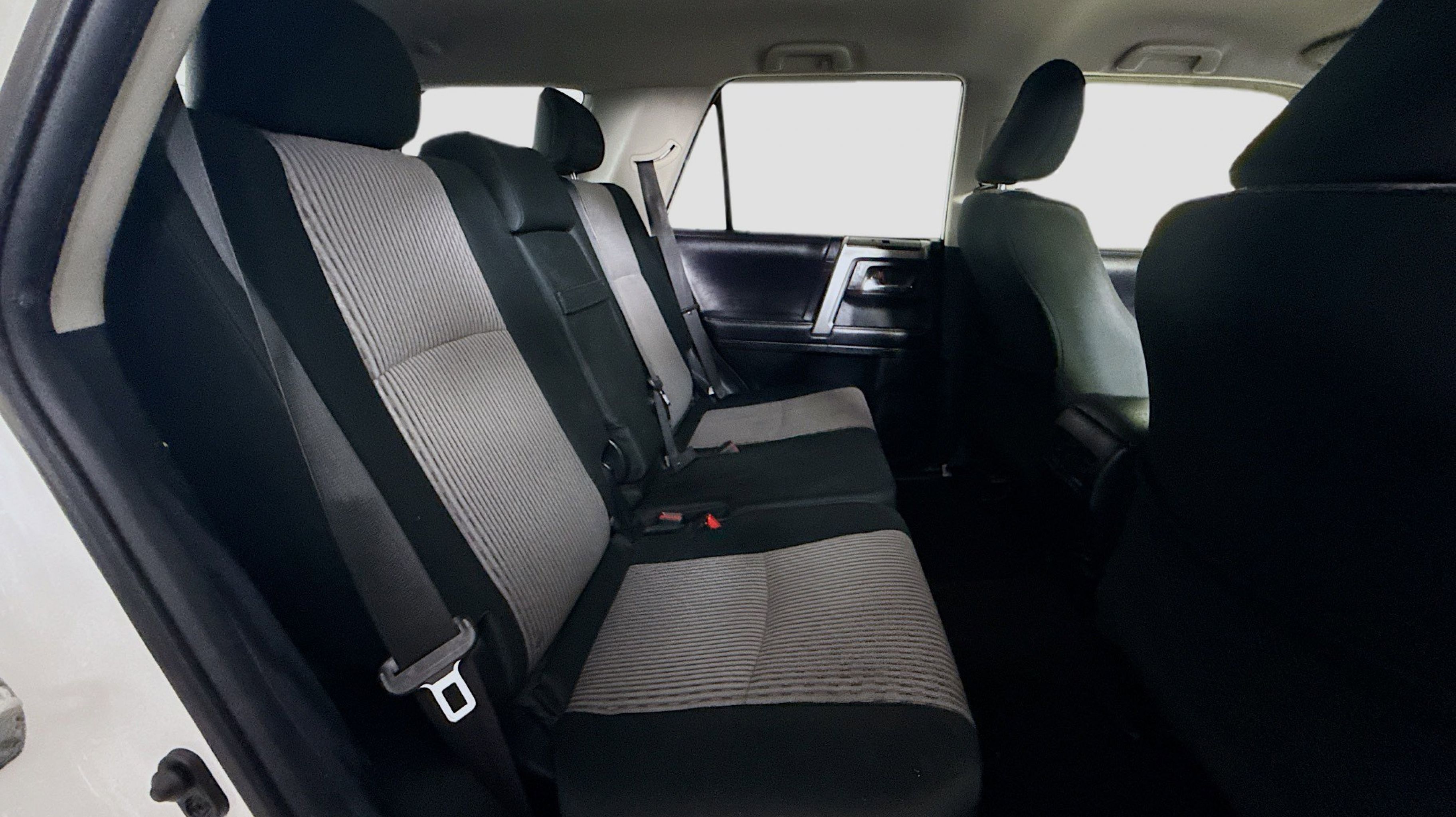 White 2018 Toyota 4Runner SR5 4WD 5-Speed Automatic with Overdrive 4.0L V6 SMPI DOHC 4WD, Black Graphite w/Fabric Seat Trim, 17 x 7.0 6-Spoke Alloy Wheels, 3.727 Axle Ratio, 4-Wheel Disc Brakes, 8 Speakers, ABS brakes, Air Conditioning, Alloy wheels, AM/FM radio: SiriusXM, Anti-whiplash front head restraints, Brake assist, Bumpers: body-color, CD player, Driver door bin, Driver vanity mirror, Dual front impact airbags, Dual front side impact airbags, Electronic Stability Control, Emergency communication system: Safety Connect, Exterior Parking Camera Rear, Front anti-roll bar, Front Bucket Seats, Front Center Armrest, Front fog lights, Front reading lights, Front wheel independent suspension, Heated door mirrors, Illuminated entry, Knee airbag, Leather Shift Knob, Leather steering wheel, Low Fabric Seat Trim, Low tire pressure warning, Occupant sensing airbag, Outside temperature display, Overhead airbag, Overhead console, Panic alarm, Passenger door bin, Passenger vanity mirror, Power door mirrors, Power driver seat, Power steering, Power windows, Radio: Entune Audio Plus, Rear anti-roll bar, Rear seat center armrest, Rear window defroster, Rear window wiper, Remote keyless entry, Roof rack: rails only, Security system, Speed control, Speed-sensing steering, Split folding rear seat, Spoiler, Steering wheel mounted audio controls, Tachometer, Telescoping steering wheel, Tilt steering wheel, Traction control, Trip computer, Variably intermittent wipers, 4WD, Black Graphite w/Fabric Seat Trim.