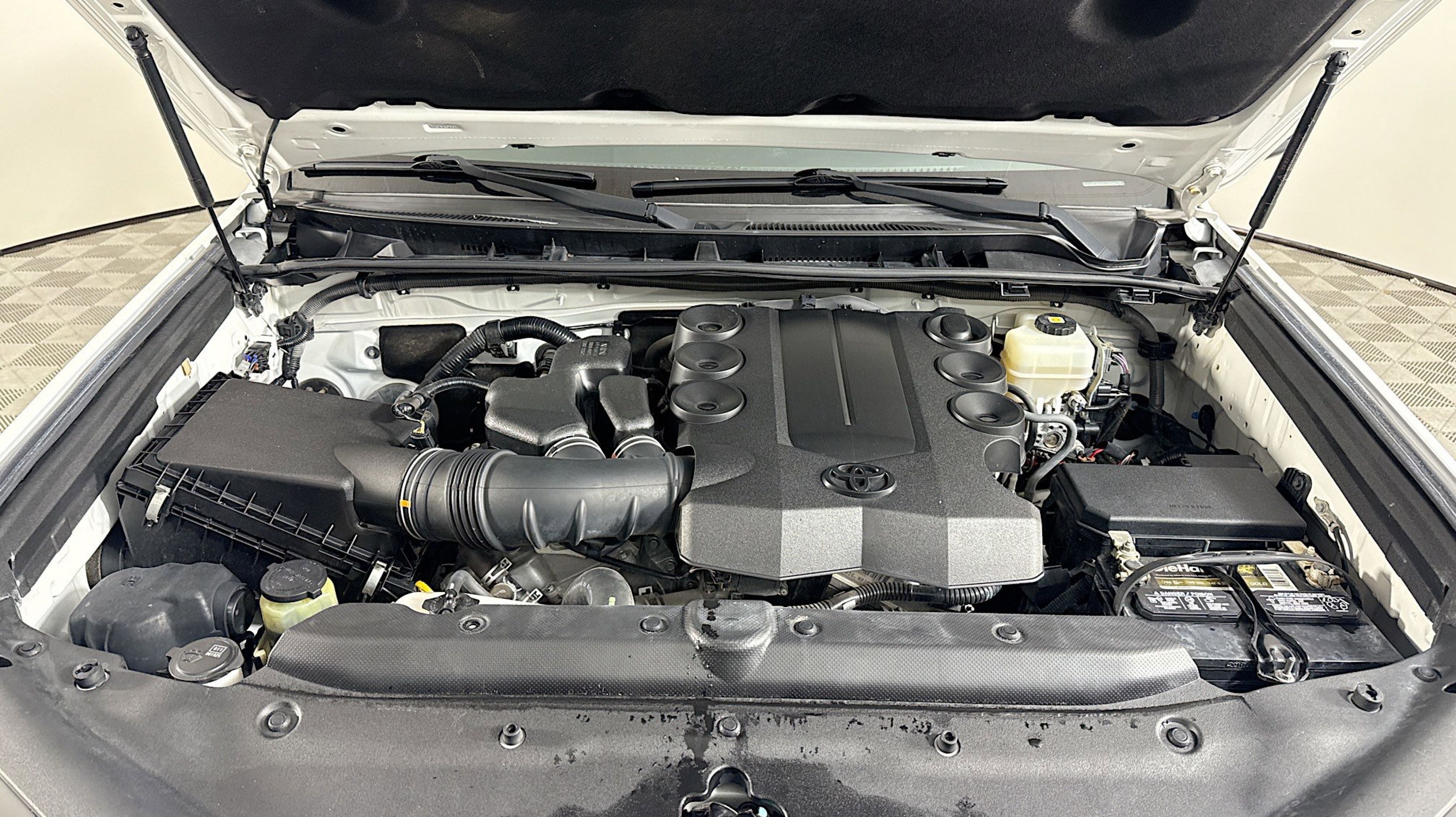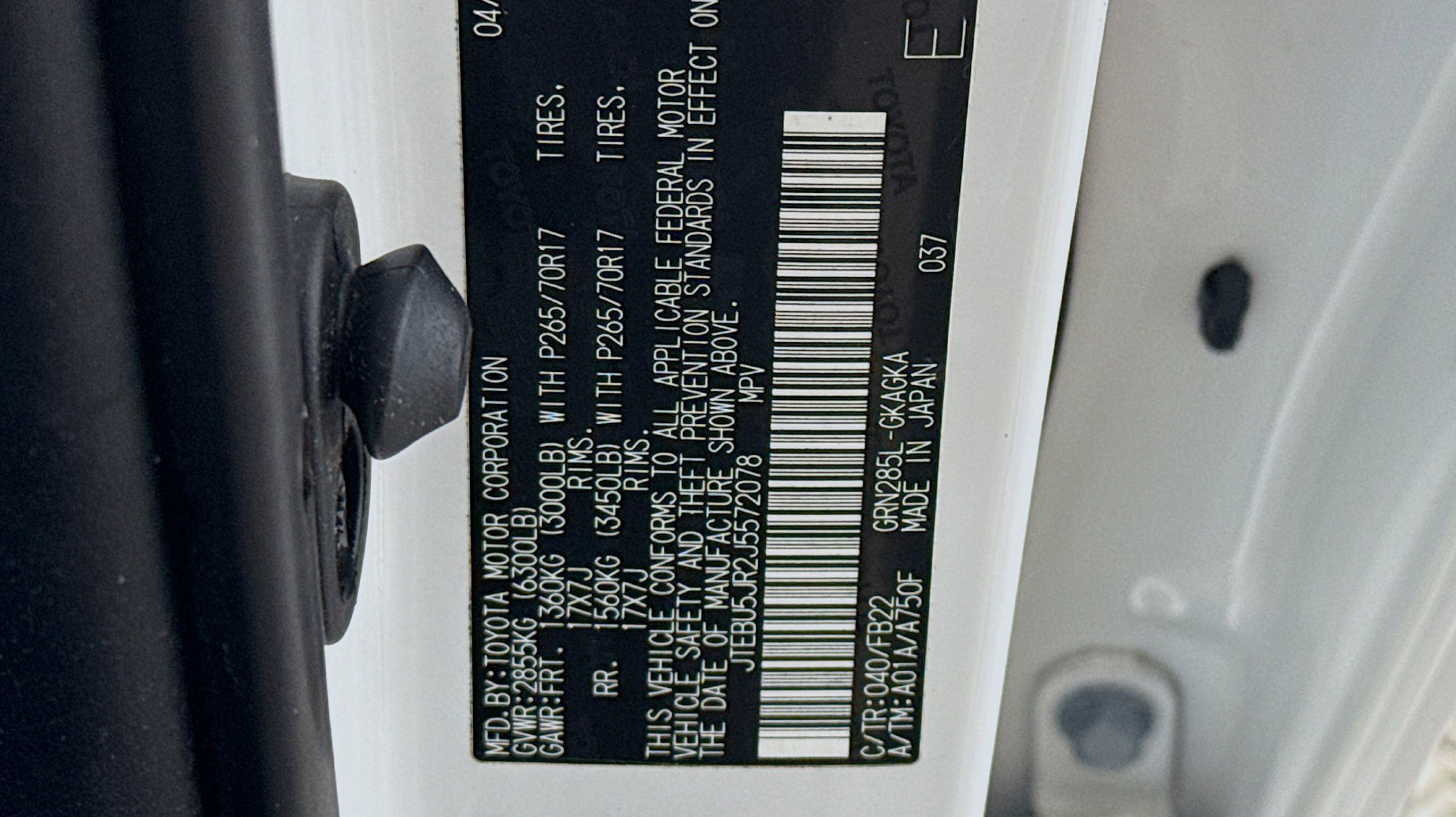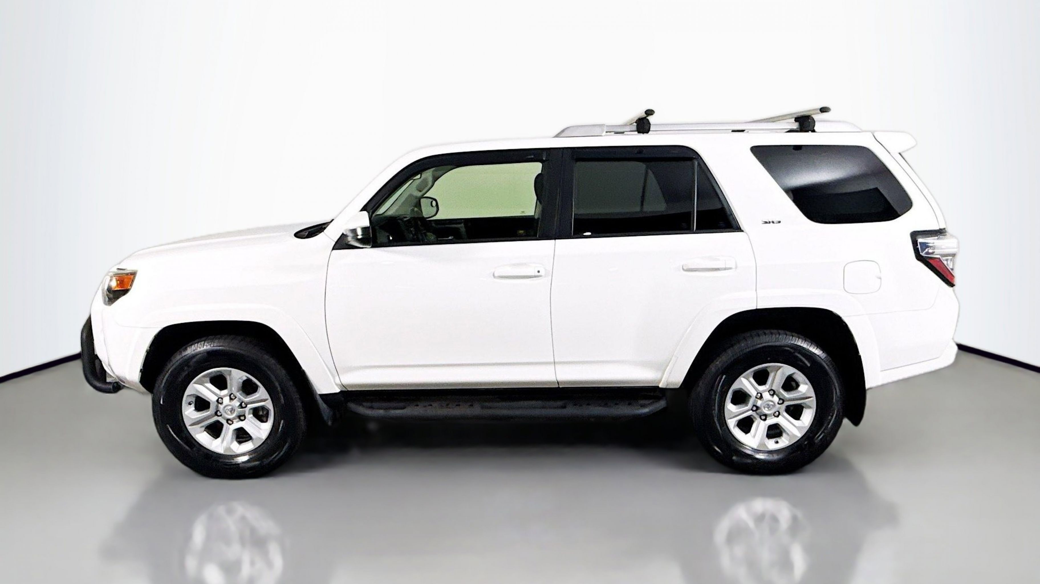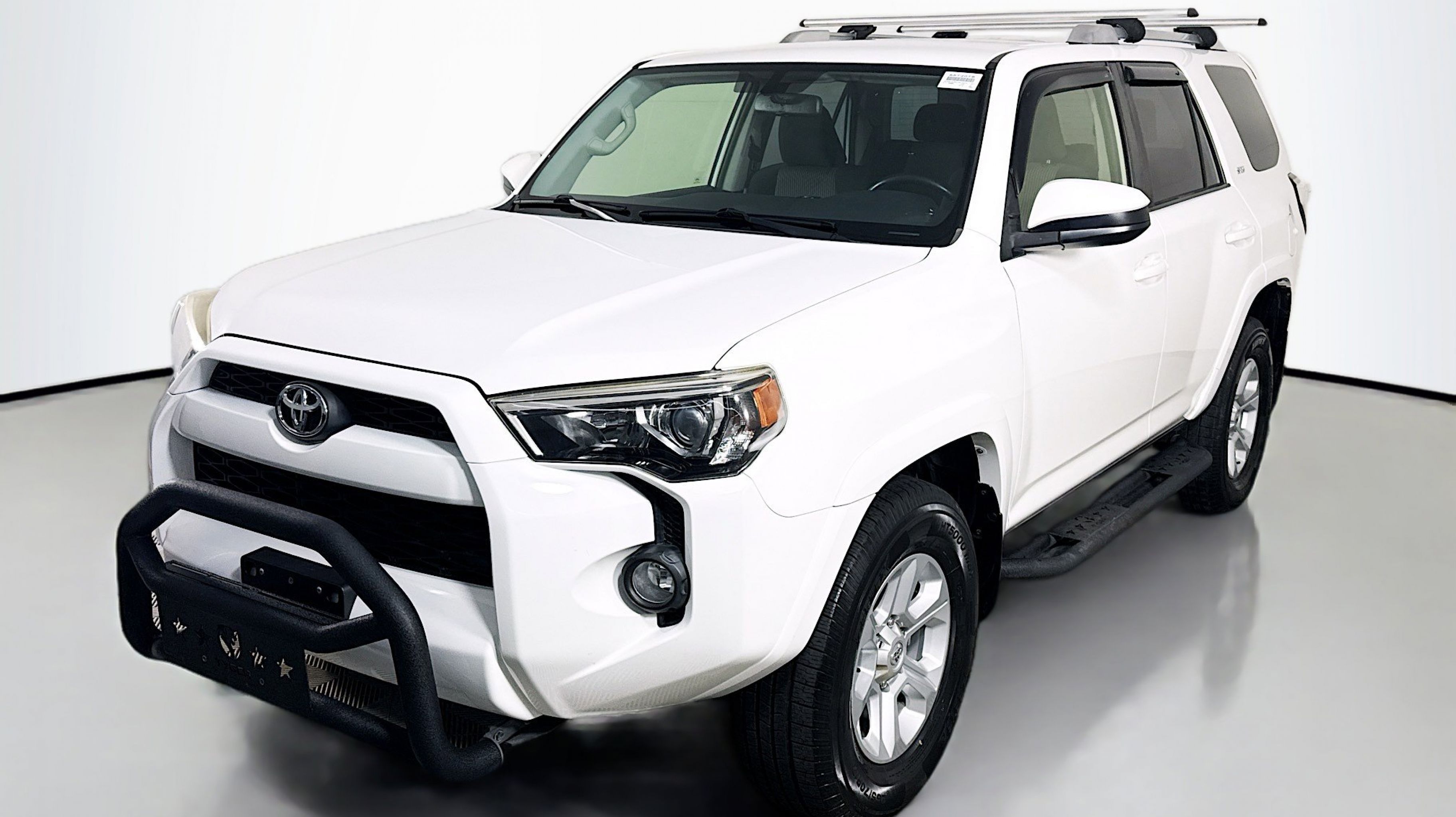 White 2018 Toyota 4Runner SR5 4WD 5-Speed Automatic with Overdrive 4.0L V6 SMPI DOHC 4WD, Black Graphite w/Fabric Seat Trim, 17 x 7.0 6-Spoke Alloy Wheels, 3.727 Axle Ratio, 4-Wheel Disc Brakes, 8 Speakers, ABS brakes, Air Conditioning, Alloy wheels, AM/FM radio: SiriusXM, Anti-whiplash front head restraints, Brake assist, Bumpers: body-color, CD player, Driver door bin, Driver vanity mirror, Dual front impact airbags, Dual front side impact airbags, Electronic Stability Control, Emergency communication system: Safety Connect, Exterior Parking Camera Rear, Front anti-roll bar, Front Bucket Seats, Front Center Armrest, Front fog lights, Front reading lights, Front wheel independent suspension, Heated door mirrors, Illuminated entry, Knee airbag, Leather Shift Knob, Leather steering wheel, Low Fabric Seat Trim, Low tire pressure warning, Occupant sensing airbag, Outside temperature display, Overhead airbag, Overhead console, Panic alarm, Passenger door bin, Passenger vanity mirror, Power door mirrors, Power driver seat, Power steering, Power windows, Radio: Entune Audio Plus, Rear anti-roll bar, Rear seat center armrest, Rear window defroster, Rear window wiper, Remote keyless entry, Roof rack: rails only, Security system, Speed control, Speed-sensing steering, Split folding rear seat, Spoiler, Steering wheel mounted audio controls, Tachometer, Telescoping steering wheel, Tilt steering wheel, Traction control, Trip computer, Variably intermittent wipers, 4WD, Black Graphite w/Fabric Seat Trim.