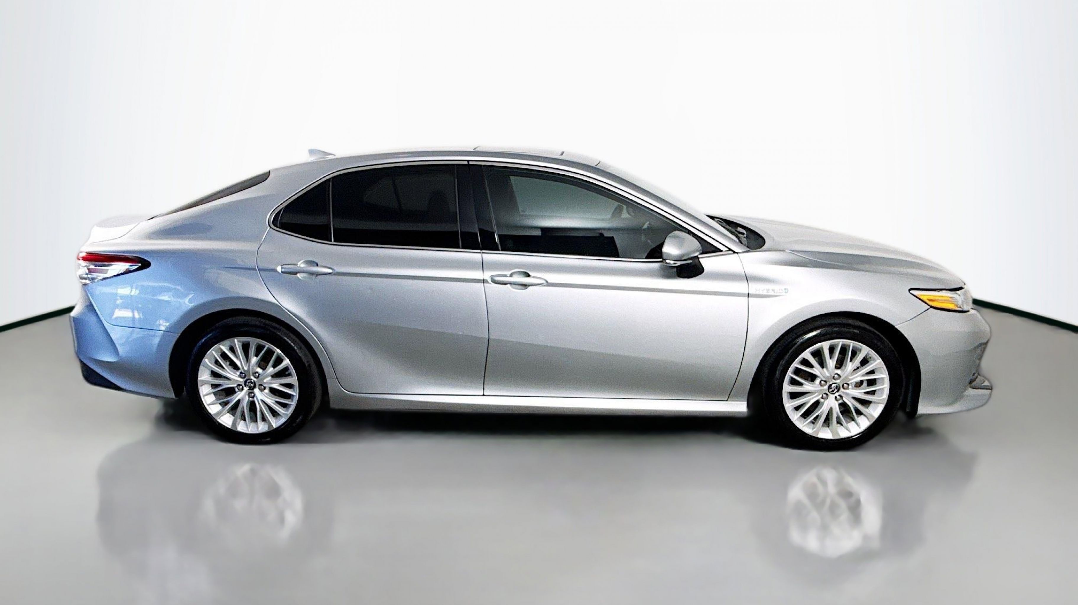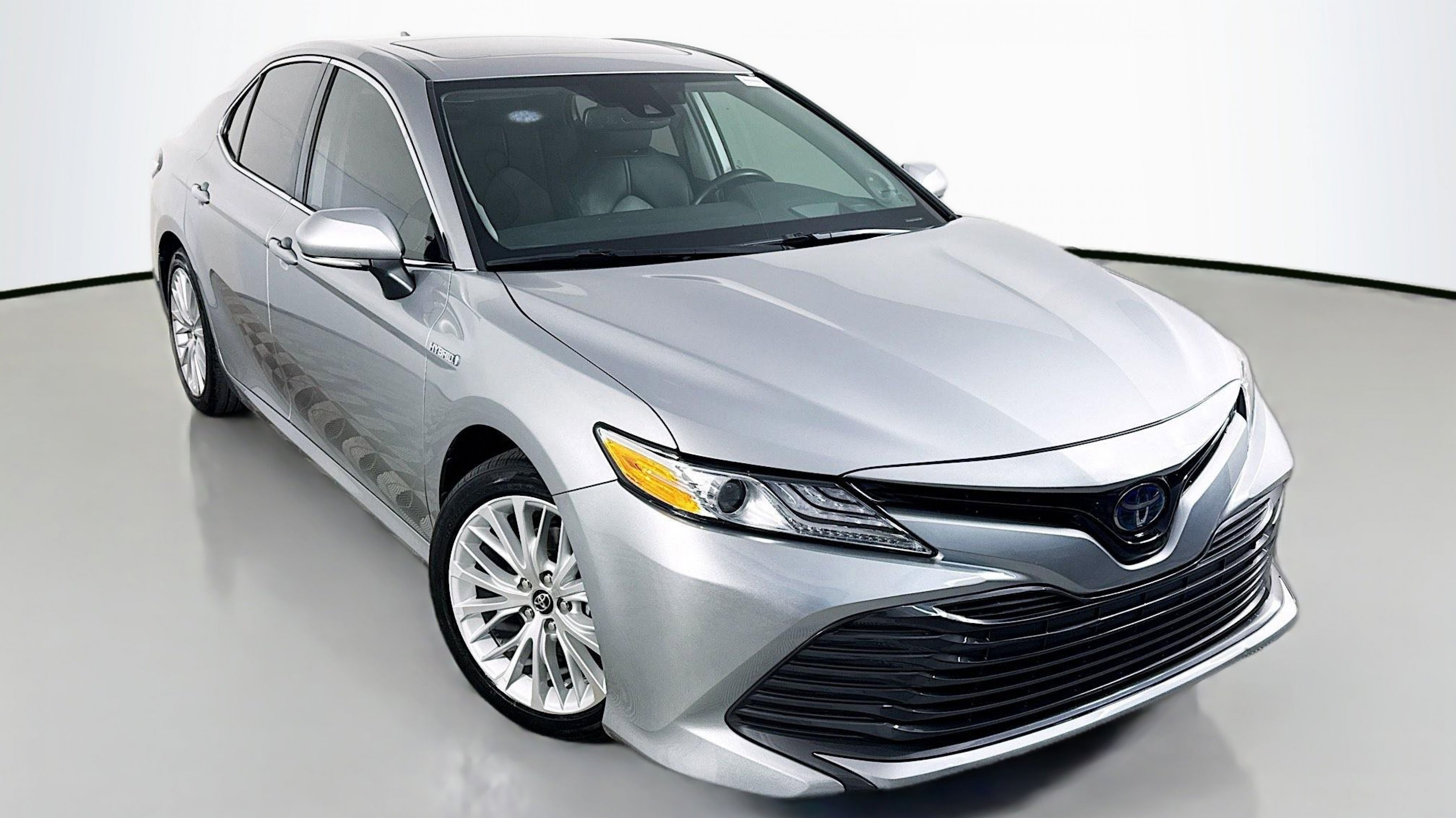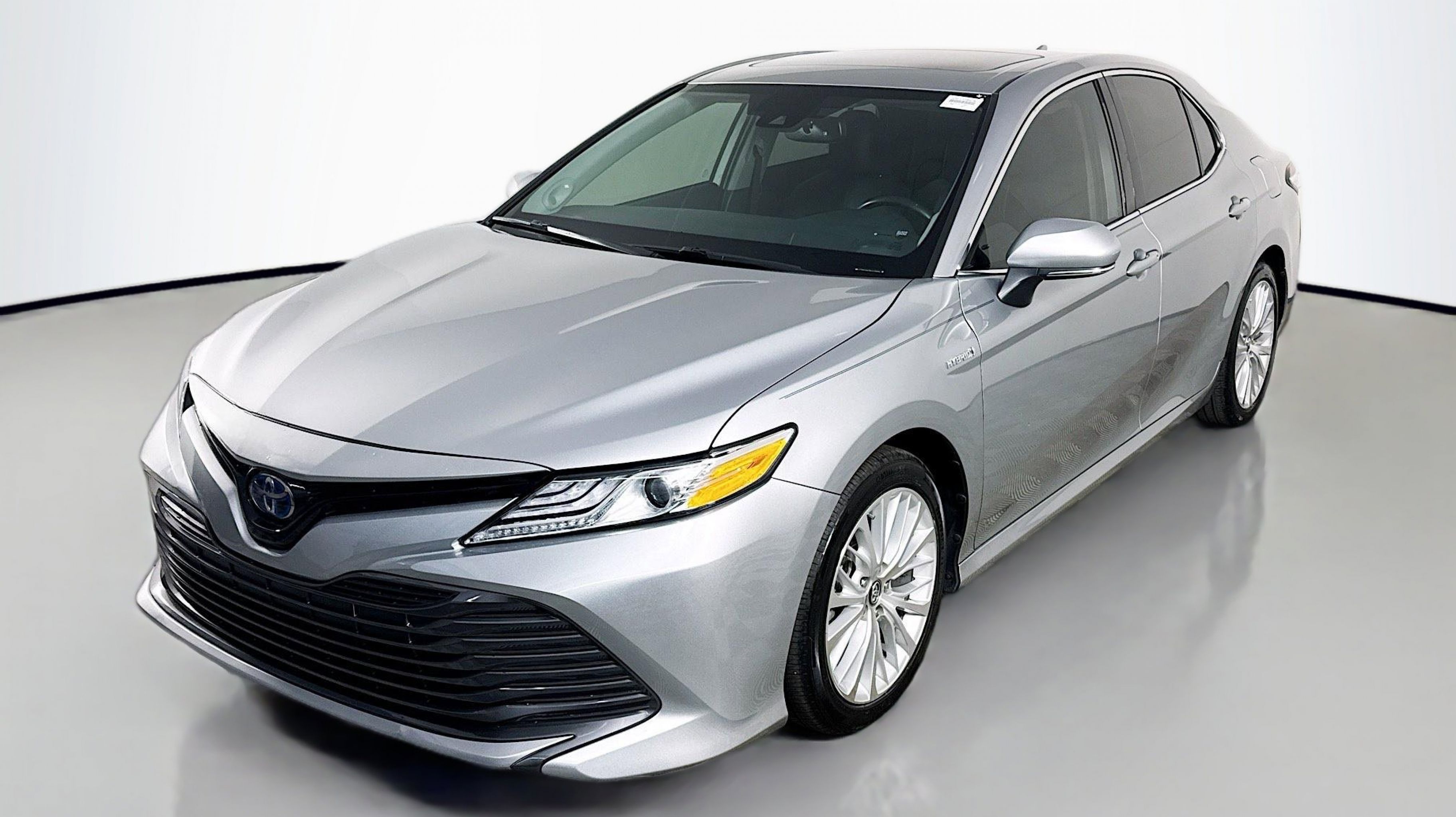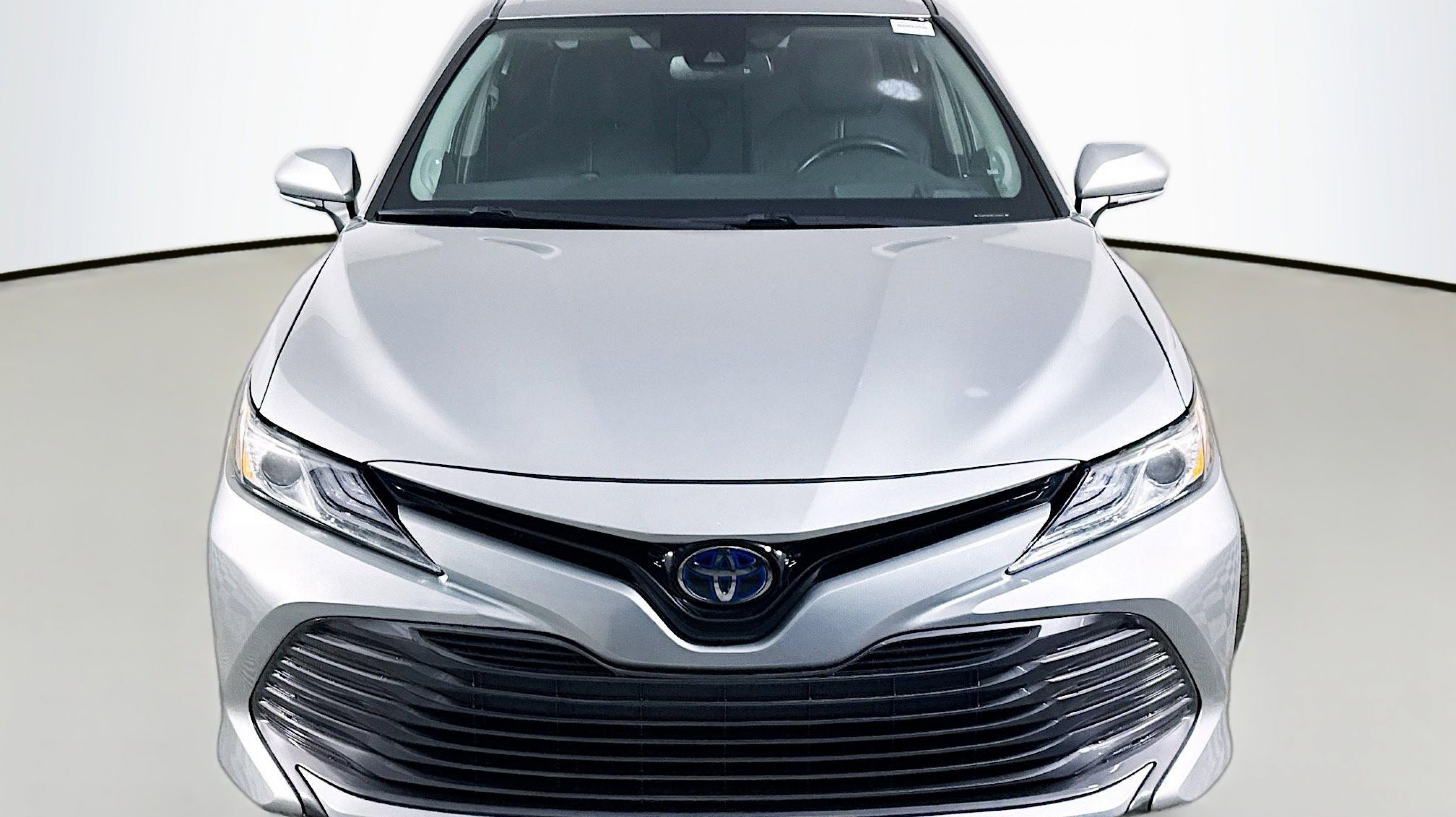 Celestial Silver Metallic 2019 Toyota Camry Hybrid LE FWD eCVT 2.5L I4 Hybrid DOHC 2.5L I4 Hybrid DOHC, Sunroof Package, 4-Wheel Disc Brakes, 6 Speakers, 6.5J x 16 Steel Wheels, ABS brakes, Air Conditioning, AM/FM radio, Auto High-beam Headlights, Automatic temperature control, Brake assist, Bumpers: body-color, Delay-off headlights, Driver door bin, Driver vanity mirror, Dual front impact airbags, Dual front side impact airbags, Electronic Stability Control, Emergency communication system: Safety Connect, Exterior Parking Camera Rear, Fabric Seat Trim, Four wheel independent suspension, Front anti-roll bar, Front Bucket Seats, Front Center Armrest, Front dual zone A/C, Front reading lights, Fully automatic headlights, Heated front seats, Illuminated entry, Knee airbag, Low tire pressure warning, Occupant sensing airbag, Outside temperature display, Overhead airbag, Overhead console, Panic alarm, Passenger door bin, Passenger vanity mirror, Power door mirrors, Power driver seat, Power steering, Power windows, Radio data system, Radio: Entune 3.0 Audio, Radio: Entune 3.0 Audio Plus, Rear anti-roll bar, Rear reading lights, Rear seat center armrest, Rear side impact airbag, Rear window defroster, Remote keyless entry, Security system, Speed control, Speed-sensing steering, Split folding rear seat, Steering wheel mounted audio controls, Telescoping steering wheel, Tilt steering wheel, Traction control, Trip computer, Variably intermittent wipers, 2.5L I4 Hybrid DOHC, Sunroof Package.