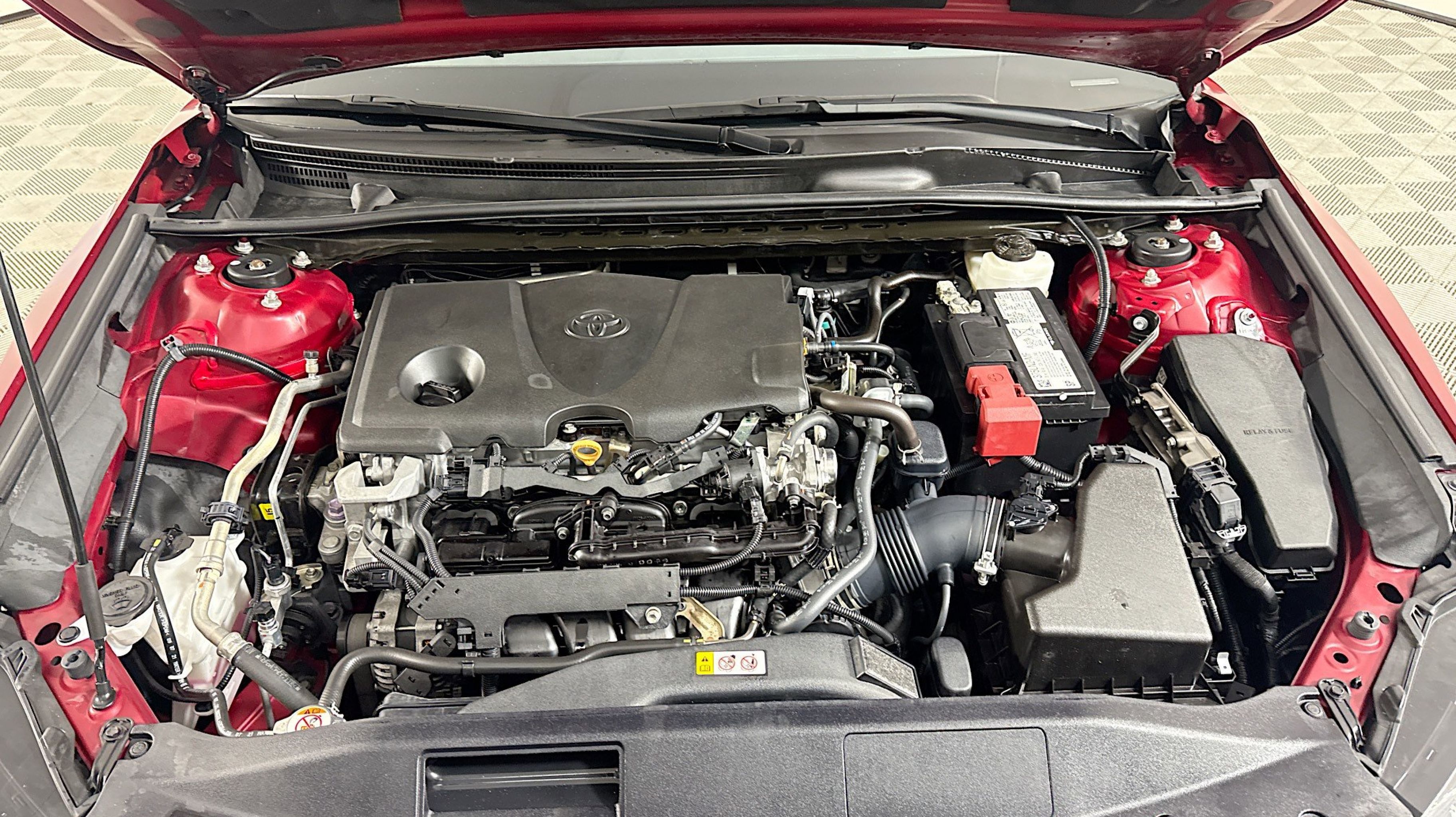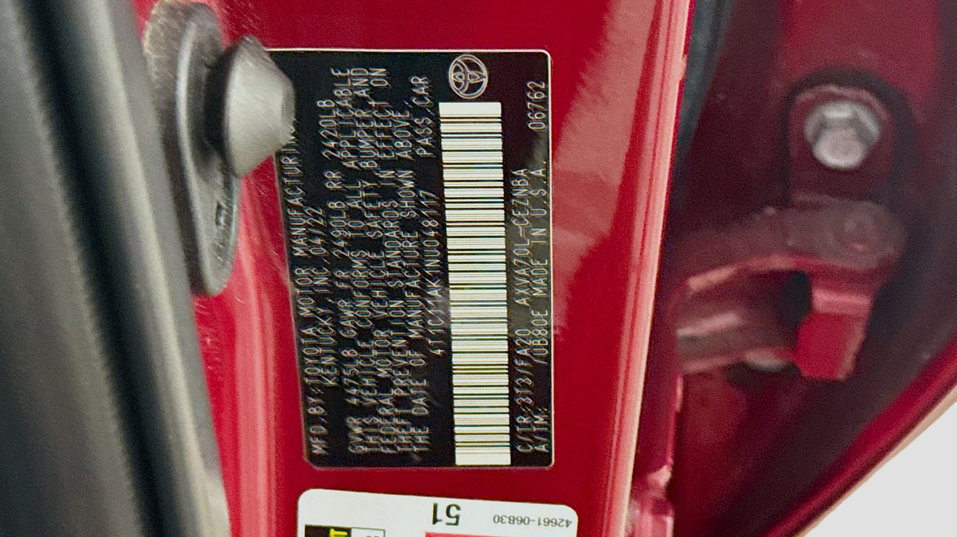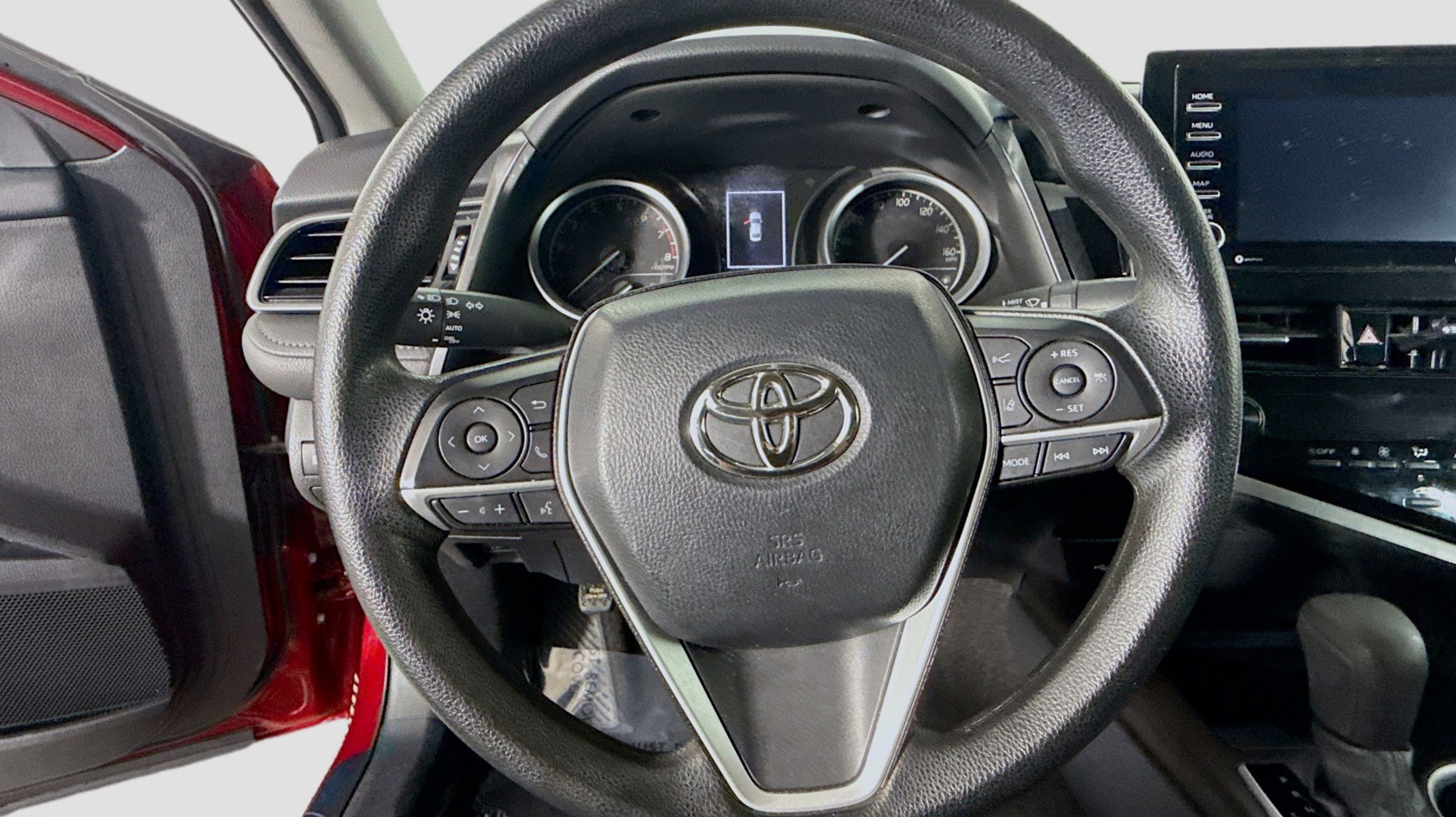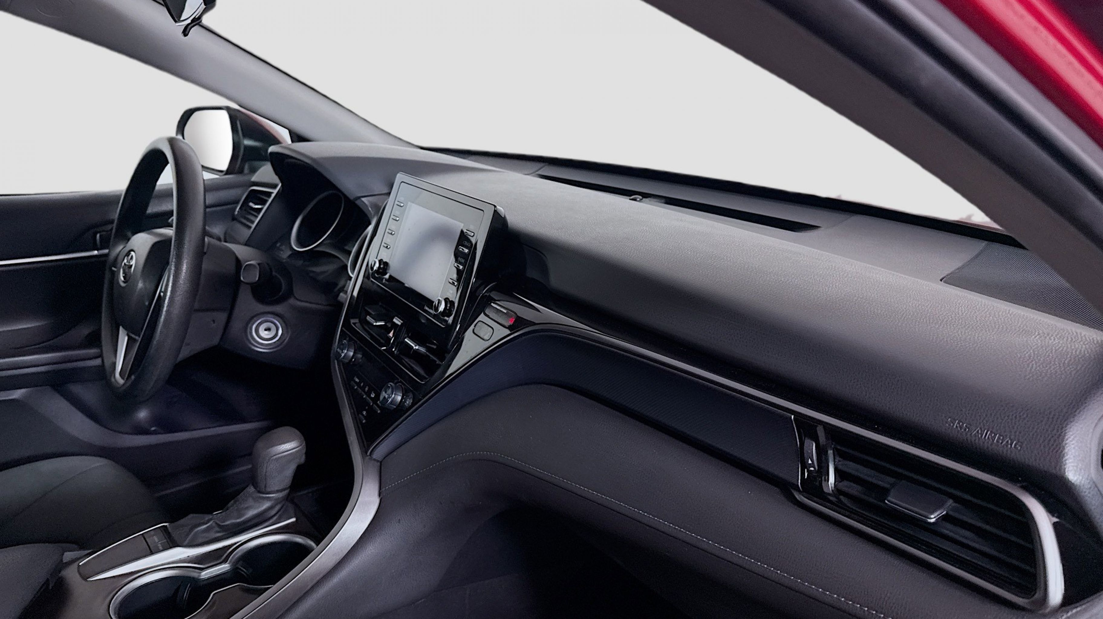 Ruby Flare Pearl 2022 Toyota Camry LE FWD 8-Speed Automatic 2.5L I4 DOHC 16V Black w/Fabric Seat Trim, 4-Wheel Disc Brakes, 6 Speakers, 7.5J x 17 Alloy Wheels, ABS brakes, Air Conditioning, Alloy wheels, AM/FM radio: SiriusXM, Apple CarPlay/Android Auto, Auto High-beam Headlights, Automatic temperature control, Brake assist, Bumpers: body-color, Delay-off headlights, Driver door bin, Driver vanity mirror, Dual front impact airbags, Dual front side impact airbags, Electronic Stability Control, Emergency communication system: Safety Connect with 1-year trial, Exterior Parking Camera Rear, Fabric Seat Trim, Four wheel independent suspension, Front anti-roll bar, Front Bucket Seats, Front Center Armrest, Front dual zone A/C, Front reading lights, Fully automatic headlights, Illuminated entry, Knee airbag, Low tire pressure warning, Occupant sensing airbag, Outside temperature display, Overhead airbag, Overhead console, Panic alarm, Passenger door bin, Passenger vanity mirror, Power door mirrors, Power driver seat, Power steering, Power windows, Radio data system, Radio: AM/FM Audio System, Rear anti-roll bar, Rear seat center armrest, Rear side impact airbag, Rear window defroster, Remote keyless entry, Security system, Speed control, Speed-sensing steering, Split folding rear seat, Steering wheel mounted audio controls, Tachometer, Telescoping steering wheel, Tilt steering wheel, Traction control, Trip computer, Variably intermittent wipers, Black w/Fabric Seat Trim.