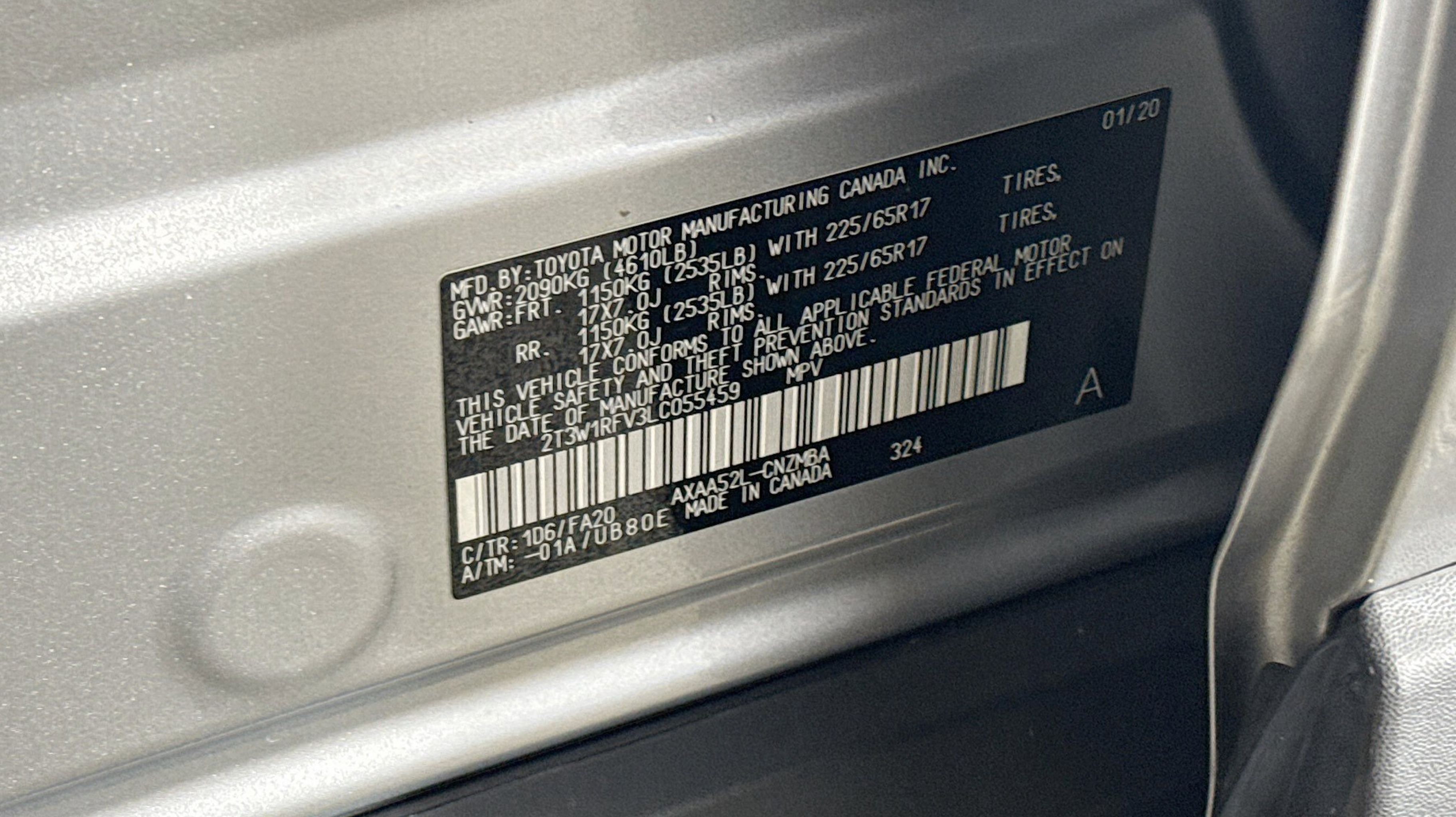 Black w/Fabric Seat Trim, 4-Wheel Disc Brakes, 6 Speakers, ABS brakes, Air Conditioning, Alloy wheels, AM/FM radio: SiriusXM, AM/FM Stereo, Apple CarPlay/Android Auto, Auto High-beam Headlights, Automatic temperature control, Axle Ratio: 3.177, Brake assist, Bumpers: body-color, Delay-off headlights, Driver door bin, Driver vanity mirror, Dual front impact airbags, Dual front side impact airbags, Electronic Stability Control, Emergency communication system: Entune Safety Connect, Exterior Parking Camera Rear, Fabric Seat Trim, Four wheel independent suspension, Front anti-roll bar, Front Bucket Seats, Front Center Armrest, Front dual zone A/C, Front fog lights, Front reading lights, Fully automatic headlights, Heated door mirrors, Illuminated entry, Knee airbag, Low tire pressure warning, Occupant sensing airbag, Outside temperature display, Overhead airbag, Overhead console, Panic alarm, Passenger door bin, Passenger vanity mirror, Power door mirrors, Power driver seat, Power steering, Power windows, Radio data system, Rear anti-roll bar, Rear seat center armrest, Rear window defroster, Rear window wiper, Remote keyless entry, Roof rack: rails only, Speed control, Speed-sensing steering, Split folding rear seat, Spoiler, Steering wheel mounted audio controls, Tachometer, Telescoping steering wheel, Tilt steering wheel, Traction control, Trip computer, Turn signal indicator mirrors, Variably intermittent wipers, Wheels: 17 5-Spoke Silver Alloy, Black w/Fabric Seat Trim.