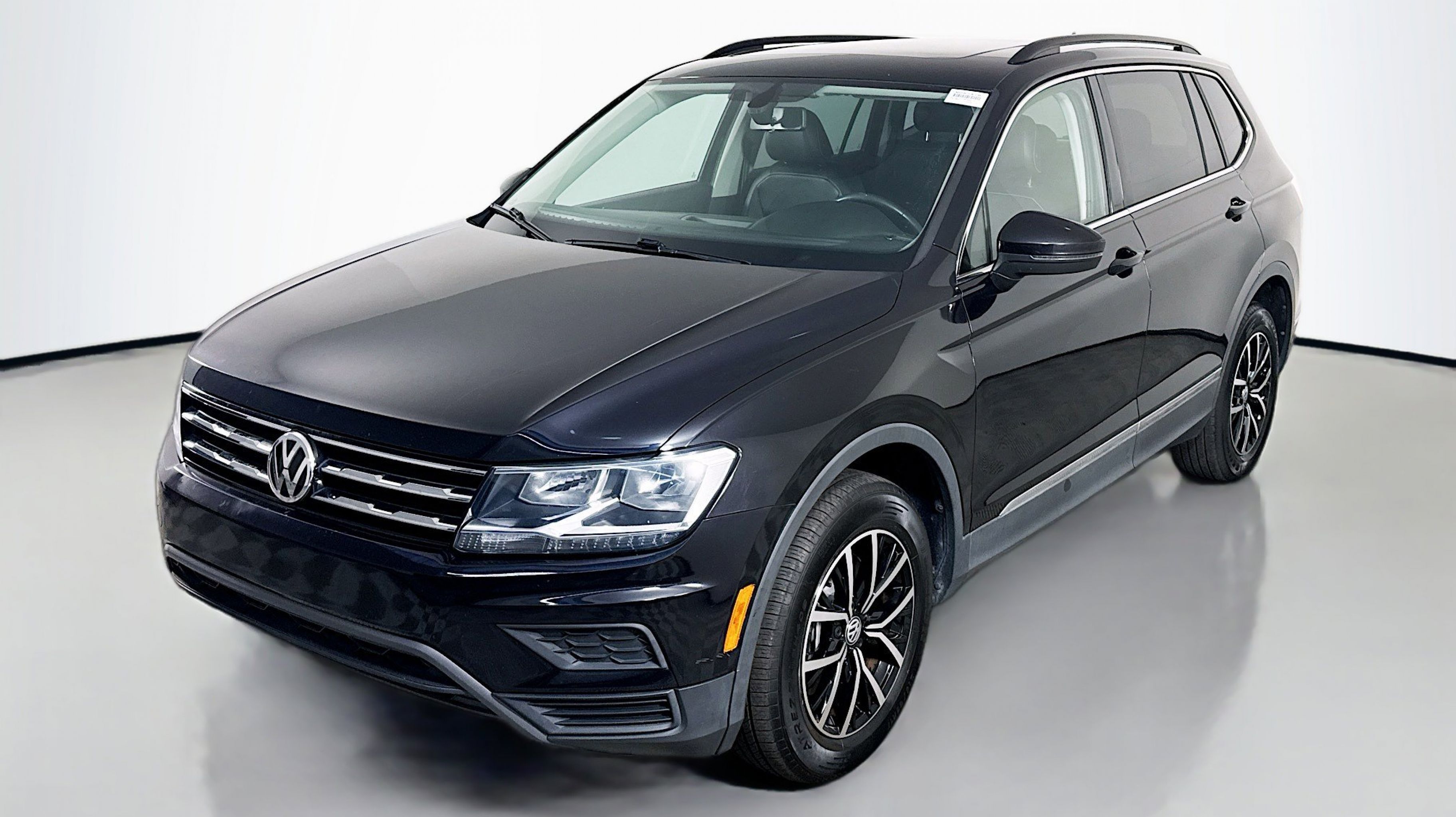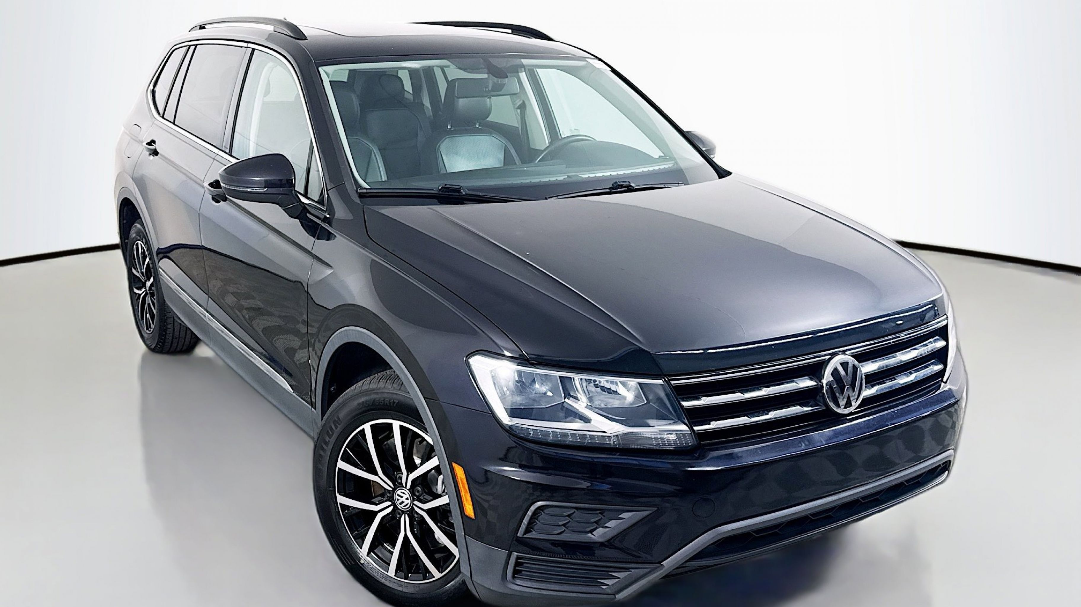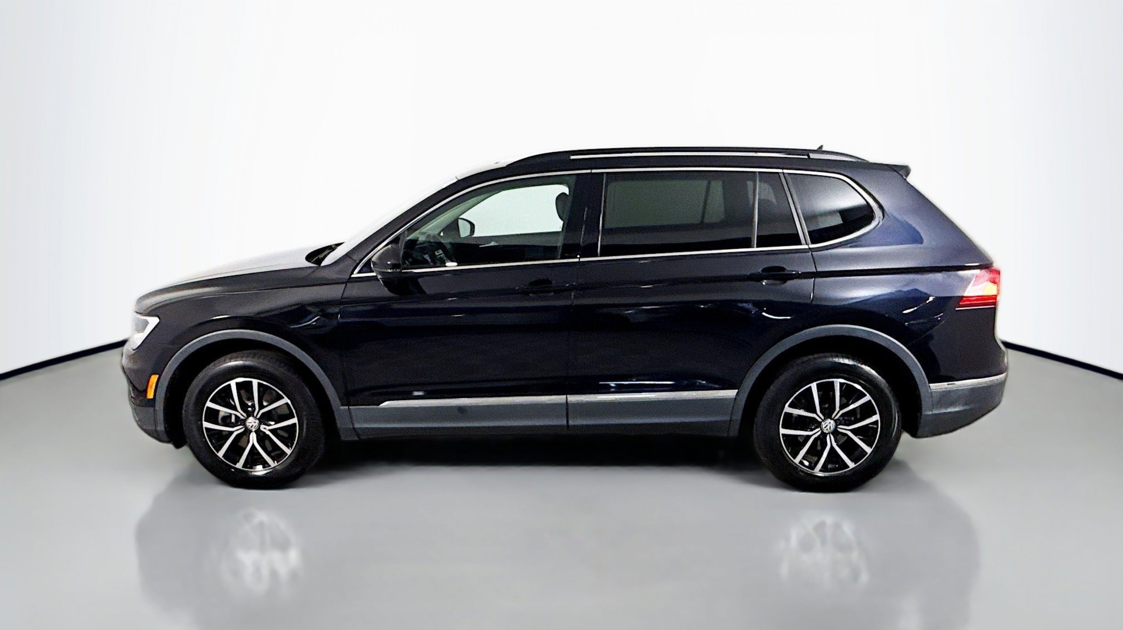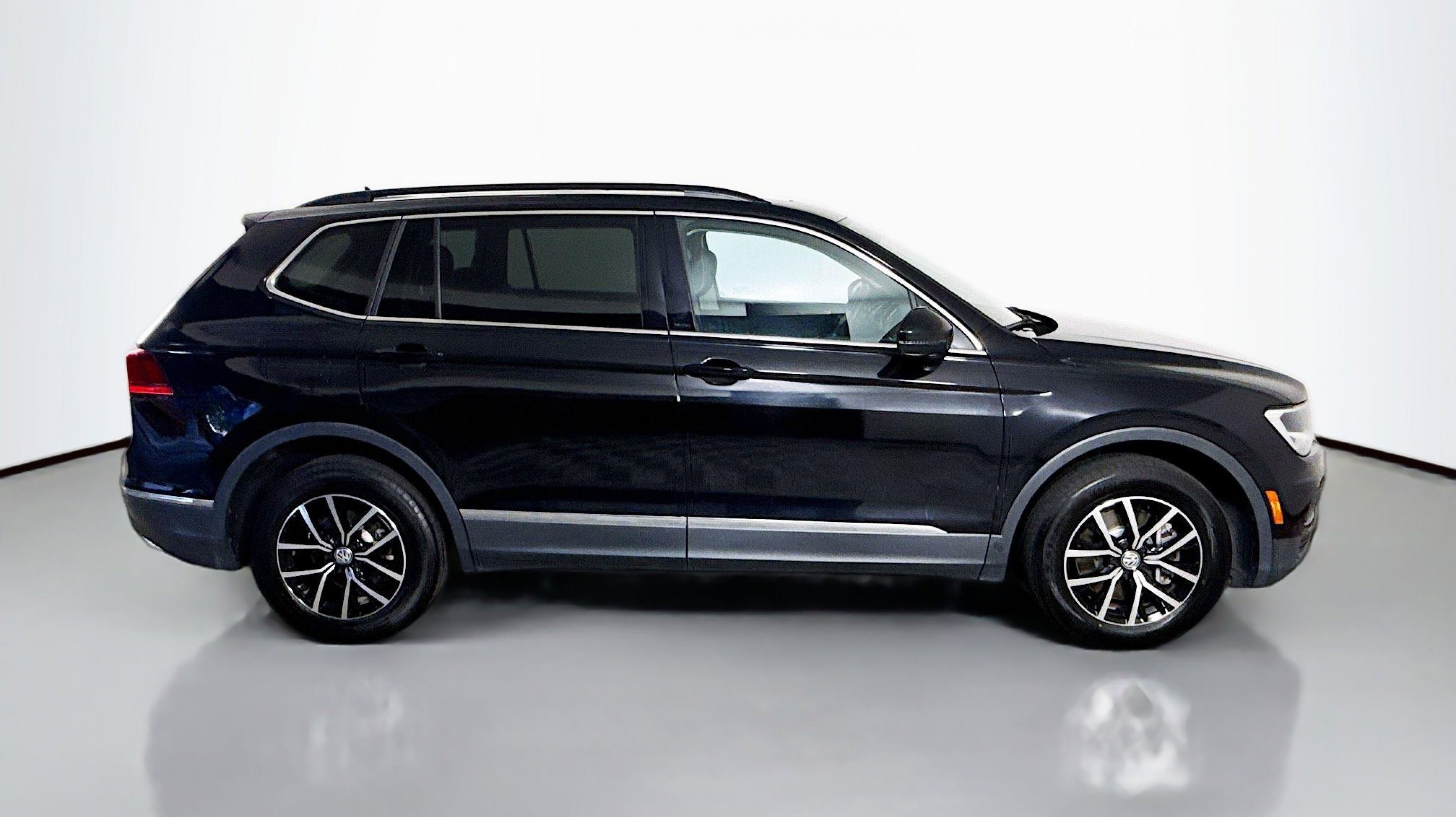 Deep Black Pearl 2021 Volkswagen Tiguan 2.0T SE FWD 8-Speed Automatic with Tiptronic 2.0L TSI DOHC 3.33 Axle Ratio, 3rd row seats: bench, 4-Wheel Disc Brakes, 4-Wheel Independent Suspension, 6 Speakers, ABS brakes, Air Conditioning, Alloy wheels, AM/FM radio: SiriusXM with 360L, Automatic temperature control, Brake assist, Bumpers: body-color, Compass, Delay-off headlights, Driver door bin, Driver vanity mirror, Dual front impact airbags, Dual front side impact airbags, Electronic Stability Control, Emergency communication system: VW Car-Net services (capabilities require enrollment or subscription), Exterior Parking Camera Rear, Forward collision: FCW w/Autonomous Emergency Braking mitigation, Four wheel independent suspension, Front anti-roll bar, Front Bucket Seats, Front Center Armrest, Front dual zone A/C, Front reading lights, Fully automatic headlights, Heated door mirrors, Heated Front Comfort Seats, Heated front seats, Illuminated entry, Leather Shift Knob, Low tire pressure warning, Occupant sensing airbag, Outside temperature display, Overhead airbag, Overhead console, Panic alarm, Passenger door bin, Passenger vanity mirror, Perforated V-Tex Leatherette Seating Surfaces, Power door mirrors, Power driver seat, Power steering, Power windows, Radio data system, Radio: MIB3 Composition Media AM/FM/HD, Rear anti-roll bar, Rear reading lights, Rear seat center armrest, Rear window defroster, Rear window wiper, Remote keyless entry, Roof rack: rails only, Security system, Speed control, Speed-sensing steering, Split folding rear seat, Spoiler, Steering wheel mounted audio controls, Tachometer, Telescoping steering wheel, Tilt steering wheel, Traction control, Trip computer, Turn signal indicator mirrors, Variably intermittent wipers, Wheels: 17 2-Tone Machined & Black Alloy.