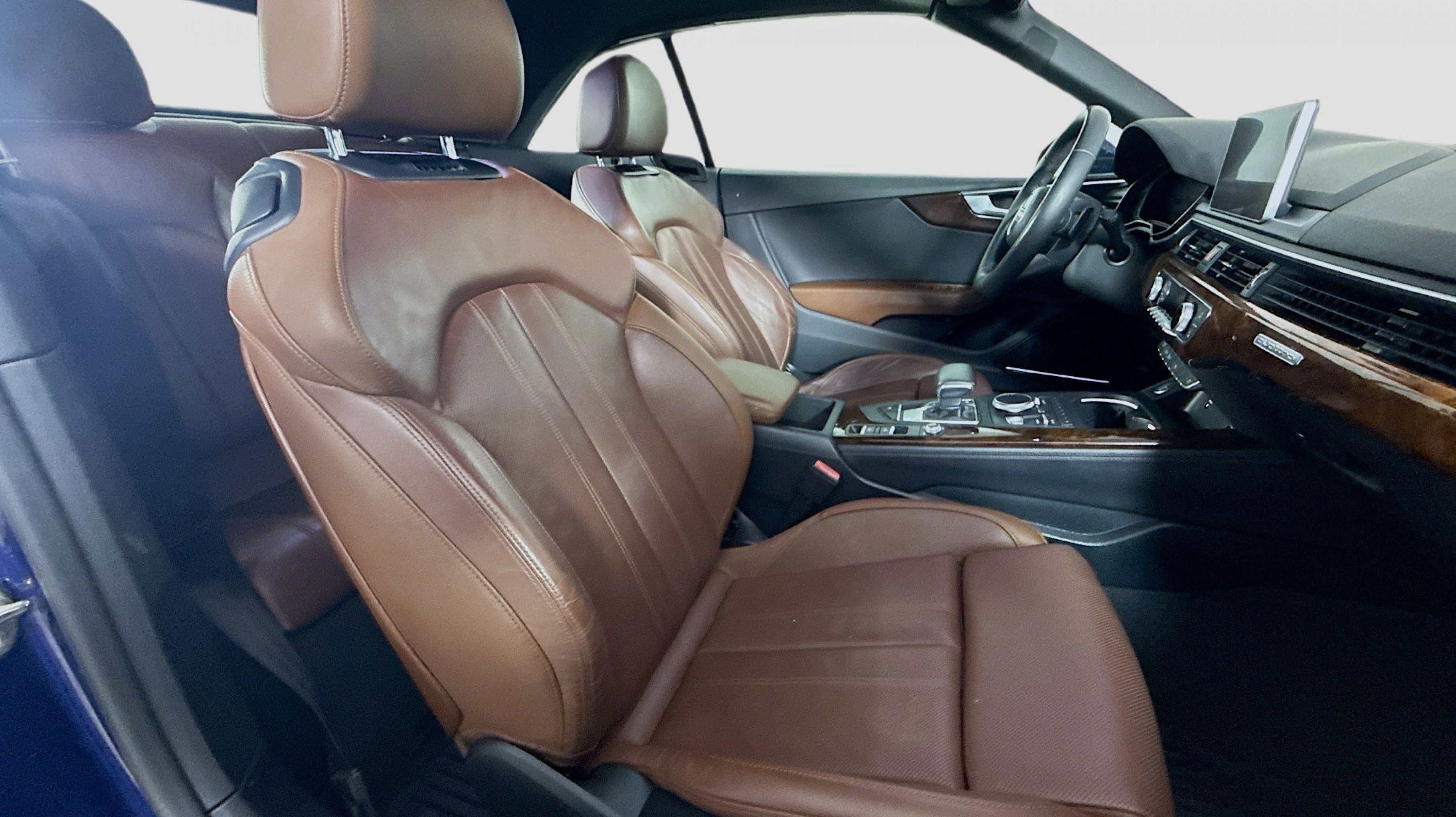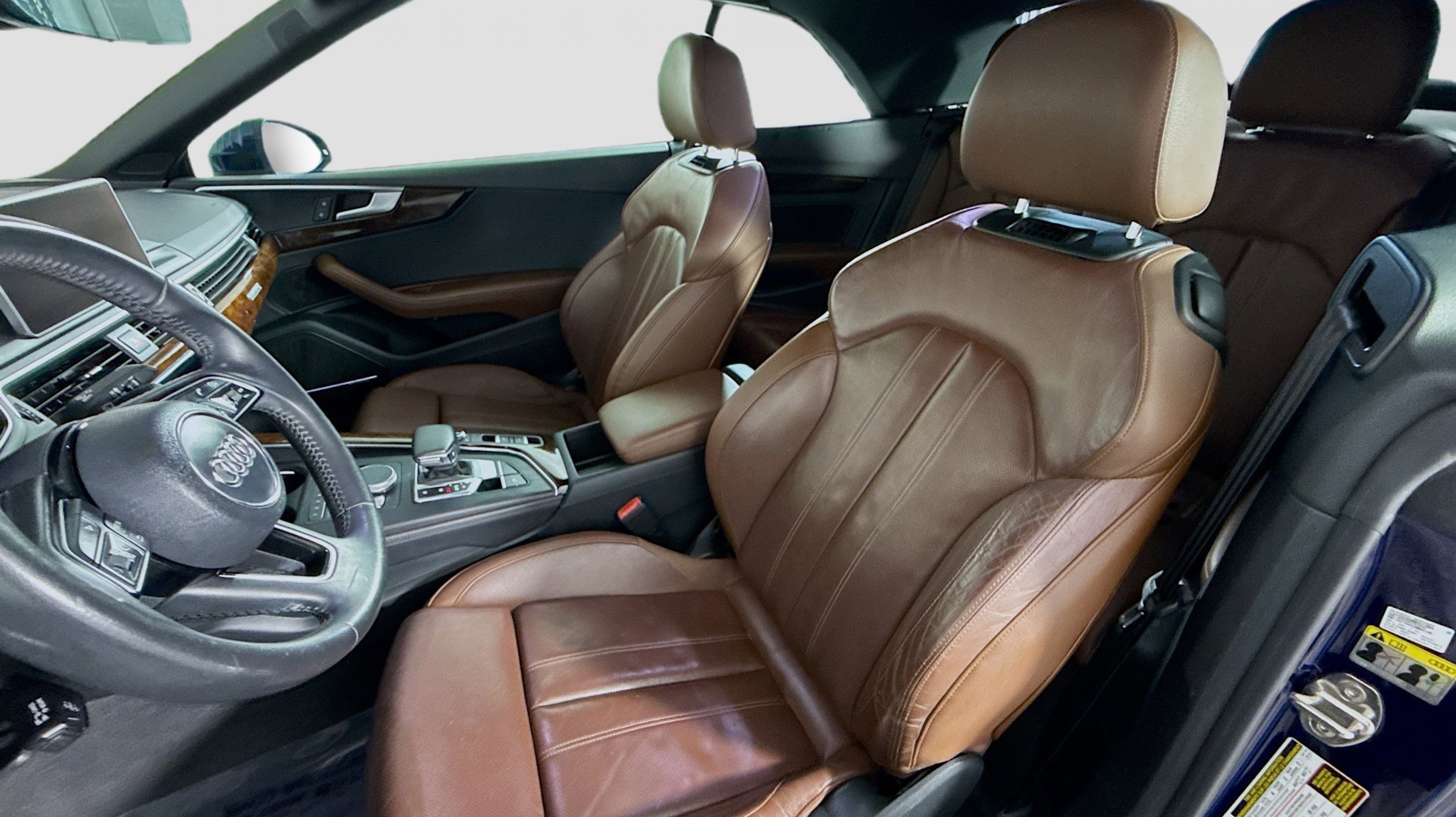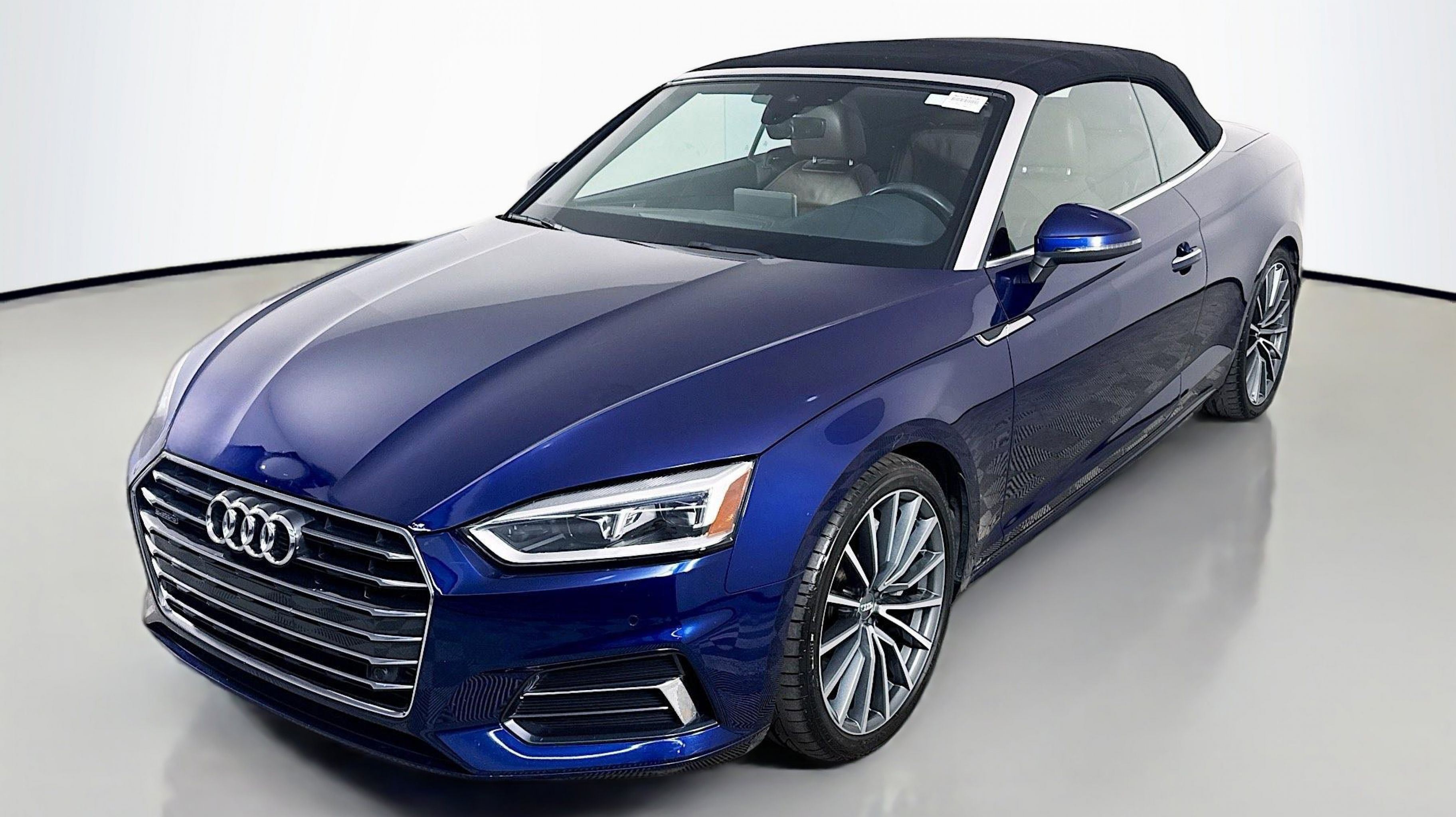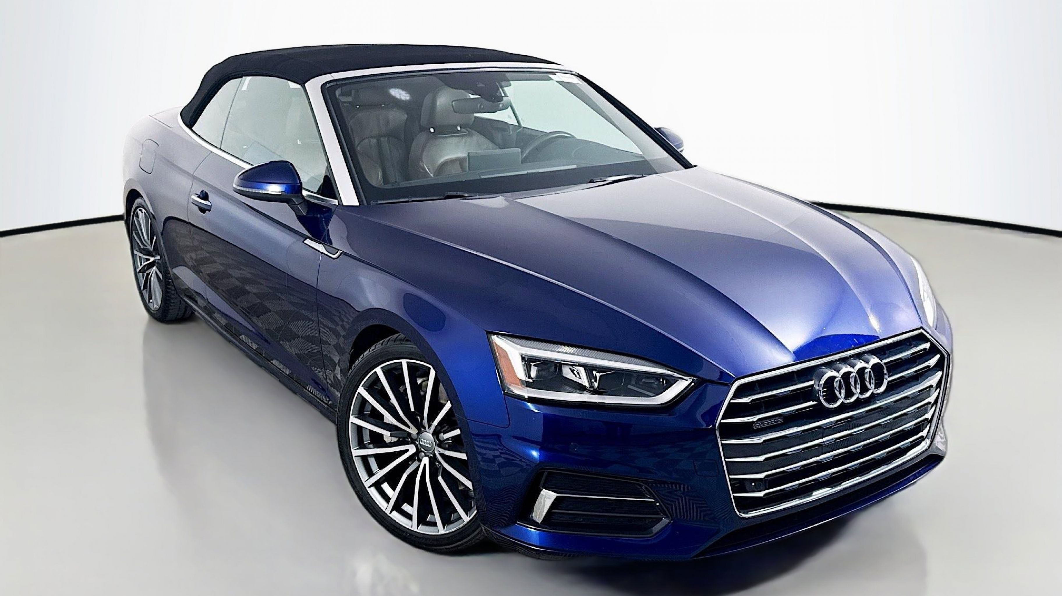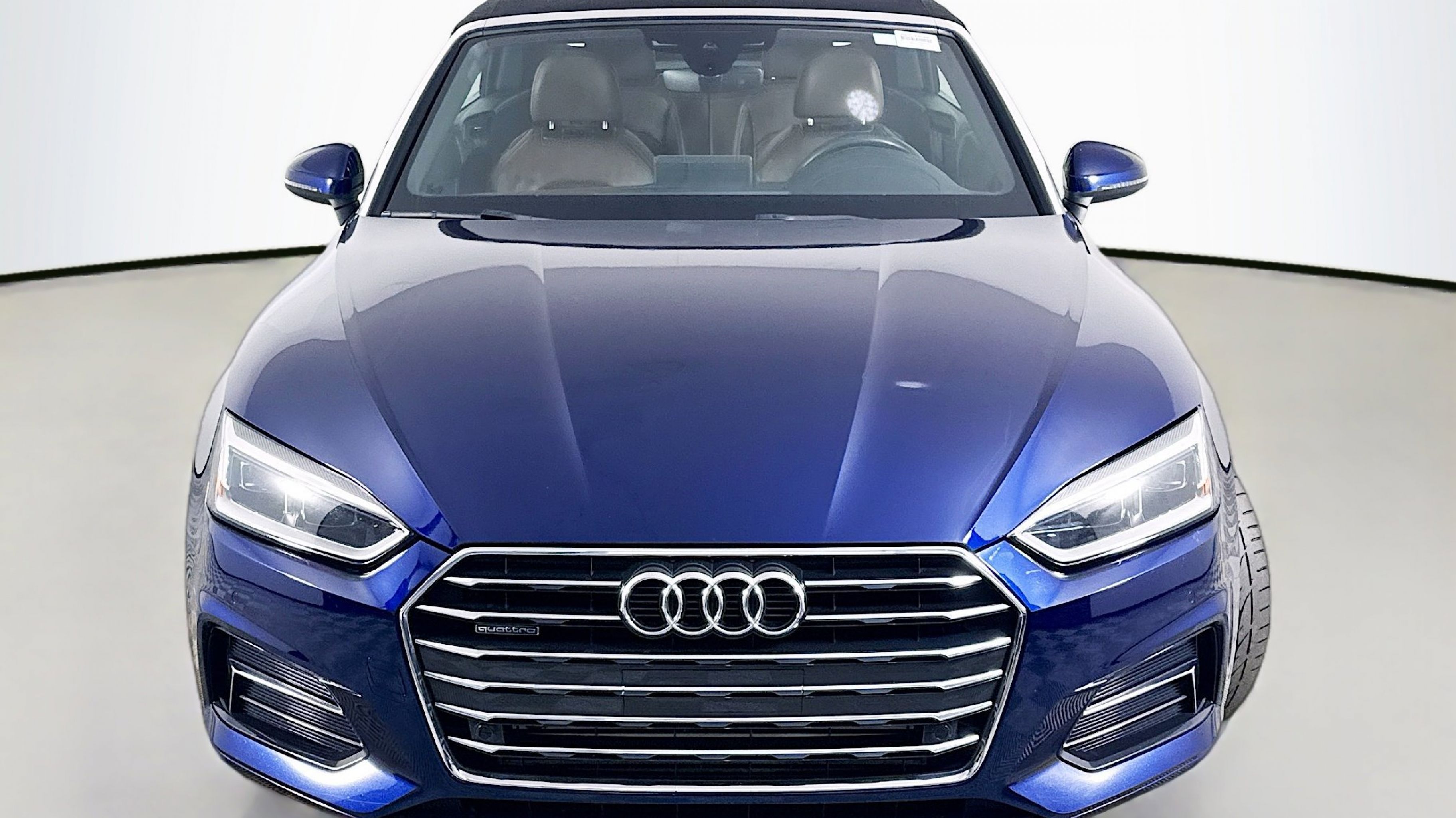 Navarra Blue Metallic 2019 Audi A5 2.0T Premium Plus quattro quattro 7-Speed Automatic S tronic 2.0L 4-Cylinder TFSI quattro, Nougat Brown w/Leather Seating Surfaces, 19 Design line Wheel Package, Alarm System w/Motion Sensors, Audi Advanced Key, Audi MMI Navigation Plus w/MMI Touch, Audi pre sense rear, Audi Side Assist, Auto-Dimming Exterior Mirrors, Convenience Package, Driver Seat Memory, Front Sport Seats, Heated Steering Wheel, Luxury Package, Neck-Level Heating System, Parking System Plus (Front/Rear Acoustic Sensors), Power Folding Exterior Mirrors, Premium Plus, SiriusXM All Access Service, Sport Suspension, Ventilated Front Seats, Wheels: 19 x 8.5 Multi-Spoke Design Bi-Color, 10 Speakers, 4-Wheel Disc Brakes, ABS brakes, Air Conditioning, Alloy wheels, AM/FM radio, Anti-whiplash front head restraints, Audi First Aid Kit, Audi Guard All-Weather Front & Rear Mats, Audi smartphone interface (Apple CarPlay/Android Auto), Auto-dimming Rear-View mirror, Automatic temperature control, Bang & Olufsen Sound System w/3D Sound, Brake assist, Bumpers: body-color, Compass, Convertible roof lining, Convertible roof wind blocker, Delay-off headlights, Delete Front License Plate Holder, Driver door bin, Driver vanity mirror, Dual front impact airbags, Dual front side impact airbags, Electronic Stability Control, Emergency communication system: Audi connect CARE, Exterior Parking Camera Rear, Four wheel independent suspension, Front anti-roll bar, Front Bucket Seats, Front Center Armrest, Front dual zone A/C, Front fog lights, Front reading lights, Garage door transmitter: HomeLink, Genuine wood console insert, Genuine wood door panel insert, Glass rear window, Headlight cleaning, Heated door mirrors, Heated Front Bucket Seats, Heated front seats, Illuminated entry, Integrated roll-over protection, Knee airbag, Leather Seating Surfaces, Leather Shift Knob, Leather steering wheel, Low tire pressure warning, Occupant sensing airbag, Outside temperature display, Panic alarm, Passenger door bin, Passenger vanity mirror, Power adjustable front head restraints, Power convertible roof, Power door mirrors, Power driver seat, Power passenger seat, Power steering, Power windows, Radio data system, Radio: Audi Sound System, Rain sensing wipers, Rear air conditioning, Rear anti-roll bar, Rear reading lights, Rear window defroster, Remote keyless entry, Rings Audi Beam, Security system, Speed control, Speed-sensing steering, Speed-Sensitive Wipers, Split folding rear seat, Steering wheel mounted audio controls, Tachometer, Telescoping steering wheel, Tilt steering wheel, Traction control, Trip computer, Turn signal indicator mirrors, USB Cables, Variably intermittent wipers, Wheels: 18 x 8.5 5-Arm-Dynamic Design, quattro, Nougat Brown w/Leather Seating Surfaces, 19 Design line Wheel Package, Alarm System w/Motion Sensors, Audi Advanced Key, Audi MMI Navigation Plus w/MMI Touch, Audi pre sense rear, Audi Side Assist, Auto-Dimming Exterior Mirrors, Convenience Package, Driver Seat Memory, Front Sport Seats, Heated Steering Wheel, Luxury Package, Neck-Level Heating System, Parking System Plus (Front/Rear Acoustic Sensors), Power Folding Exterior Mirrors, Premium Plus, SiriusXM All Access Service, Sport Suspension, Ventilated Front Seats, Wheels: 19 x 8.5 Multi-Spoke Design Bi-Color.