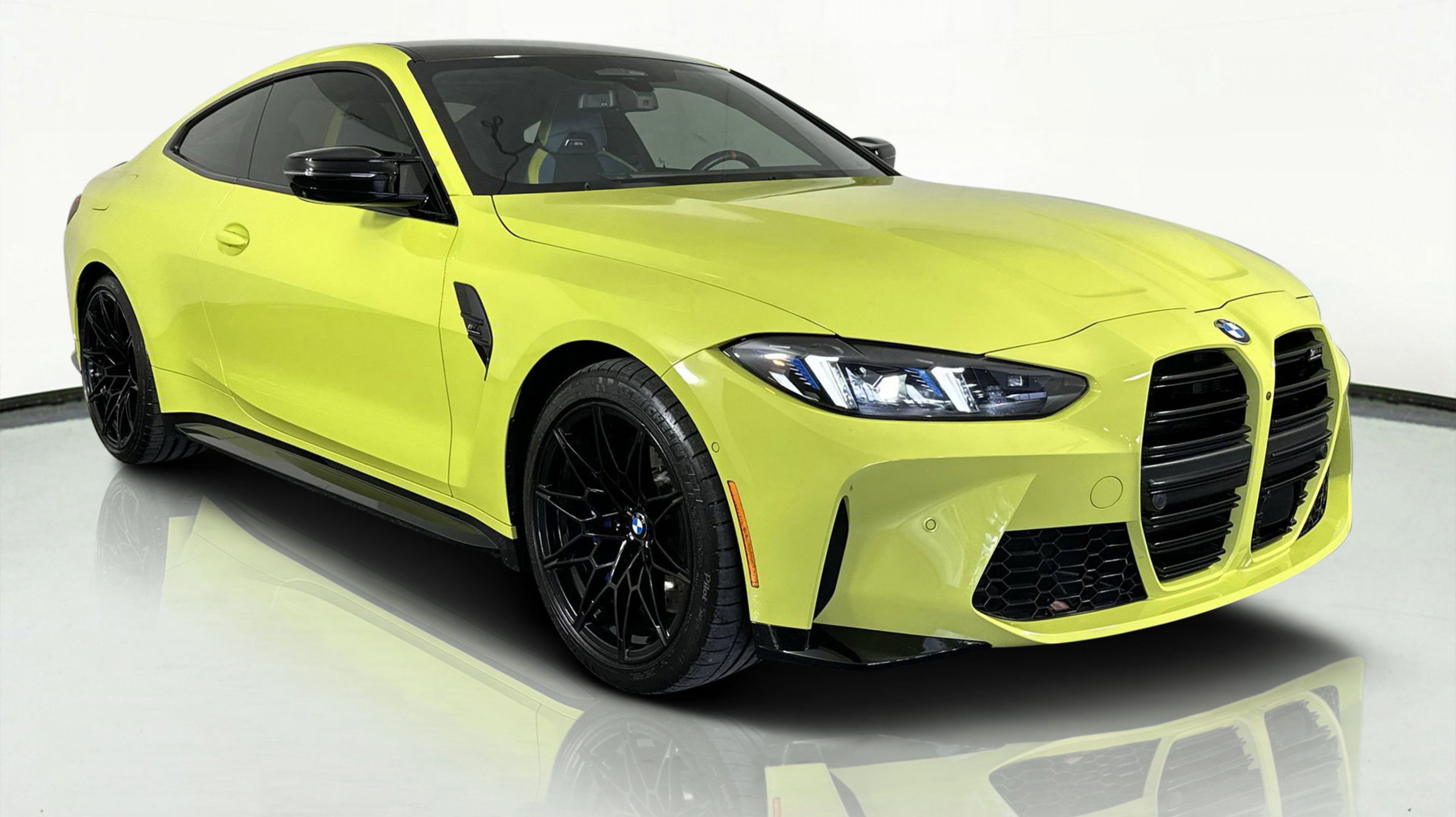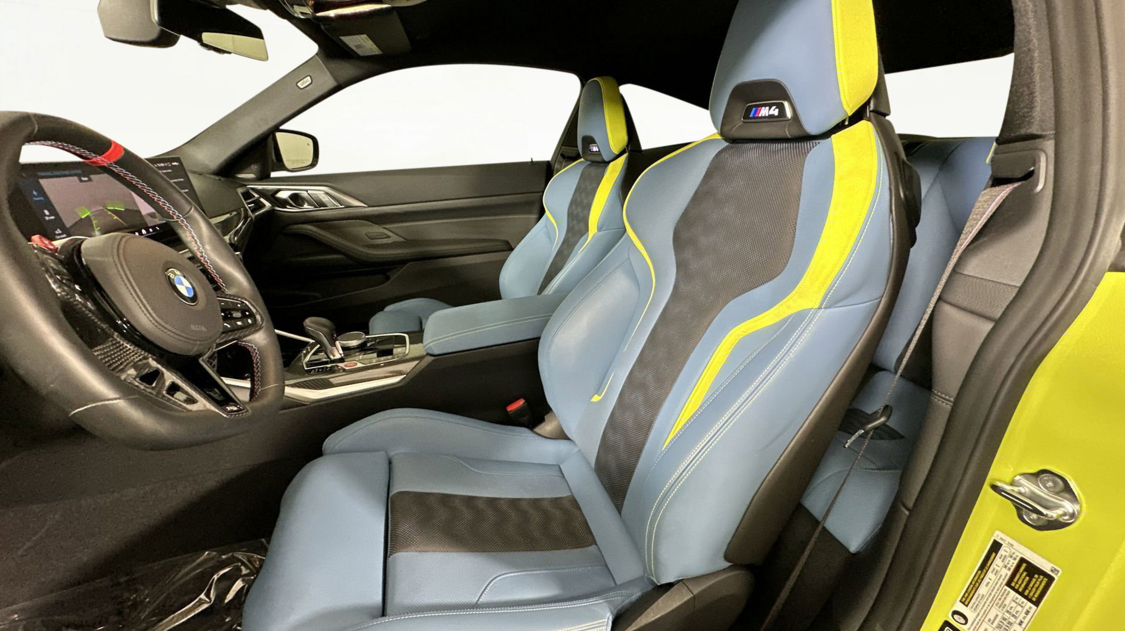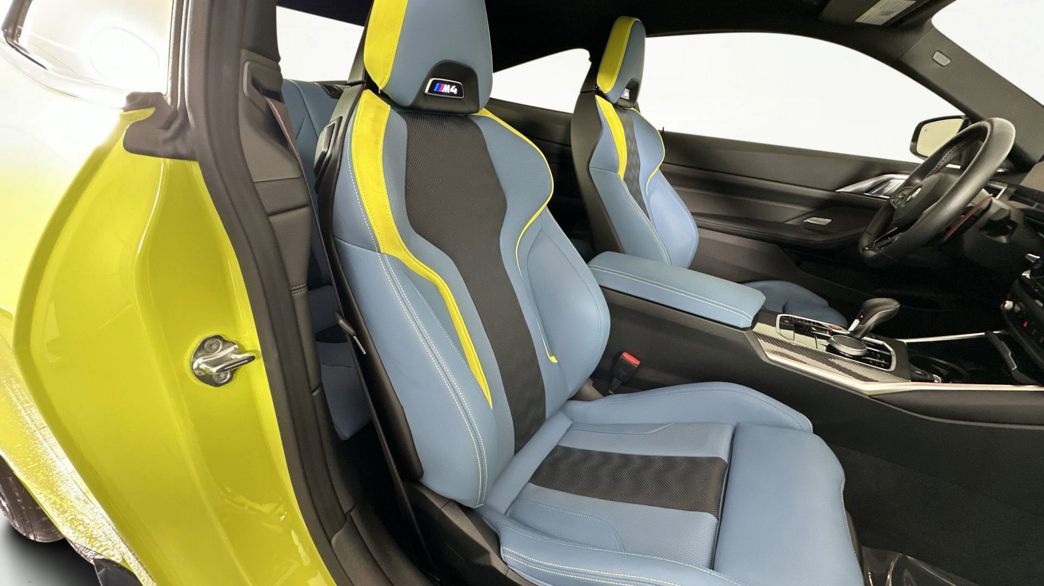 Finished in Sao Paulo Yellow, this M4 Competition commands attention with its bold design and aerodynamic presence. The Yas Marina Blue and Black Merino Leather interior exudes modern sport-luxury, complemented by carbon fiber trim and M performance touches throughout. With advanced safety, driver-assist features, and an interior tailored for high-performance comfort, the M4 Competition Coupe represents the perfect balance between innovation and intensity.