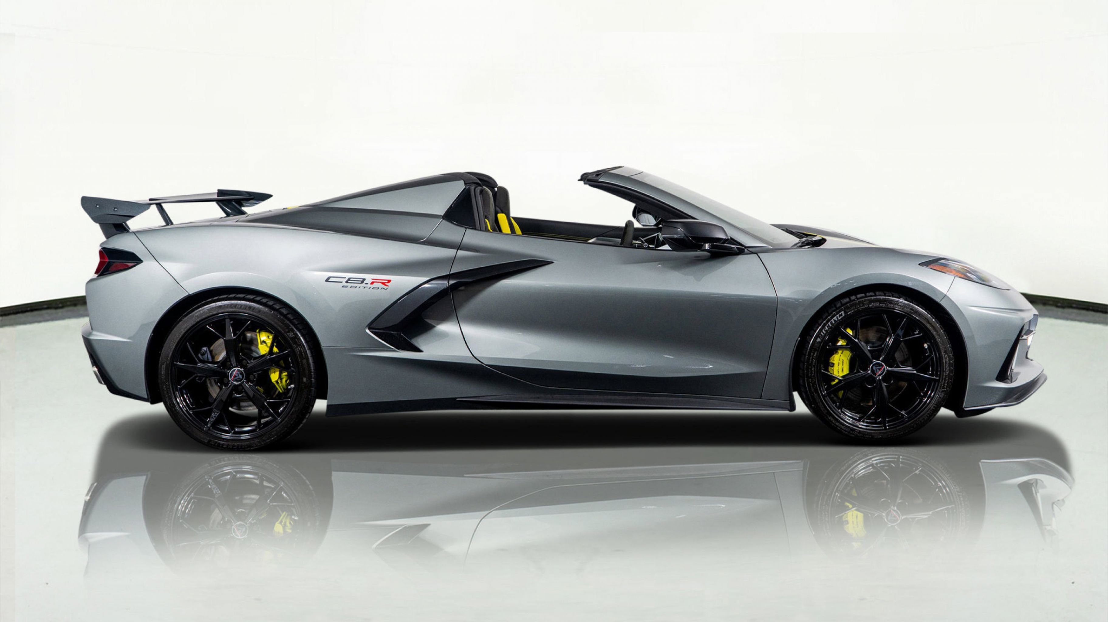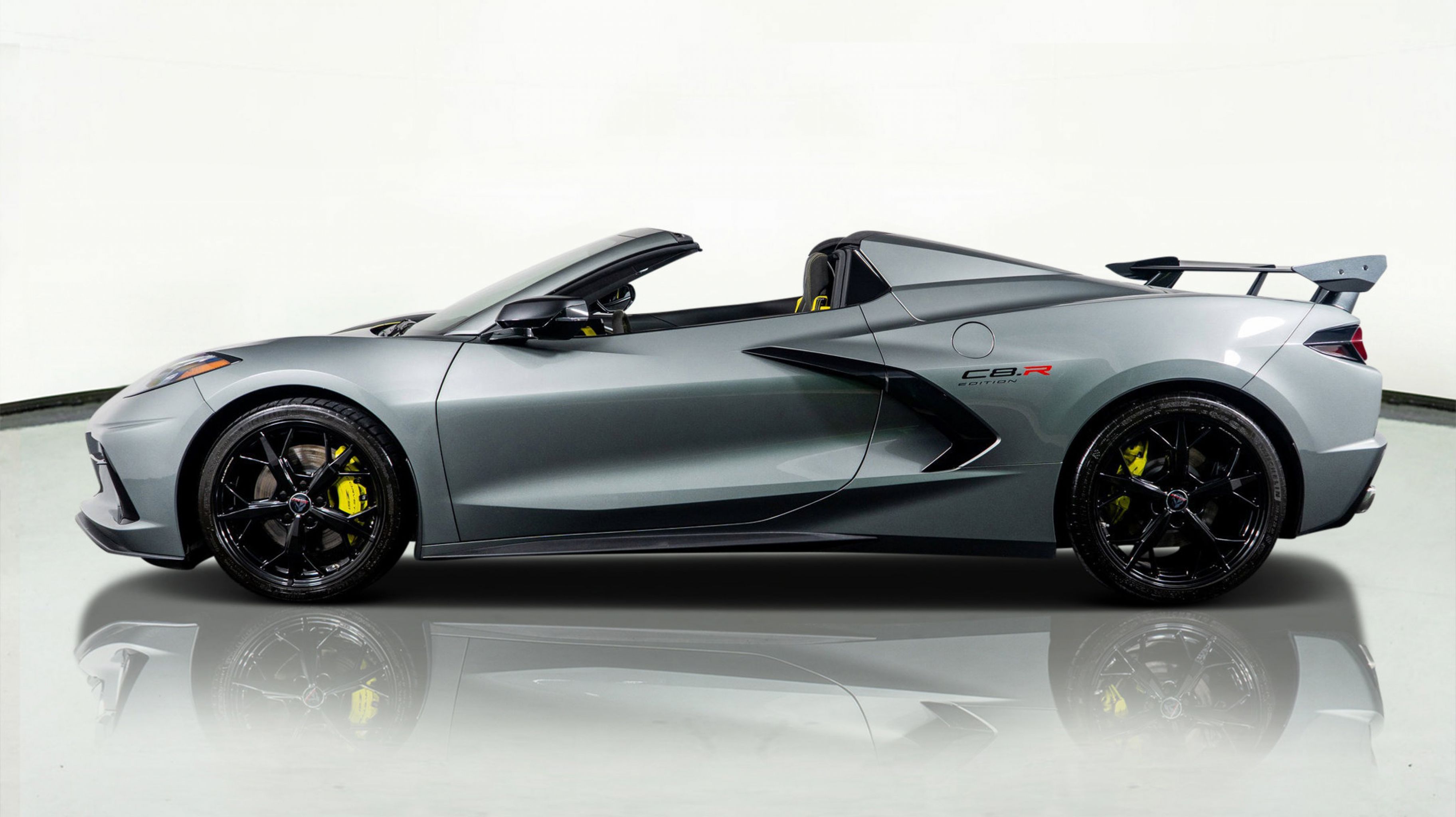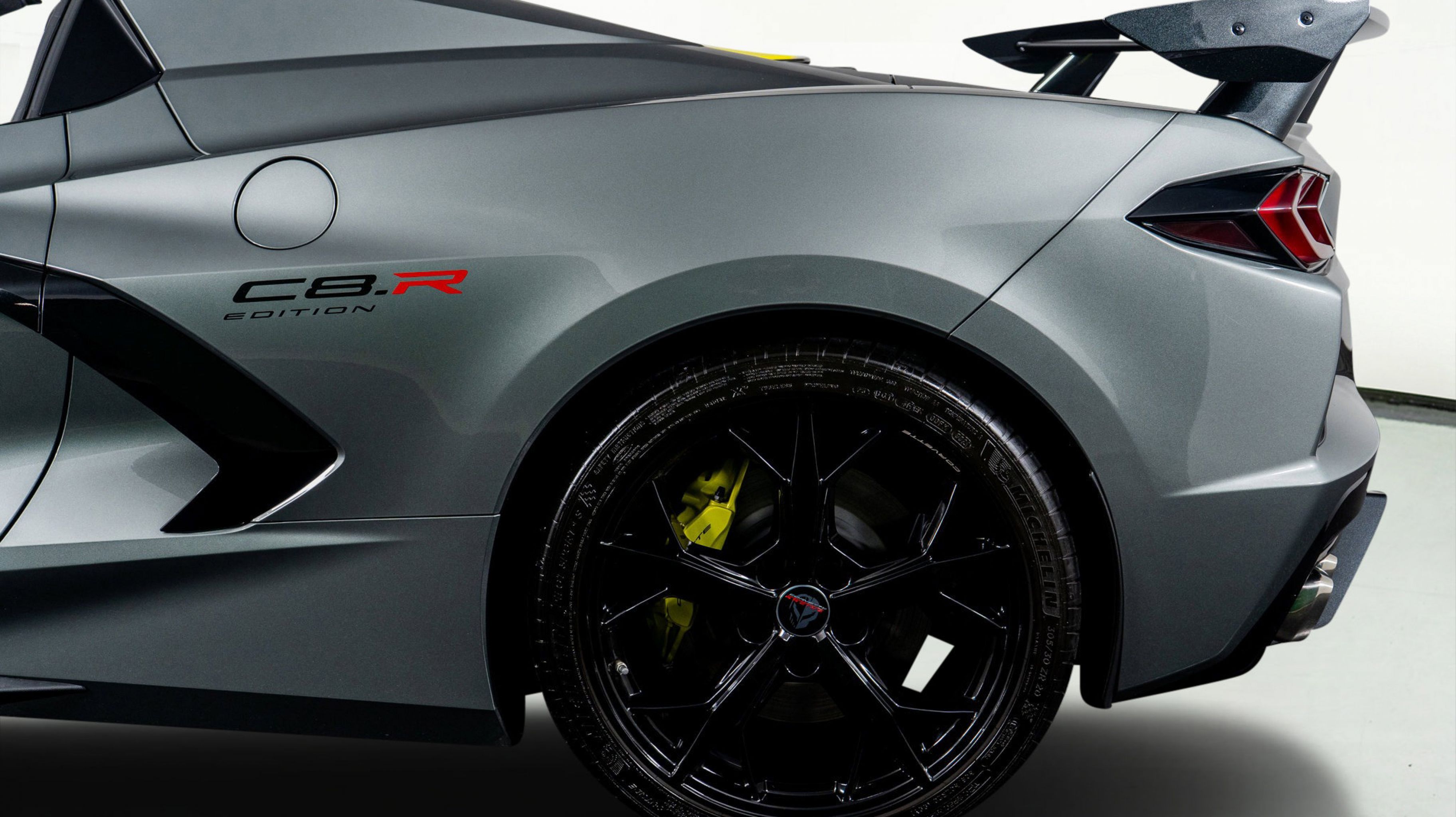 - IMSA GTLM CHAMPIONSHIP C8.R EDITION includes Yellow C8.R Graphics Package [when ordered with (GA7) Hypersonic Gray Metallic exterior color] or Gray C8.R Graphics Package [when ordered with (GD0) Accelerate Yellow Metallic exterior color] (CFY) C8.R Special Edition numbered plaque (ZYC) Carbon Flash Metallic-painted outside mirrors (QE5) 19 front/20 rear 5-trident-spoke Black-painted aluminum wheels (J6E) Edge Yellow-painted calipers (N26) sueded-microfiber steering wheel the following Genuine Corvette Accessory LPOs: (5ZZ) Carbon Flash Metallic-painted high-wing spoiler (STI) Black composite rocker extensions (VQK) Black custom splash guards (5ZC) Jake logo wheel center caps (SPY) Black lug nuts and (WL0) Gray fully rendered C8.R premium indoor car cover [when ordered with (GA7) Hypersonic Gray Metallic exterior color] or (WKR) Yellow fully rendered C8.R premium indoor car cover [when ordered with (GD0) Accelerate Yellow Metallic exterior color]
