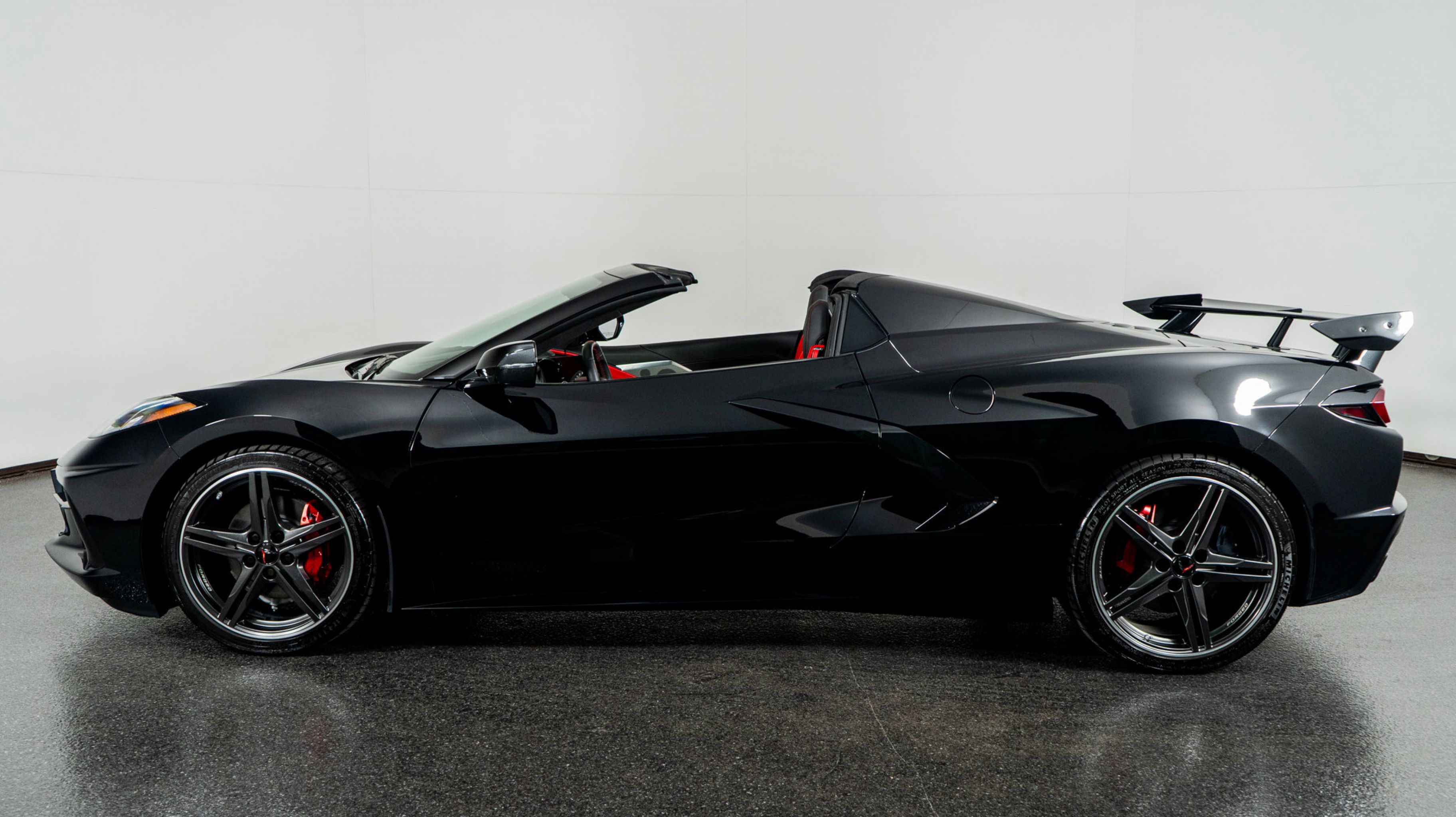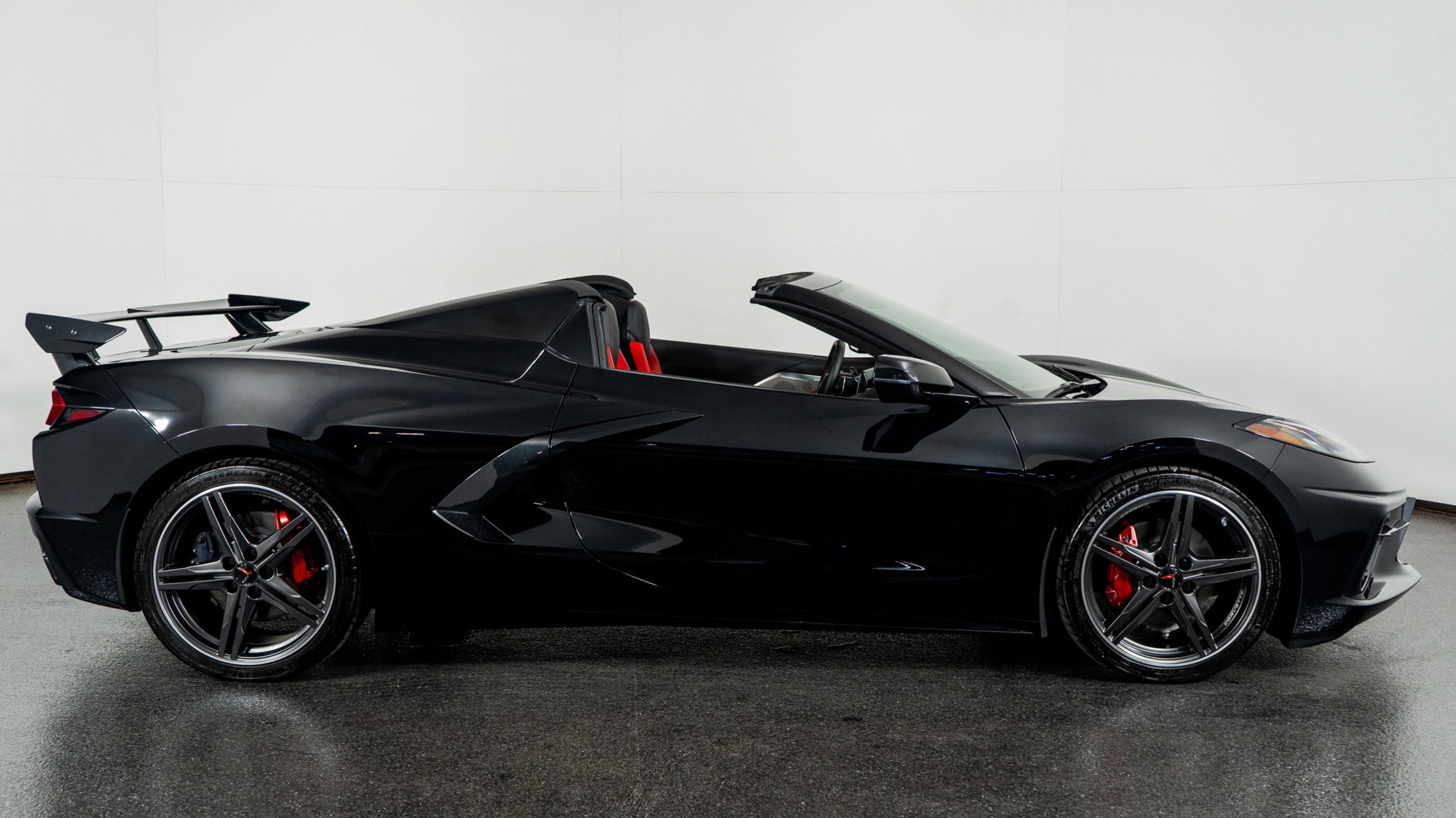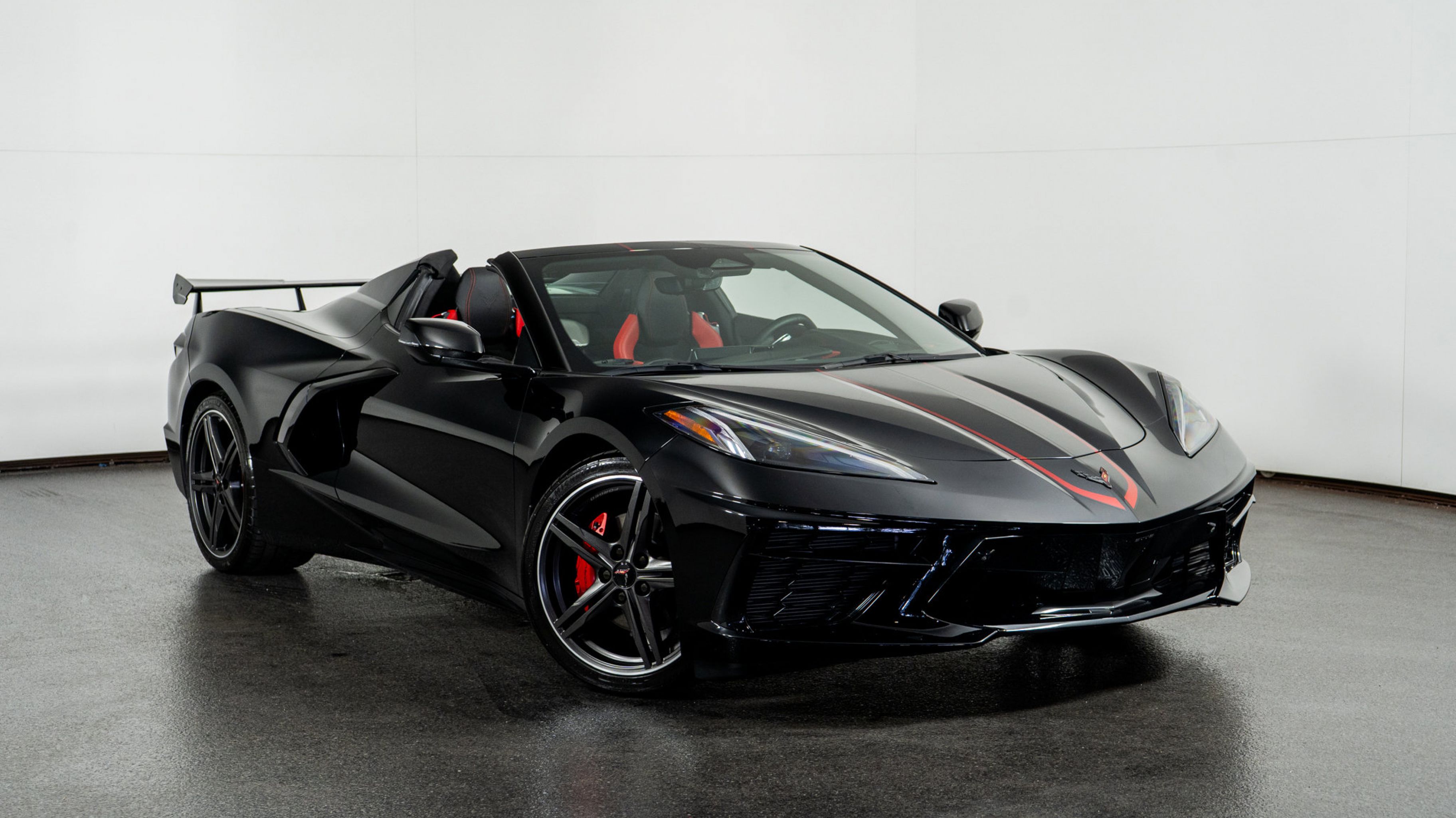 Finished in Black with Adrenaline Red leather, this Corvette commands presence with its bold design and sculpted aerodynamics. Inside, the handcrafted interior showcases red contrast detailing, premium materials, and immersive technology. The 3LT Package adds modern luxury, while the Performance Exhaust and Z51 components heighten both sound and feel. The Carbon Flash accents and red-accented racing stripes complete a commanding and elegant design. This convertible captures the spirit of pure driving freedomcrafted for those who demand both precision and presence.