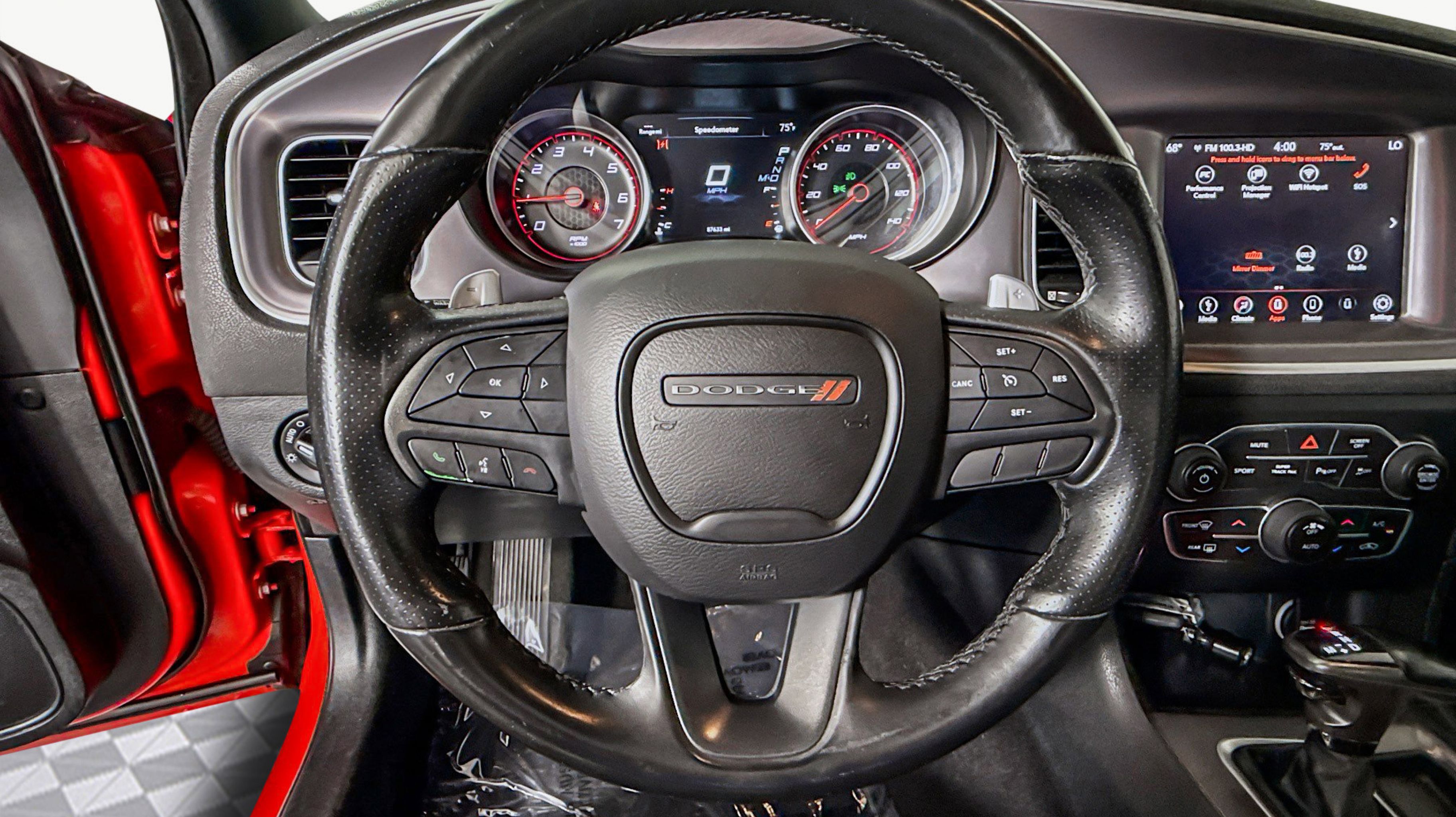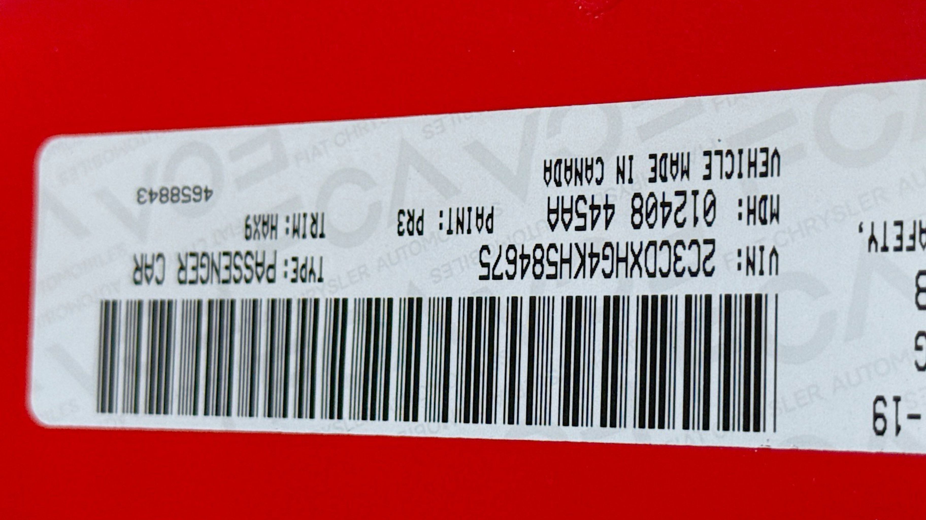 Black w/Cloth Performance Seats or Cloth Performance Seat w/Star or Daytona Logo Nappa/Alcantara Seat or Nappa/Alcantara Performance Seat, Quick Order Package 29H, 4-Wheel Disc Brakes, 6 Speakers, ABS brakes, Air Conditioning, Alloy wheels, AM/FM radio: SiriusXM, Anti-whiplash front head restraints, Apple CarPlay/Android Auto, Auto-dimming Rear-View mirror, Automatic temperature control, Brake assist, Bumpers: body-color, Cloth Performance Seats, Compass, Delay-off headlights, Driver door bin, Driver vanity mirror, Dual front impact airbags, Dual front side impact airbags, Electronic Stability Control, Emergency communication system: SiriusXM Guardian, Four wheel independent suspension, Front anti-roll bar, Front Bucket Seats, Front Center Armrest, Front dual zone A/C, Front fog lights, Front reading lights, Fully automatic headlights, Garage door transmitter: HomeLink, Heated door mirrors, Illuminated entry, Knee airbag, Leather Shift Knob, Low tire pressure warning, Manufacturer's Statement of Origin, Occupant sensing airbag, Outside temperature display, Overhead airbag, Overhead console, Panic alarm, ParkView Rear Back-Up Camera, Passenger door bin, Passenger vanity mirror, Power 4-Way Driver Lumbar Adjust, Power door mirrors, Power driver seat, Power steering, Power windows, Radio data system, Radio: Uconnect 4C w/8.4 Display, Rear anti-roll bar, Rear Armrest w/Cupholder Seat, Rear reading lights, Rear seat center armrest, Rear window defroster, Remote keyless entry, Speed control, Speed-Sensitive Wipers, Split folding rear seat, Spoiler, Sport steering wheel, Steering wheel mounted audio controls, Tachometer, Telescoping steering wheel, Tilt steering wheel, Traction control, Trip computer, Variably intermittent wipers, Wheels: 20 x 8.0 Granite Crystal Aluminum, Black w/Cloth Performance Seats or Cloth Performance Seat w/Star or Daytona Logo Nappa/Alcantara Seat or Nappa/Alcantara Performance Seat, Quick Order Package 29H. Odometer is 10854 miles below market average!