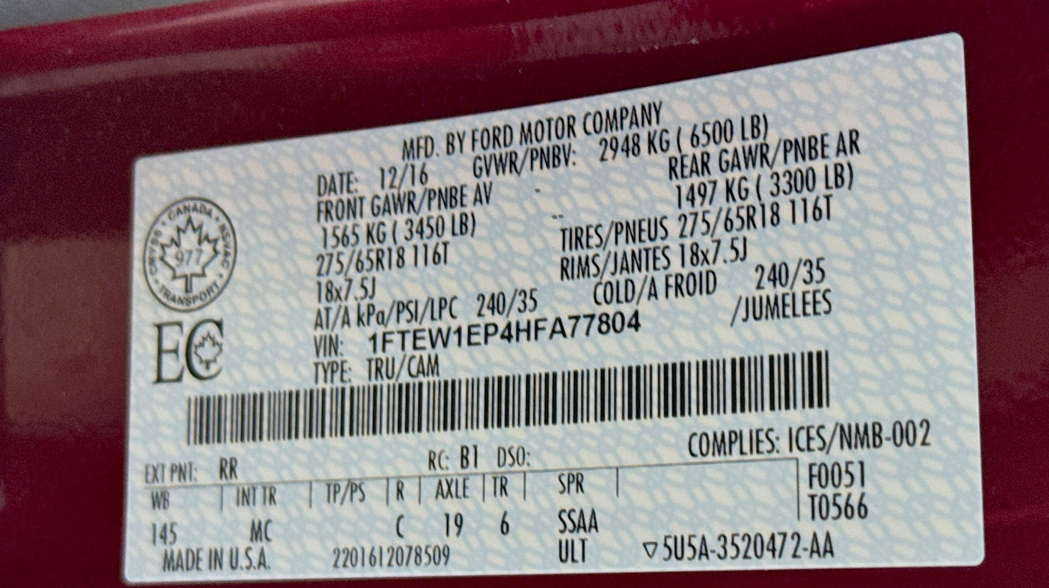 - ENGINE: 2.7L V6 ECOBOOST -inc: auto start/stop 3.55 Axle Ratio GVWR: 6 500 lbs Payload Package