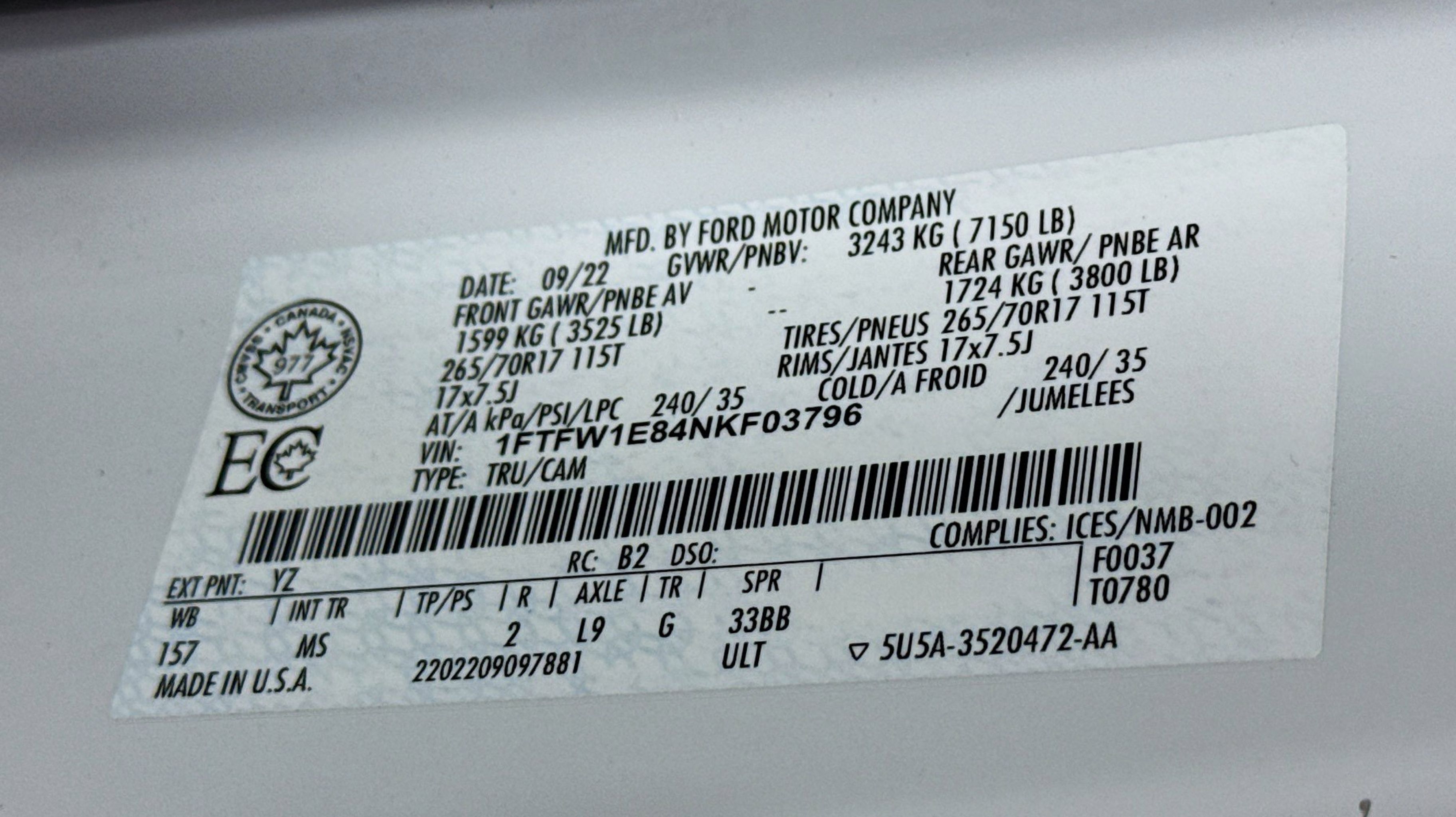 - ENGINE: 3.5L V6 ECOBOOST -inc: GVWR: 7 050 lbs Payload Package 3.31 Axle Ratio