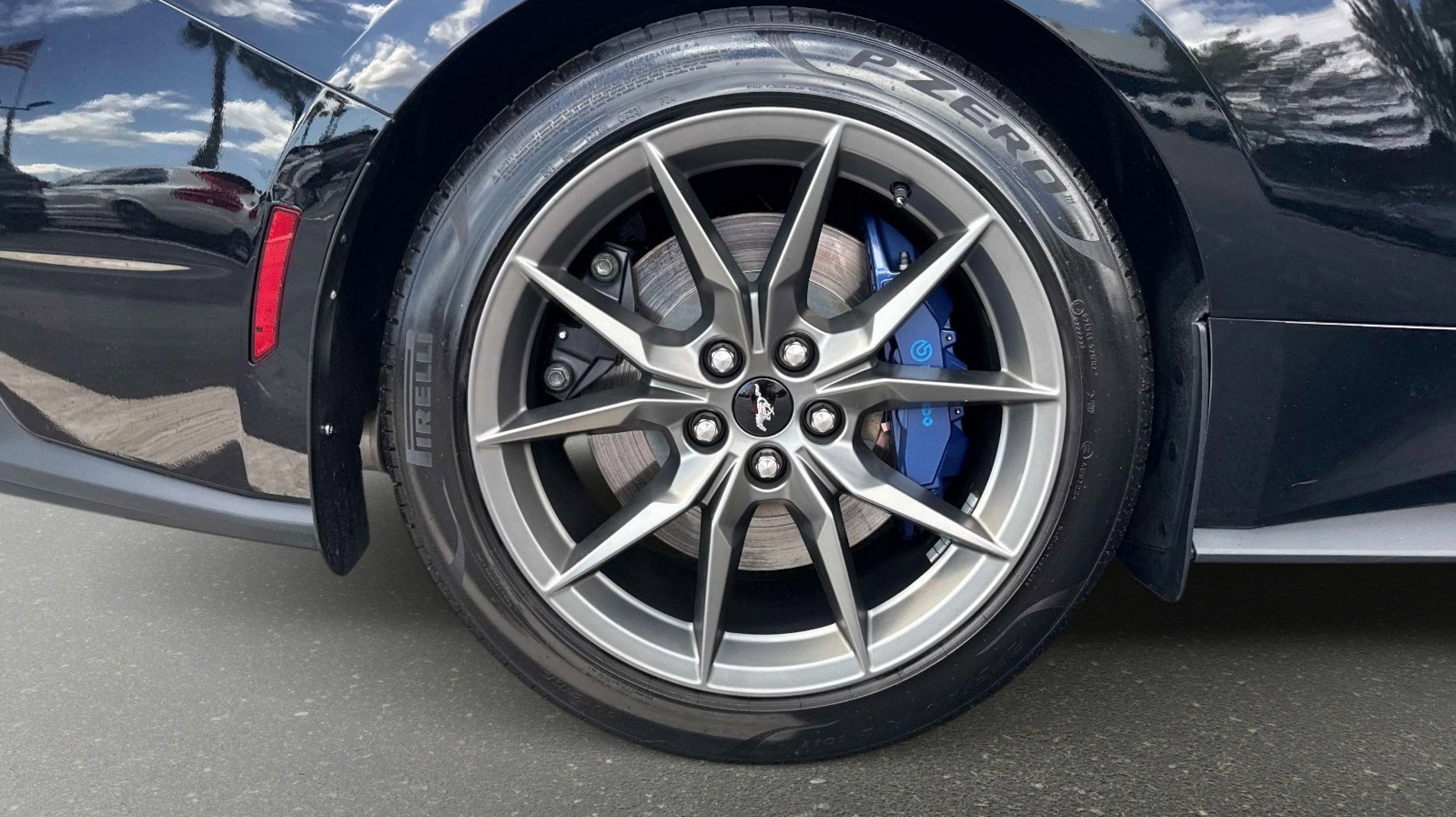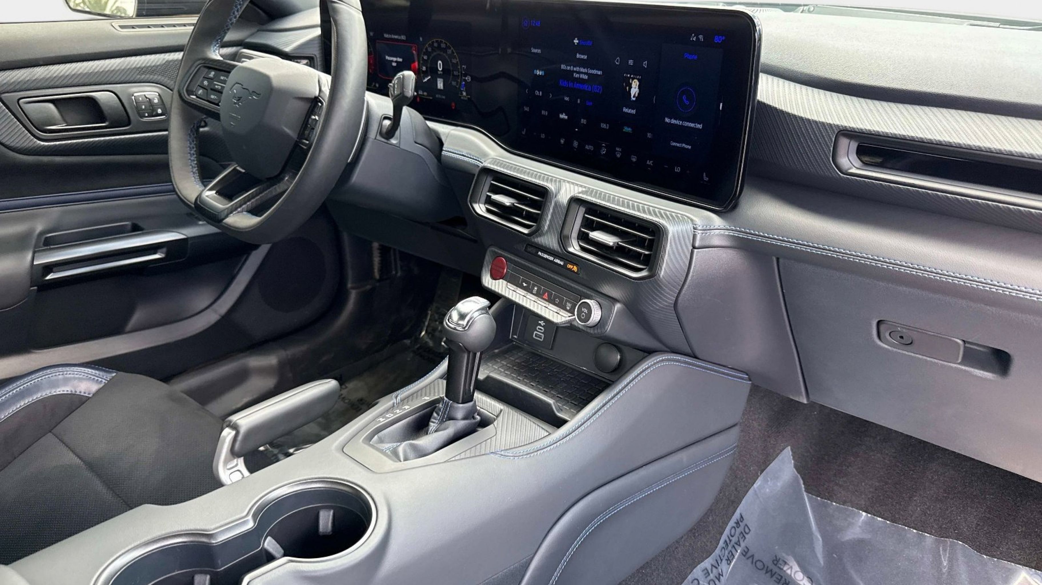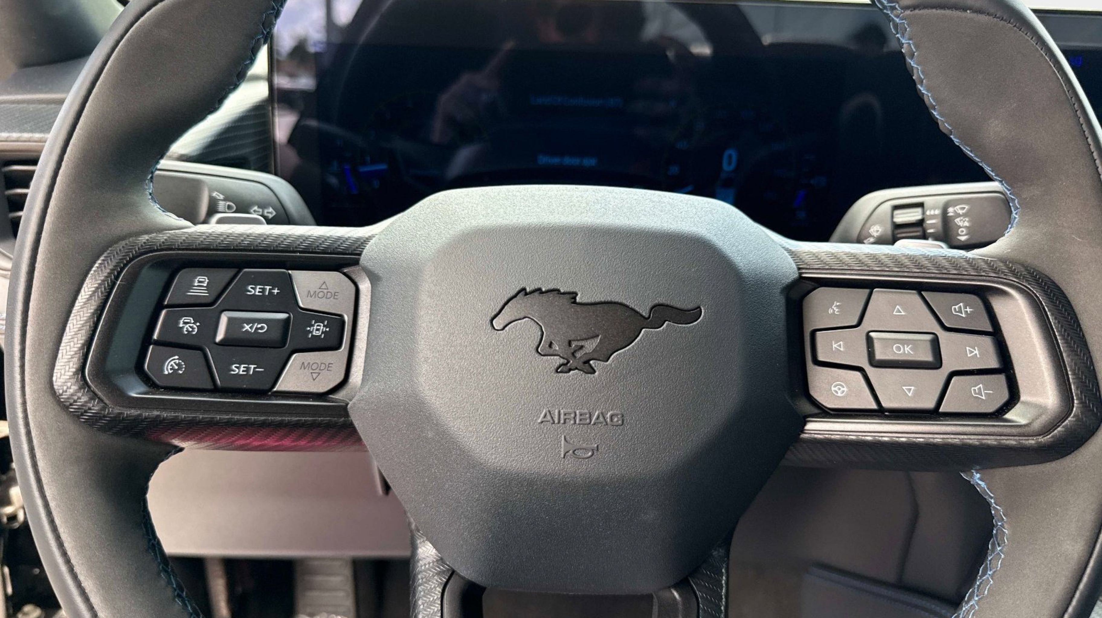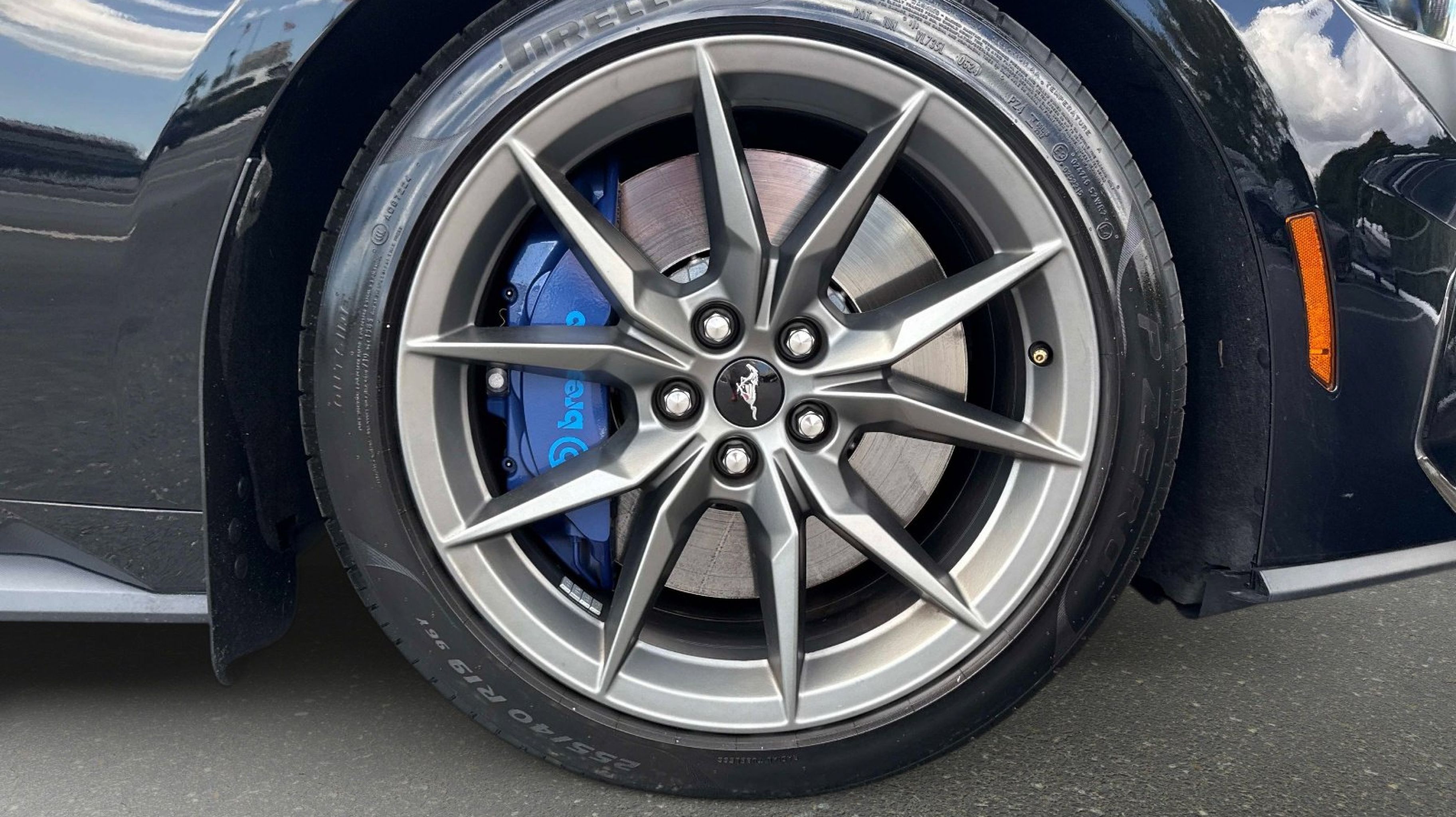12 Speakers, 4-Wheel Disc Brakes, ABS brakes, Active Anti-Theft System, Adaptive Speed Control w/Stop & Go, Adaptive suspension, Air Conditioning, Alloy wheels, Aluminum Foot Pedals, AM/FM radio: SiriusXM with 360L, AM/FM Stereo, Approach Detection, Auto High-beam Headlights, Auto-dimming Rear-View mirror, Automatic temperature control, B&O Sound System by Bang & Olufsen, Brake assist, Bumpers: body-color, Cloth/Vinyl Climate-Controlled Bucket Seats, Cloth/Vinyl Heated Bucket Seats, Compass, Connected Built-In Navigation, Custom Hood & Accent Painted Stripe, Dark Horse Appearance Package, Delay-off headlights, Driver door bin, Driver vanity mirror, Dual front impact airbags, Dual front side impact airbags, Electronic Stability Control, Electronic-Locking Center Console, Emergency communication system: 911 Assist, Equipment Group 700A Deluxe Package, Exterior Parking Camera Rear, Ford Co-Pilot360 Assist+, Four wheel independent suspension, Front anti-roll bar, Front Bucket Seats, Front Center Armrest, Front dual zone A/C, Front reading lights, Fully automatic headlights, HD Radio, Heated REAR seats, Heated steering wheel, Illuminated entry, Knee airbag, Lane-Keeping System w/Lane Keeping Aid, Low tire pressure warning, Memory Driver Seat & Mirrors, Navigation system: Connected Navigation, Notorious Blue Unique Brake Calipers, Occupant sensing airbag, Outside temperature display, Overhead airbag, Overhead console, Painted Black Roof, Panic alarm, Passenger door bin, Passenger vanity mirror, Power door mirrors, Power driver seat, Power passenger seat, Power steering, Power windows, Premium Floor Liners Front & Rear (w/Carpet Mats), Radio data system, Rain sensing wipers, Rear anti-roll bar, Rear Parking Sensors, Rear window defroster, Remote keyless entry, Security Package, SiriusXM w/360L, Speed control, Speed-sensing steering, Speed-Sensitive Wipers, Split folding rear seat, Spoiler, Sport steering wheel, Steering wheel mounted audio controls, SYNC 4.0 QNX, Tachometer, Tarnish Dark High Gloss/Tuxedo Black Hood Stripe, Telescoping steering wheel, Tilt steering wheel, Traction control, Trip computer, Unique Hood Graphic, Universal Garage Door Opener (UGDO), Variably intermittent wipers, Voltmeter, Wheel Locking Kit, Wheels: 19 x 9.5 Fr & 19 x 10 Rr Aluminum.