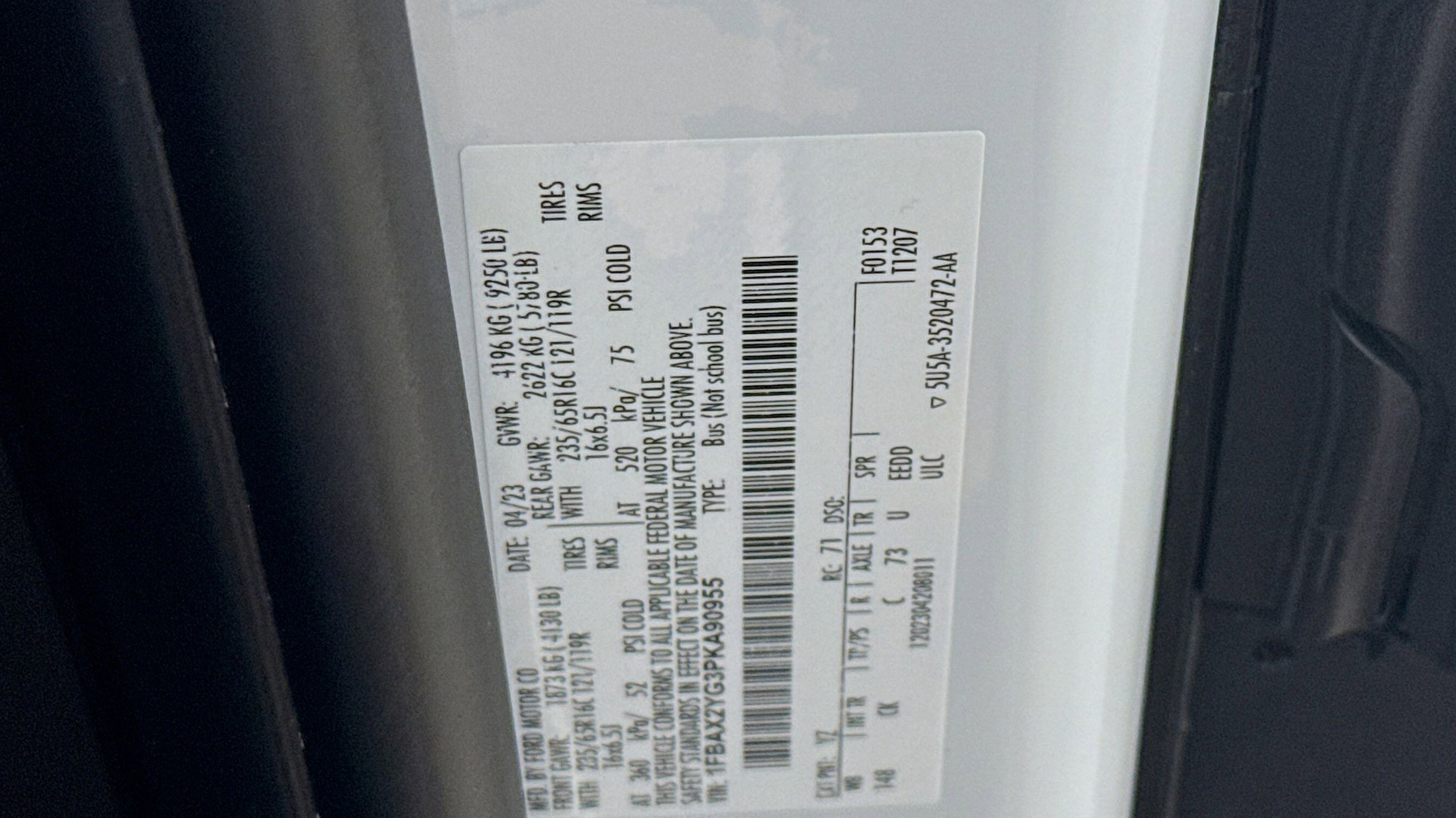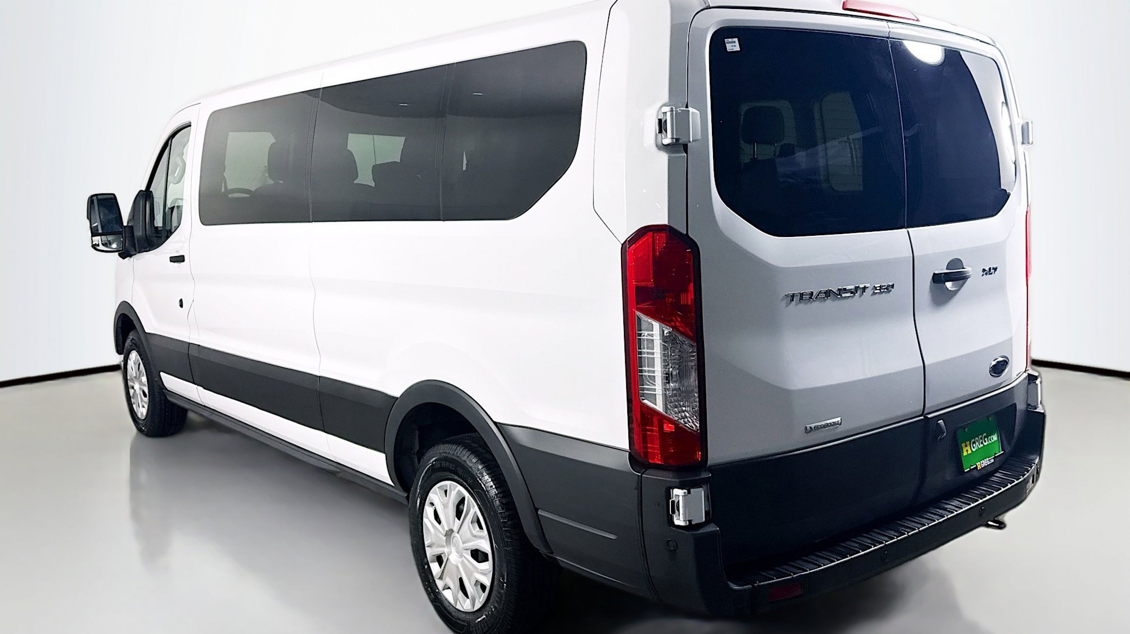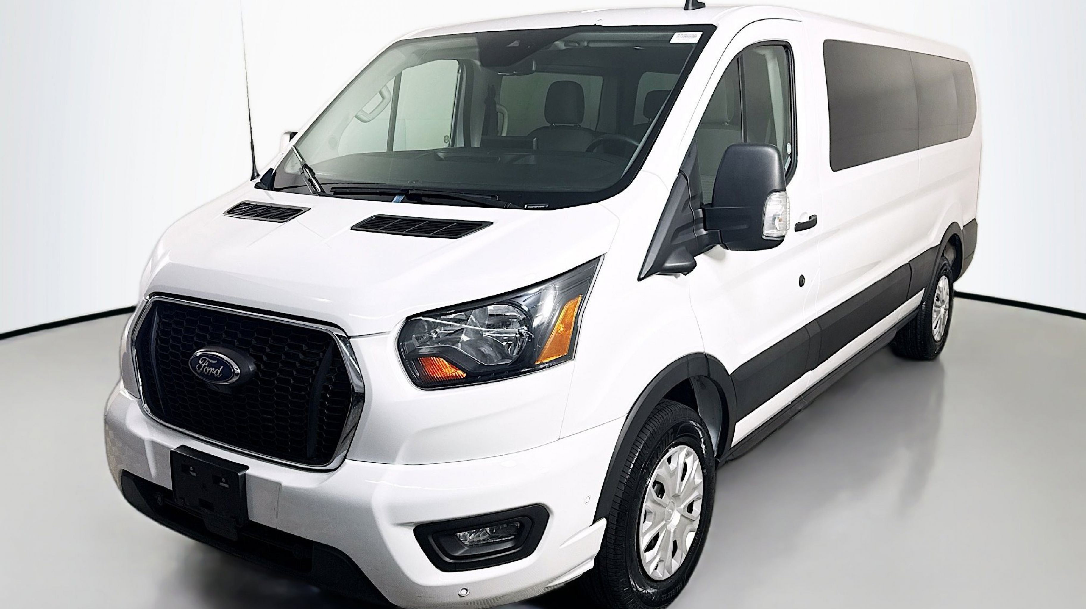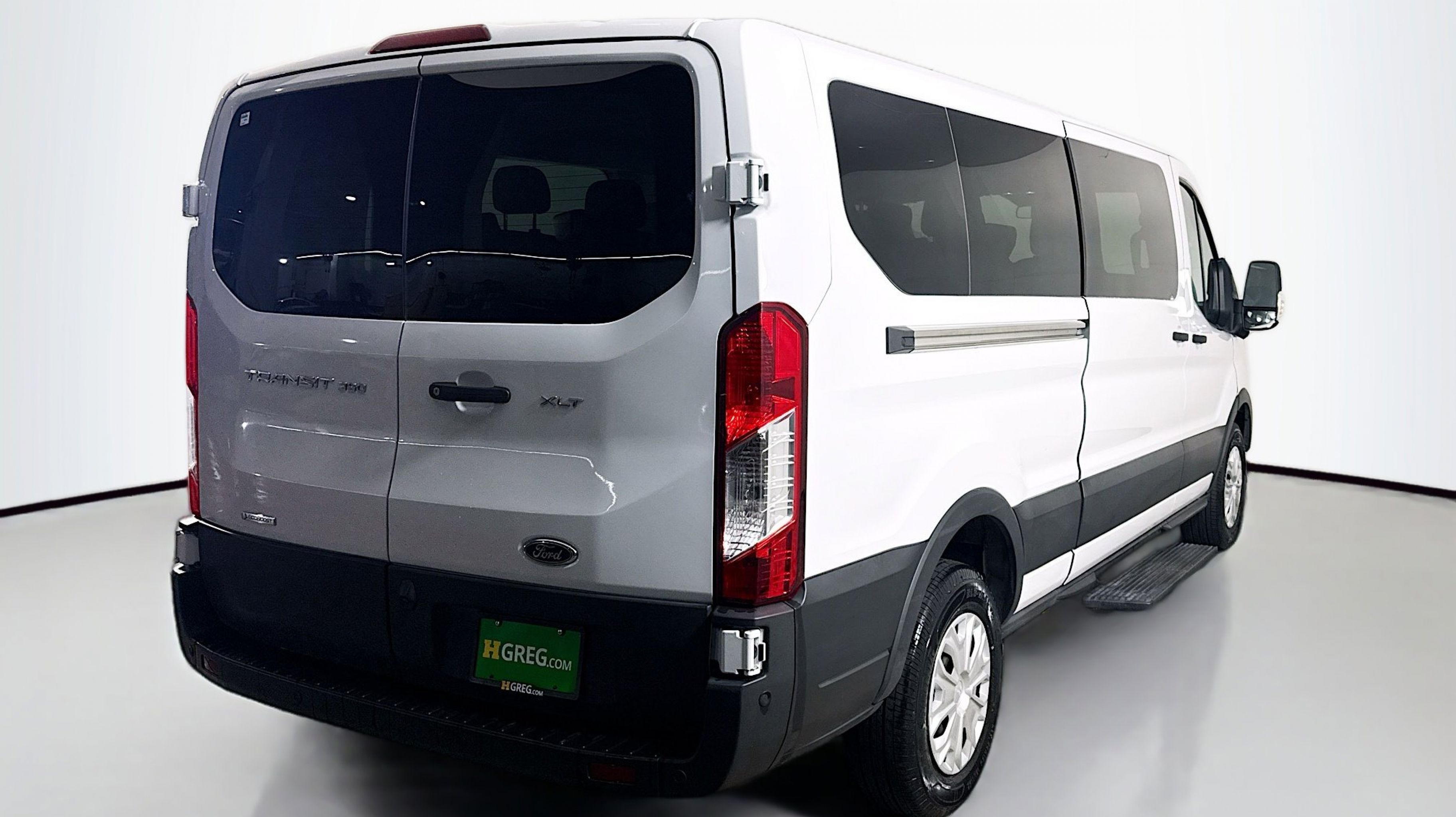 Oxford White 2023 Ford Transit-350 XLT RWD 10-Speed Automatic with Overdrive EcoBoost 3.5L V6 GTDi DOHC 24V Twin Turbocharged 3.73 Axle Ratio, 360-Degree Camera w/Split View, 3rd row seats: split-bench, 4-Wheel Disc Brakes, 4th-Row Bench Seat, 8 Speakers, ABS brakes, Air Conditioning, AM/FM radio, Auto High-beam Headlights, Auto Start-Stop Delete, Brake assist, Cloth Front Bucket Seats, Delay-off headlights, Driver door bin, Driver vanity mirror, Driver's Seat Mounted Armrest, Dual front impact airbags, Dual front side impact airbags, Ebony Cloth Bucket Seats, Electronic Air Temperature Control, Electronic Stability Control, Front anti-roll bar, Front Bucket Seats, Front Fog Lamps, Front License Plate Bracket, Front reading lights, Front Sensing System, Front wheel independent suspension, Fully automatic headlights, Honeycomb Mesh Grille w/Chrome Surround, Illuminated entry, Large Center Console, Low tire pressure warning, Occupant sensing airbag, Overhead airbag, Panic alarm, Passenger door bin, Passenger seat mounted armrest, Passenger vanity mirror, Power door mirrors, Power Running Boards (DISC), Power steering, Power windows, Privacy Glass, Radio: AM/FM Stereo w/SYNC 4 & Nav, Radio: AM/FM Stereo w/SYNC 4/SiriusXM w/360L/Nav, Rain sensing wipers, Rear air conditioning, Rear window defroster, Remote keyless entry, Reverse Sensing System, Side Sensing System, Steering wheel mounted audio controls, Tachometer, Telescoping steering wheel, Tilt steering wheel, Traction control, Variably intermittent wipers, Wheels: 16 Steel w/Full Silver Cover.