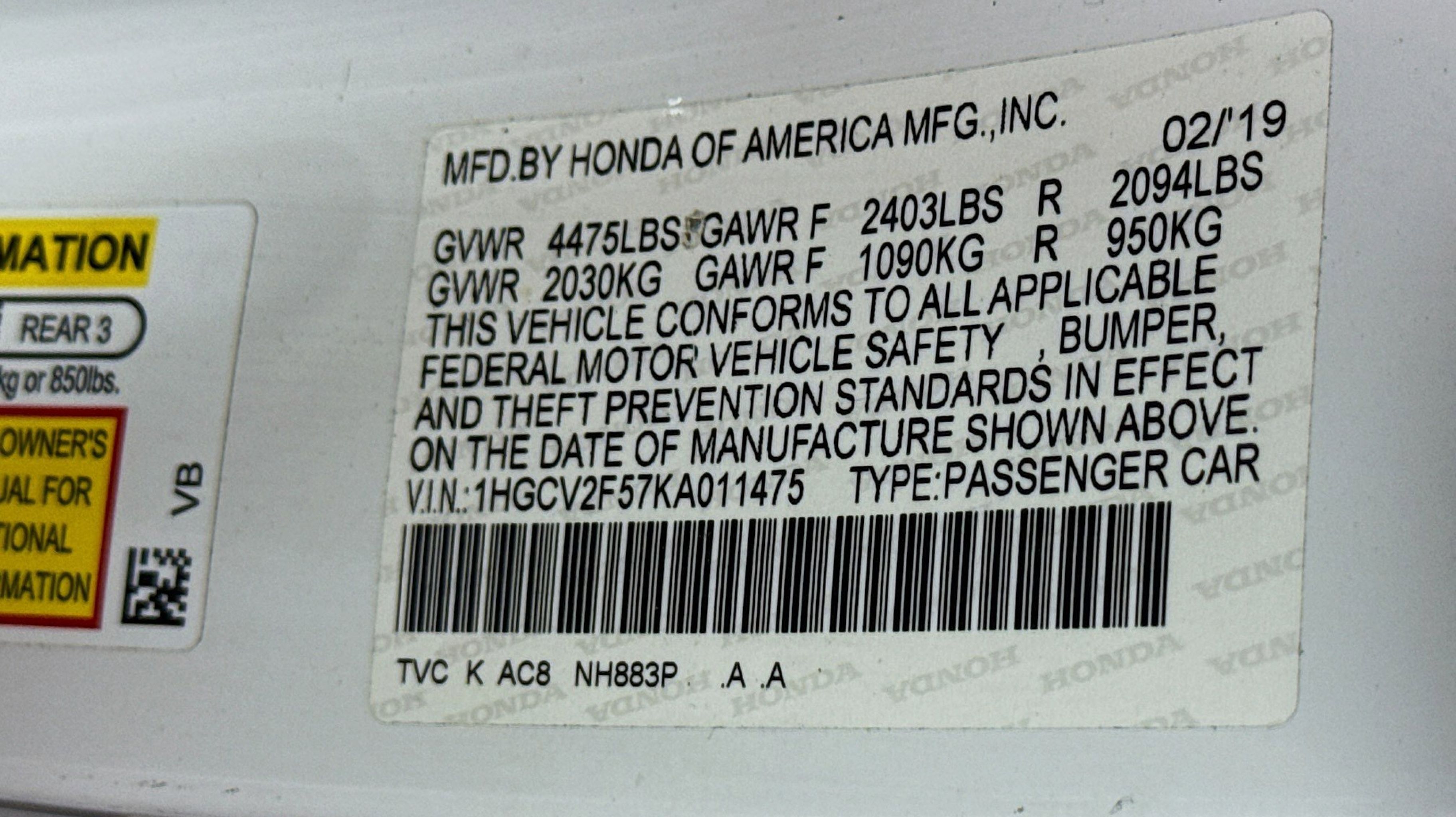 Black w/Leather-Trimmed Seats, 10 Speakers, 17 Machine-Finished Alloy Wheels, 4-Wheel Disc Brakes, ABS brakes, Air Conditioning, Alloy wheels, AM/FM radio: SiriusXM, Apple CarPlay/Android Auto, Auto High-beam Headlights, Auto-dimming Rear-View mirror, Automatic temperature control, Blind Spot Information (BSI) System warning, Brake assist, Bumpers: body-color, Delay-off headlights, Driver door bin, Driver vanity mirror, Dual front impact airbags, Dual front side impact airbags, Electronic Stability Control, Emergency communication system: HondaLink, Exterior Parking Camera Rear, Forward collision: Collision Mitigation Braking System (CMBS) + FCW mitigation, Four wheel independent suspension, Front anti-roll bar, Front Bucket Seats, Front Center Armrest, Front dual zone A/C, Front fog lights, Front reading lights, Fully automatic headlights, Garage door transmitter: HomeLink, Heated door mirrors, Heated Front Bucket Seats, Heated front seats, Illuminated entry, Knee airbag, Leather Shift Knob, Leather steering wheel, Leather-Trimmed Seats, Low tire pressure warning, Memory seat, Occupant sensing airbag, Outside temperature display, Overhead airbag, Overhead console, Panic alarm, Passenger door bin, Passenger vanity mirror, Power door mirrors, Power driver seat, Power moonroof, Power passenger seat, Power steering, Power windows, Radio data system, Radio: 450-Watt AM/FM/HD Premium Audio System, Rear anti-roll bar, Rear seat center armrest, Rear window defroster, Remote keyless entry, Security system, Speed control, Speed-sensing steering, Speed-Sensitive Wipers, Split folding rear seat, Steering wheel mounted audio controls, Tachometer, Telescoping steering wheel, Tilt steering wheel, Traction control, Trip computer, Turn signal indicator mirrors, Variably intermittent wipers, Black w/Leather-Trimmed Seats.