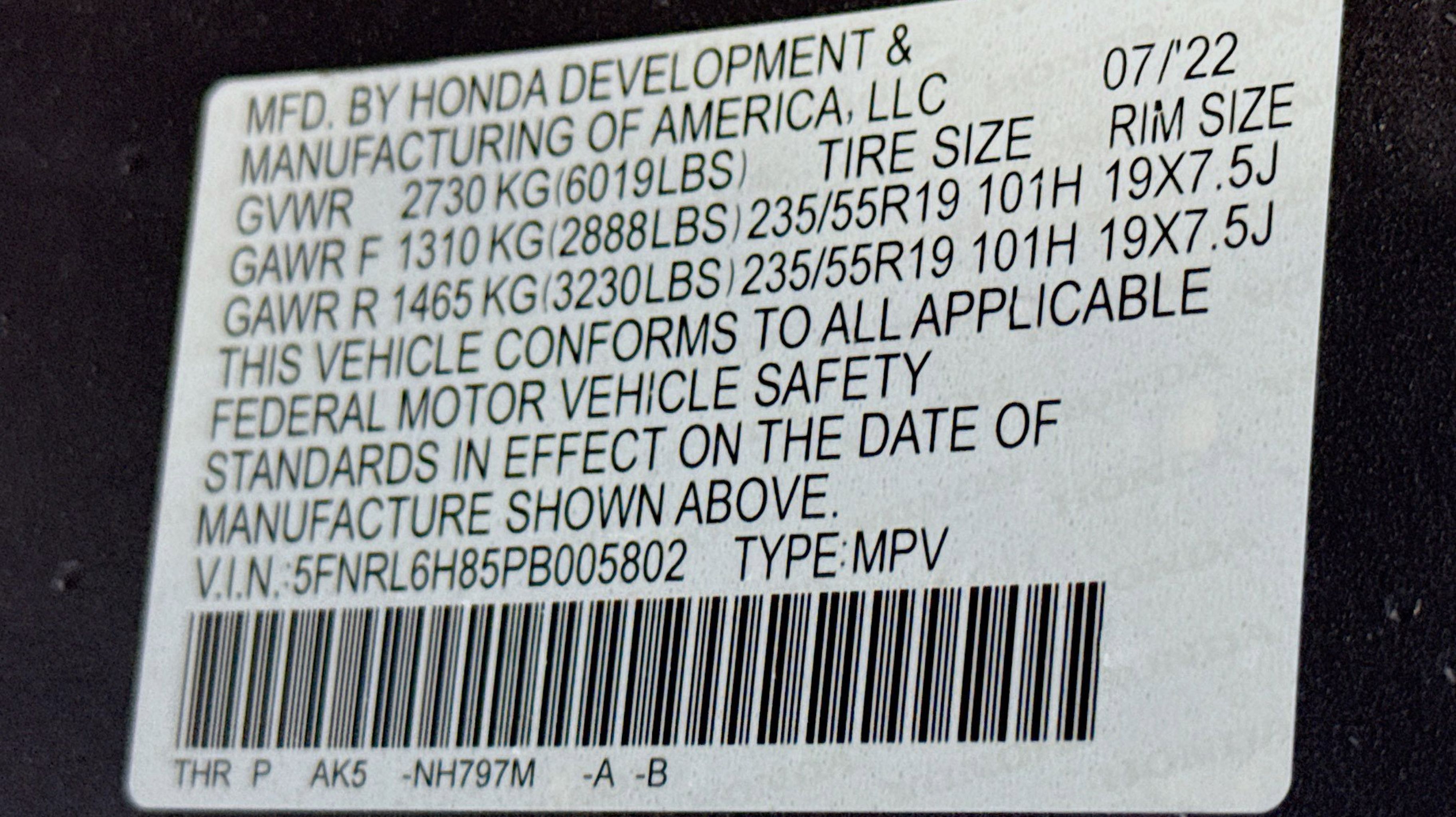CARFAX One-Owner. 3.61 Axle Ratio, 3rd row seats: split-bench, 4-Wheel Disc Brakes, 7 Speakers, A/V remote: CabinControl, ABS brakes, Adaptive Cruise Control: Adaptive Cruise Control (ACC) with Low-Speed Follow, Air Conditioning, Alloy wheels, AM/FM radio: SiriusXM, Anti-whiplash front head restraints, Apple CarPlay/Android Auto, Auto High-beam Headlights, Auto-dimming Rear-View mirror, Automatic temperature control, Blind Spot Information (BSI) System warning, Brake assist, Bumpers: body-color, CD player, Compass, Delay-off headlights, Driver door bin, Driver vanity mirror, Driver's Seat Mounted Armrest, Dual front impact airbags, Dual front side impact airbags, DVD-Audio, Electronic Stability Control, Emergency communication system: HondaLink, Exterior Parking Camera Rear, Four wheel independent suspension, Front anti-roll bar, Front Bucket Seats, Front dual zone A/C, Front fog lights, Front reading lights, Fully automatic headlights, Garage door transmitter: HomeLink, Headphones, Heated door mirrors, Heated Front Bucket Seats, Heated front seats, Illuminated entry, Knee airbag, Lane departure: Lane Keeping Assist System (LKAS) active, Leather Seat Trim, Leather steering wheel, Low tire pressure warning, Memory seat, Navigation system: Honda Satellite-Linked Navigation System, Occupant sensing airbag, Outside temperature display, Overhead airbag, Overhead console, Panic alarm, Passenger door bin, Passenger seat mounted armrest, Passenger vanity mirror, Power door mirrors, Power driver seat, Power Liftgate, Power moonroof, Power passenger seat, Power steering, Power windows, Radio data system, Radio: 160-Watt AM/FM/HD/SiriusXM Audio System, Rear air conditioning, Rear anti-roll bar, Rear audio controls, Rear reading lights, Rear seat center armrest, Rear window defroster, Rear window wiper, Reclining 3rd row seat, Remote keyless entry, Security system, Speed control, Speed-sensing steering, Speed-Sensitive Wipers, Split folding rear seat, Spoiler, Steering wheel mounted audio controls, Tachometer, Telescoping steering wheel, Tilt steering wheel, Traction control, Trip computer, Turn signal indicator mirrors, Variably intermittent wipers, Wheels: 19 Machine-Finished Alloy.