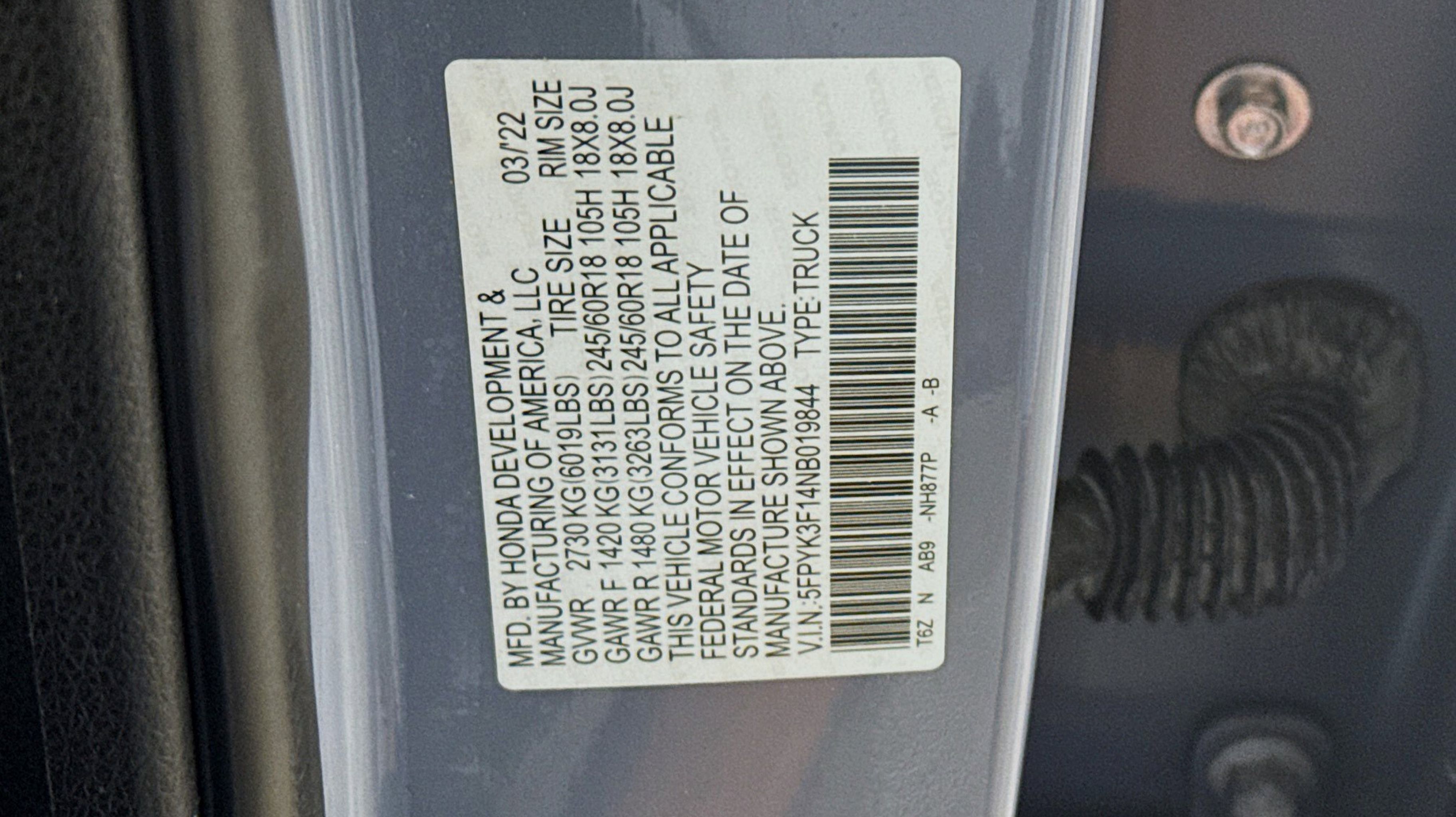 Obsidian Blue Pearl 2022 Honda Ridgeline Sport AWD 9-Speed Automatic 3.5L V6 SOHC i-VTEC 24V Black w/Fabric Seat Trim, 4-Wheel Disc Brakes, 4.33 Axle Ratio, 7 Speakers, ABS brakes, Air Conditioning, Alloy wheels, AM/FM radio, Apple CarPlay/Android Auto, Automatic temperature control, Bluetooth® Hands-Free Link, Brake assist, Bumpers: body-color, Delay-off headlights, Driver door bin, Driver vanity mirror, Driver's Seat Mounted Armrest, Dual front impact airbags, Dual front side impact airbags, Electronic Stability Control, Exterior Parking Camera Rear, Fabric Seat Trim, Forward collision: Collision Mitigation Braking System (CMBS) + FCW mitigation, Four wheel independent suspension, Front anti-roll bar, Front Bucket Seats, Front dual zone A/C, Front fog lights, Front reading lights, Fully automatic headlights, Garage door transmitter: HomeLink, Illuminated entry, Low tire pressure warning, Occupant sensing airbag, Outside temperature display, Overhead airbag, Overhead console, Panic alarm, Passenger door bin, Passenger seat mounted armrest, Passenger vanity mirror, Power door mirrors, Power steering, Power windows, Radio data system, Radio: 215-Watt Audio System w/7 Speakers, Rear air conditioning, Rear anti-roll bar, Rear reading lights, Rear seat center armrest, Rear step bumper, Rear window defroster, Remote keyless entry, Security system, Speed control, Speed-sensing steering, Split folding rear seat, Steering wheel mounted audio controls, Tachometer, Telescoping steering wheel, Tilt steering wheel, Traction control, Trip computer, Variably intermittent wipers, Wheels: 18 Shark Gray Alloy, Black w/Fabric Seat Trim.