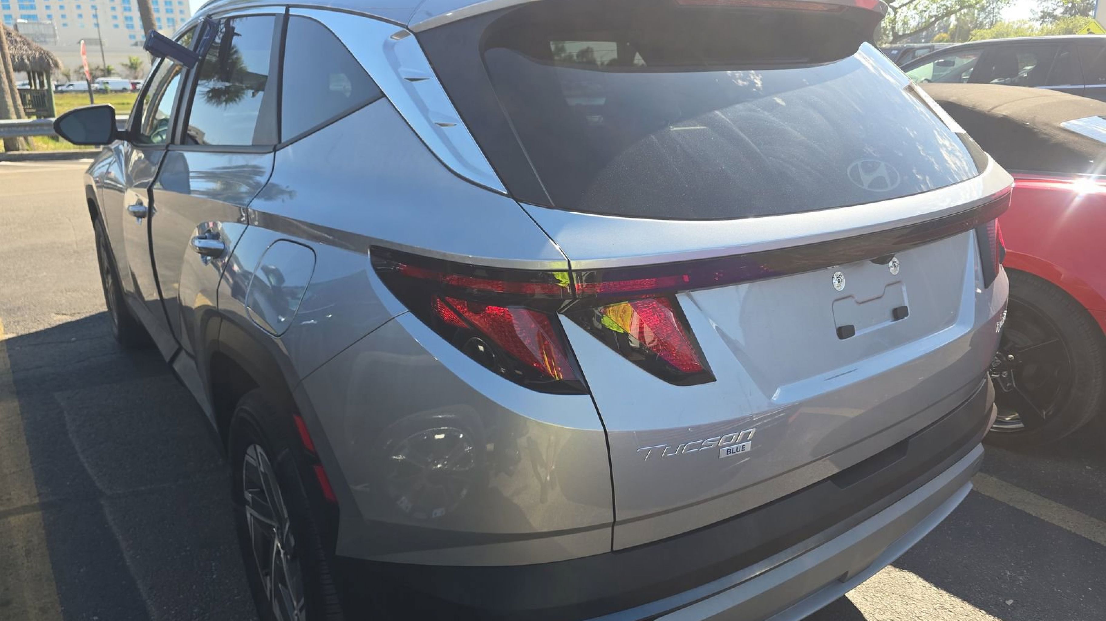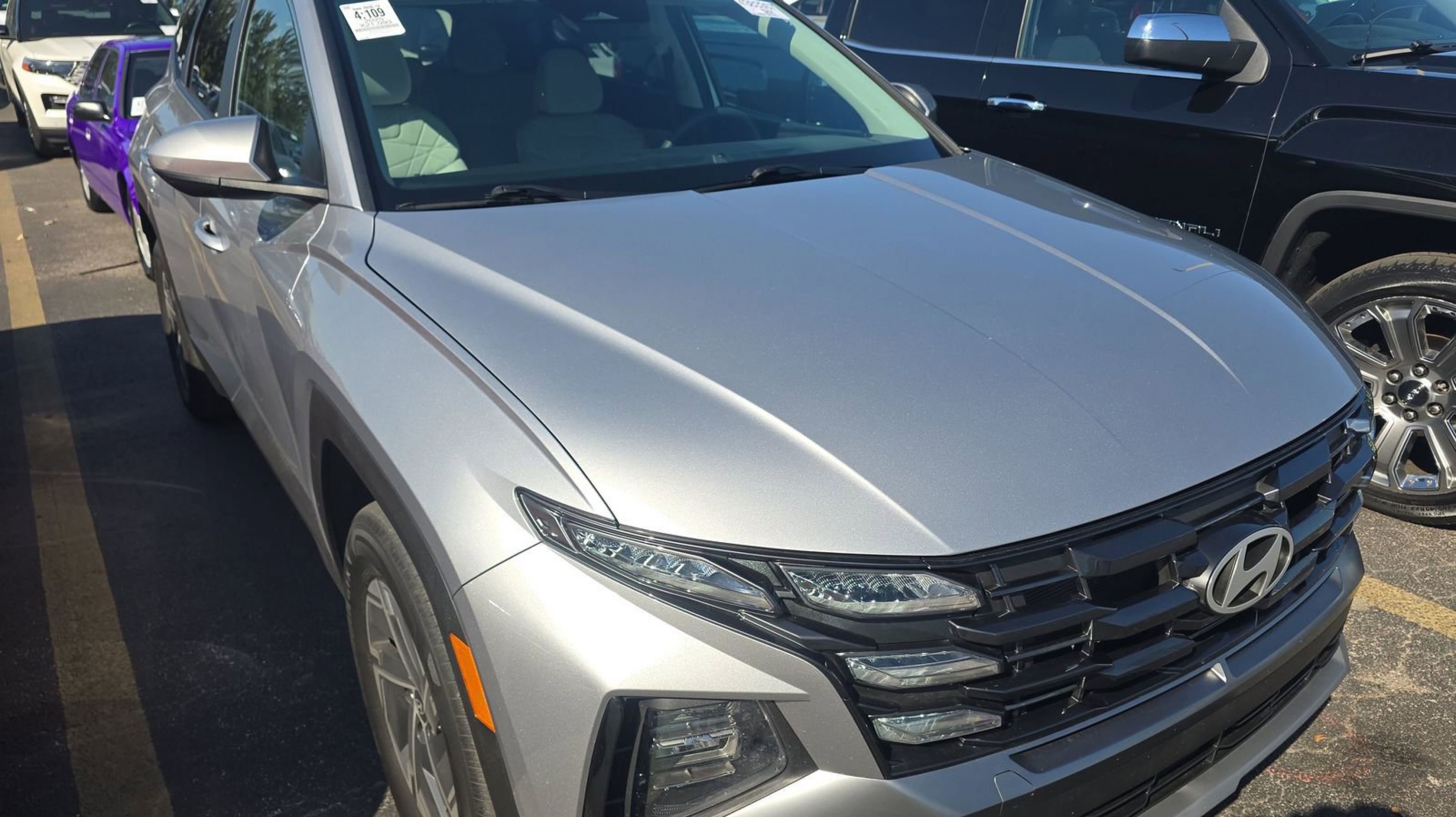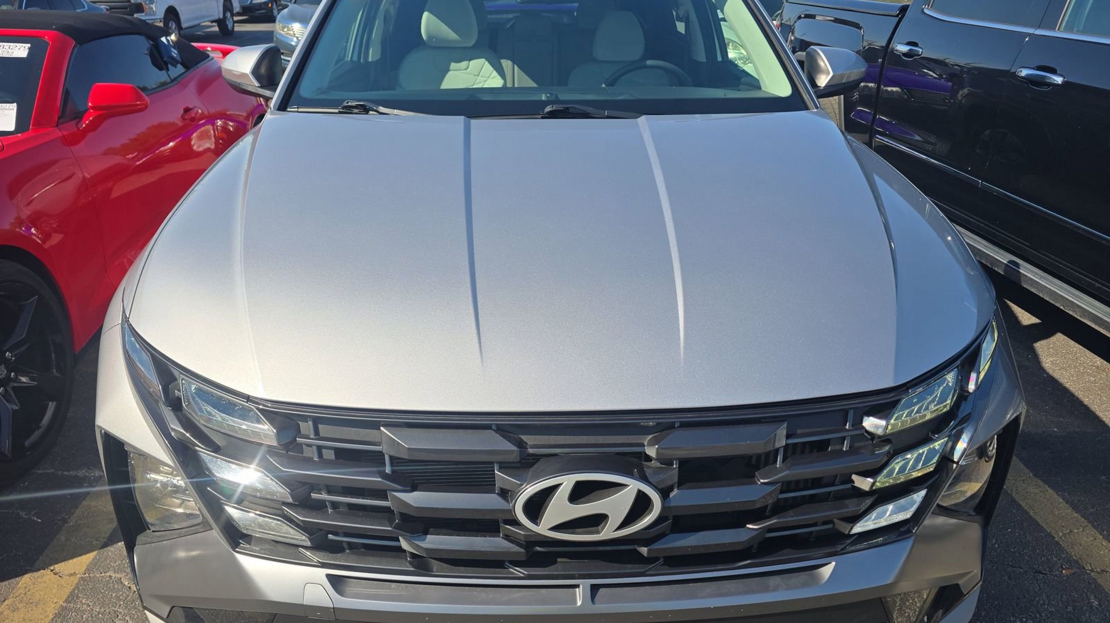 Shimmering Silver 2025 Hyundai Tucson Hybrid Blue AWD 6-Speed Automatic 1.6L I4 DGI Hybrid Turbocharged DOHC 16V LEV3-SULEV30 1.6L I4 DGI Hybrid Turbocharged DOHC 16V LEV3-SULEV30, Option Group 01, 17 Alloy Wheels, 4-Wheel Disc Brakes, 6 Speakers, ABS brakes, Air Conditioning, Alloy wheels, AM/FM radio: SiriusXM, Apple CarPlay & Android Auto, Auto High-beam Headlights, Automatic temperature control, Brake assist, Bumpers: body-color, Delay-off headlights, Driver door bin, Driver vanity mirror, Dual front impact airbags, Dual front side impact airbags, Electronic Stability Control, Emergency communication system: Bluelink+, Four wheel independent suspension, Front anti-roll bar, Front Bucket Seats, Front Center Armrest, Front dual zone A/C, Front reading lights, Fully automatic headlights, Heated door mirrors, Heated Front Bucket Seats, Heated front seats, Illuminated entry, Low tire pressure warning, Occupant sensing airbag, Outside temperature display, Overhead airbag, Overhead console, Panic alarm, Passenger door bin, Passenger vanity mirror, Power door mirrors, Power driver seat, Power Liftgate, Power steering, Power windows, Radio data system, Radio: AM/FM/HD Audio System, Rear anti-roll bar, Rear reading lights, Rear seat center armrest, Rear side impact airbag, Rear window defroster, Rear window wiper, Remote keyless entry, Security system, Speed control, Split folding rear seat, Spoiler, Stain & Odor Resistant Cloth Seat Trim, Steering wheel mounted audio controls, Tachometer, Telescoping steering wheel, Tilt steering wheel, Traction control, Trip computer, Variably intermittent wipers, 1.6L I4 DGI Hybrid Turbocharged DOHC 16V LEV3-SULEV30, Option Group 01.
