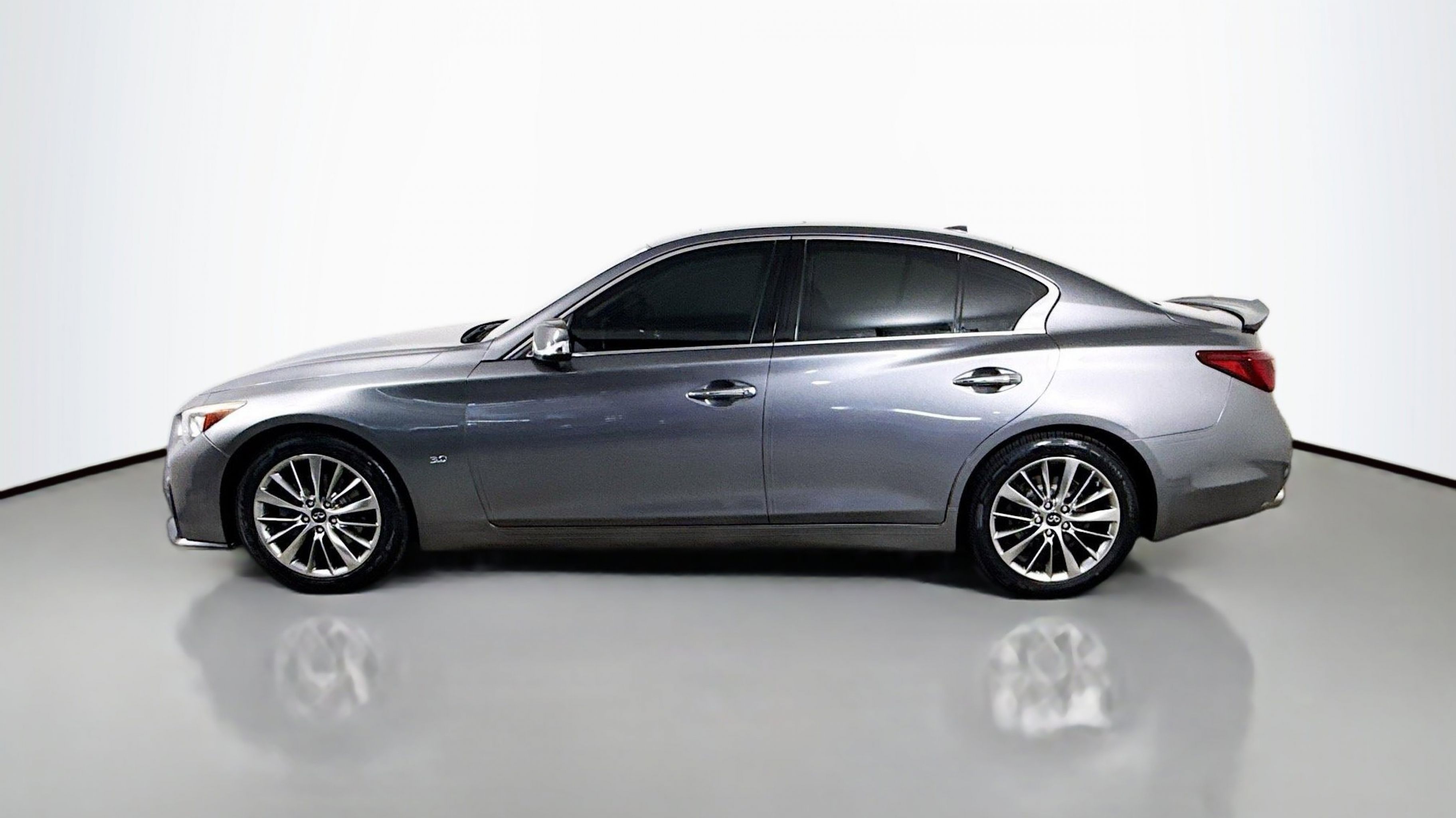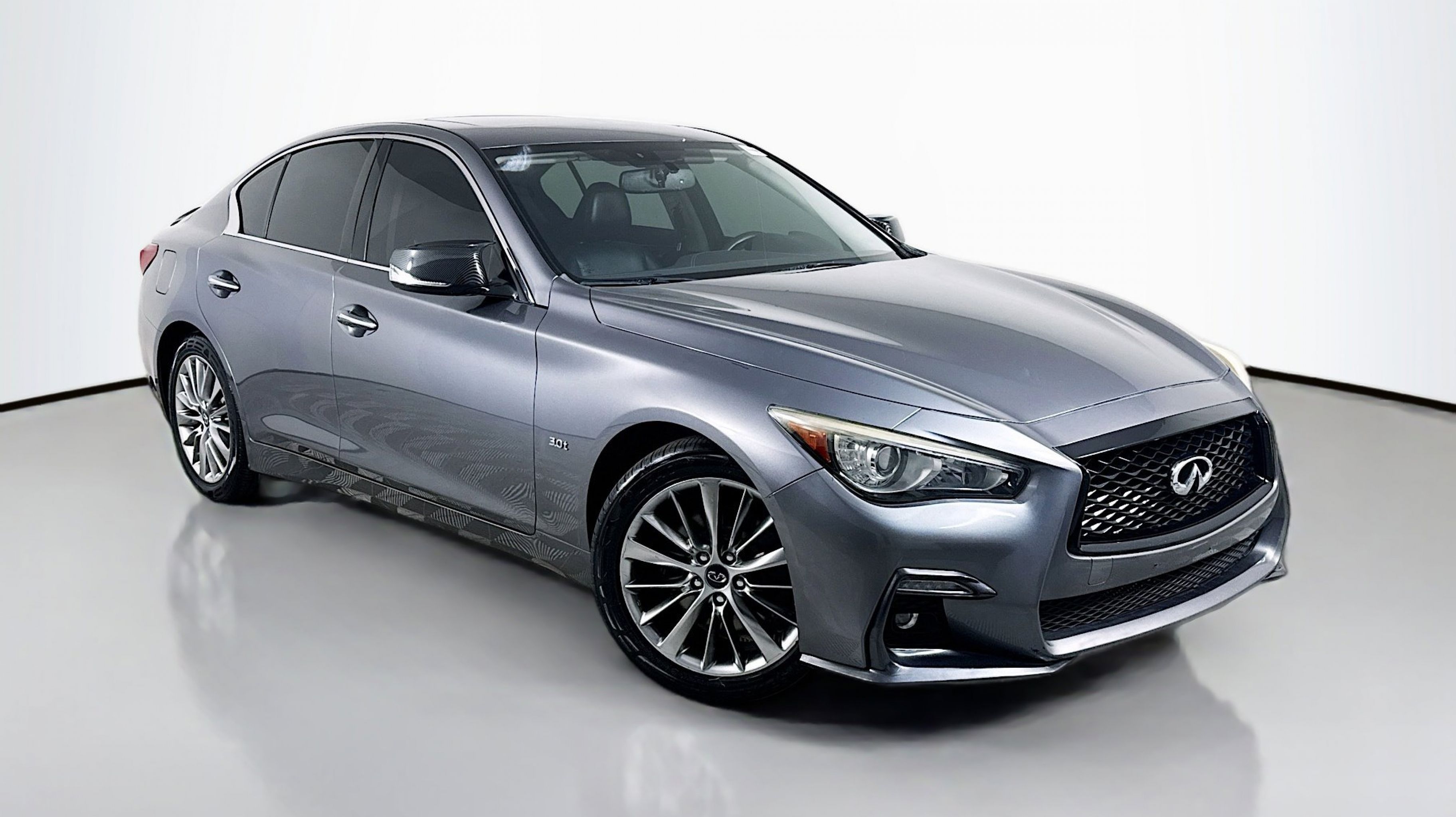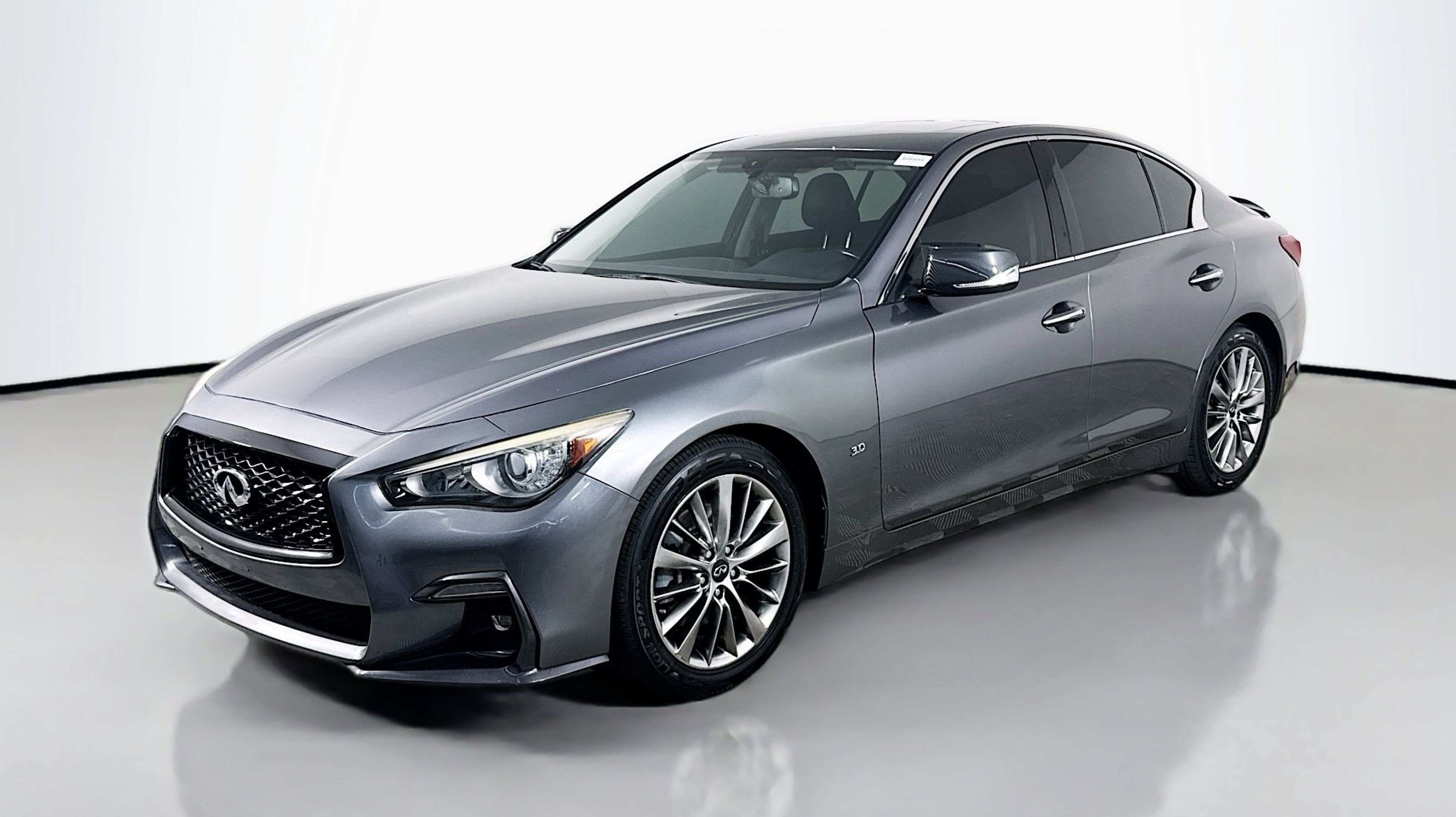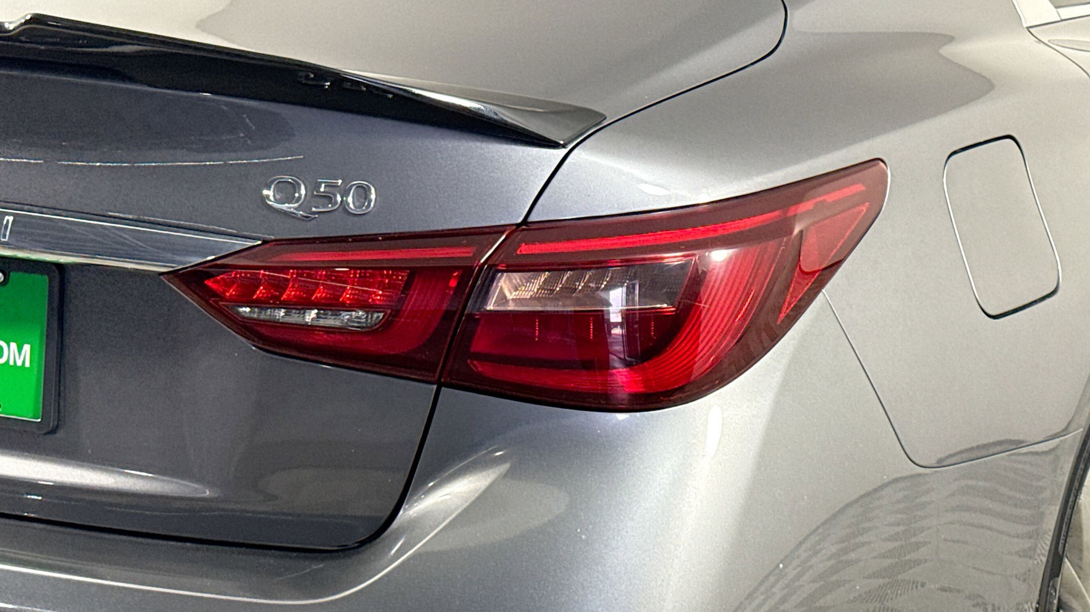 Graphite Shadow 2018 INFINITI Q50 3.0t LUXE RWD 7-Speed Automatic with Manual Shift 3.0L V6 18 x 7.5 Aluminum Alloy Wheels, 4-Wheel Disc Brakes, 6 Speakers, ABS brakes, Air Conditioning, Alloy wheels, AM/FM radio: SiriusXM, Anti-whiplash front head restraints, Auto-dimming Rear-View mirror, Automatic temperature control, Brake assist, Bumpers: body-color, CD player, Compass, Delay-off headlights, Driver door bin, Driver vanity mirror, Dual front impact airbags, Dual front side impact airbags, Electronic Stability Control, Four wheel independent suspension, Front anti-roll bar, Front Bucket Seats, Front Center Armrest, Front dual zone A/C, Front fog lights, Front reading lights, Fully automatic headlights, Garage door transmitter: HomeLink, Genuine wood console insert, Genuine wood dashboard insert, Genuine wood door panel insert, Heated door mirrors, Illuminated entry, Leather Shift Knob, Leather steering wheel, Leatherette Seating Surfaces, Low tire pressure warning, Occupant sensing airbag, Outside temperature display, Overhead airbag, Overhead console, Panic alarm, PANORAMA SUNROOF, Passenger door bin, Passenger vanity mirror, Power door mirrors, Power driver seat, Power passenger seat, Power steering, Power windows, Radio data system, Radio: AM/FM/CD w/MP3 Playback Capability, Rain sensing wipers, Rear anti-roll bar, Rear reading lights, Rear seat center armrest, Rear window defroster, Remote keyless entry, Security system, Speed control, Speed-sensing steering, Speed-Sensitive Wipers, Steering wheel mounted audio controls, Tachometer, Telescoping steering wheel, Tilt steering wheel, Traction control, Trip computer, Turn signal indicator mirrors, Variably intermittent wipers.