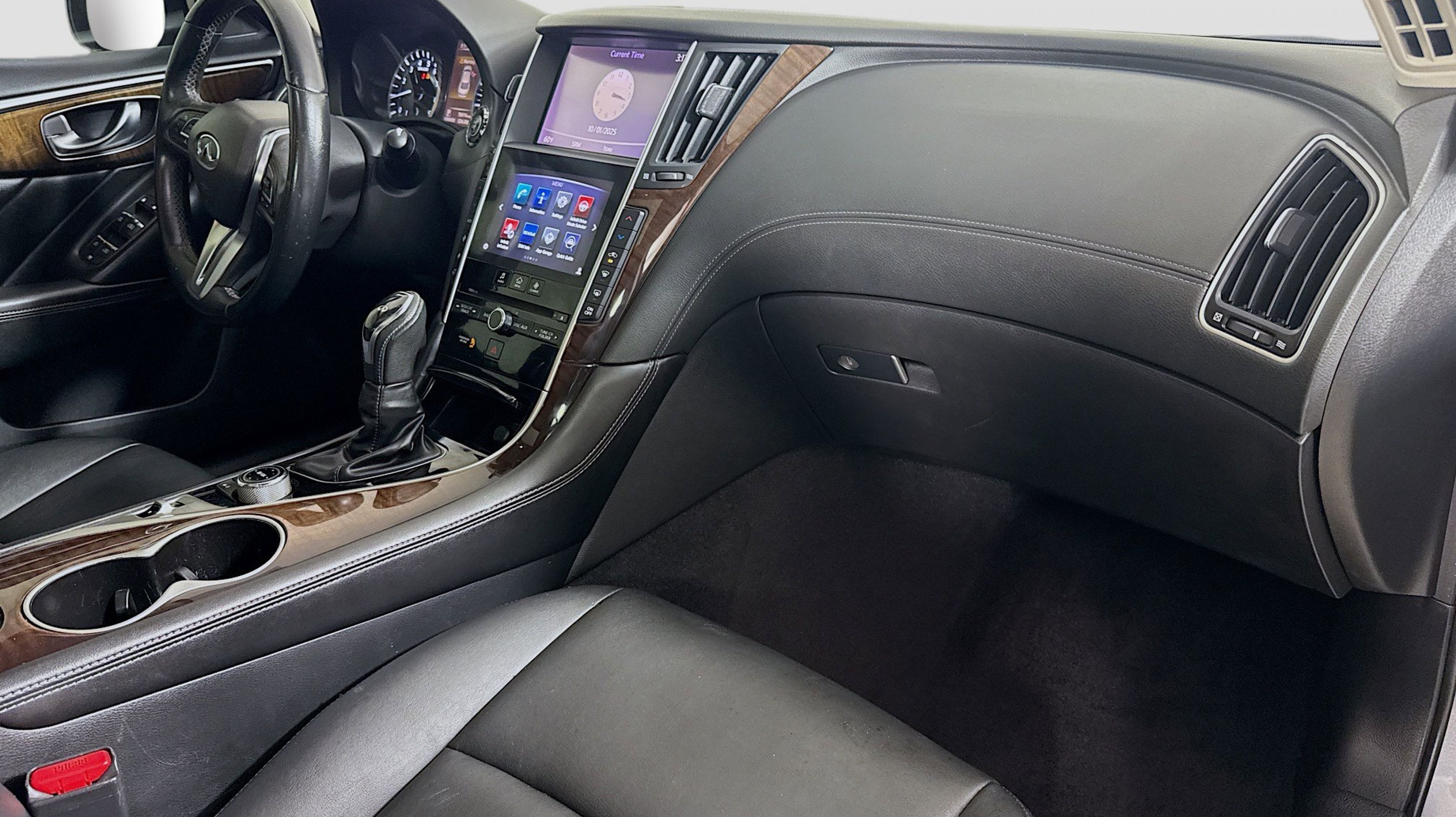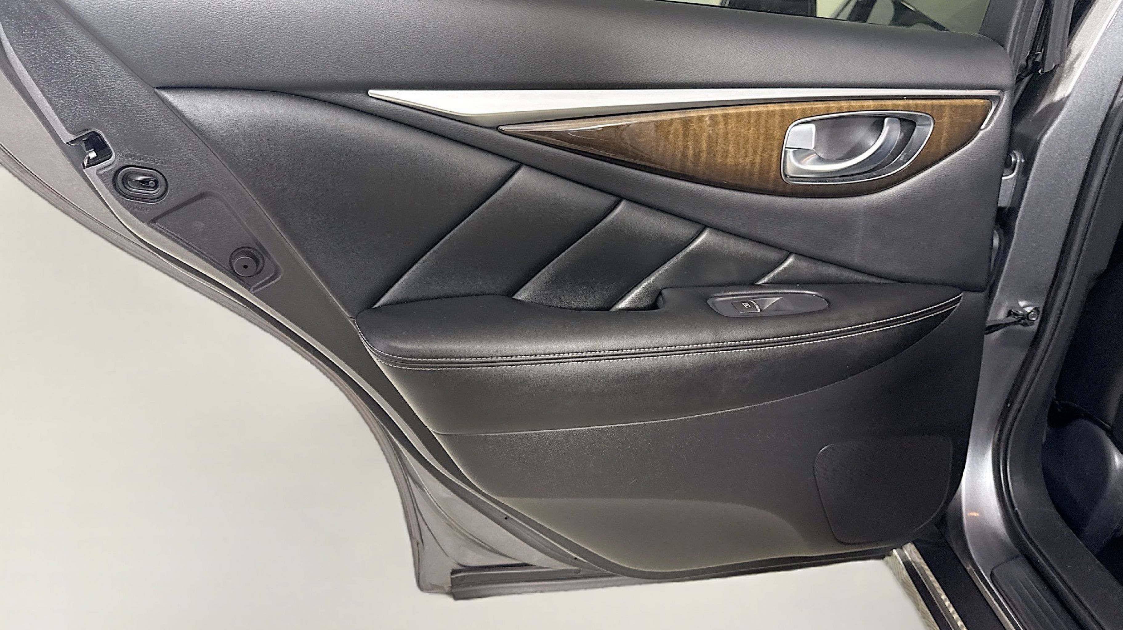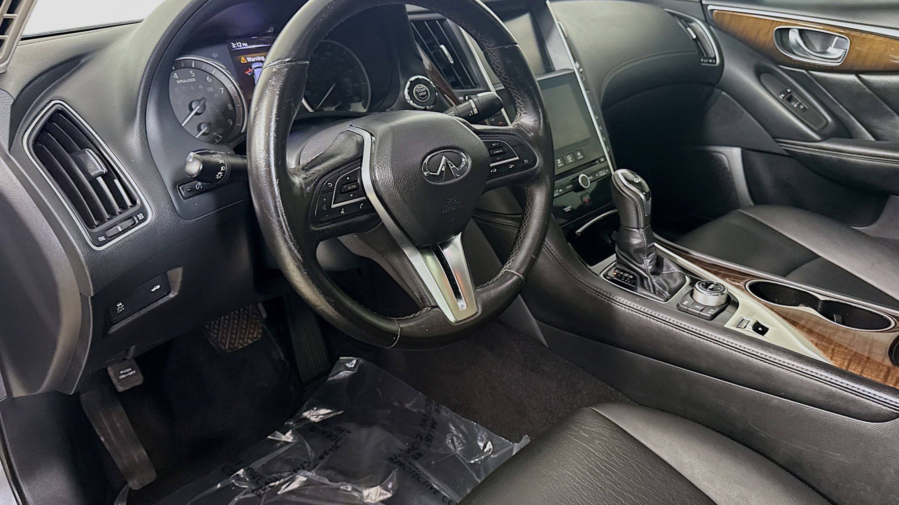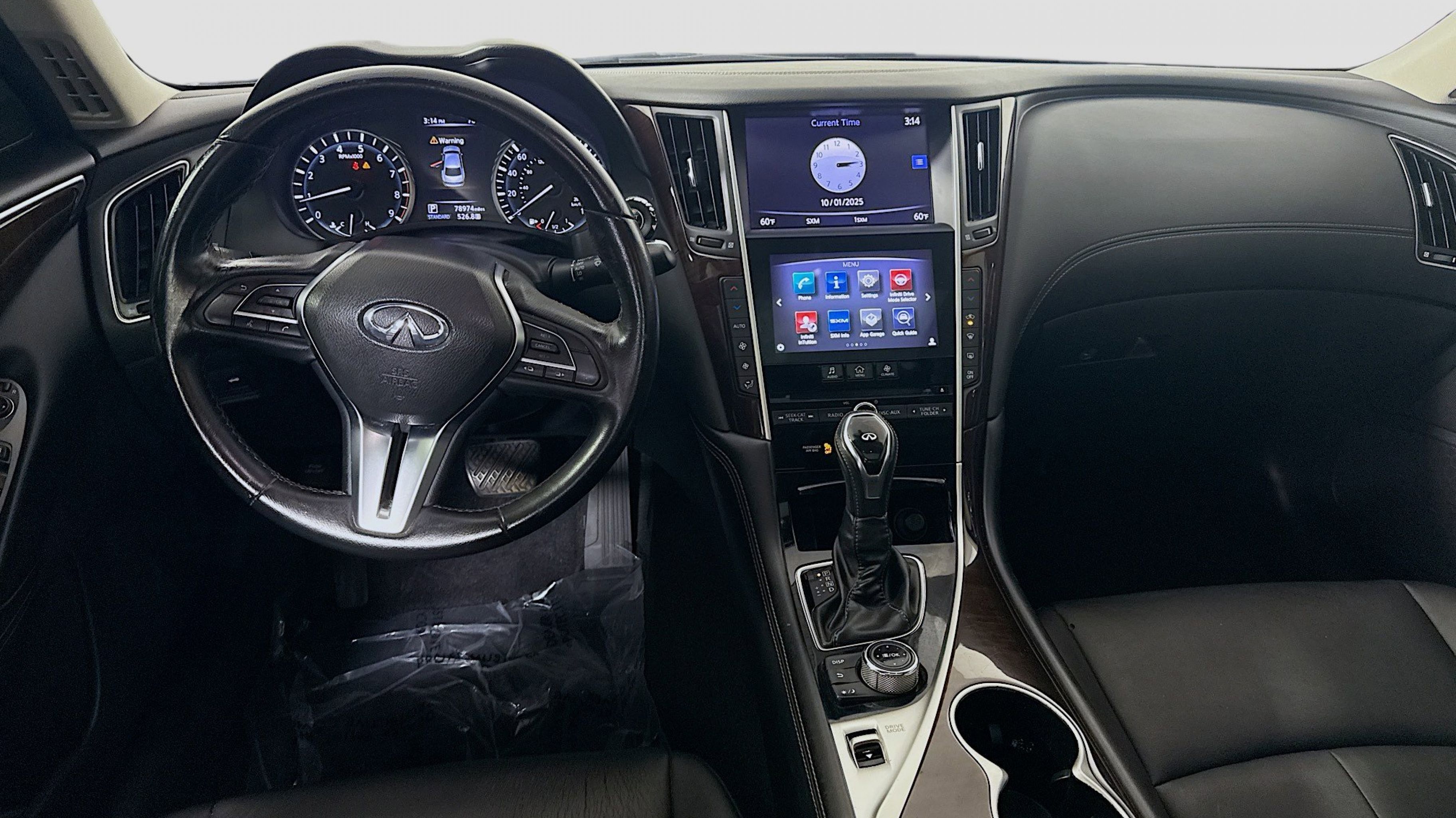 Graphite Shadow 2018 INFINITI Q50 3.0t LUXE RWD 7-Speed Automatic with Manual Shift 3.0L V6 18 x 7.5 Aluminum Alloy Wheels, 4-Wheel Disc Brakes, 6 Speakers, ABS brakes, Air Conditioning, Alloy wheels, AM/FM radio: SiriusXM, Anti-whiplash front head restraints, Auto-dimming Rear-View mirror, Automatic temperature control, Brake assist, Bumpers: body-color, CD player, Compass, Delay-off headlights, Driver door bin, Driver vanity mirror, Dual front impact airbags, Dual front side impact airbags, Electronic Stability Control, Four wheel independent suspension, Front anti-roll bar, Front Bucket Seats, Front Center Armrest, Front dual zone A/C, Front fog lights, Front reading lights, Fully automatic headlights, Garage door transmitter: HomeLink, Genuine wood console insert, Genuine wood dashboard insert, Genuine wood door panel insert, Heated door mirrors, Illuminated entry, Leather Shift Knob, Leather steering wheel, Leatherette Seating Surfaces, Low tire pressure warning, Occupant sensing airbag, Outside temperature display, Overhead airbag, Overhead console, Panic alarm, PANORAMA SUNROOF, Passenger door bin, Passenger vanity mirror, Power door mirrors, Power driver seat, Power passenger seat, Power steering, Power windows, Radio data system, Radio: AM/FM/CD w/MP3 Playback Capability, Rain sensing wipers, Rear anti-roll bar, Rear reading lights, Rear seat center armrest, Rear window defroster, Remote keyless entry, Security system, Speed control, Speed-sensing steering, Speed-Sensitive Wipers, Steering wheel mounted audio controls, Tachometer, Telescoping steering wheel, Tilt steering wheel, Traction control, Trip computer, Turn signal indicator mirrors, Variably intermittent wipers.