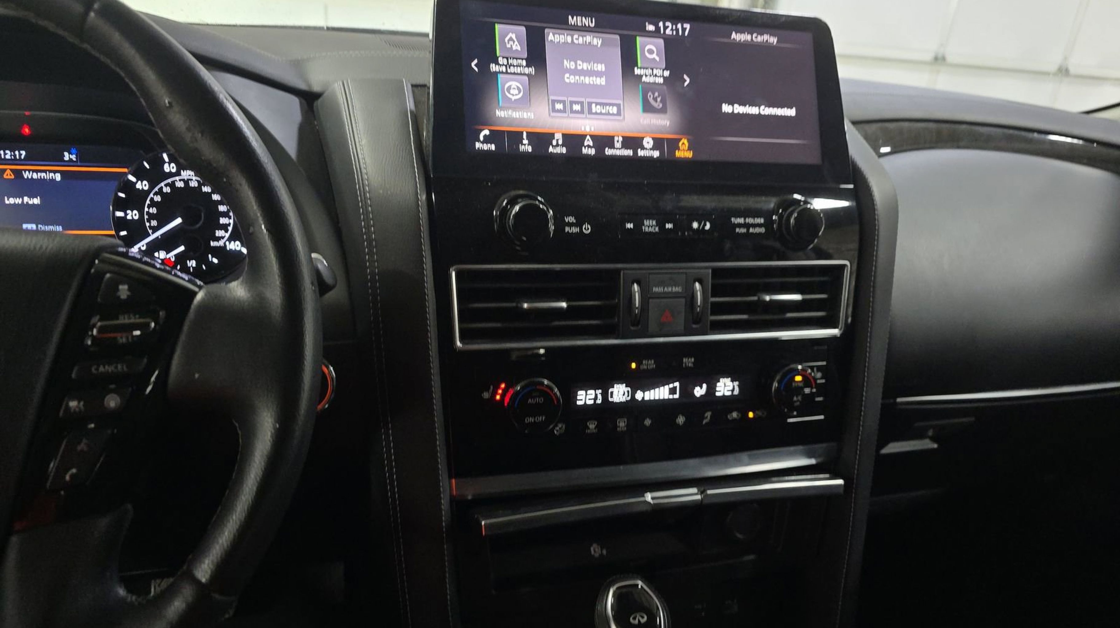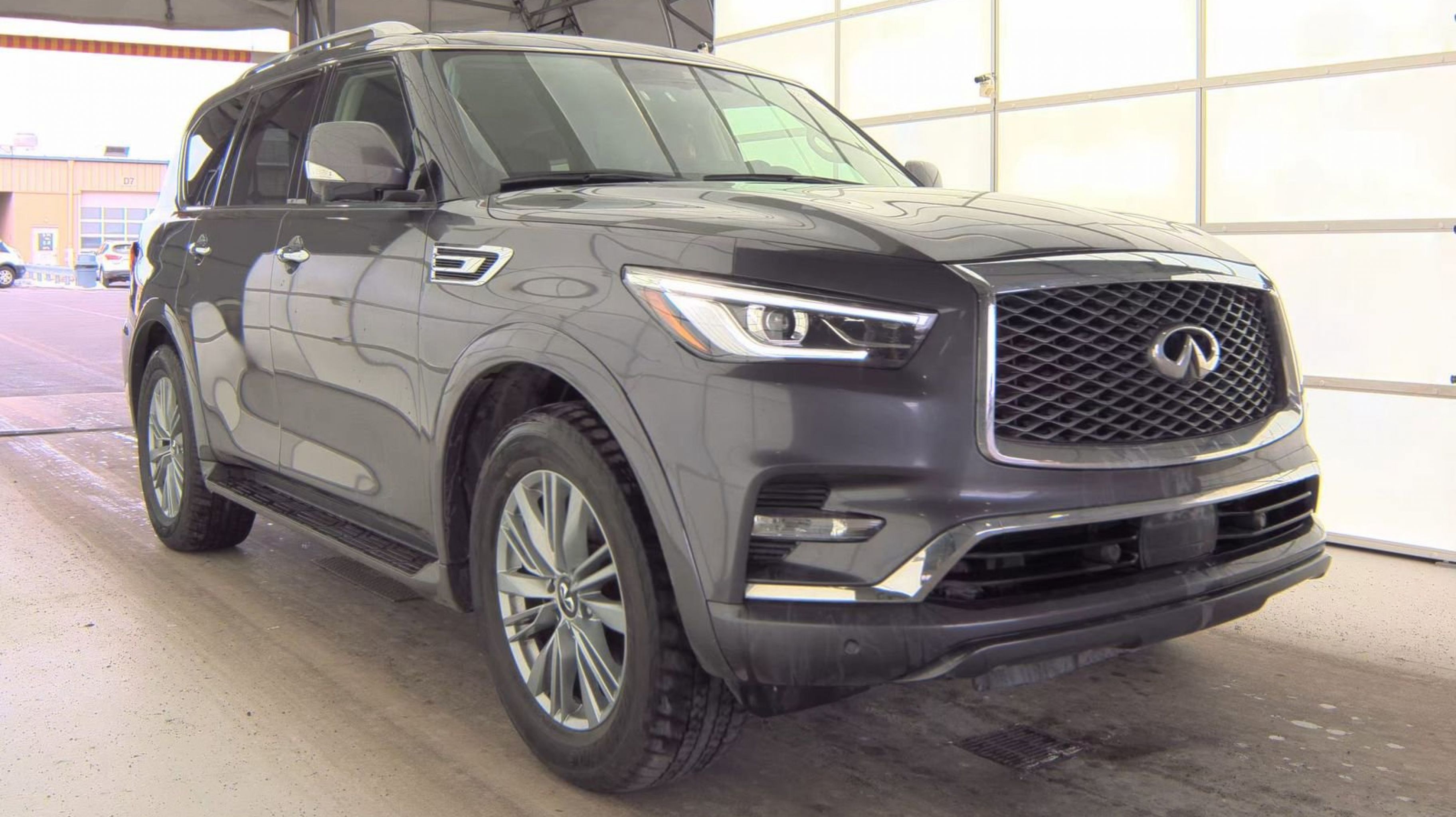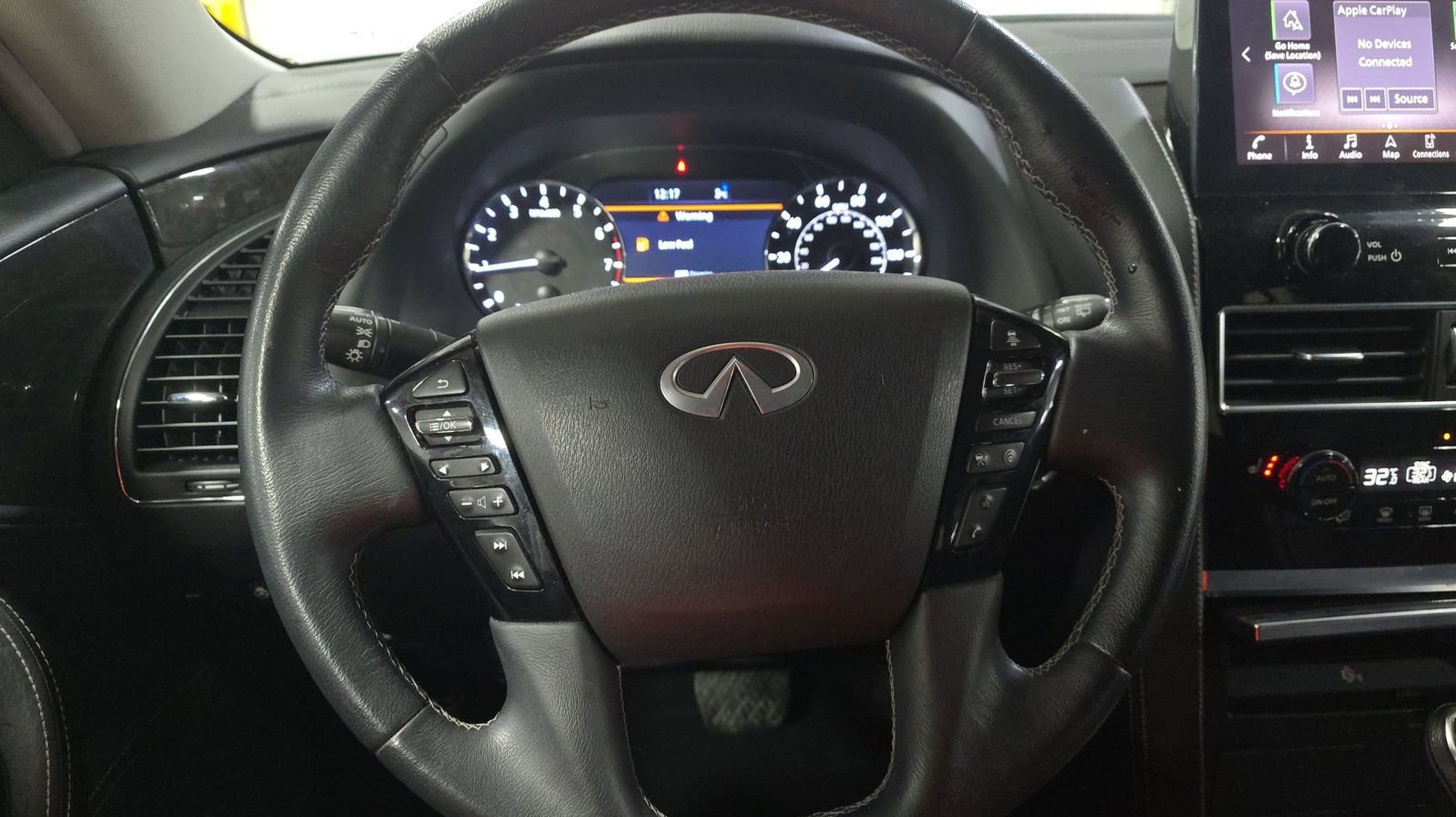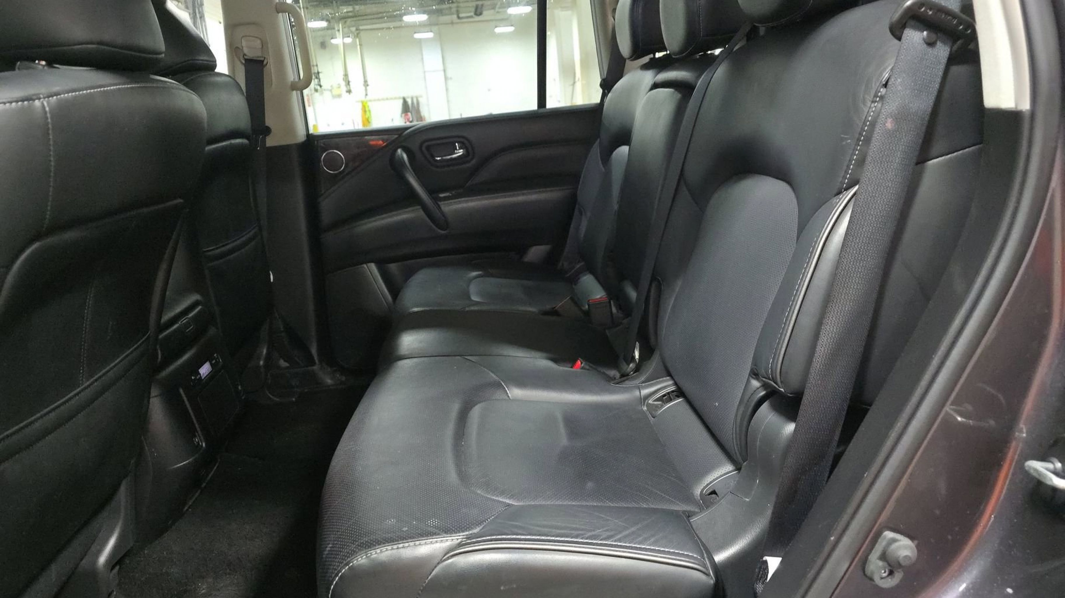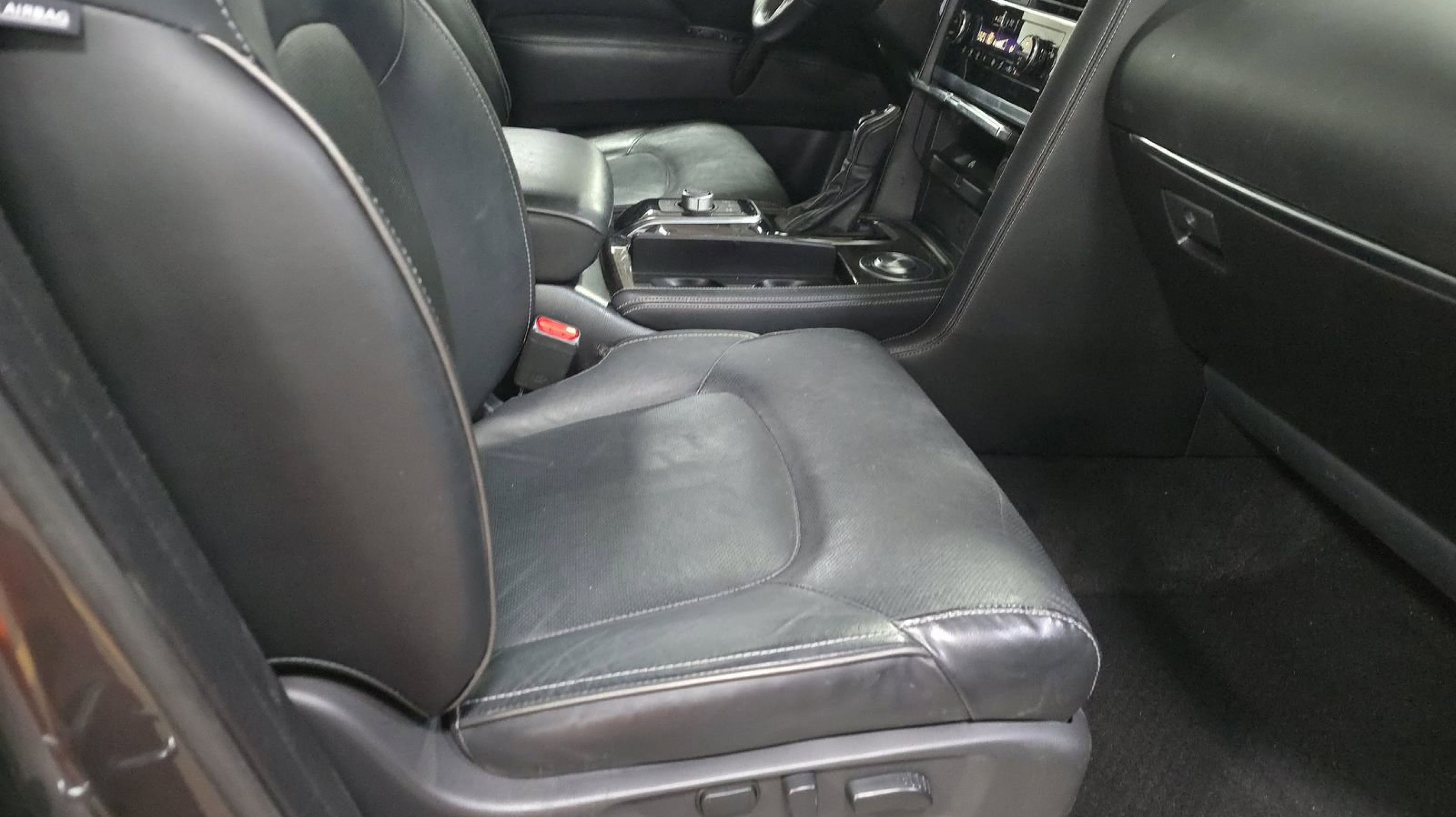 CARFAX One-Owner. Split Bench Seat Package, 13 Speakers, 2.937 Axle Ratio, 20 Aluminum Alloy Wheels, 3rd row seats: bench, 4-Wheel Disc Brakes, ABS brakes, Air Conditioning, Alloy wheels, AM/FM radio: SiriusXM, Anti-whiplash front head restraints, Apple CarPlay/Android Auto, Auto High-beam Headlights, Auto tilt-away steering wheel, Auto-dimming door mirrors, Auto-dimming Rear-View mirror, Auto-leveling suspension, Automatic temperature control, Brake assist, Bumpers: body-color, Compass, Delay-off headlights, Driver door bin, Driver vanity mirror, Dual front impact airbags, Dual front side impact airbags, Electronic Stability Control, Emergency communication system: INFINITI InTouch, Four wheel independent suspension, Front anti-roll bar, Front Bucket Seats, Front Center Armrest, Front dual zone A/C, Front fog lights, Front reading lights, Fully automatic headlights, Garage door transmitter: HomeLink, Heated door mirrors, Heated Front Bucket Seats, Heated front seats, Heated steering wheel, Illuminated entry, Leather Shift Knob, Leather steering wheel, Leather-Appointed Seats, Literature Kit, Low tire pressure warning, Memory seat, Navigation system: INFINITI InTouch Navigation, Occupant sensing airbag, Outside temperature display, Overhead airbag, Overhead console, Panic alarm, Passenger door bin, Passenger vanity mirror, Power door mirrors, Power driver seat, Power Liftgate, Power moonroof, Power passenger seat, Power steering, Power windows, Radio data system, Radio: Bose Premium Audio System w/13 Speakers, Rain sensing wipers, Rear air conditioning, Rear anti-roll bar, Rear reading lights, Rear seat center armrest, Rear window defroster, Rear window wiper, Reclining 3rd row seat, Remote keyless entry, Security system, Speed control, Speed-sensing steering, Split folding rear seat, Spoiler, Steering wheel memory, Steering wheel mounted audio controls, Tachometer, Telescoping steering wheel, Tilt steering wheel, Traction control, Trip computer, Turn signal indicator mirrors, Variably intermittent wipers, Voltmeter, Split Bench Seat Package. Odometer is 3043 miles below market average!
