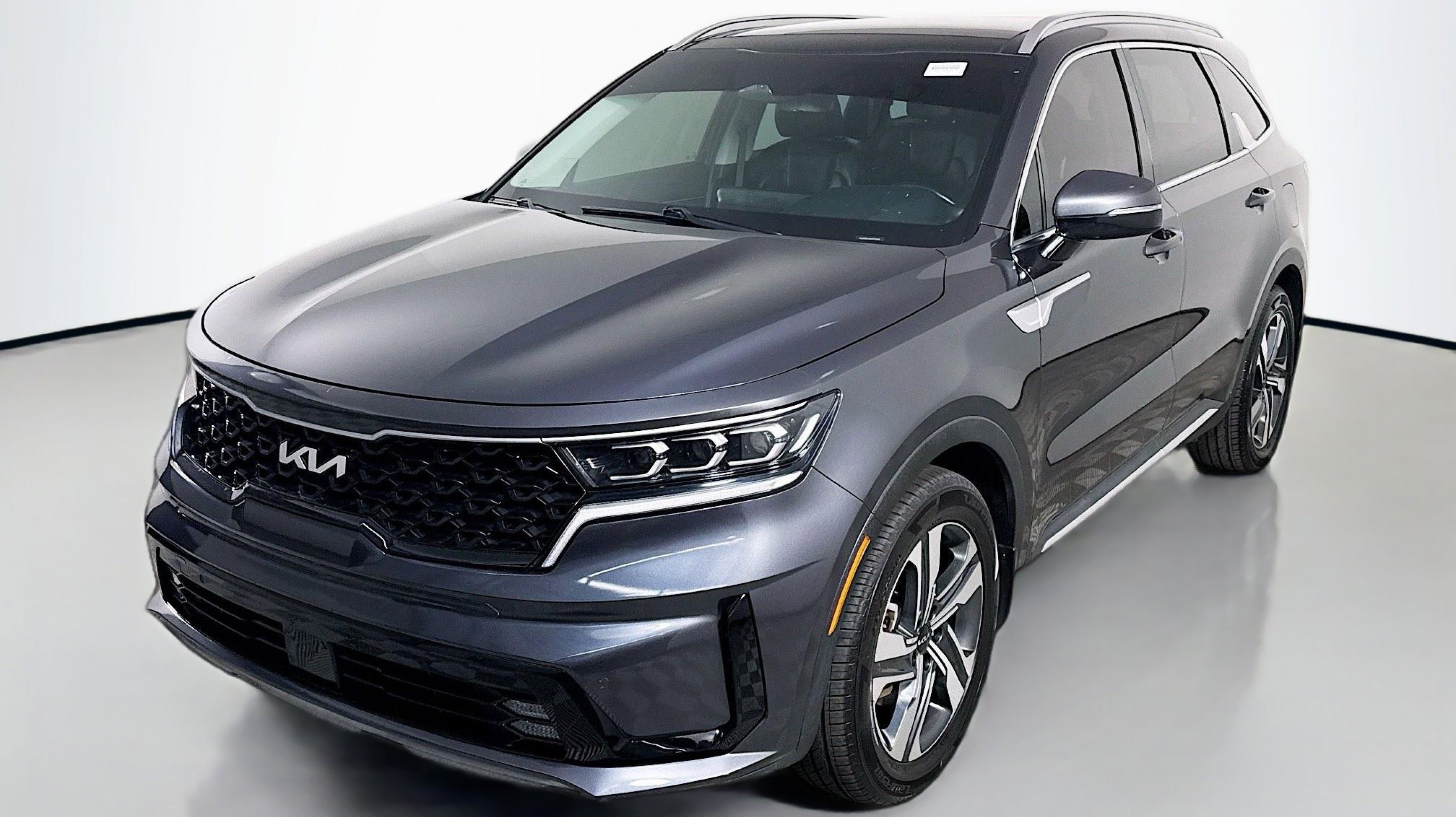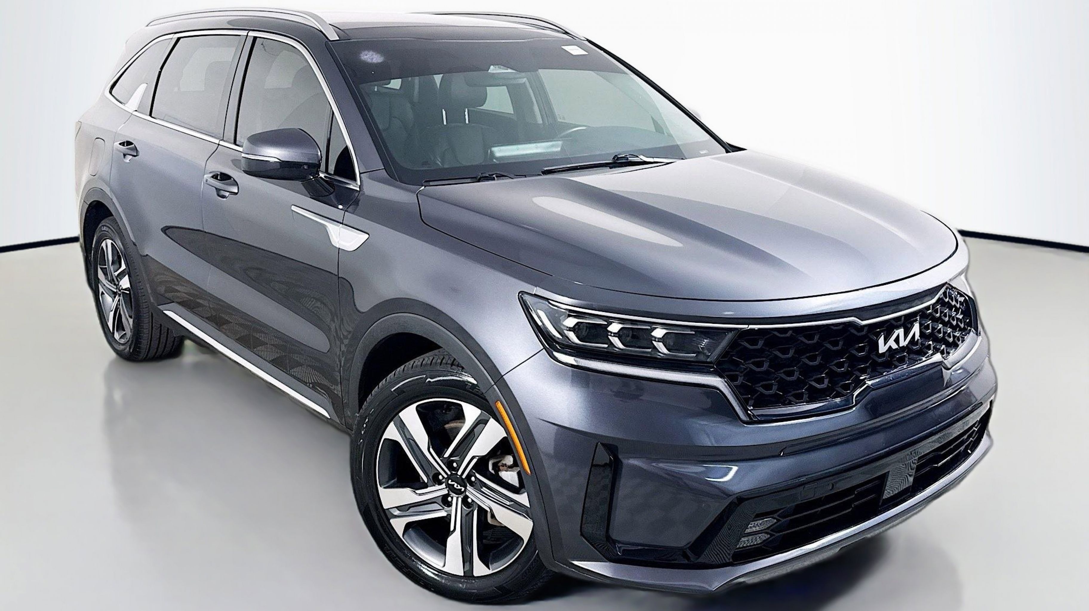 Platinum Graphite 2022 Kia Sorento Plug-In Hybrid SX AWD 6-Speed Automatic 1.6L I4 DGI Hybrid Turbocharged DOHC 16V LEV3-ULEV70 1.6L I4 DGI Hybrid Turbocharged DOHC 16V LEV3-ULEV70, LED Interior Lighting, Panoramic Power Sunroof, Panoramic Sunroof Package, 3rd row seats: split-bench, 4-Wheel Disc Brakes, 6 Speakers, ABS brakes, Air Conditioning, Alloy wheels, AM/FM radio: SiriusXM, Apple CarPlay & Android Auto, Auto High-beam Headlights, Automatic temperature control, Axle Ratio: 3.648, Brake assist, Bumpers: body-color, Carpeted Floor Mats, Cross Bars (Interim), Delay-off headlights, Driver door bin, Driver vanity mirror, Dual front impact airbags, Dual front side impact airbags, Electronic Stability Control, Emergency communication system: UVO Link, Exterior Parking Camera Rear, Folding Cargo Tray, Four wheel independent suspension, Front anti-roll bar, Front Bucket Seats, Front Center Armrest, Front dual zone A/C, Front fog lights, Front reading lights, Fully automatic headlights, Heated door mirrors, Heated Front Bucket Seats, Heated front seats, Illuminated entry, Knee airbag, Leather steering wheel, Low tire pressure warning, Mud Guards, Navigation System, Occupant sensing airbag, Outside temperature display, Overhead airbag, Overhead console, Panic alarm, Passenger door bin, Passenger vanity mirror, Power door mirrors, Power driver seat, Power Liftgate, Power passenger seat, Power steering, Power windows, Radio data system, Radio: 10.25 Touchscreen Navigation w/SiriusXM, Rear air conditioning, Rear anti-roll bar, Rear reading lights, Rear window defroster, Rear window wiper, Remote keyless entry, Roof rack: rails only, Security system, Smart Key w/ Push Button and Remote Start, Speed control, Speed-sensing steering, Split folding rear seat, Spoiler, Steering wheel mounted audio controls, SynTex Artificial Leather Seat Trim, Tachometer, Telescoping steering wheel, Tilt steering wheel, Traction control, Trip computer, Turn signal indicator mirrors, Variably intermittent wipers, Wheel Locks, Wheels: 19 Machine-Finished Alloy, 1.6L I4 DGI Hybrid Turbocharged DOHC 16V LEV3-ULEV70, LED Interior Lighting, Panoramic Power Sunroof, Panoramic Sunroof Package.