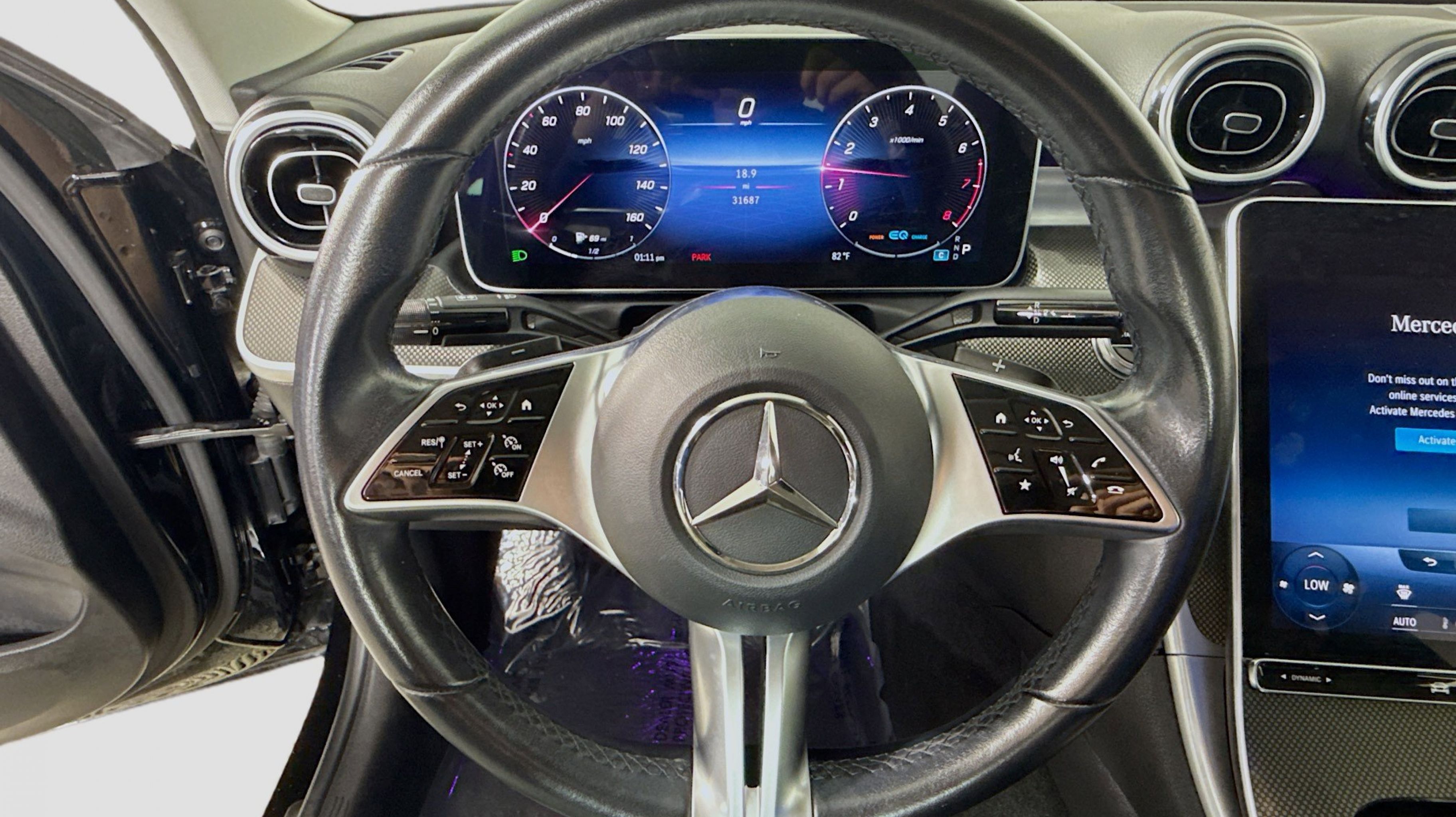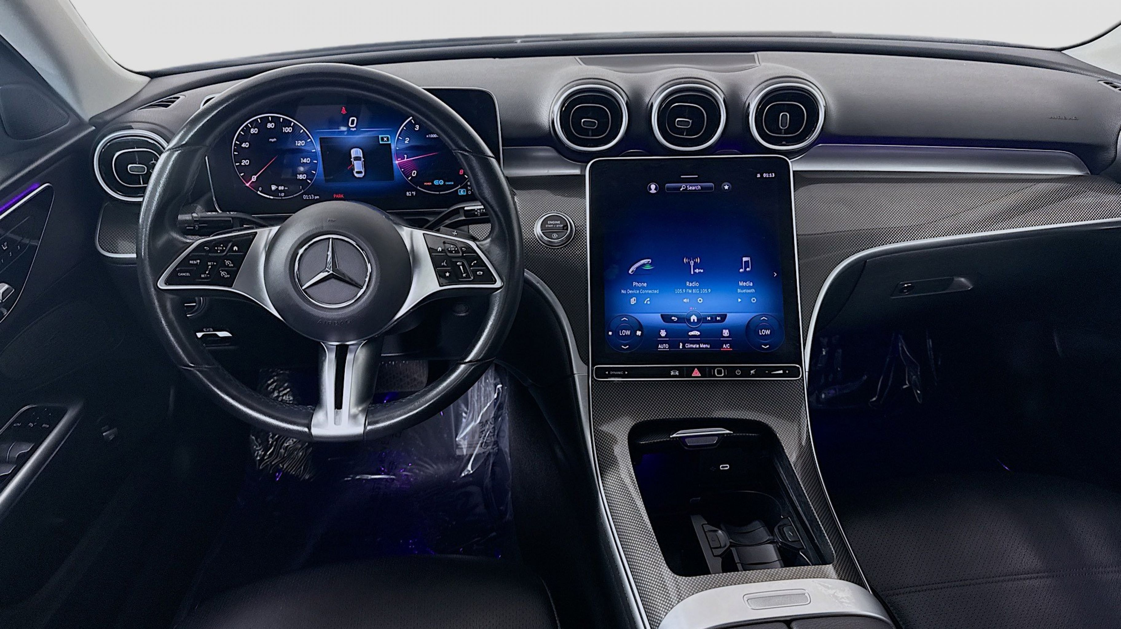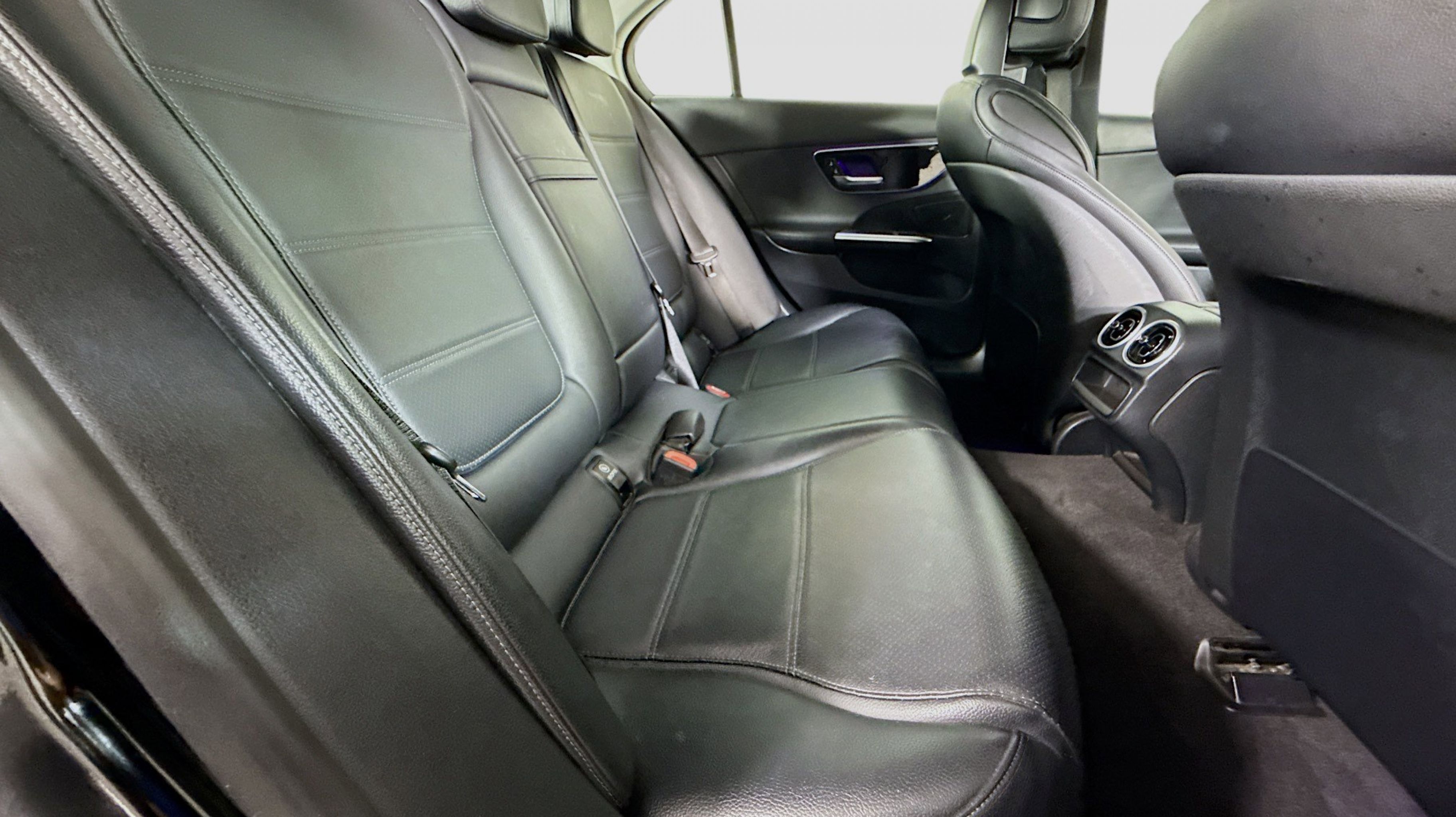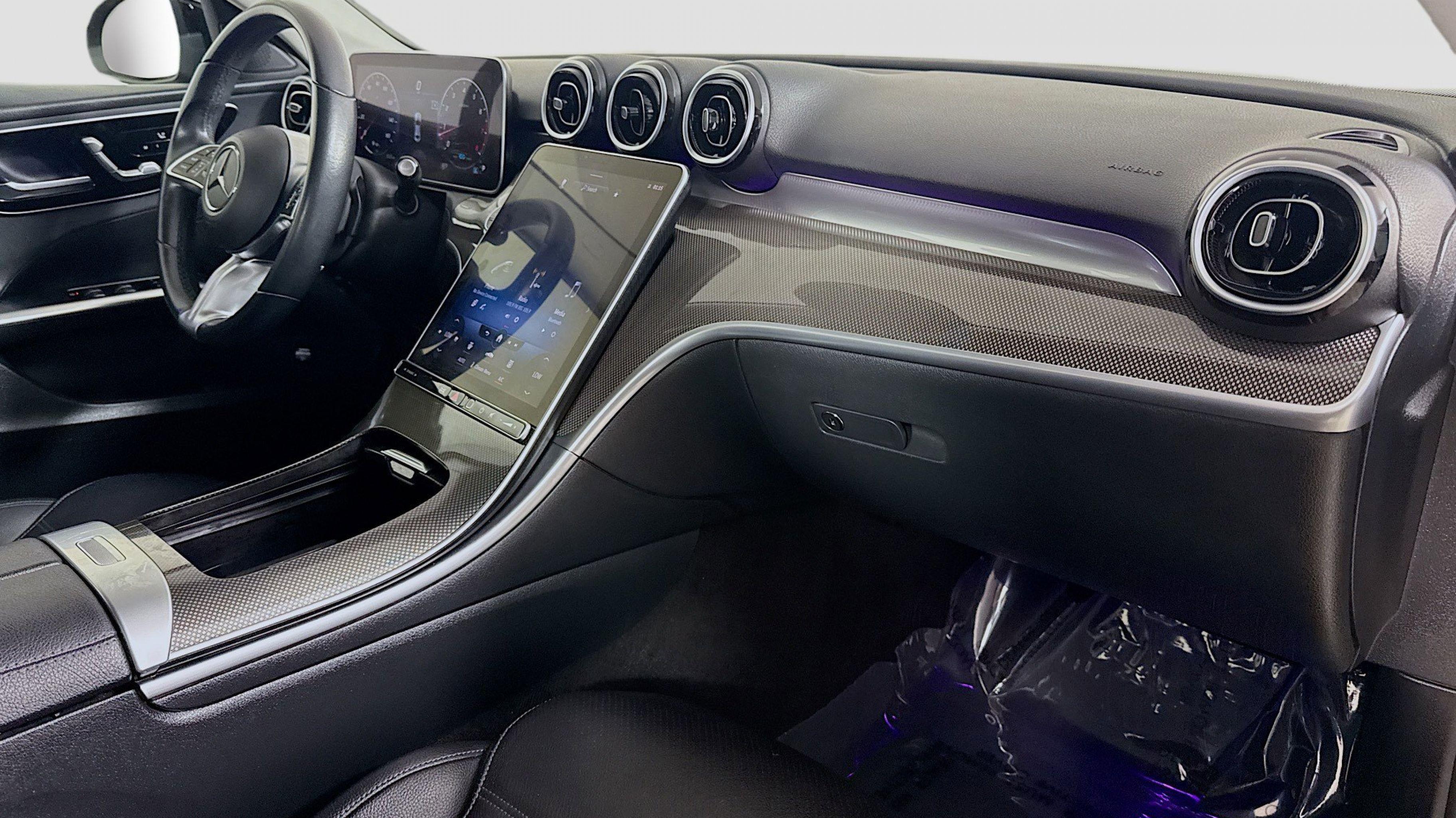 Black 2022 Mercedes-Benz C-Class C 300 RWD 9-Speed Automatic 2.0L I4 Turbocharged Premium Trim Package, 11.9 Center Touchscreen Display, 18 5-Spoke Wheels, 4-way Power Driver's Lumbar Support, 4-Wheel Disc Brakes, 5 Speakers, ABS brakes, Air Conditioning, Alloy wheels, AM/FM radio, Anti-whiplash front head restraints, Apple CarPlay®/Android Auto®, Auto High-beam Headlights, Auto tilt-away steering wheel, Auto-dimming door mirrors, Auto-dimming Rear-View mirror, Automatic temperature control, Body Color Rear Spoiler, Brake assist, Bumpers: body-color, Child-Seat-Sensing Airbag, Compass, Crystal Grey Fabric Headliner, Delay-off headlights, Driver door bin, Driver vanity mirror, Dual front impact airbags, Dual front side impact airbags, Electronic Stability Control, Emergency communication system: Mercedes-Benz Emergency Call Service, Exterior Parking Camera Rear, First Aid Kit, Four wheel independent suspension, Front anti-roll bar, Front Bucket Seats, Front Center Armrest, Front dual zone A/C, Front reading lights, Fully automatic headlights, Garage door transmitter: HomeLink, Genuine wood dashboard insert, Head restraints memory, Heated door mirrors, Heated front seats, Illuminated entry, Knee airbag, Low tire pressure warning, MB-Tex Upholstery, Memory seat, Metal Weave Center Console, Occupant sensing airbag, Outside temperature display, Overhead airbag, Overhead console, Panic alarm, PANORAMA SUNROOF, Passenger door bin, Passenger vanity mirror, Power adjustable front head restraints, Power door mirrors, Power driver seat, Power Heated Front Seats w/Memory, Power passenger seat, Power steering, Power windows, Premium audio system: MBUX, Radio data system, Radio: FrontBass 5-Speaker Audio System, Rain sensing wipers, Rear anti-roll bar, Rear fog lights, Rear reading lights, Rear seat center armrest, Rear window defroster, Remote keyless entry, Security system, Speed control, Speed-sensing steering, Split folding rear seat, Steering wheel memory, Steering wheel mounted audio controls, Tachometer, Telescoping steering wheel, Tilt steering wheel, Traction control, Trip computer, Turn signal indicator mirrors, Variably intermittent wipers, Weather band radio, Wheel Locking Bolts, Wheels: 18 Multispoke, Premium Trim Package.