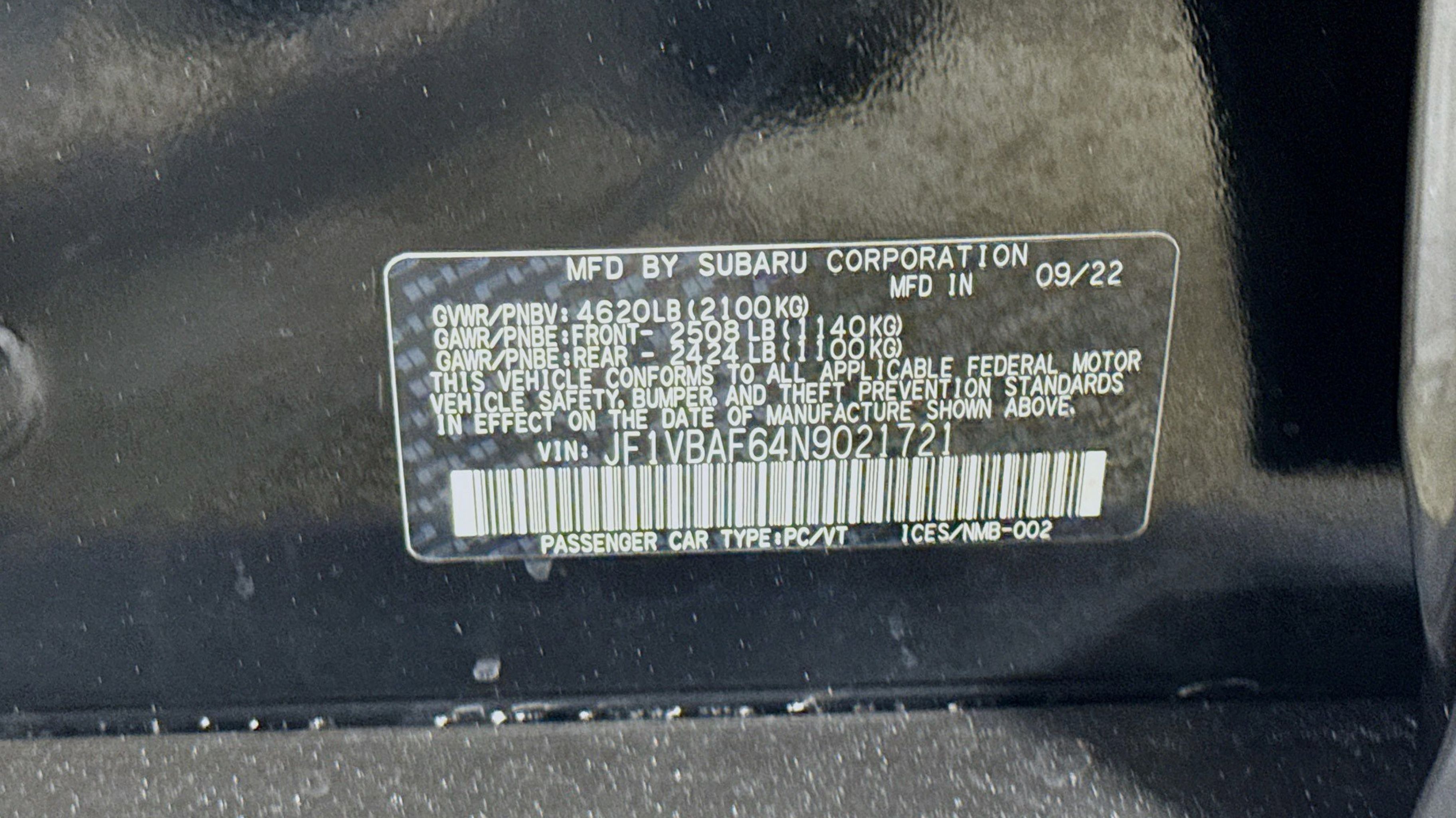 Crystal Black Silica 2022 Subaru WRX Premium AWD 6-Speed Manual 2.4L DOHC Standard Model (6MT), 4-Wheel Disc Brakes, 6 Speakers, ABS brakes, Air Conditioning, All-Weather Floor Liners, Alloy Wheel Locks, Alloy wheels, AM/FM radio: SiriusXM, Auto High-beam Headlights, Auto-Dimming Exterior Mirror w/Approach Light, Auto-dimming Rear-View mirror, Automatic temperature control, Brake assist, Bumpers: body-color, Cargo Tray, Cloth Upholstery w/Red Stitching, Driver door bin, Driver vanity mirror, Dual front impact airbags, Dual front side impact airbags, Electronic Stability Control, Emergency communication system: STARLINK Safety and Security (Subscription Required), Exterior Parking Camera Rear, Four wheel independent suspension, Front anti-roll bar, Front Bucket Seats, Front Center Armrest, Front dual zone A/C, Front fog lights, Front reading lights, Fully automatic headlights, Heated door mirrors, Heated front seats, Illuminated entry, Knee airbag, Leather Shift Knob, Leather steering wheel, Low tire pressure warning, Occupant sensing airbag, Outside temperature display, Overhead airbag, Overhead console, Panic alarm, Passenger door bin, Passenger vanity mirror, Performance Design Heated Front Bucket Seats, Power door mirrors, Power steering, Power windows, Radio data system, Radio: Subaru STARLINK 11.6 Multimedia Plus Sys, Rear anti-roll bar, Rear seat center armrest, Rear window defroster, Remote keyless entry, Security system, Speed control, Speed-sensing steering, Split folding rear seat, Spoiler, Sport steering wheel, STARLINK/Apple CarPlay/Android Auto, Steering wheel mounted audio controls, Tachometer, Telescoping steering wheel, Tilt steering wheel, Traction control, Trip computer, Variably intermittent wipers, Wheels: 18 x 8.5 Dark Gray Finish Alum Alloy, Standard Model (6MT).