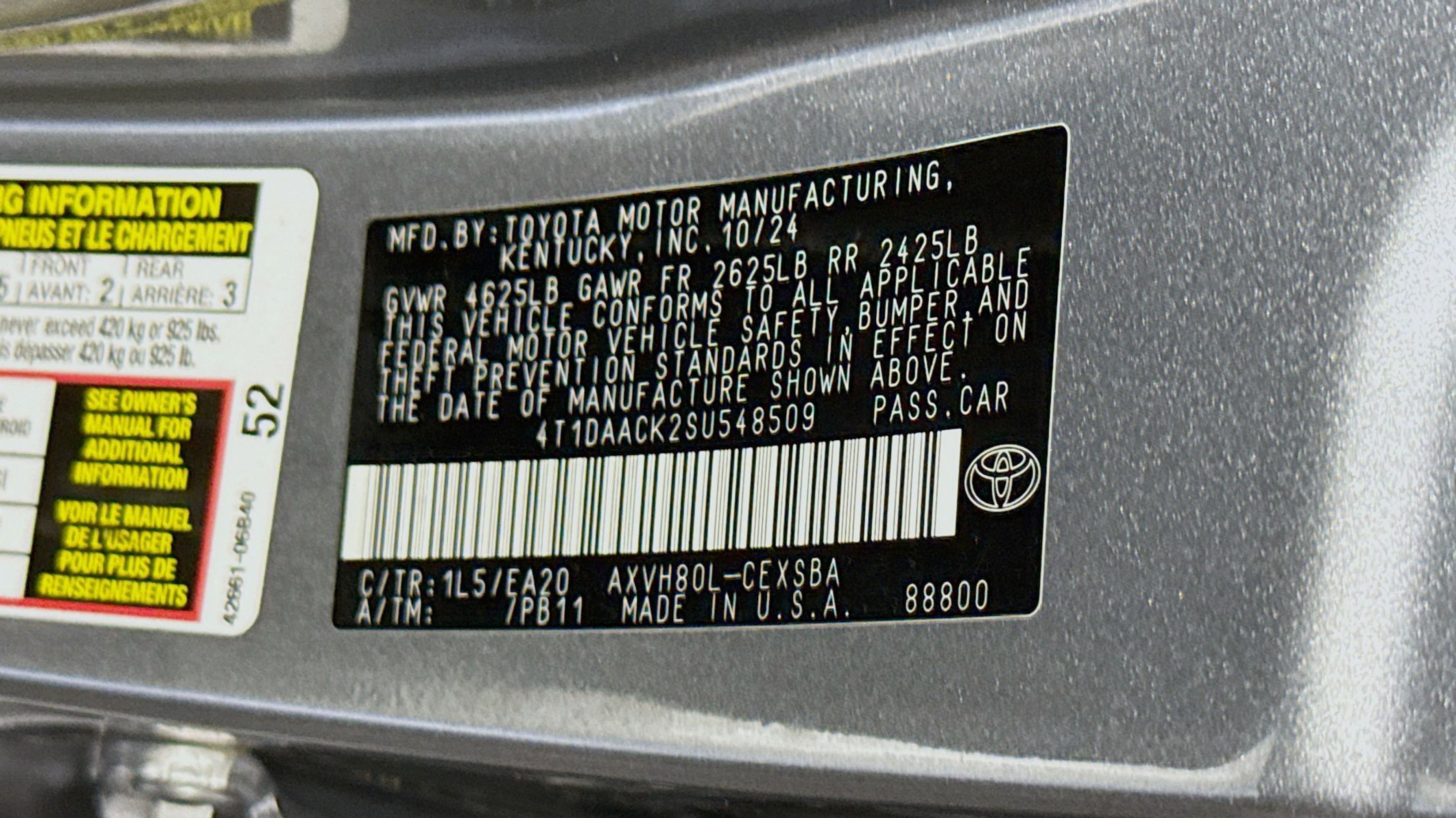 CARFAX One-Owner. 2.5L 4-Cylinder 16V DOHC, Black w/Fabric Seat Trim, 4-Wheel Disc Brakes, 6 Speakers, ABS brakes, Air Conditioning, Alloy wheels, AM/FM radio: SiriusXM, Apple CarPlay/Android Auto, Auto High-beam Headlights, Automatic temperature control, Brake assist, Bumpers: body-color, Delay-off headlights, Driver door bin, Driver vanity mirror, Dual front impact airbags, Dual front side impact airbags, Electronic Stability Control, Emergency communication system: Safety Connect (up to 10-year trial subscription), Exterior Parking Camera Rear, Four wheel independent suspension, Front Accent Lighting (TMS), Front anti-roll bar, Front Bucket Seats, Front Center Armrest, Front dual zone A/C, Front reading lights, Fully automatic headlights, Heated door mirrors, Illuminated entry, Knee airbag, Leather Shift Knob, Leather steering wheel, Low tire pressure warning, Occupant sensing airbag, Outside temperature display, Overhead airbag, Overhead console, Panic alarm, Passenger door bin, Passenger vanity mirror, Power door mirrors, Power driver seat, Power steering, Power windows, Radio data system, Radio: Toyota Audio Multimedia w/12.3 Touchscreen, Radio: Toyota Audio Multimedia w/8 Touchscreen, Rear anti-roll bar, Rear reading lights, Rear seat center armrest, Rear side impact airbag, Rear window defroster, Remote keyless entry, Security system, SofTex & Fabric Seat Trim, Speed control, Speed-sensing steering, Split folding rear seat, Spoiler, Steering wheel mounted audio controls, Telescoping steering wheel, Tilt steering wheel, Traction control, Trip computer, Turn signal indicator mirrors, Variably intermittent wipers, Wheels: 18 Black-Finished Alloy, 2.5L 4-Cylinder 16V DOHC, Black w/Fabric Seat Trim.