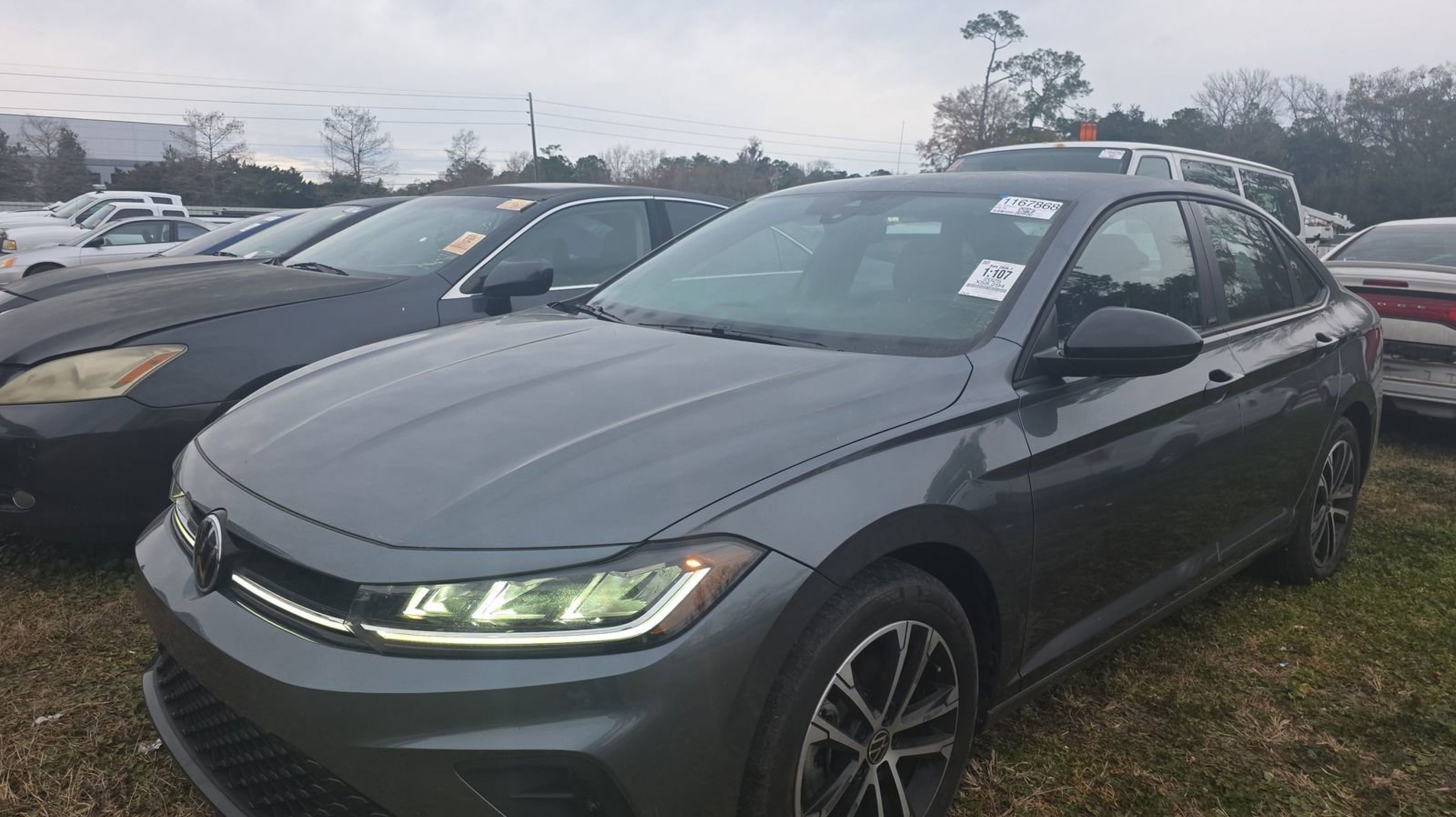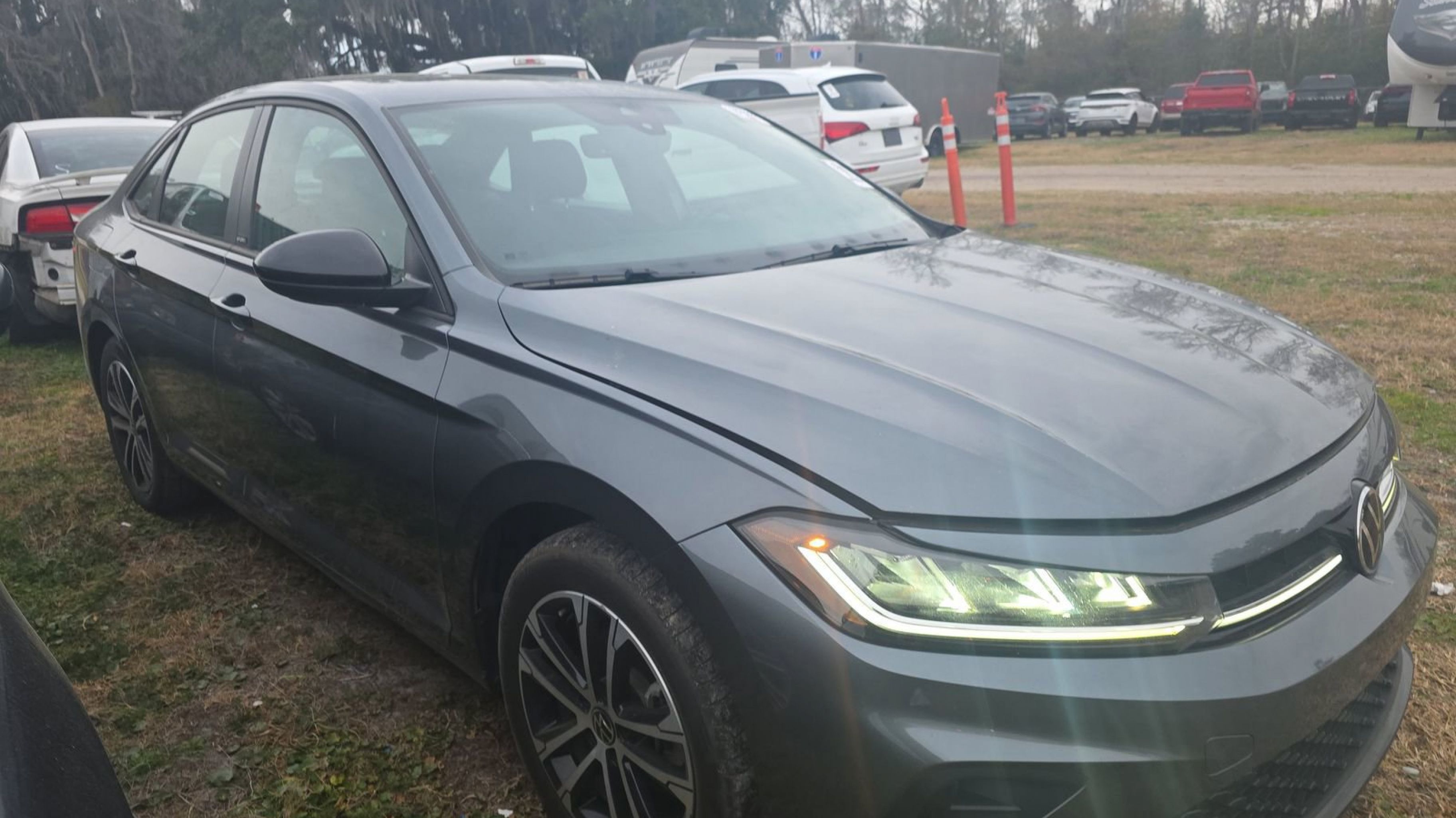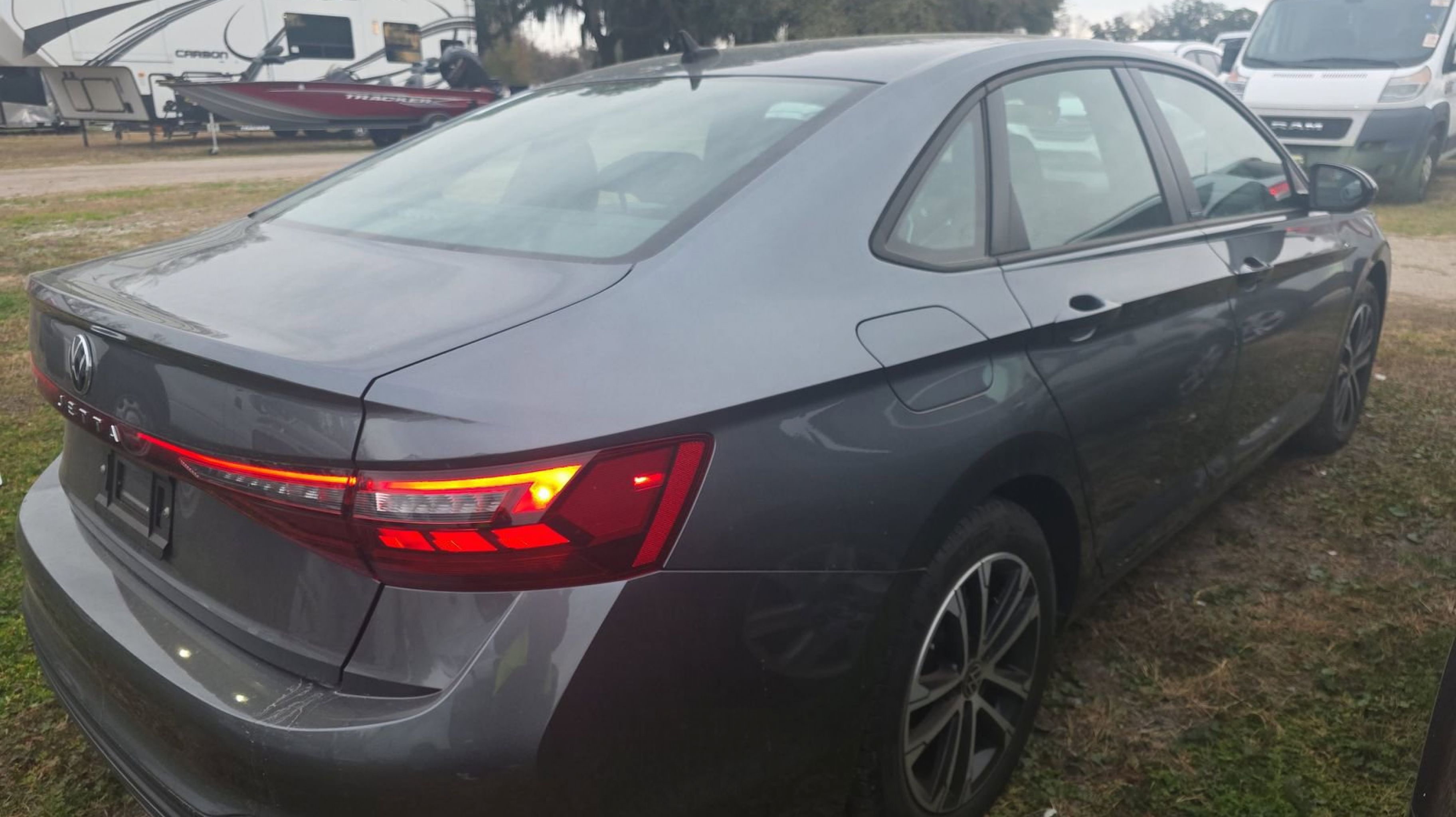 Platinum Gray Metallic 2025 Volkswagen Jetta 1.5T Sport FWD 8-Speed Automatic with Tiptronic 1.5L I-4 DI DOHC Turbocharged Titan Black w/Cloth Seat Trim, 4 Speakers, 4-Wheel Disc Brakes, ABS brakes, Active Blind Spot Monitor, Air Conditioning, Alloy wheels, Auto-dimming Rear-View mirror, Automatic temperature control, Brake assist, Bumpers: body-color, Cloth Seat Trim, Delay-off headlights, Driver door bin, Driver vanity mirror, Dual front impact airbags, Dual front side impact airbags, Electronic Stability Control, Emergency communication system: VW Car-Net Safe & Secure 5-year, Exterior Parking Camera Rear, Front anti-roll bar, Front Bucket Seats, Front Center Armrest, Front dual zone A/C, Front wheel independent suspension, Fully automatic headlights, Heated door mirrors, Heated Front Seats, Heated front seats, Illuminated entry, Leather Shift Knob, Leather steering wheel, Low tire pressure warning, Occupant sensing airbag, Outside temperature display, Overhead airbag, Overhead console, Panic alarm, Passenger door bin, Passenger vanity mirror, Power door mirrors, Power steering, Power windows, Radio data system, Radio: MIB3 Composition Color w/8 Touchscreen, Rain sensing wipers, Rear anti-roll bar, Rear reading lights, Rear seat center armrest, Rear window defroster, Remote keyless entry, Speed control, Speed-sensing steering, Split folding rear seat, Steering wheel mounted audio controls, Tachometer, Telescoping steering wheel, Tilt steering wheel, Traction control, Trip computer, Variably intermittent wipers, Wheels: 17 2-Tone Machined Alloy, Titan Black w/Cloth Seat Trim.