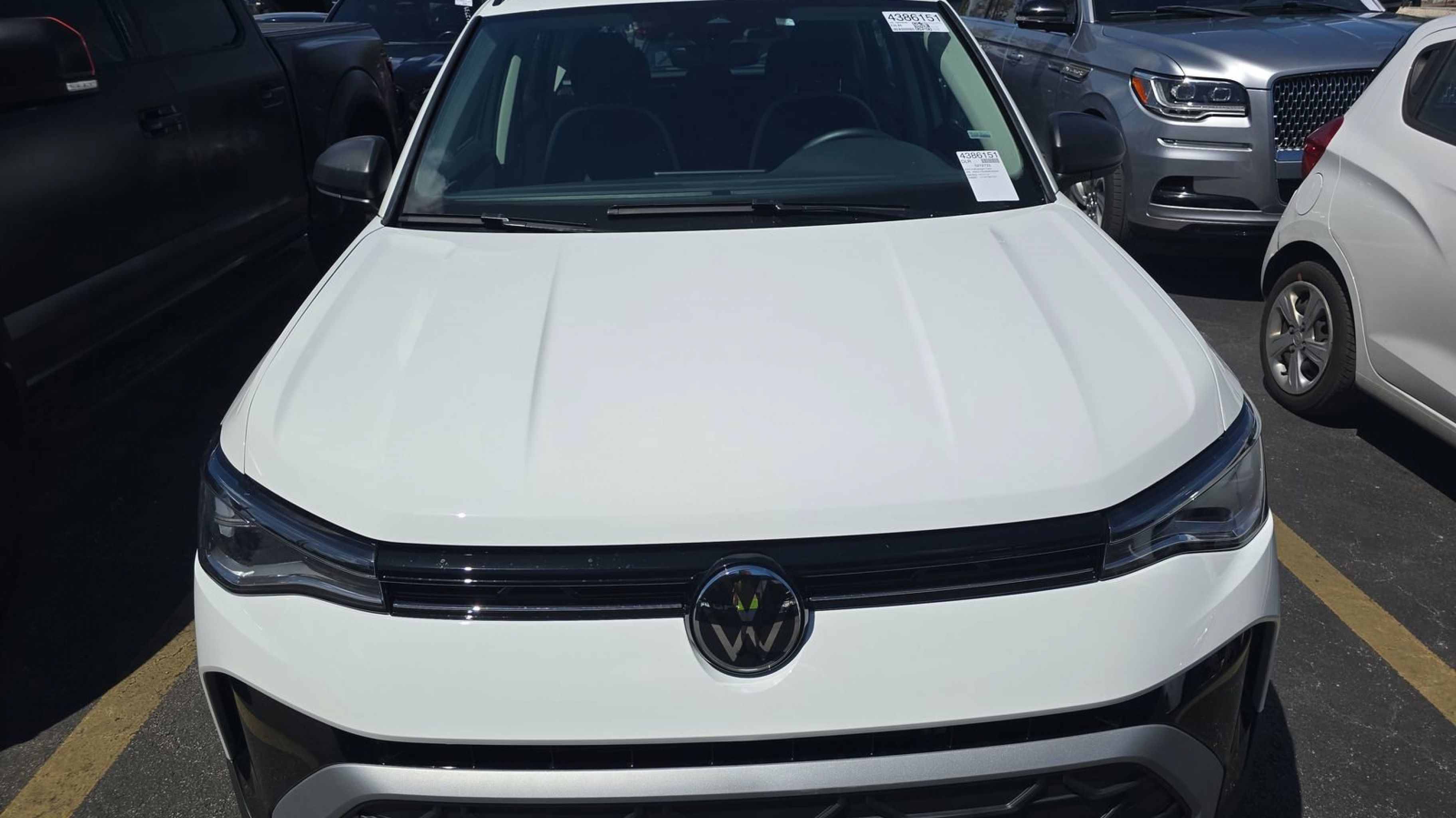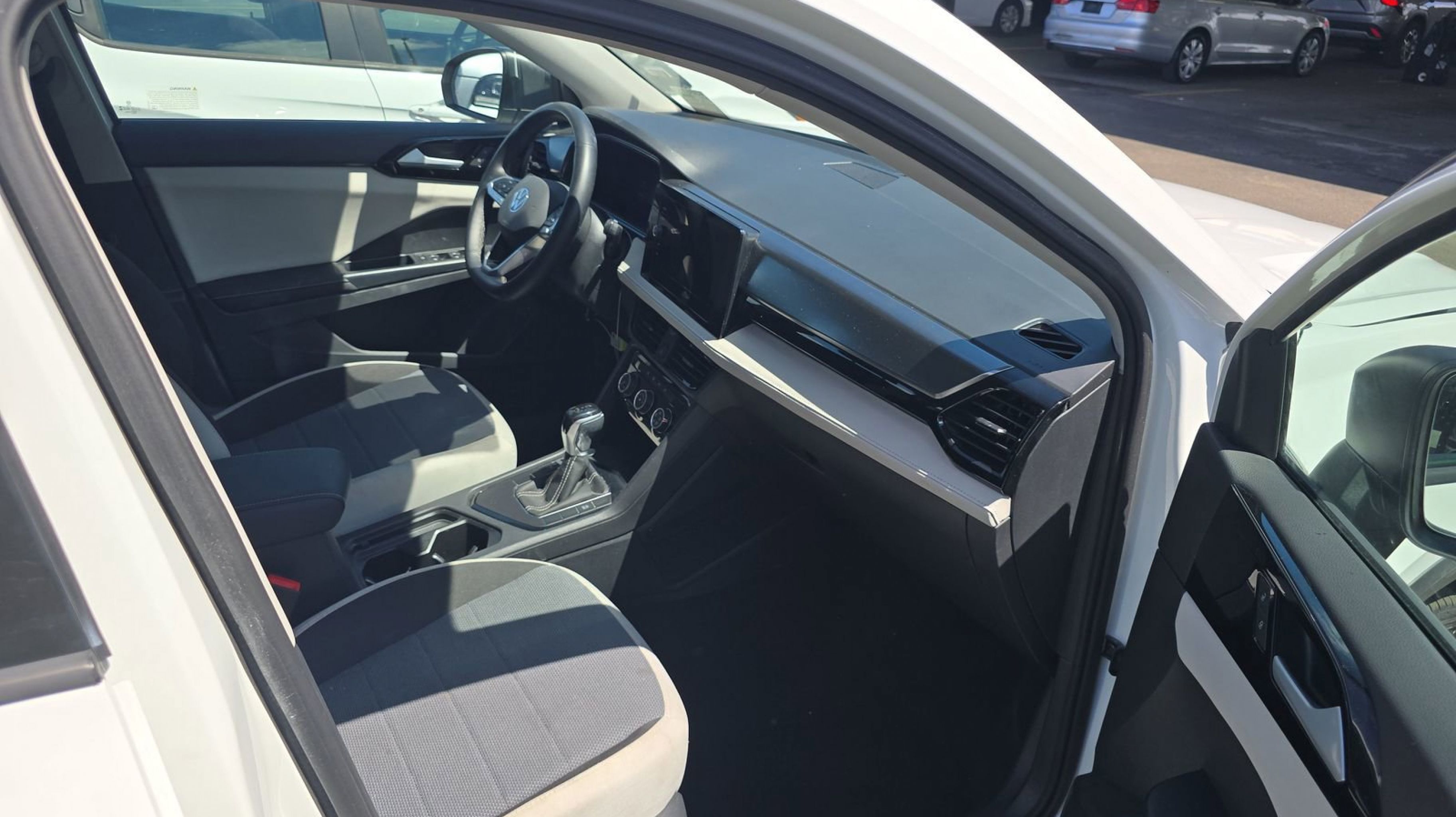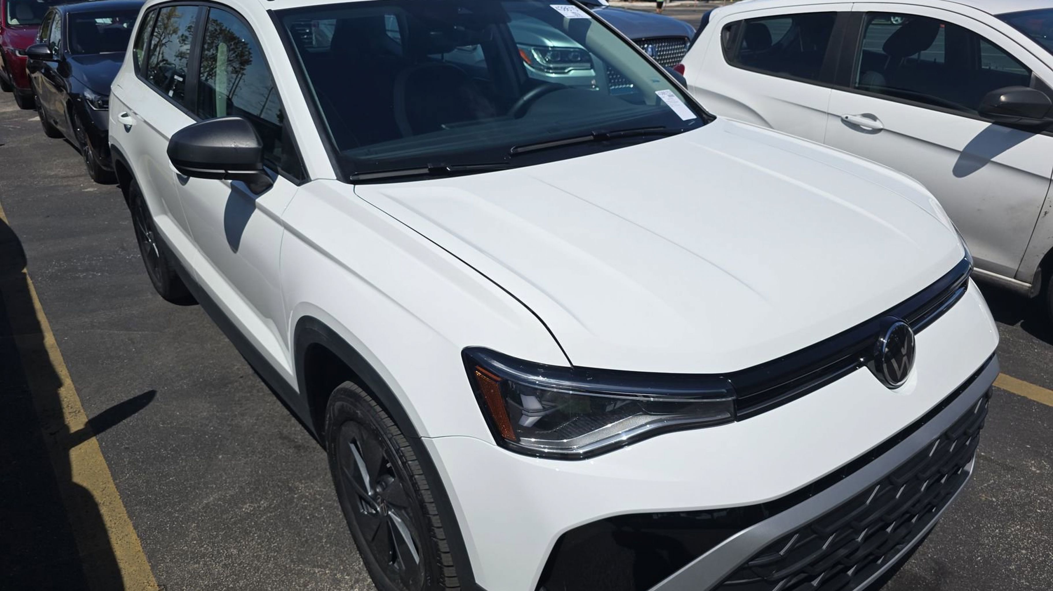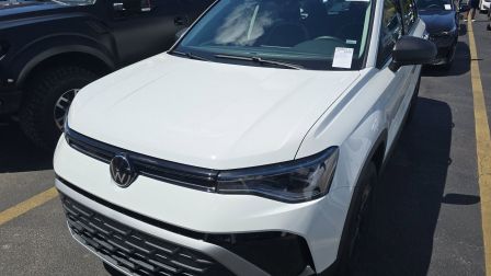 Pure White 2025 Volkswagen Taos 1.5T S FWD 8-Speed Automatic with Tiptronic 1.5L I4 Turbocharged DOHC 16V LEV3-SULEV30 174hp 4-Wheel Disc Brakes, 6 Speakers, ABS brakes, Active Blind Spot Monitor, Air Conditioning, Alloy wheels, AM/FM radio, Auto High-beam Headlights, Brake assist, Bumpers: body-color, Cloth Seating Surfaces, Compass, Delay-off headlights, Driver door bin, Driver vanity mirror, Dual front impact airbags, Dual front side impact airbags, Electronic Stability Control, Emergency communication system: VW Car-Net Safe & Secure 5-year, Exterior Parking Camera Rear, Front anti-roll bar, Front Bucket Seats, Front Center Armrest, Front reading lights, Front Strut Rear Torsion Beam Suspension, Front wheel independent suspension, Fully automatic headlights, Heated steering wheel, Illuminated entry, Leather Shift Knob, Low tire pressure warning, Occupant sensing airbag, Outside temperature display, Overhead airbag, Overhead console, Panic alarm, Passenger door bin, Passenger vanity mirror, Power door mirrors, Power steering, Power windows, Radio data system, Radio: MIB3 Composition Color AM/FM, Rain sensing wipers, Rear anti-roll bar, Rear seat center armrest, Rear window defroster, Rear window wiper, Remote keyless entry, Speed control, Speed-sensing steering, Split folding rear seat, Spoiler, Steering wheel mounted audio controls, Tachometer, Telescoping steering wheel, Tilt steering wheel, Traction control, Trip computer, Variably intermittent wipers, Wheels: 17 Dark Silver Painted Alloy.